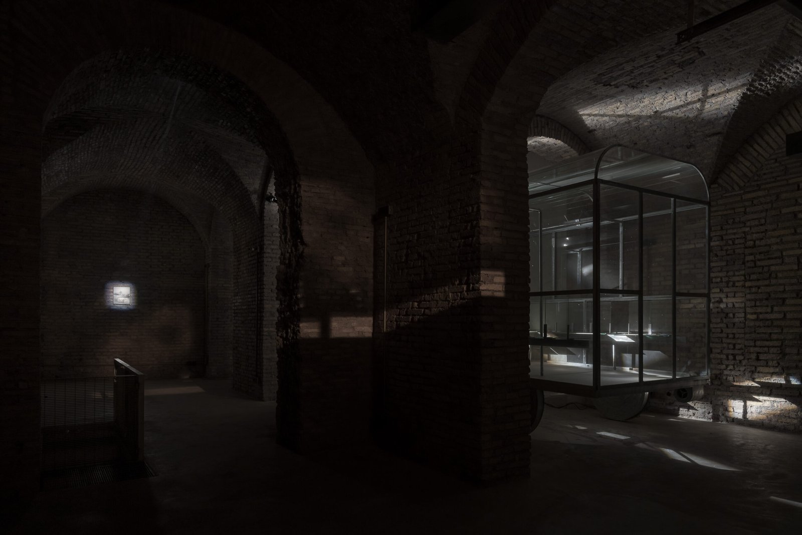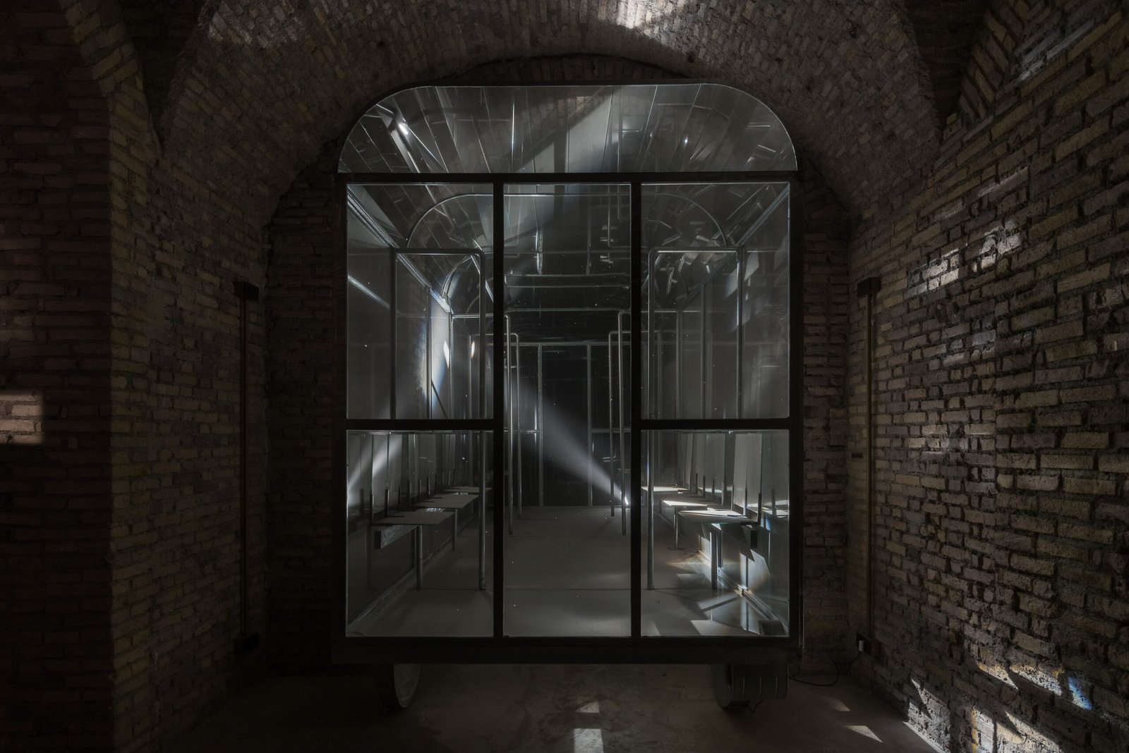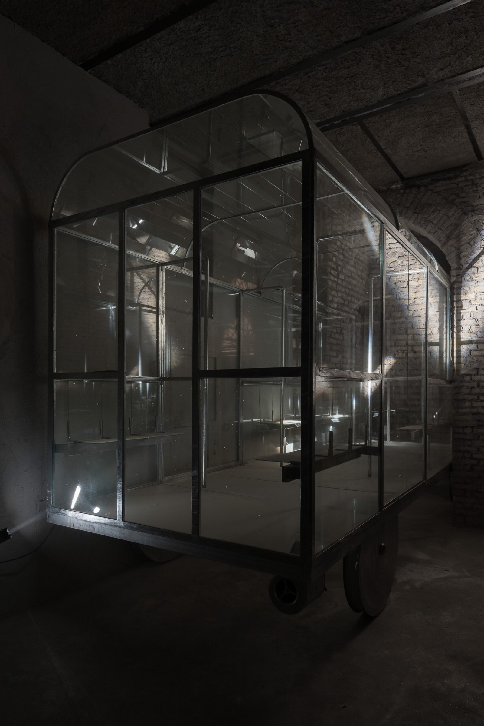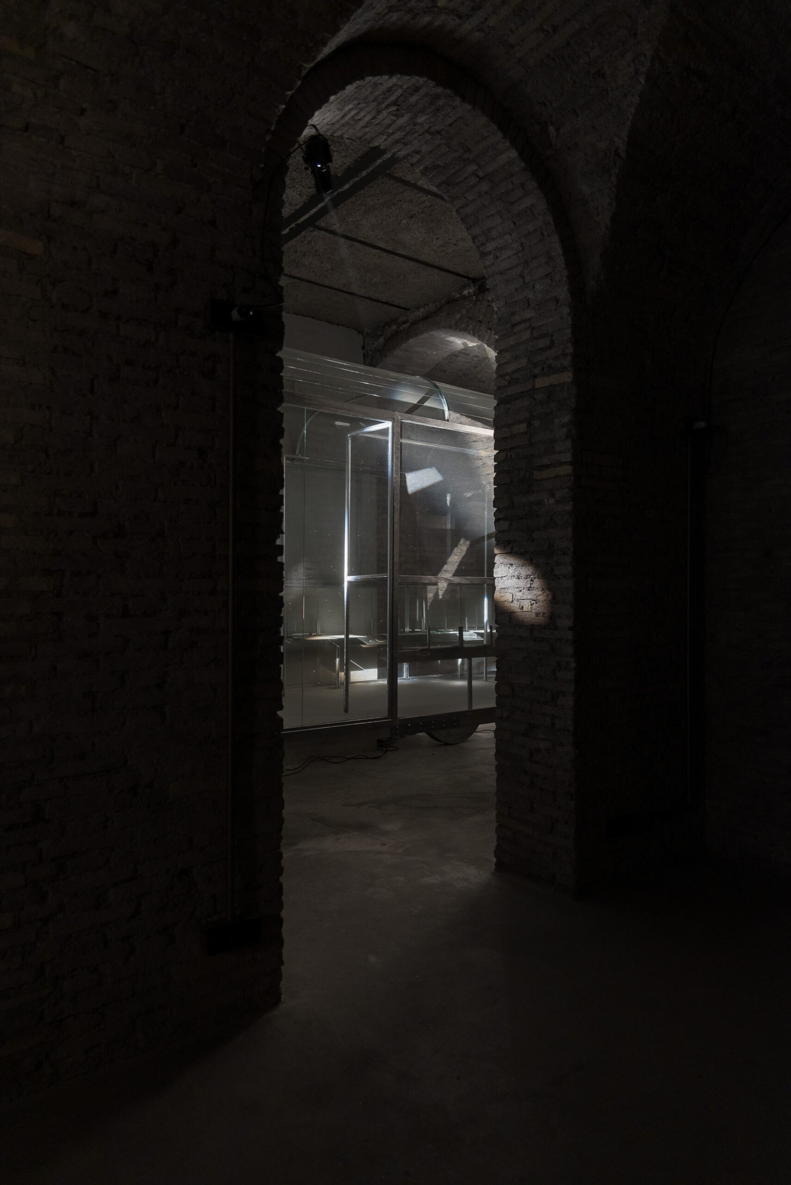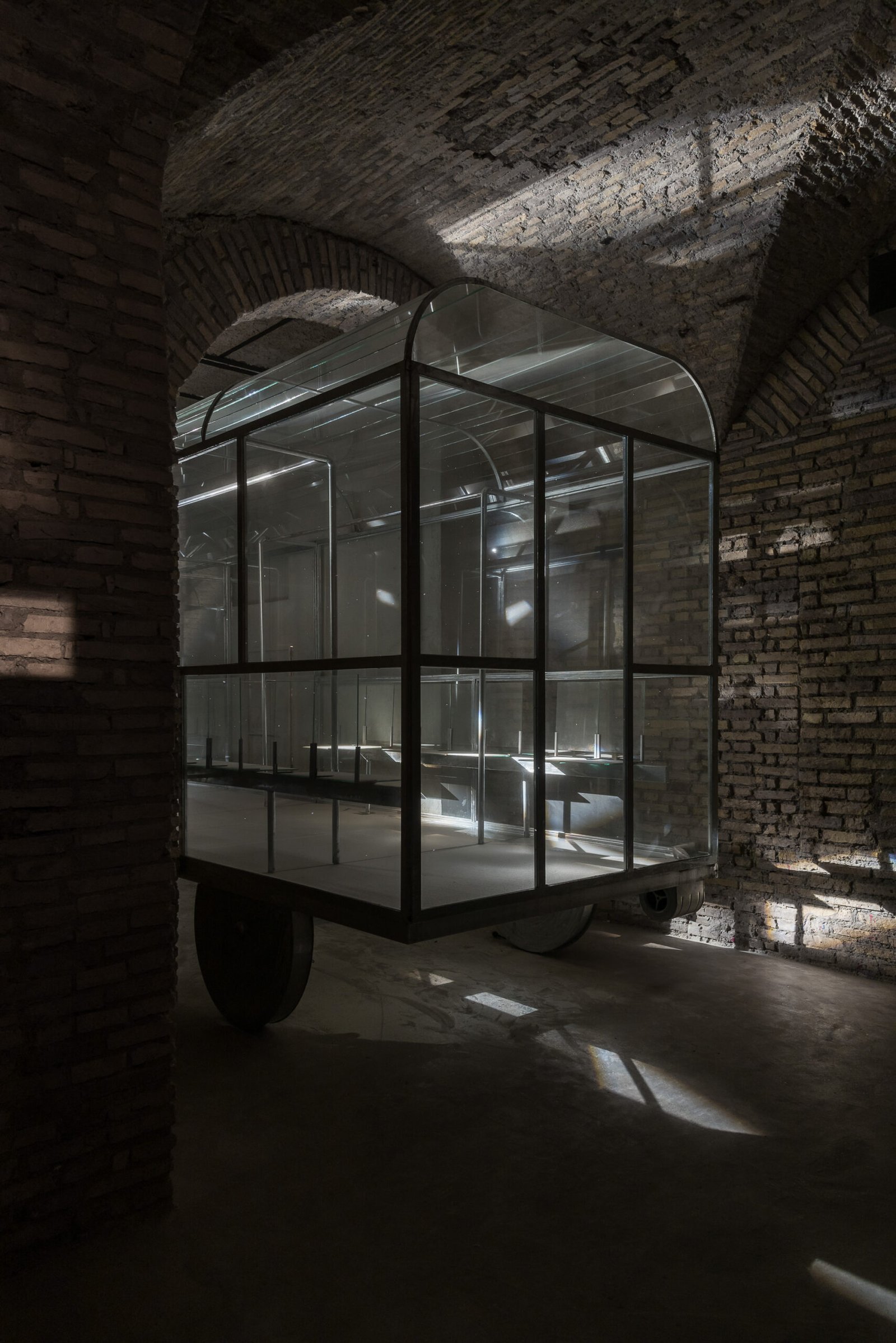carriage placed beneath the arched space, almost level with its height. Inside the carriage, a ventilation