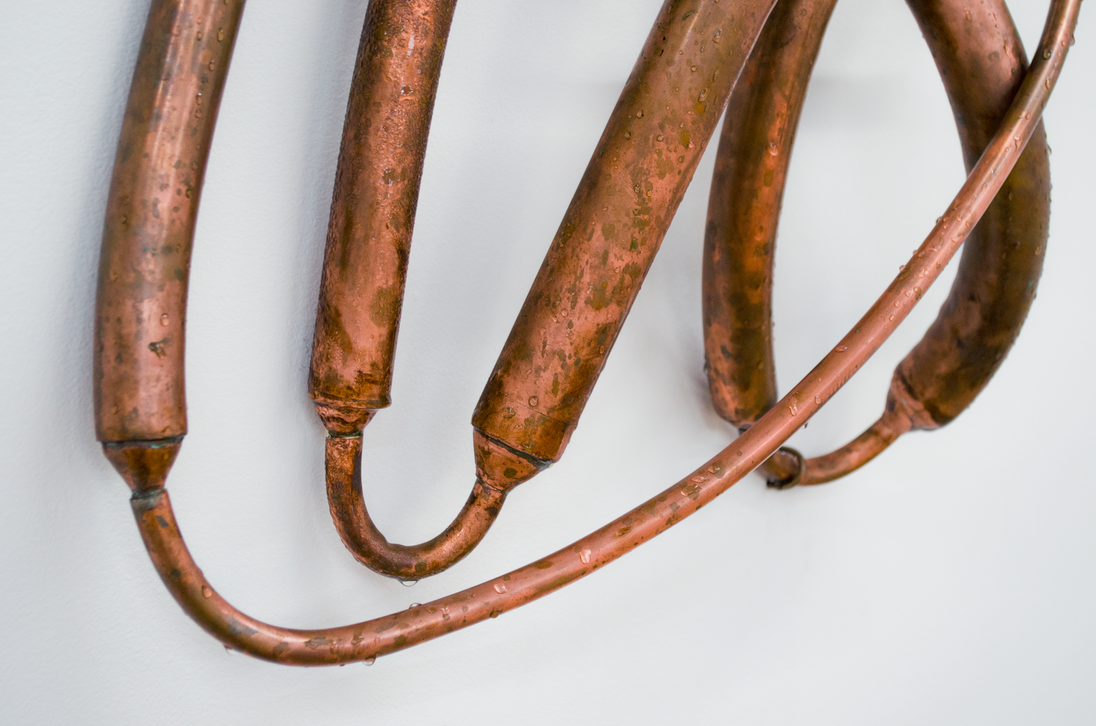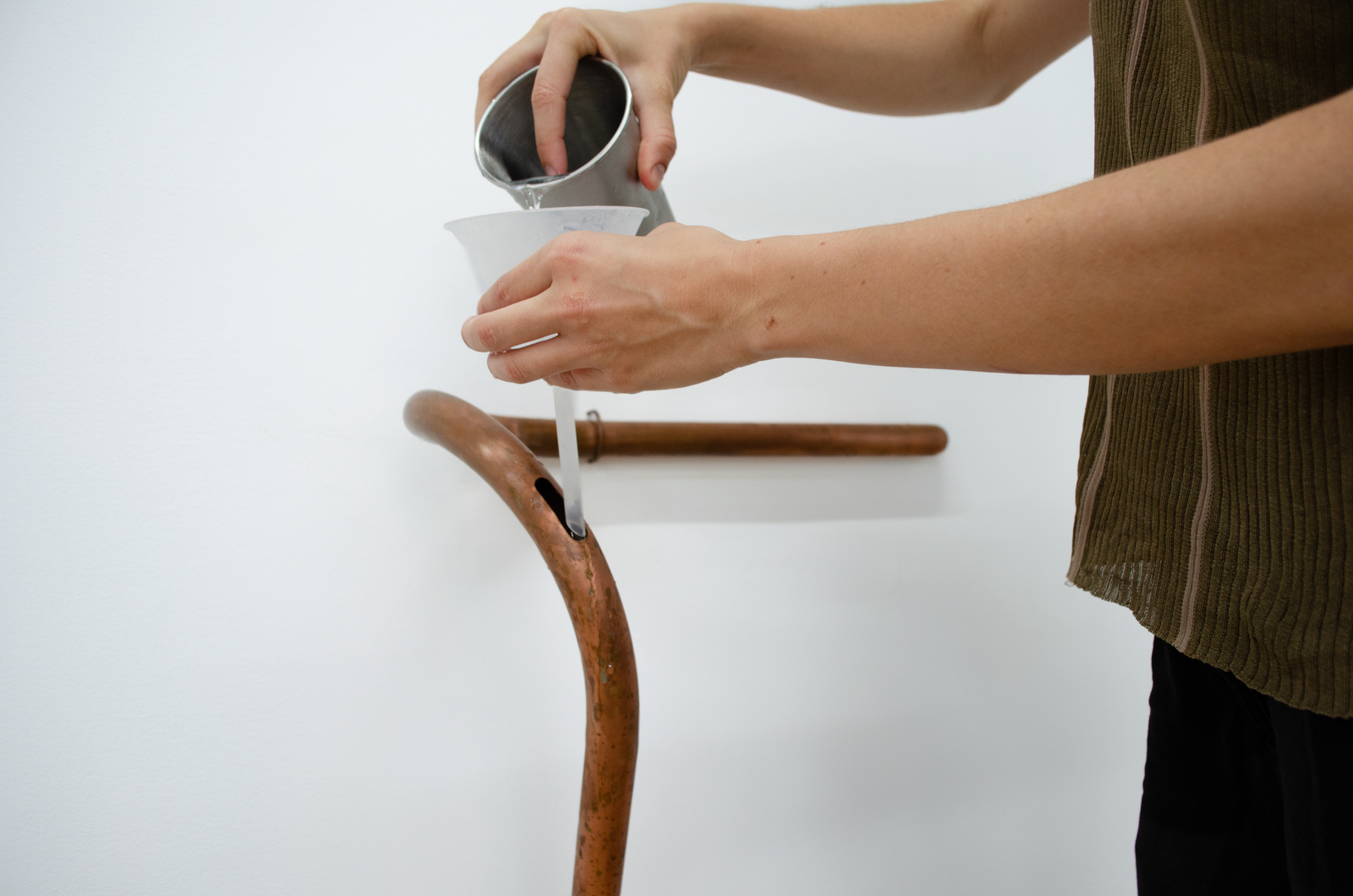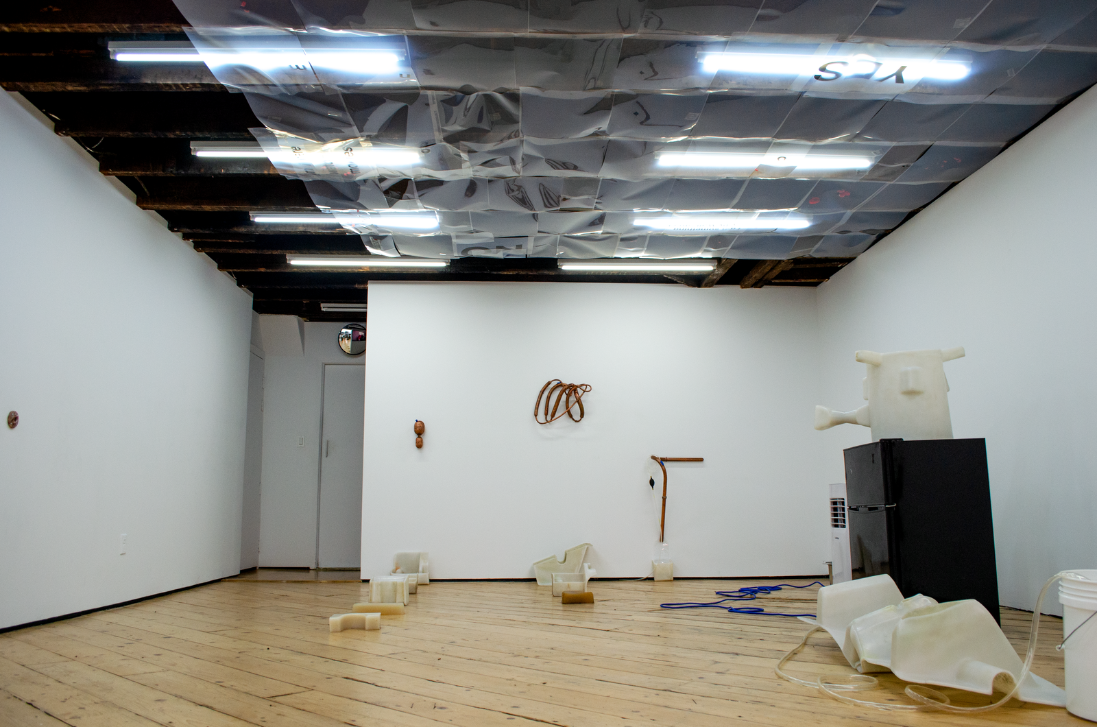 substation and the underground Cooper Square network feeder to a transformer under Henry street, the 24 Rutgers service meter, and a Foreign & Domestic outlet. Connected to this outlet, an air conditioner’s internal condensing coils turn the breath of a woman in the gallery into water. It trickles into a bucket weighing down a Coagulator.