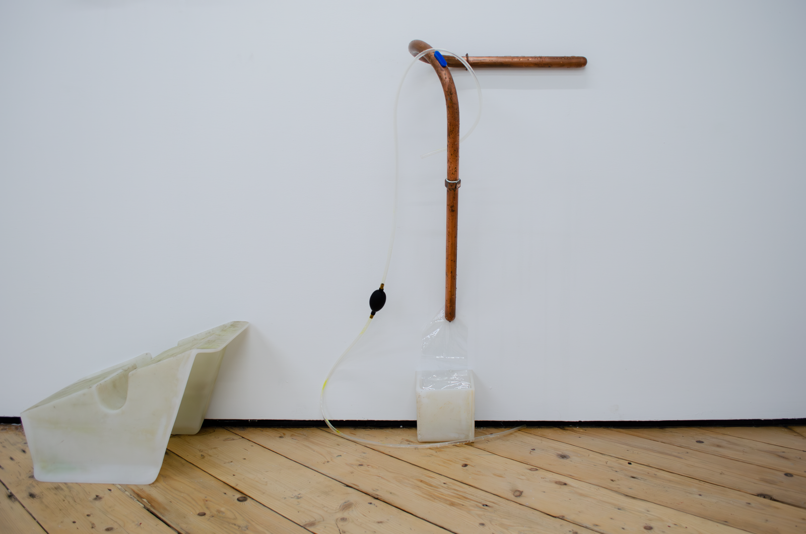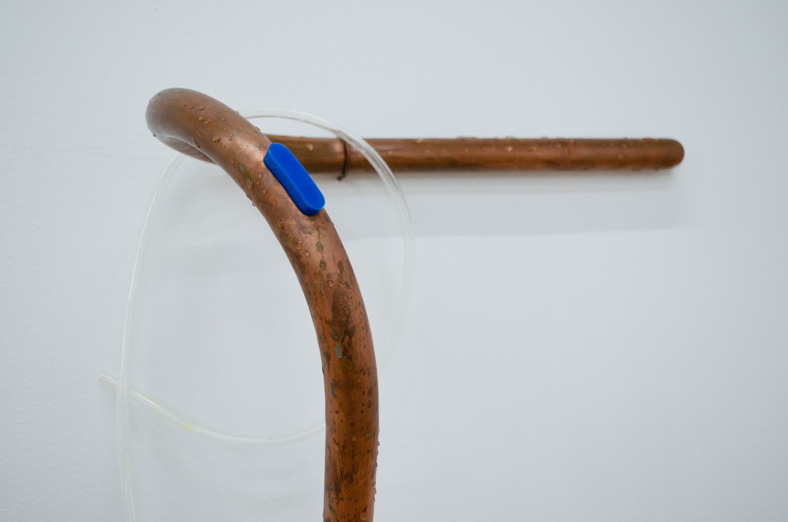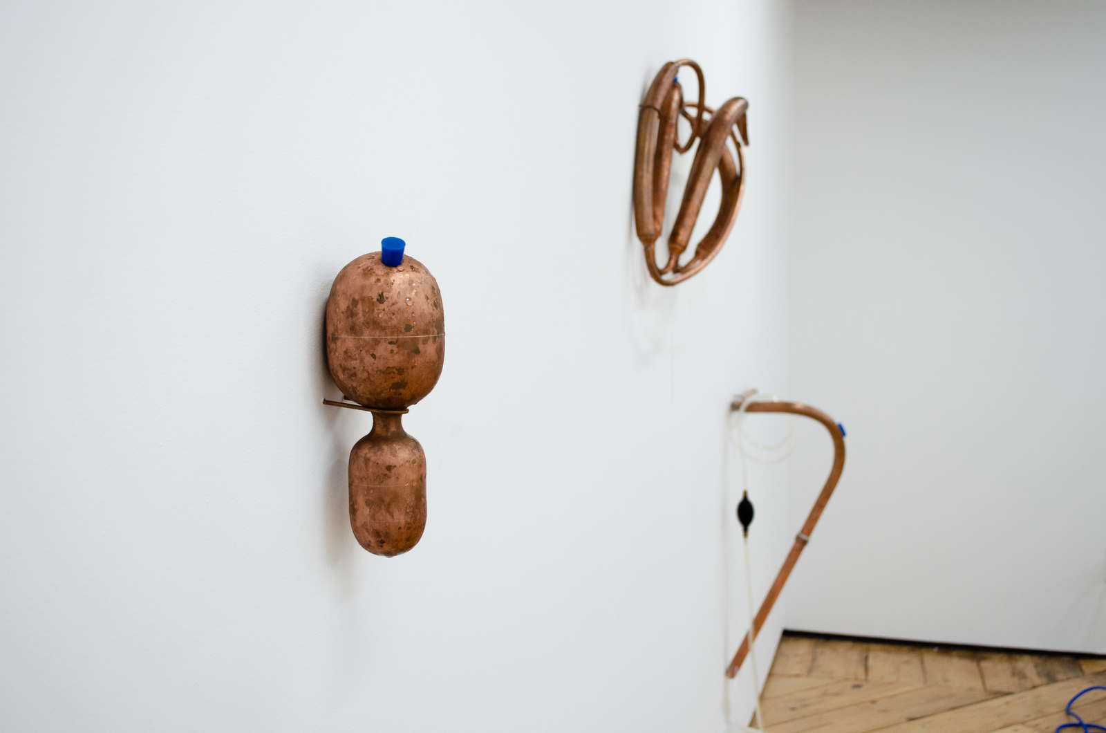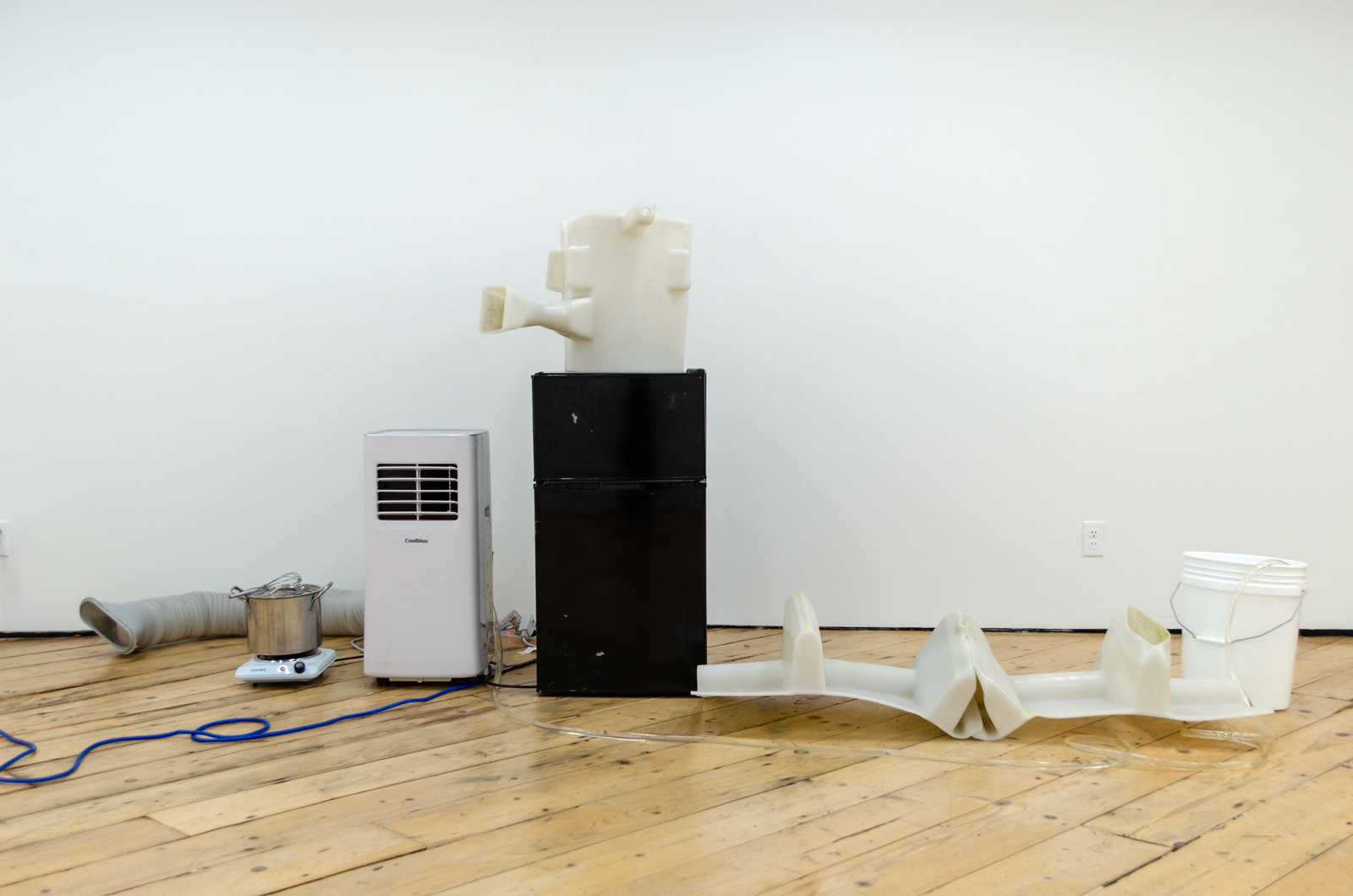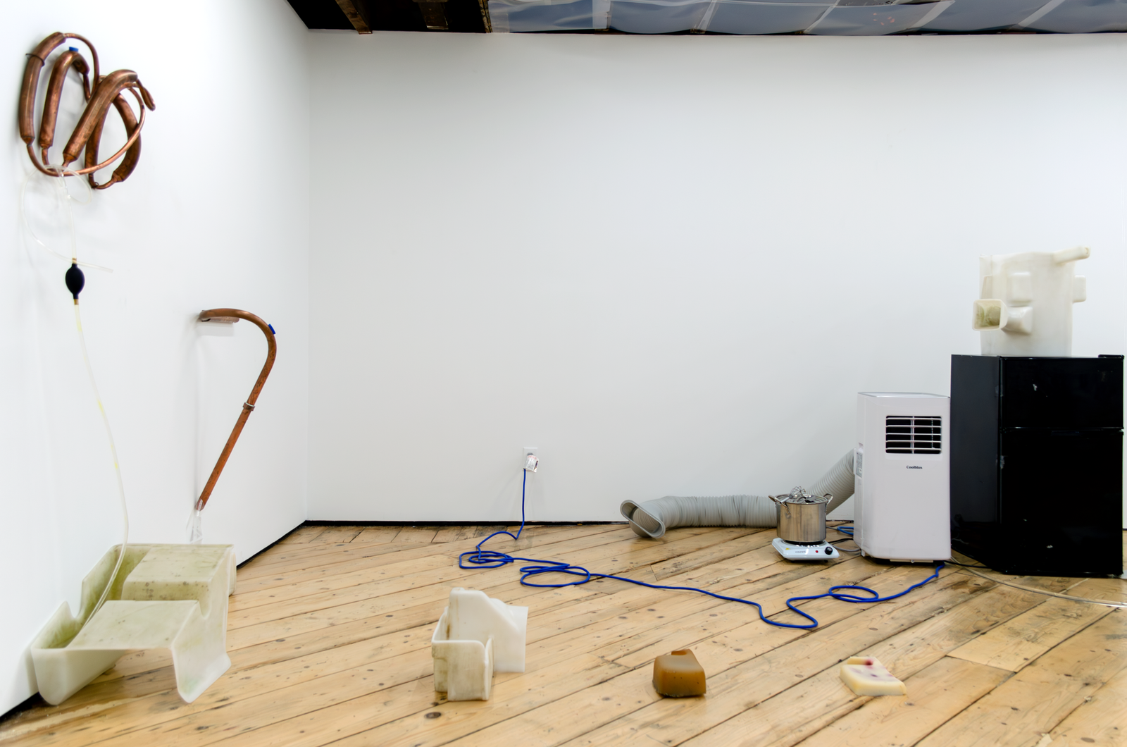 Maite collects liquid breadth from the bucket with an ice tray, which she puts into a freezer connected to the same outlet as the AC. She removes the blue silicon plug from a wall mounted Cooling Unit and siphons out some of the water inside the copper organ to make room for frozen breadth. This leads the Cooling Unit to condense the breadth of another woman in the gallery. It drips into another Coagulator. Maite pours the second woman’s breath from the Coagulator into a pot on a hot plate connected to the same outlet as the AC and the freezer. She mixes agar agar into the pot of boiling breadth and pours it into another Coagulator. Her friend adds a couple of berries to it. Another adds sugar. It sets into a gelatin that Maite takes a bite of. She takes a big breath and puts another ice tray full of liquid breath into the freezer.