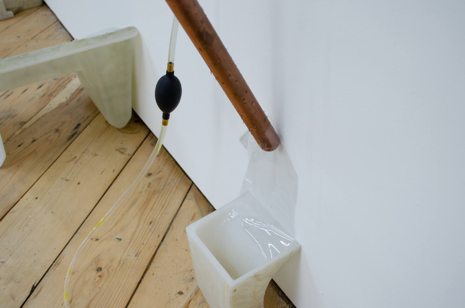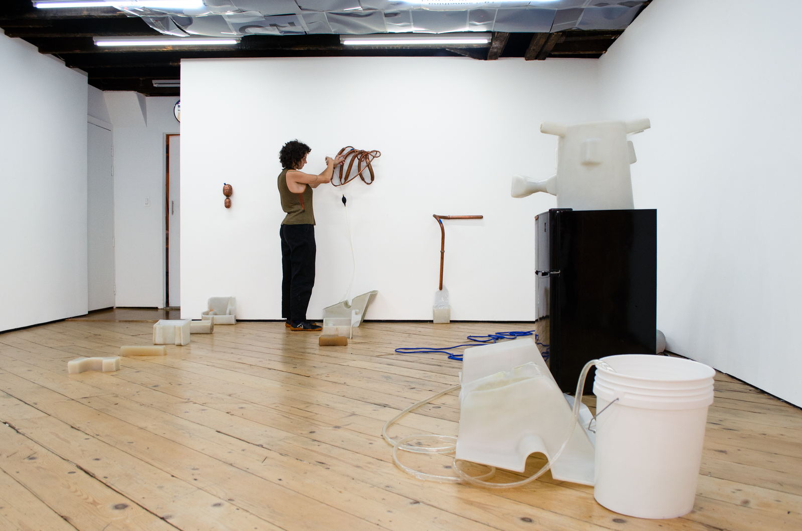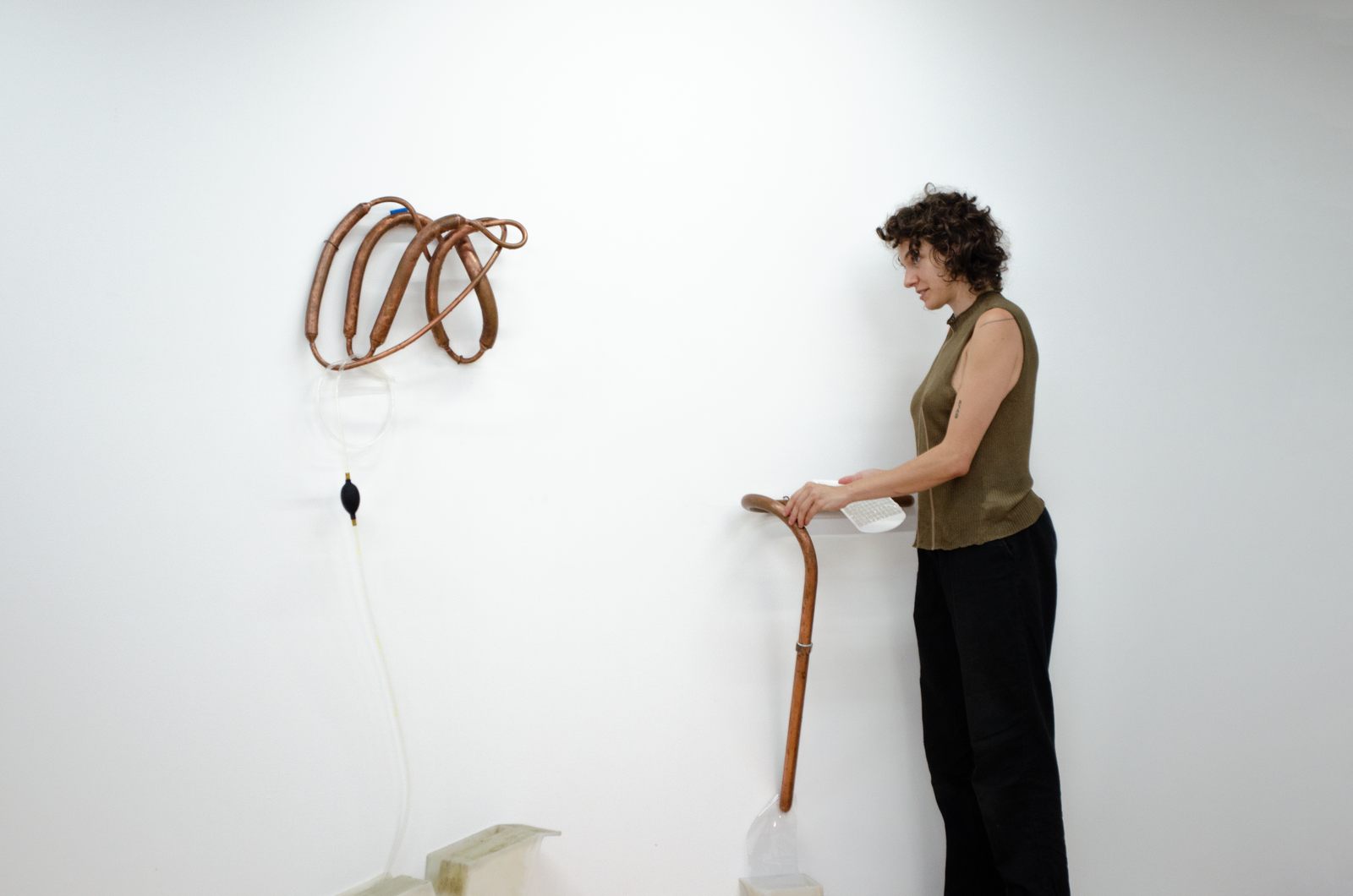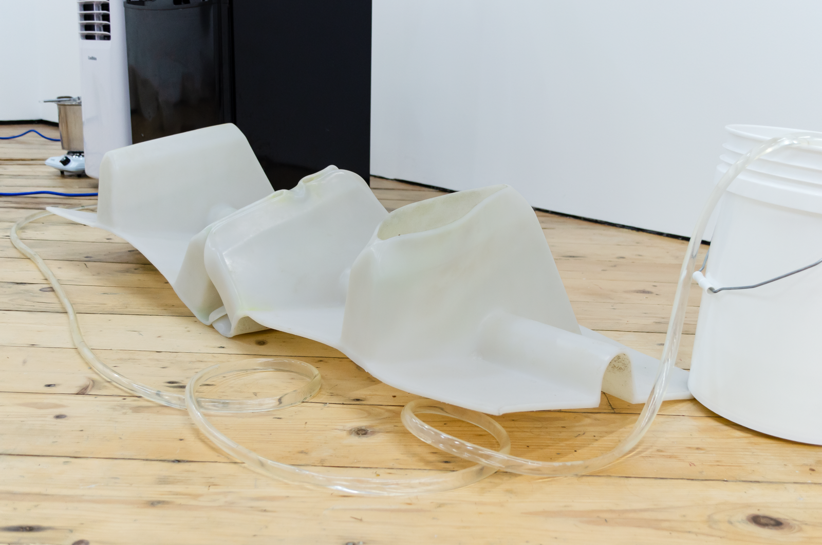 Maite collects liquid breadth from the bucket with an ice tray, which she puts into a freezer connected to the same outlet as the AC. She removes the blue silicon plug from a wall mounted Cooling Unit and siphons out some of the water inside the copper organ to make room for frozen breadth. This leads the Cooling Unit to condense the breadth of another woman in the gallery. It drips into another Coagulator. Maite pours the second woman’s breath from the Coagulator into a pot on a hot plate connected to the same outlet as the AC and the freezer. She mixes agar agar into the pot of boiling breadth and pours it into another Coagulator. Her friend adds a couple of berries to it. Another adds sugar. It sets into a gelatin that Maite takes a bite of. She takes a big breath and puts another ice tray full of liquid breath into the freezer.