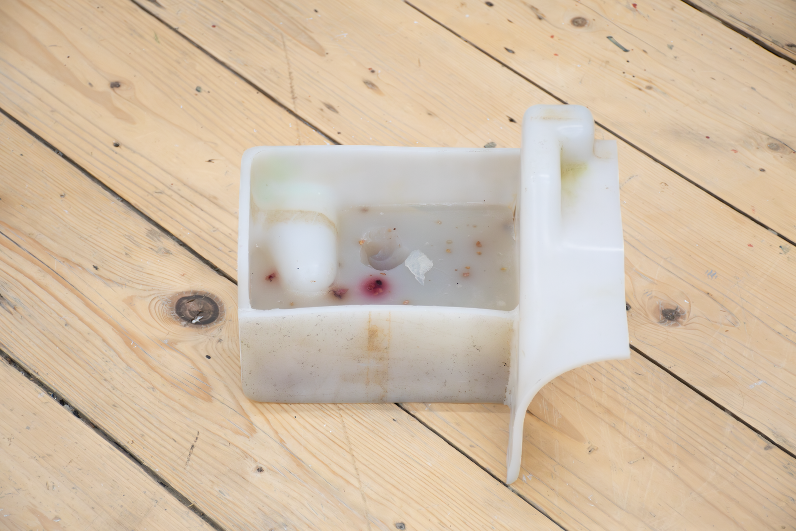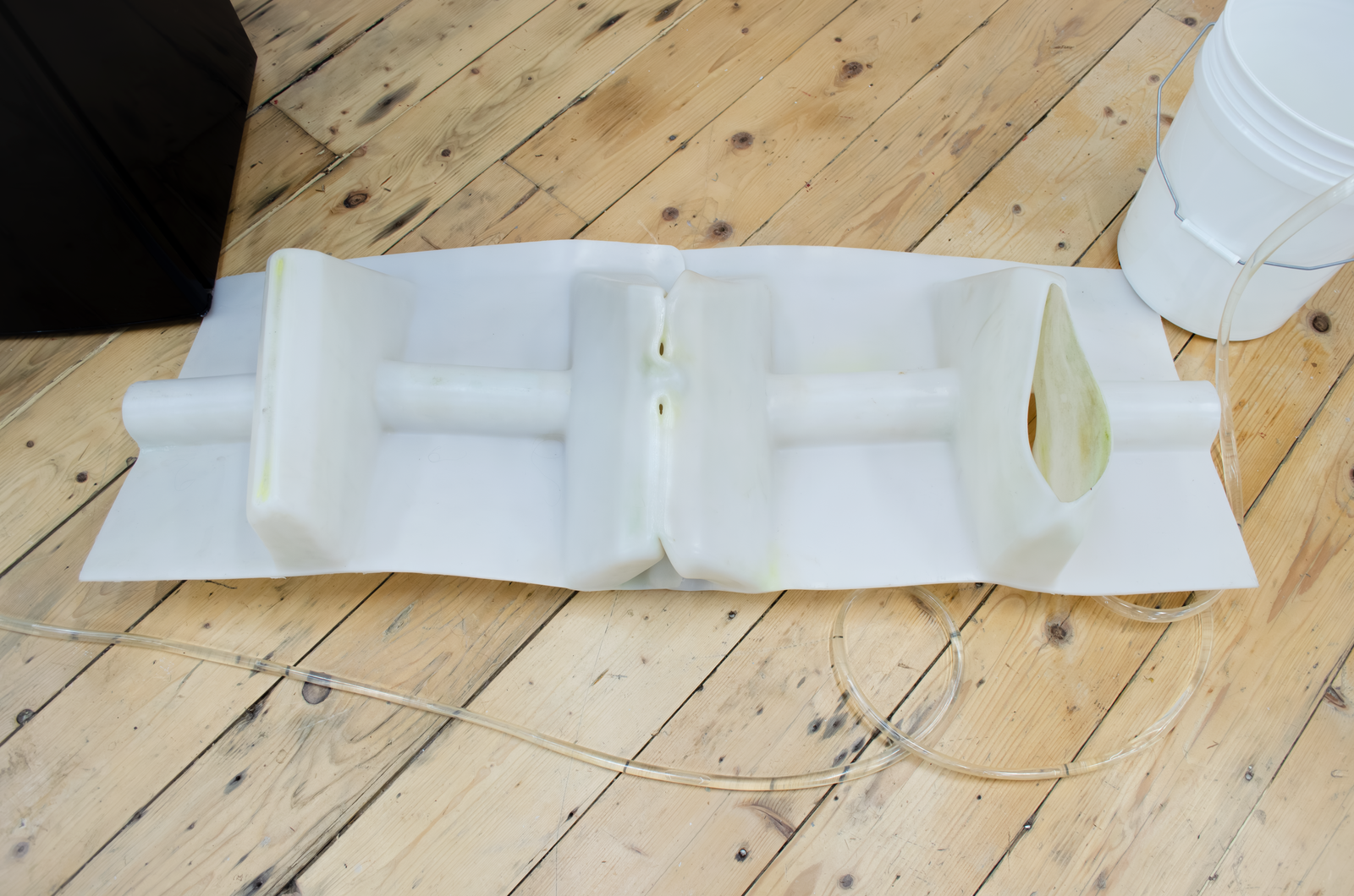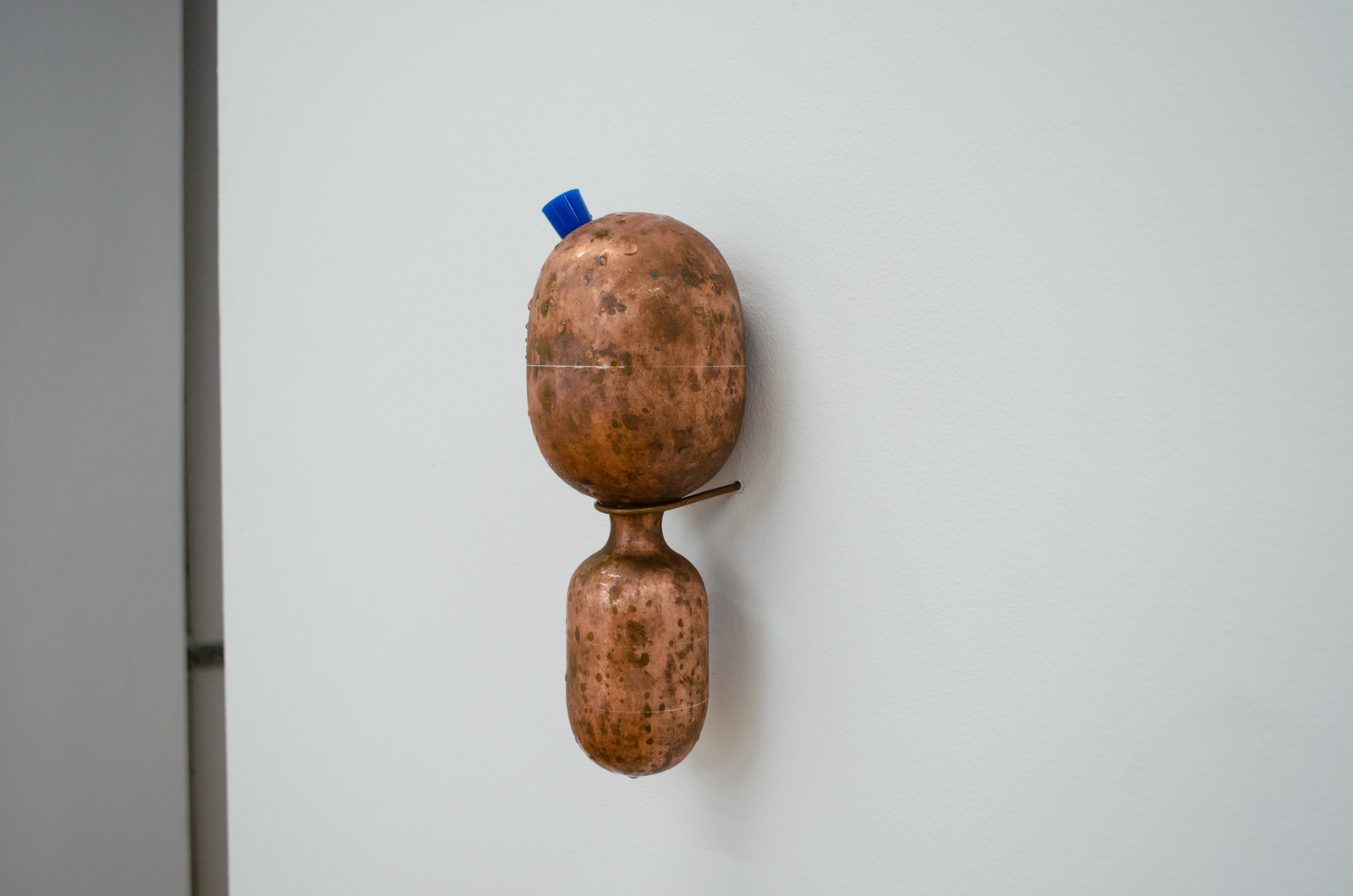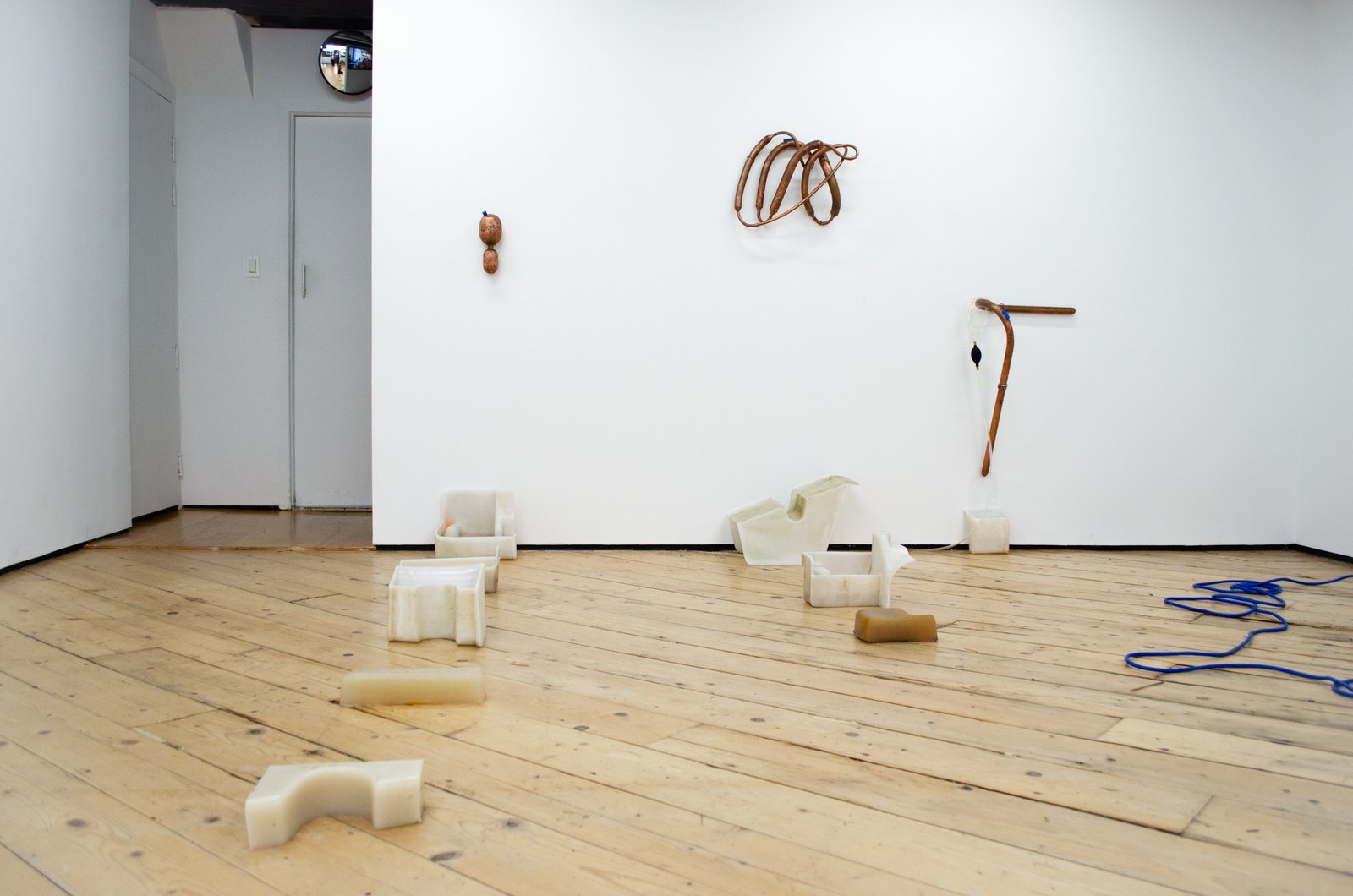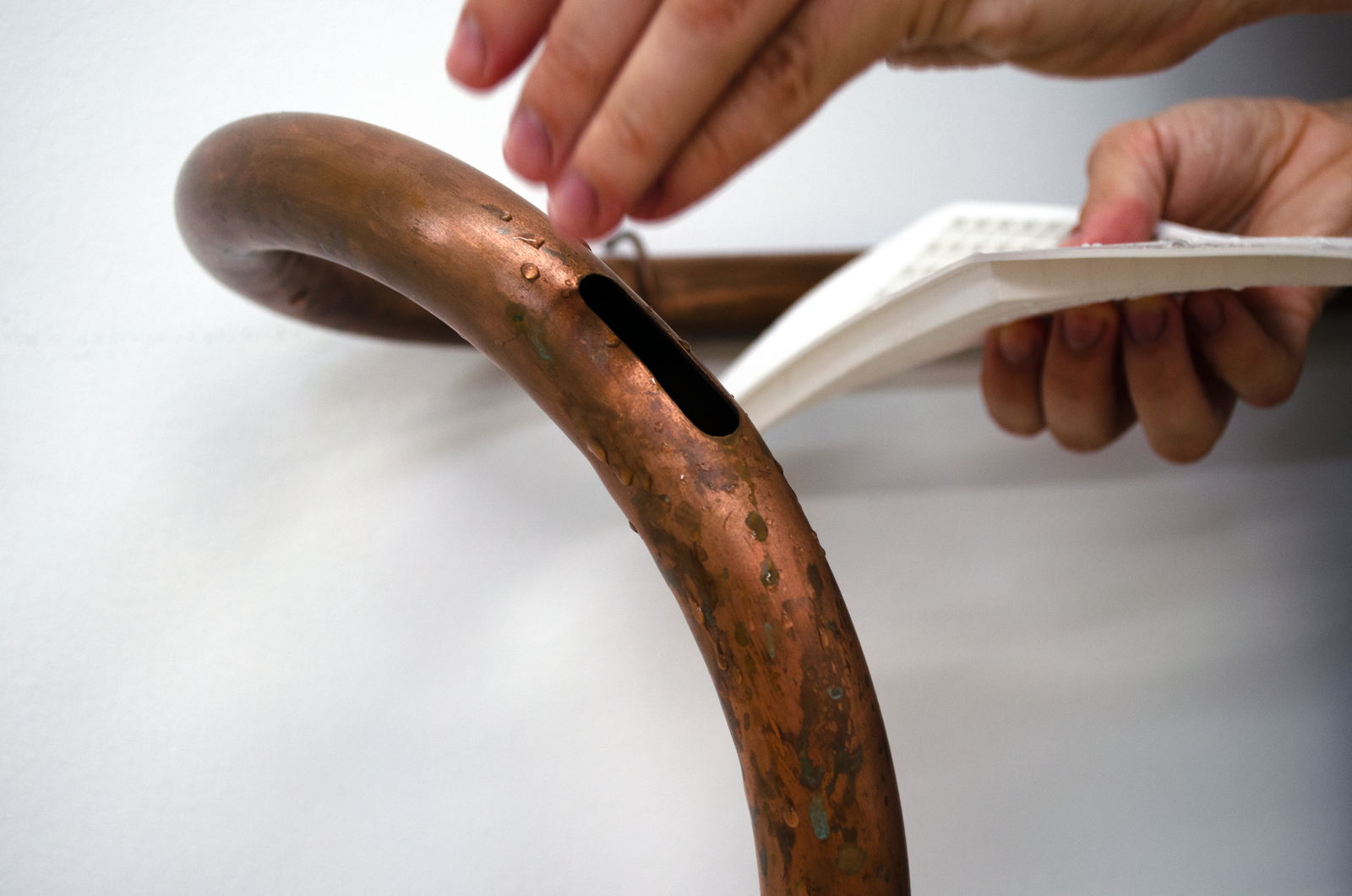 Maite collects liquid breadth from the bucket with an ice tray, which she puts into a freezer connected to the same outlet as the AC. She removes the blue silicon plug from a wall mounted Cooling Unit and siphons out some of the water inside the copper organ to make room for frozen breadth. This leads the Cooling Unit to condense the breadth of another woman in the gallery. It drips into another Coagulator. Maite pours the second woman’s breath from the Coagulator into a pot on a hot plate connected to the same outlet as the AC and the freezer. She mixes agar agar into the pot of boiling breadth and pours it into another Coagulator. Her friend adds a couple of berries to it. Another adds sugar. It sets into a gelatin that Maite takes a bite of. She takes a big breath and puts another ice tray full of liquid breath into the freezer.