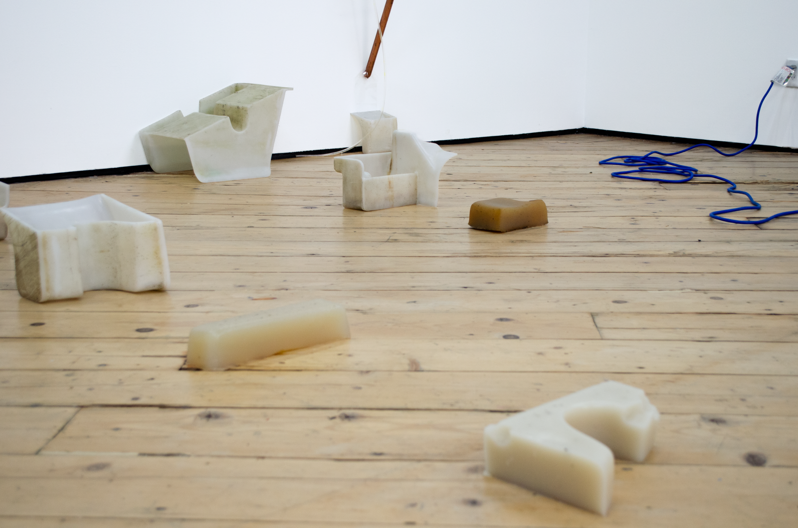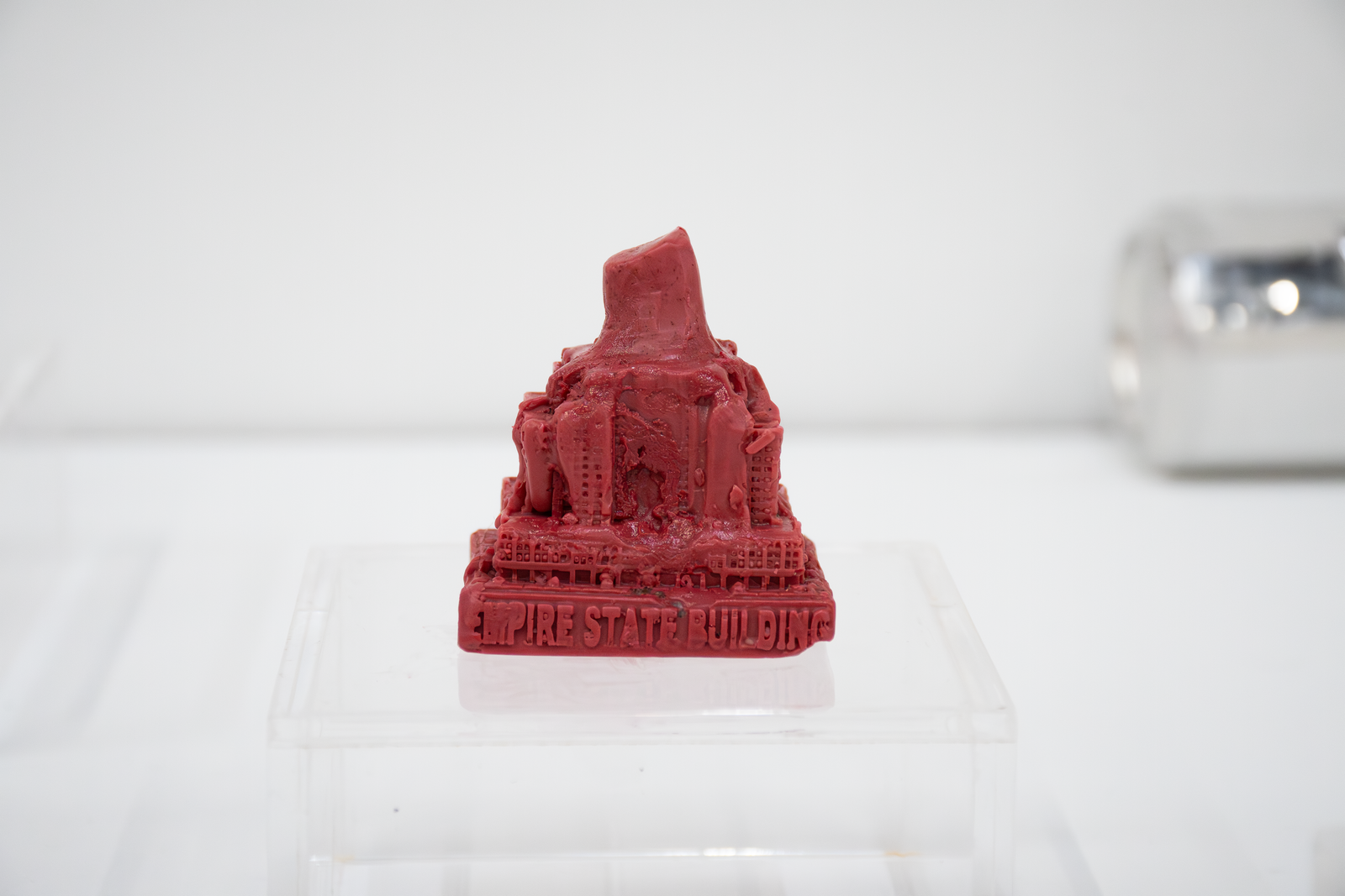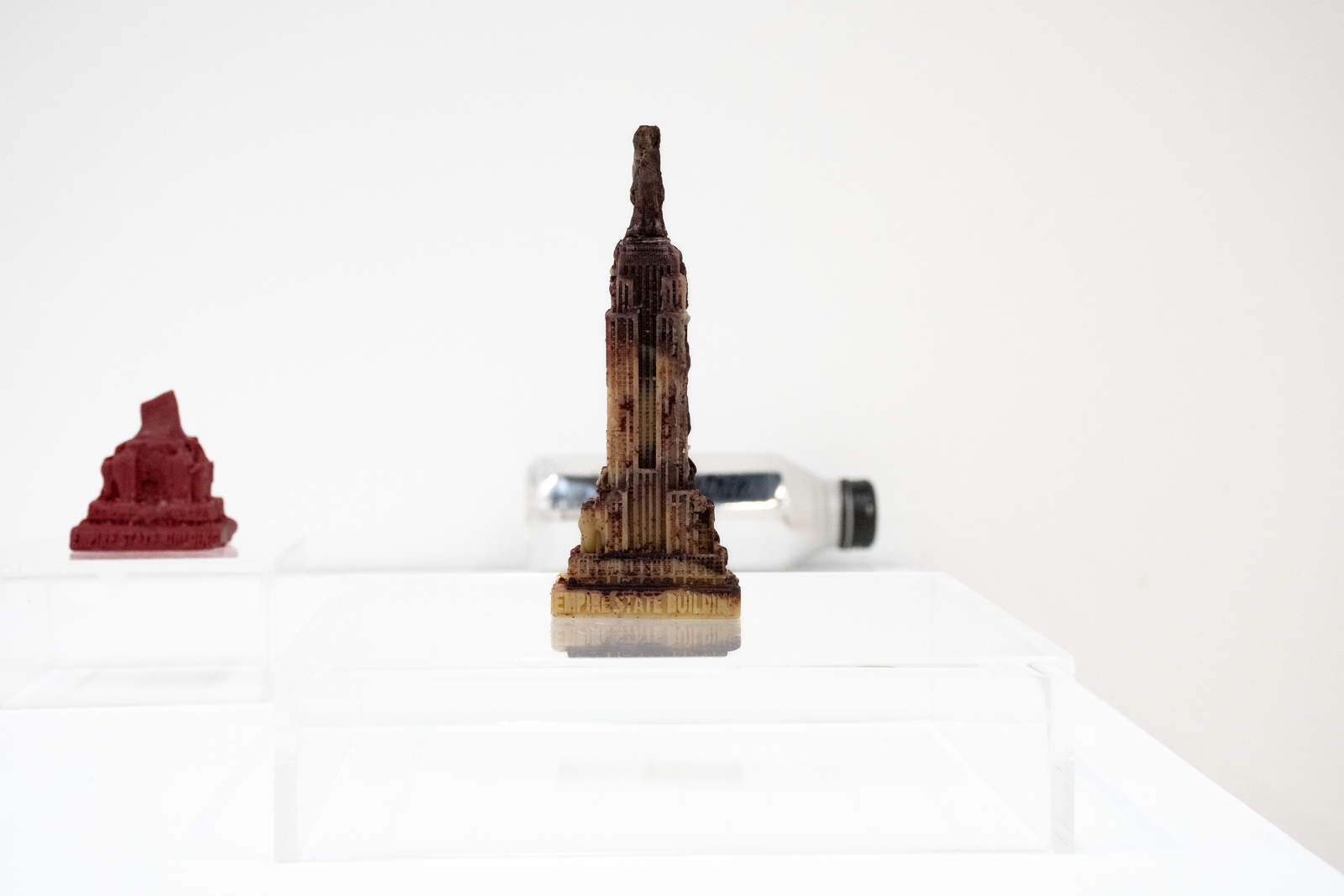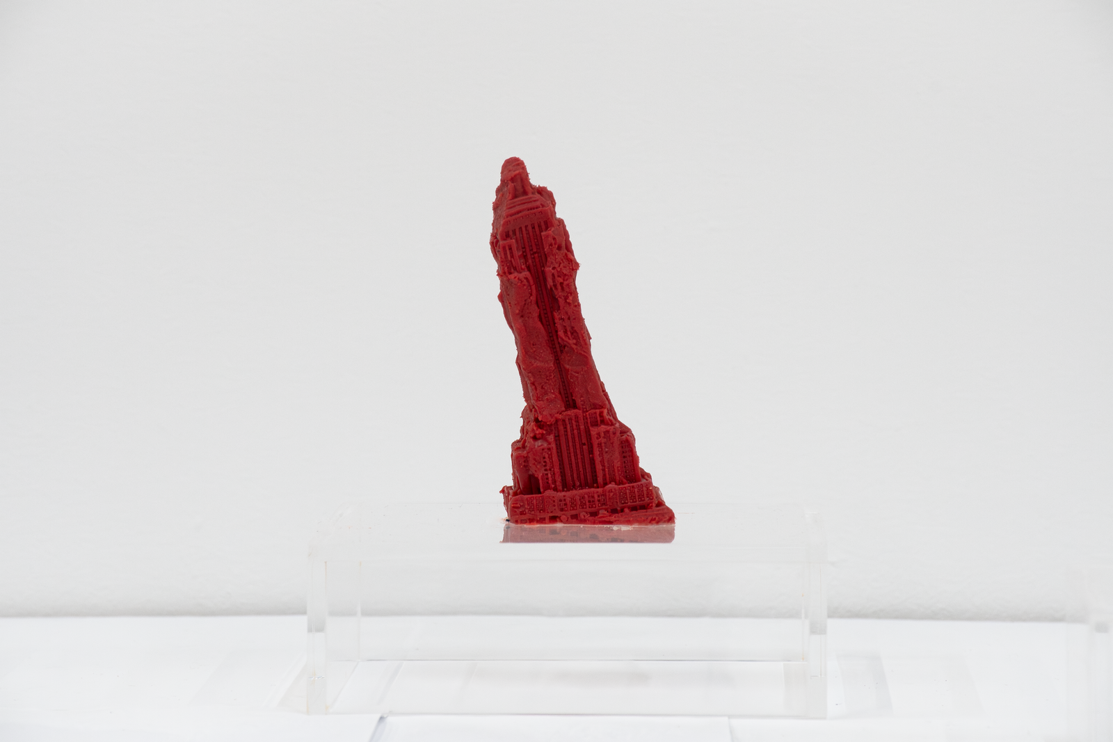 Both artists in Amenities attempt to slow down infrastructure by placing the human body in-between infrastructure and its functions. Zurita’s action of kissing a miniature Empire State Building infantilizes an iconic building while caring for it. By kissing it, she establishes a desire to incorporate it within herself; similar to the hosting of life. In Iribarren Vazquez’s system of Coagulators and Cooling Units’, bodily actions like breathing become material that generates new matter. In Amenities, we find edible sculptures: a chocolate cast of a miniature Empire State Building and cast gelatin made of human breath. Both sculptures are meant to be eaten, the act of eating becomes the last gesture of incorporation.