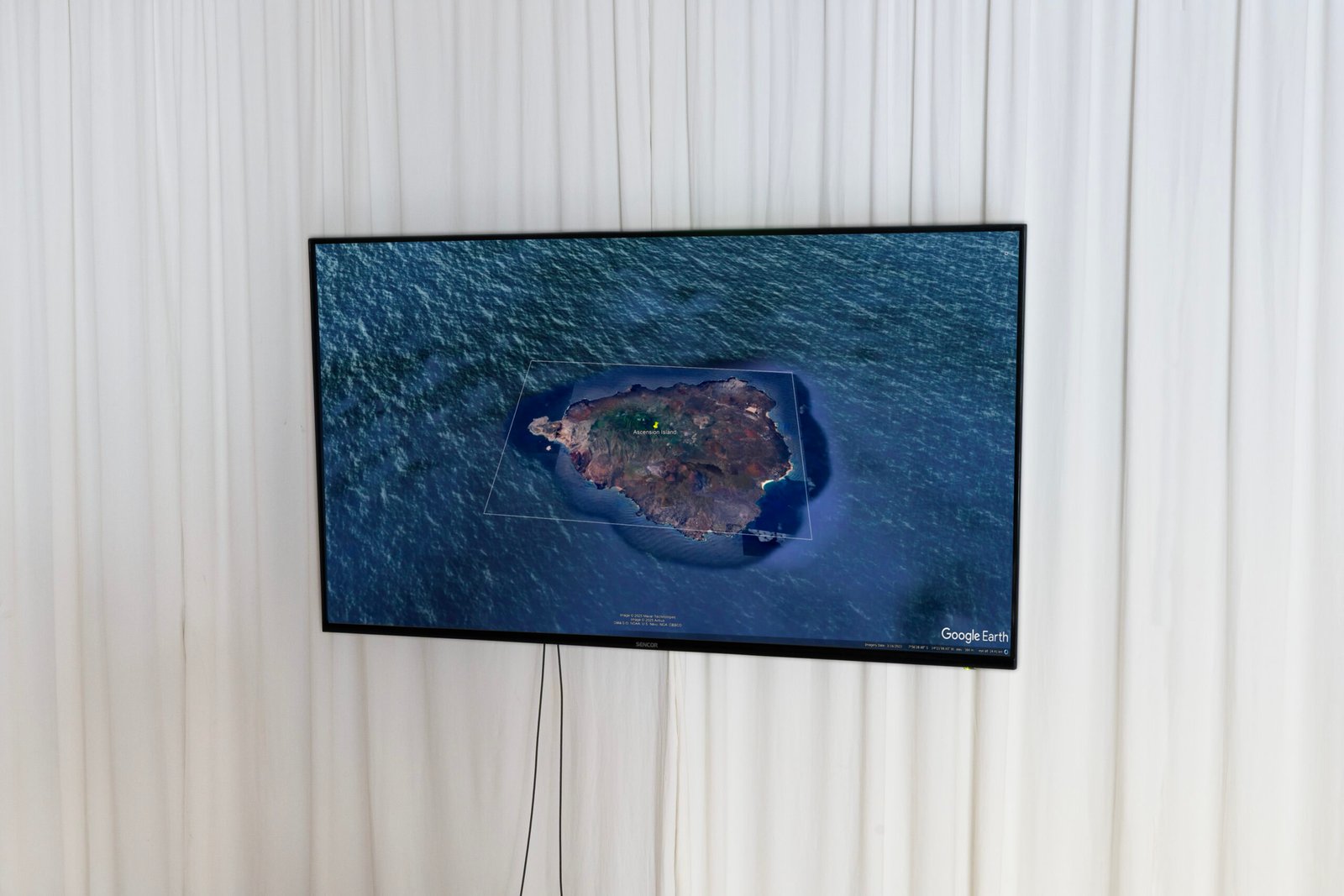 The video Ascension: Blossoms of Power serves as the exhibition’s core, combining digital mapping, archival material, and speculation to present the island as both real and constructed. Its final shift to a plant perspective challenges human-centered narratives.