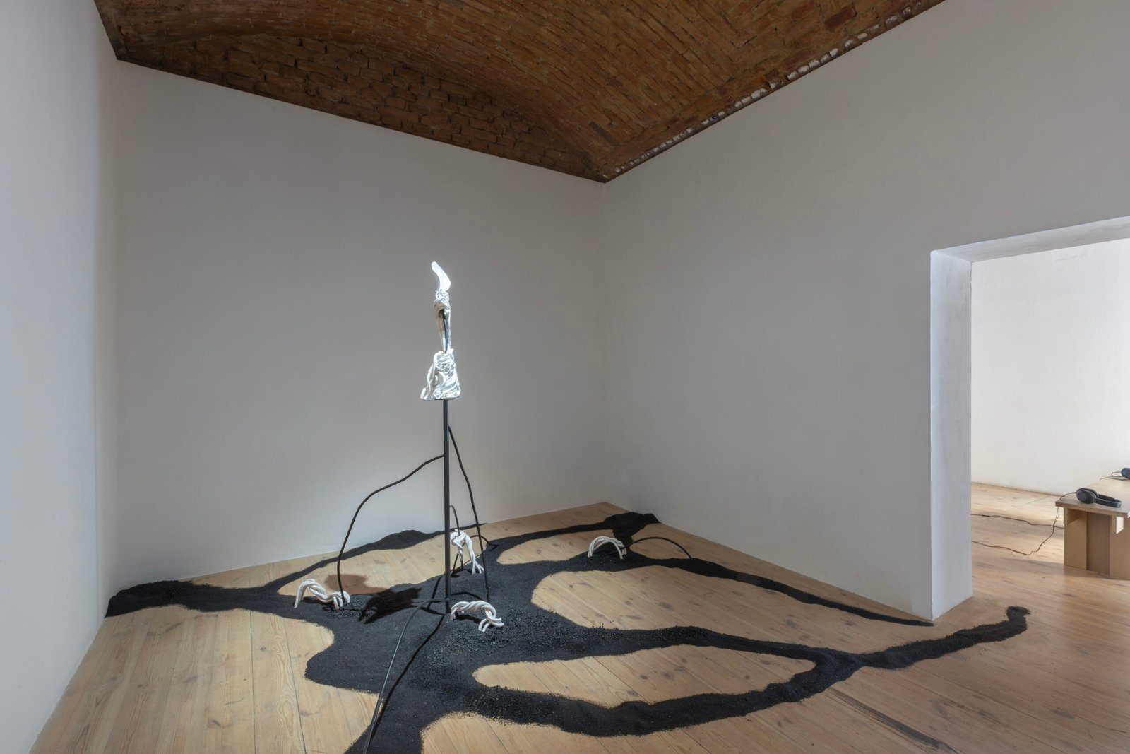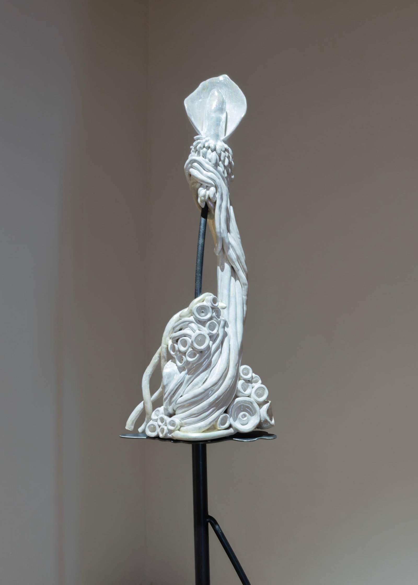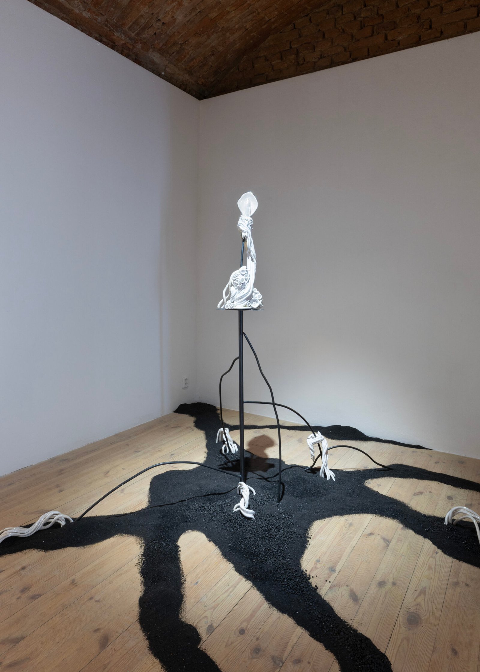 This approach continues in Talking Land, a hybrid ceramic sculpture paired with a rhizomatic floor drawing and a soundscape derived from plant recordings. Together, they evoke a decentralized, responsive ecosystem.