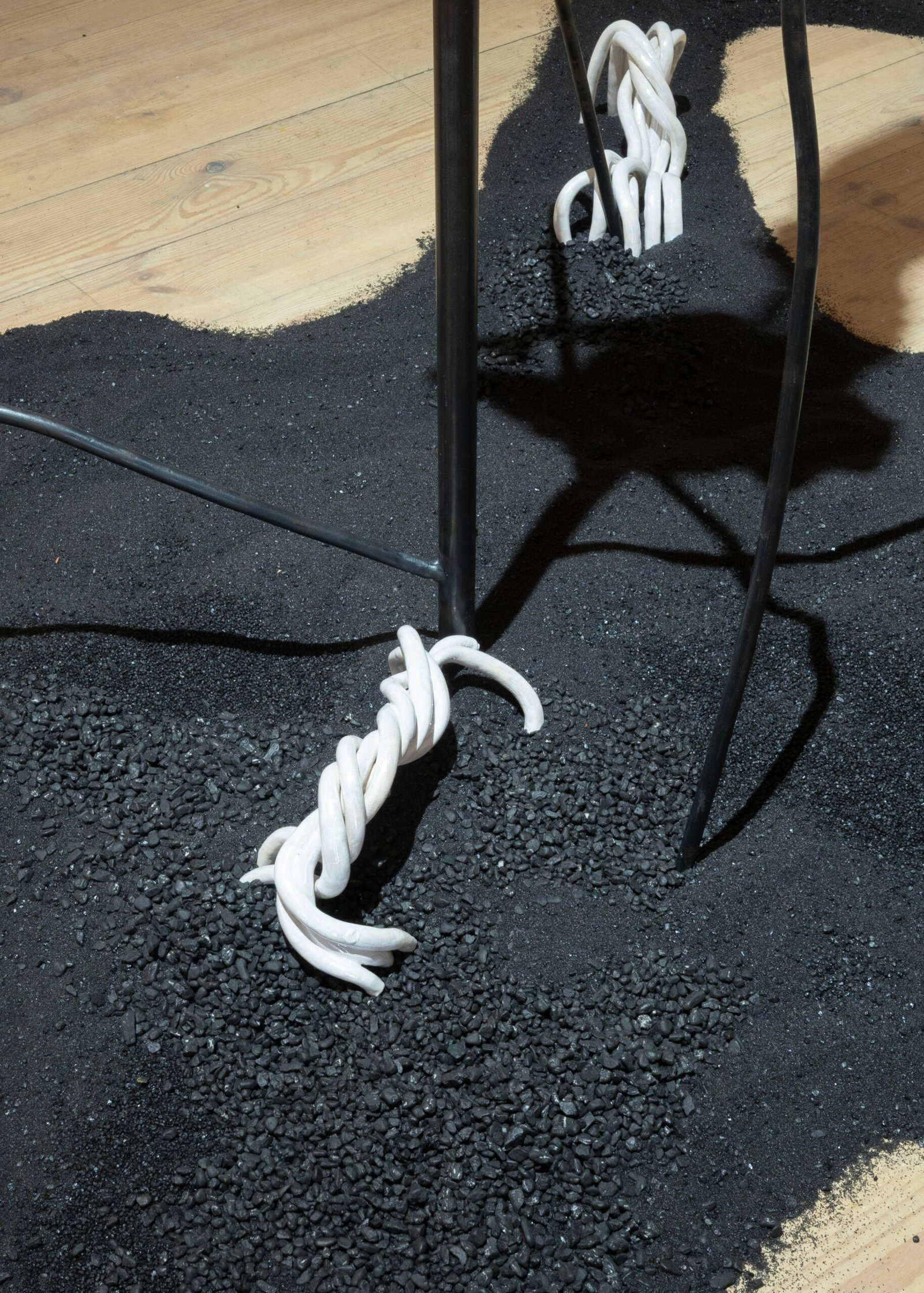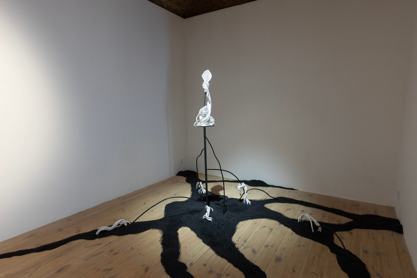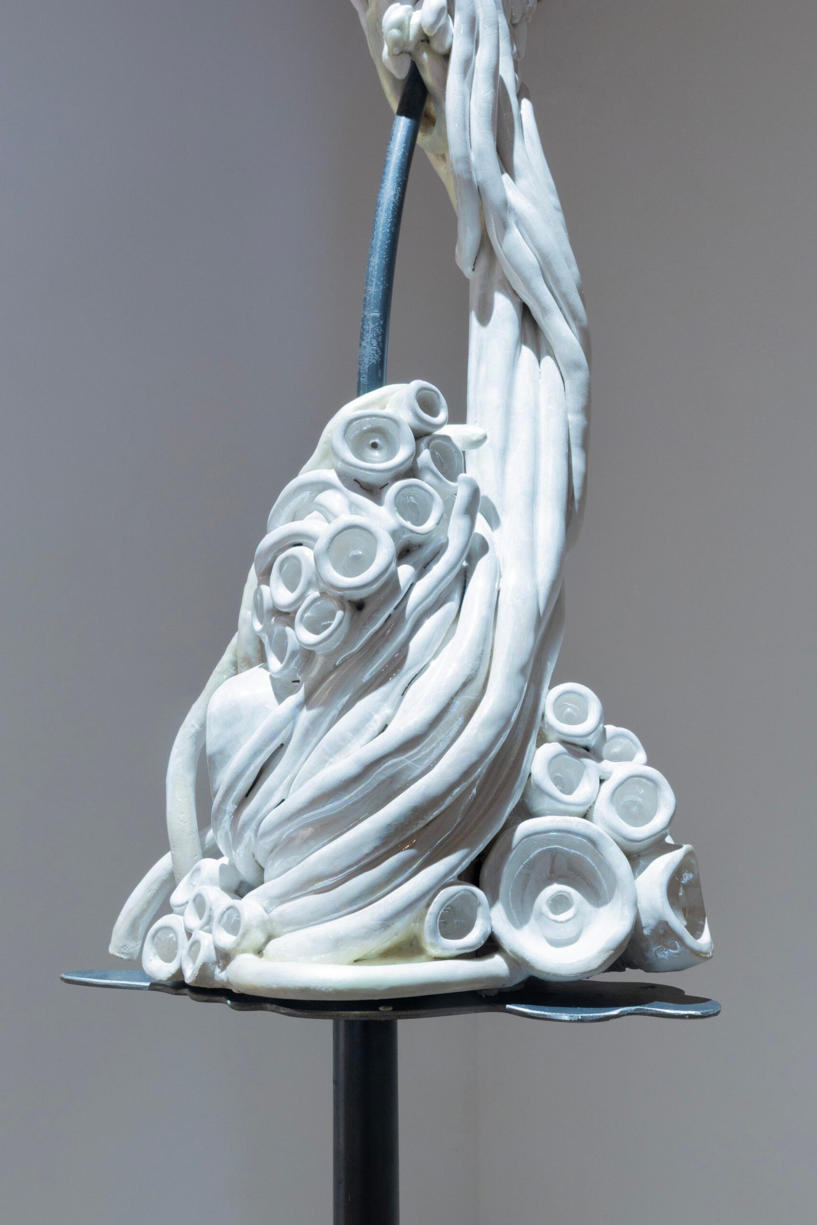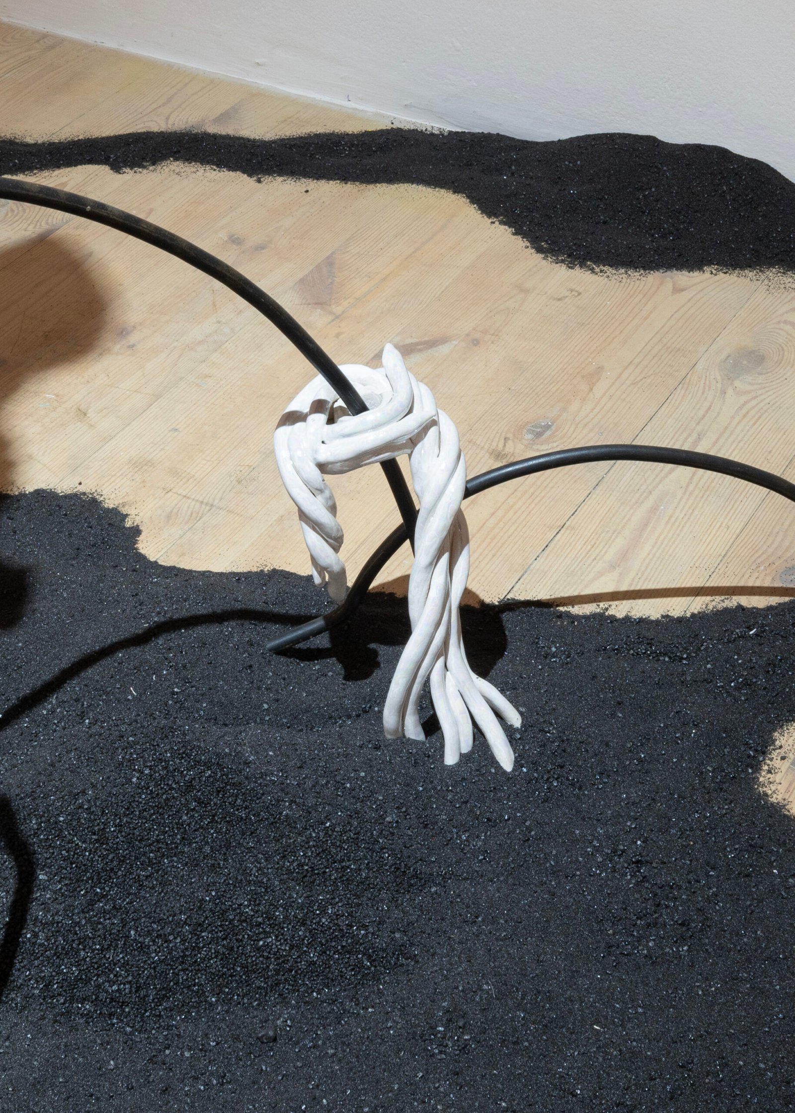 This approach continues in Talking Land, a hybrid ceramic sculpture paired with a rhizomatic floor drawing and a soundscape derived from plant recordings. Together, they evoke a decentralized, responsive ecosystem.