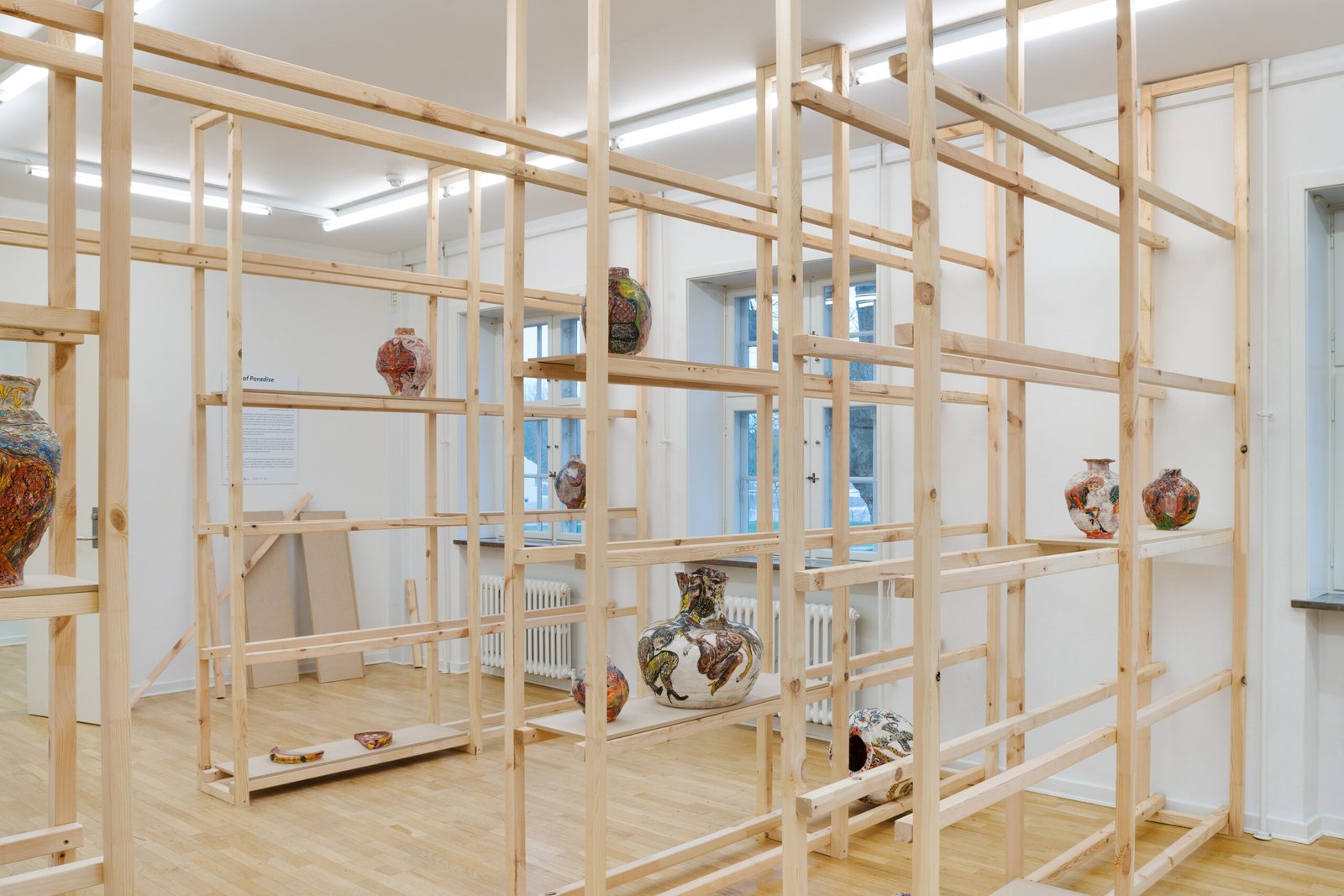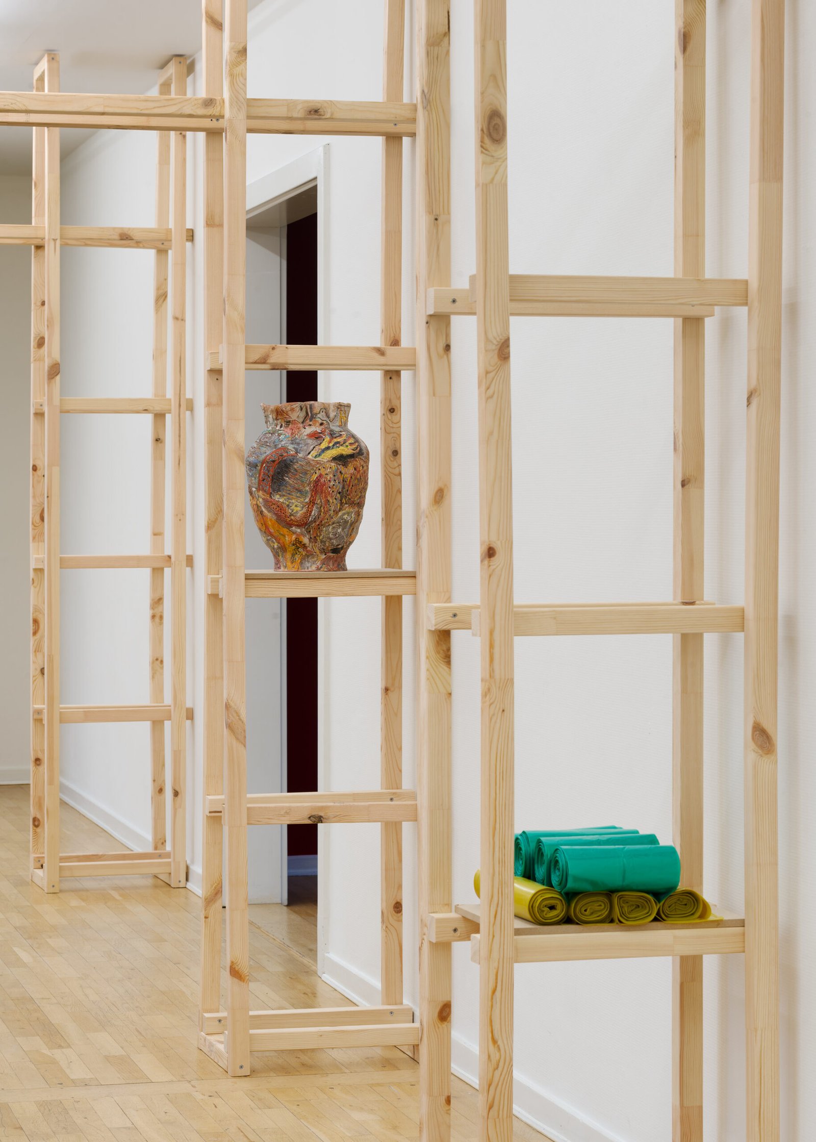 A system of elevated wooden frameworks runs through the corridors. These structures operate simultaneously as supports and as passageways: they direct movement, frame sightlines, and produce partial concealments. Visitors move under, around, and alongside them, becoming aware of their own bodies in relation to architecture. The structures function less as display furniture than as spatial choreography, guiding circulation while also shadowing it. The exhibition unfolds across a sequence of extended rooms, bringing together ceramics, drawings, wooden structures, soil, and a video work still in process. Rather than forming a linear narrative, the works create a contained temporality in which identity, cruising parks, memory, and institutional space exist as parallel environments. Across the walls and ceramic vessels, human and non-human figures appear: animals, hybrid bodies, gestures recalled from parties, intimate encounters, and re-choreographed fragments of memory.