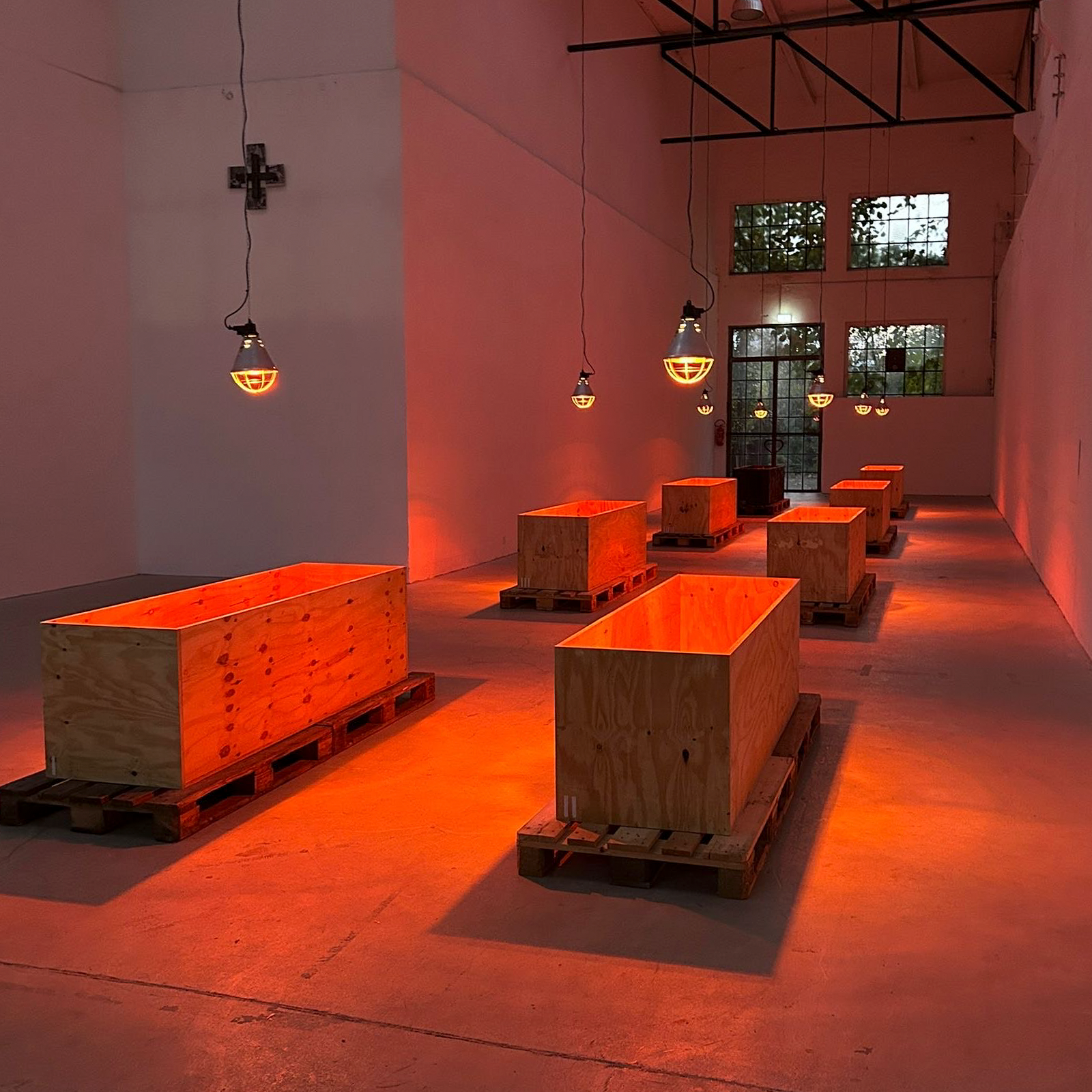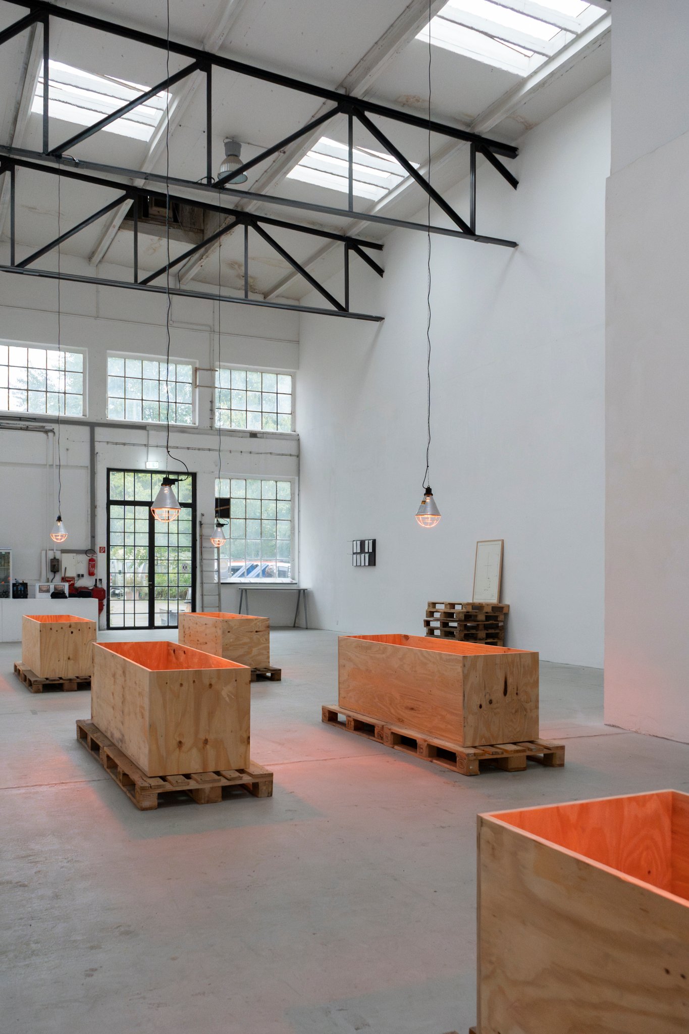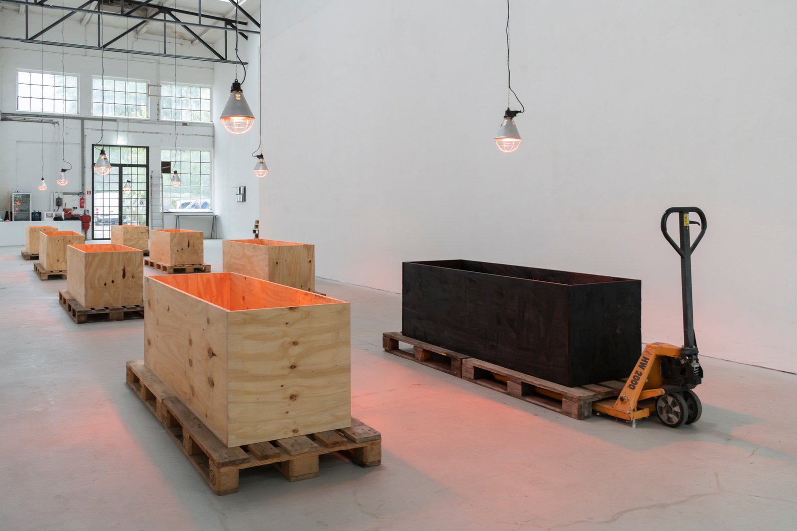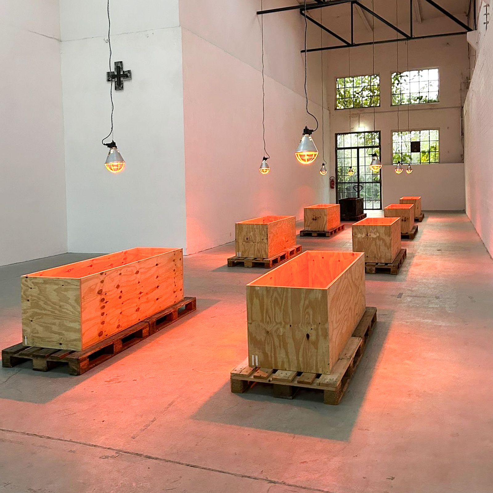 Eight wooden crates, open at the top, stand on pallets, each illuminated by an infrared lamp. One of the crates, burned and preserved with wax and cloves—almost embalmed—breaks the order. It lingers between destruction and healing. The work includes a catalog that serves as both a construction and operating manual. Eight copies hang on the wall, one for each crate. The language of technical precision (“Caution! Cut edges can be dangerous.”) tips into the poetic as soon as it is read in the context of art. The viewer is invited to become an accomplice, to understand the construction plan as a gesture—as an invitation to participate in a philosophy that makes the process of creation itself the subject.