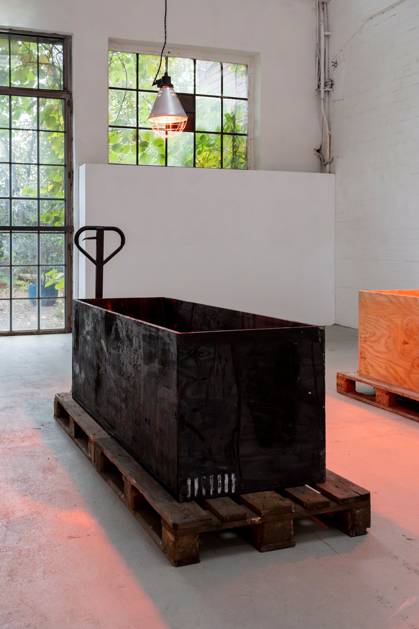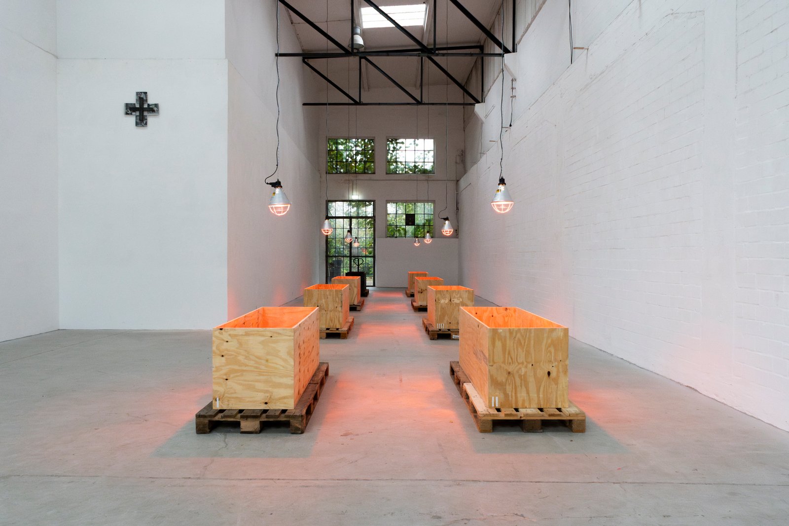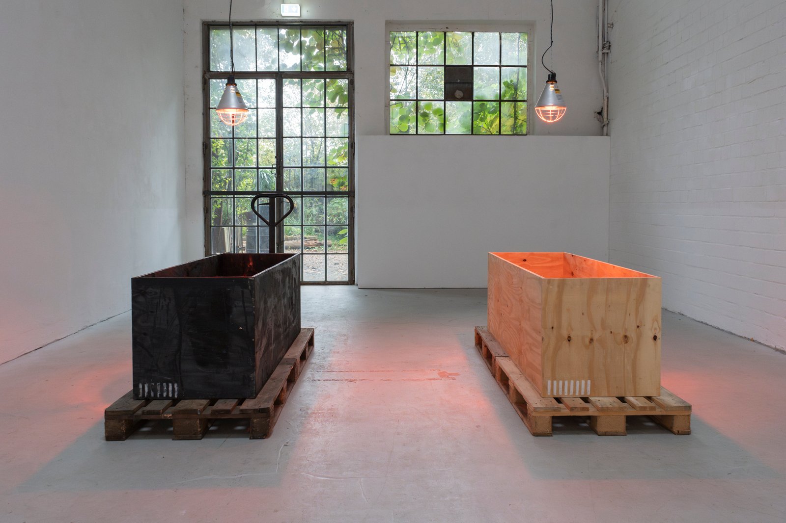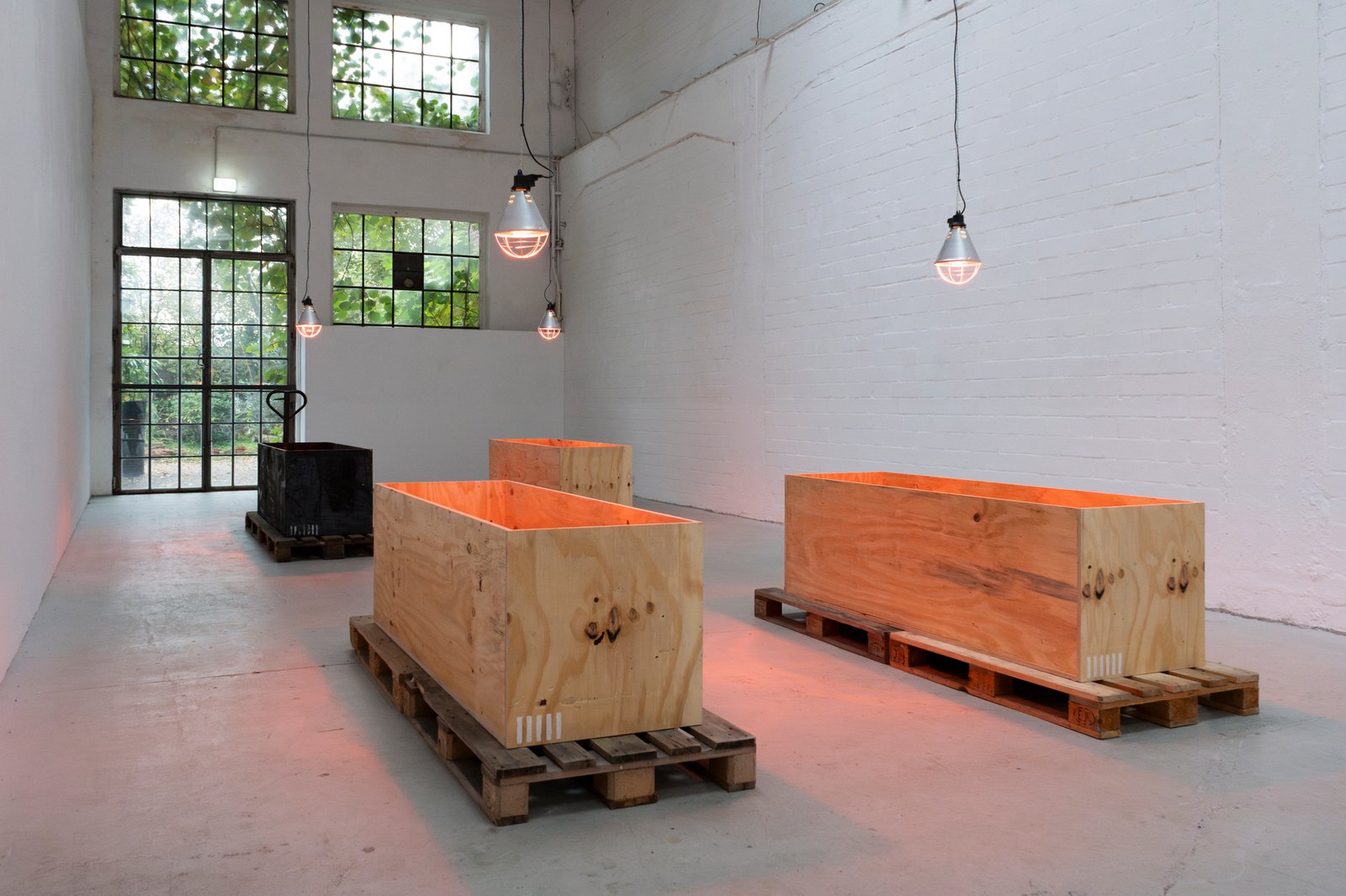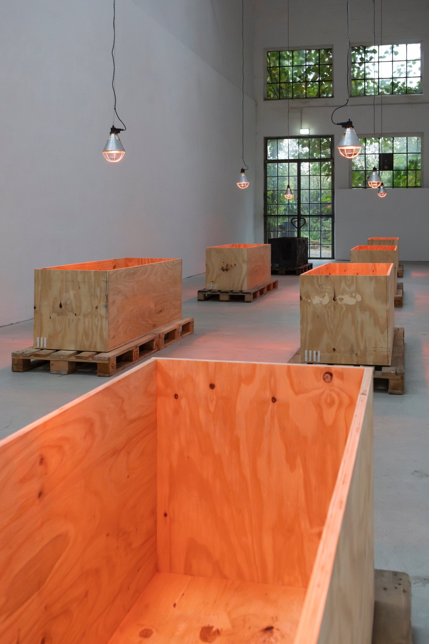 Eight wooden crates, open at the top, stand on pallets, each illuminated by an infrared lamp. One of the crates, burned and preserved with wax and cloves—almost embalmed—breaks the order. It lingers between destruction and healing. The work includes a catalog that serves as both a construction and operating manual. Eight copies hang on the wall, one for each crate. The language of technical precision (“Caution! Cut edges can be dangerous.”) tips into the poetic as soon as it is read in the context of art. The viewer is invited to become an accomplice, to understand the construction plan as a gesture—as an invitation to participate in a philosophy that makes the process of creation itself the subject.