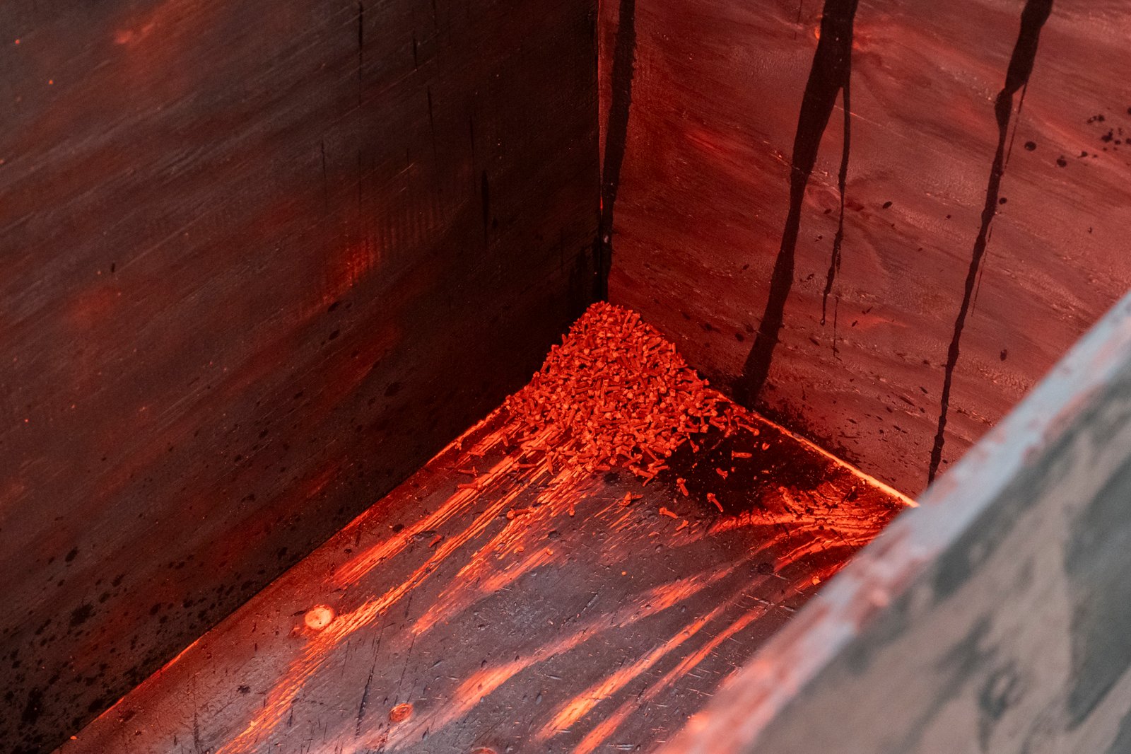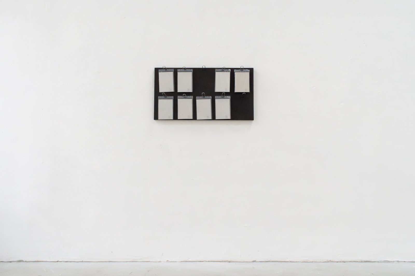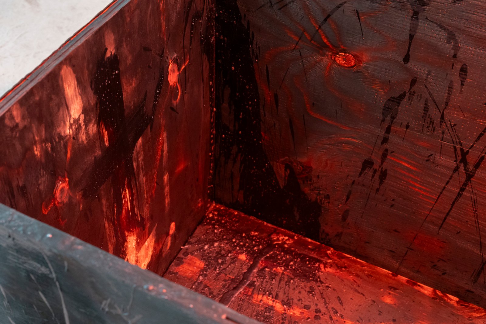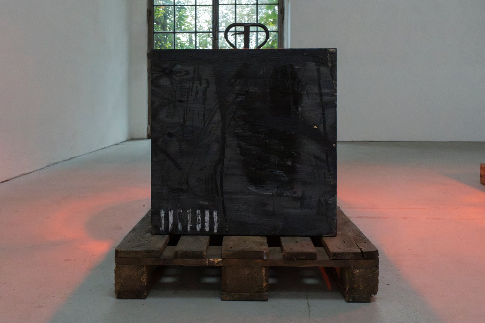 Eight wooden crates, open at the top, stand on pallets, each illuminated by an infrared lamp. One of the crates, burned and preserved with wax and cloves—almost embalmed—breaks the order. It lingers between destruction and healing. The work includes a catalog that serves as both a construction and operating manual. Eight copies hang on the wall, one for each crate. The language of technical precision (“Caution! Cut edges can be dangerous.”) tips into the poetic as soon as it is read in the context of art. The viewer is invited to become an accomplice, to understand the construction plan as a gesture—as an invitation to participate in a philosophy that makes the process of creation itself the subject.