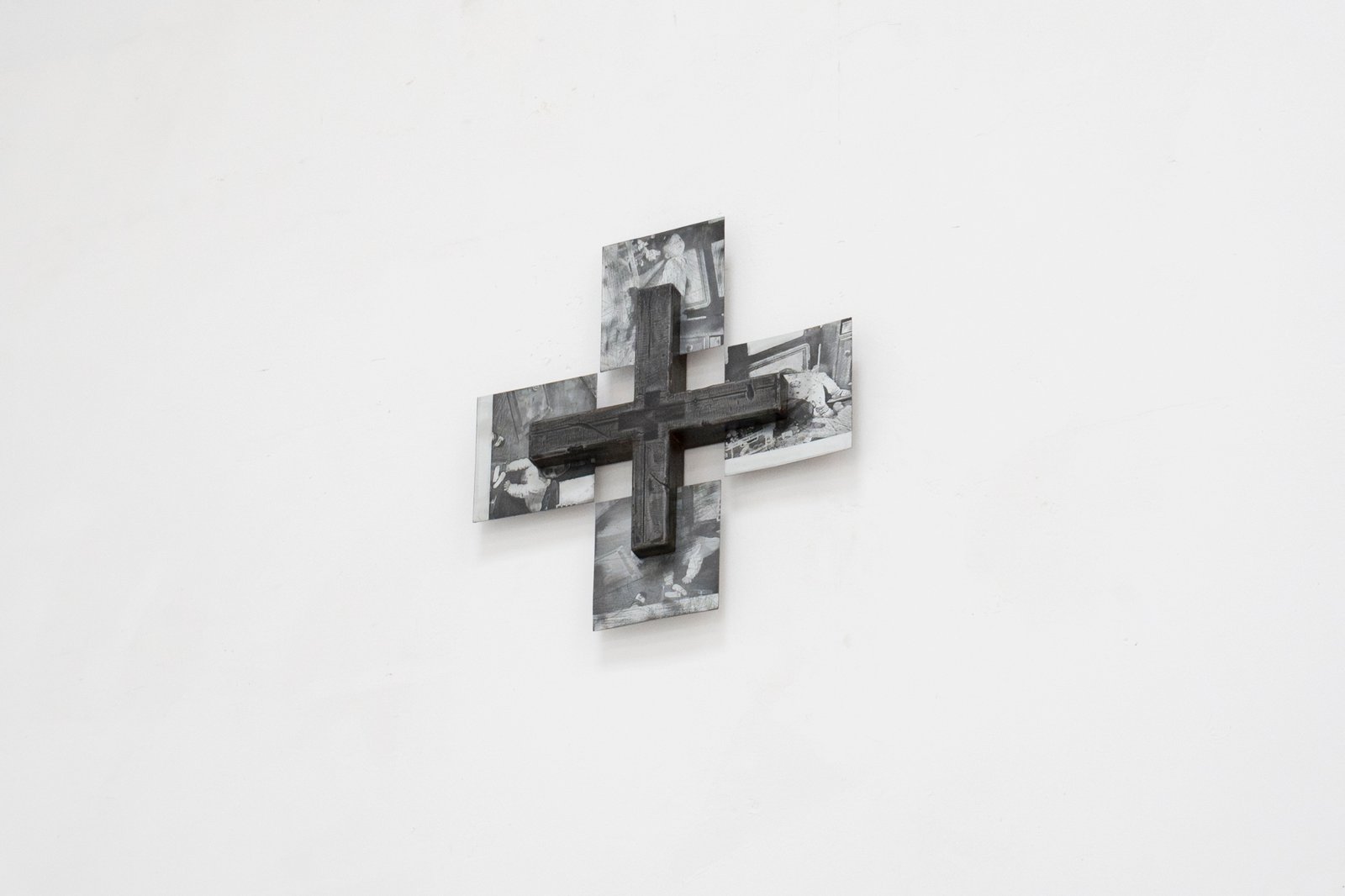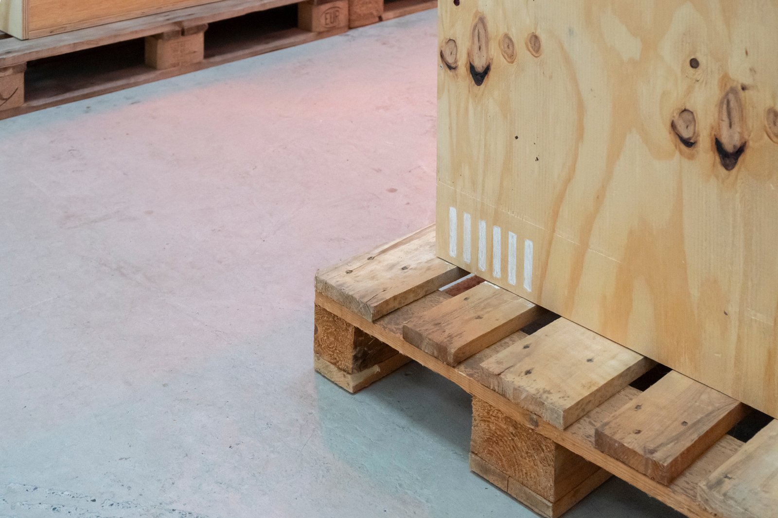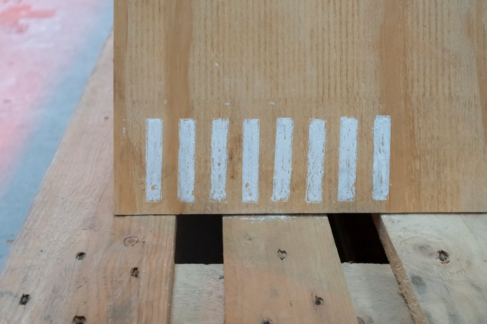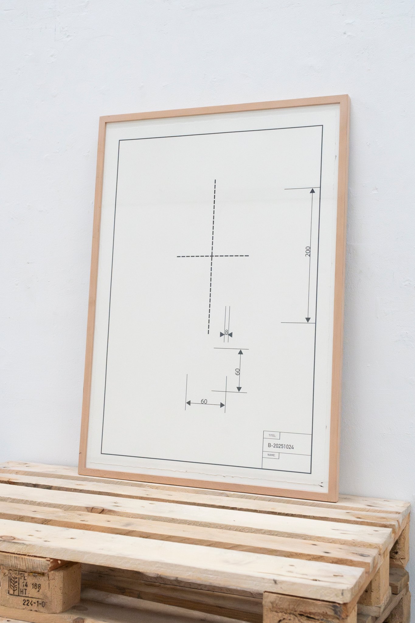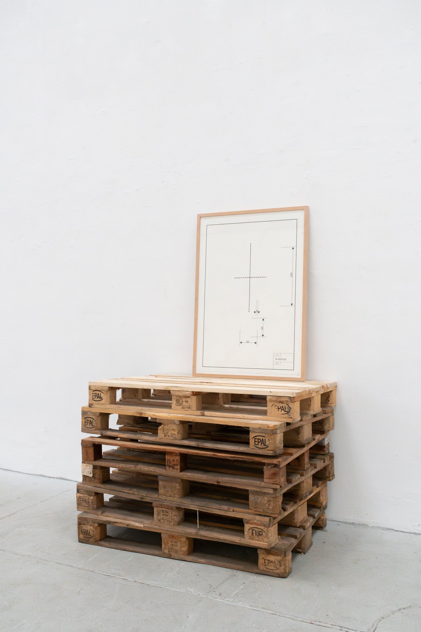 The atmosphere of the installation extends beyond its industrial character. A small crucifix with etched photographs of children, mounted high on the front wing of the exhibition, amplifies the ambivalence. The photographs show children: who they are, what their significance is, whether they are siblings of the artist—all this remains open to interpretation. This element oscillates between coldness and hope, between childlike humor and a sense of community. A technical drawing on pallets marks the dimensions and axes of symmetry of the crates, yet the described object itself is absent. The crate, a vehicle for a philosophical idea, is transformed into intellectual material through this graphic: a representation of a form that thinks more than it shows. The work adopts the language of production in order to question it. Its clear systematic structure generates not certainty, but tension.