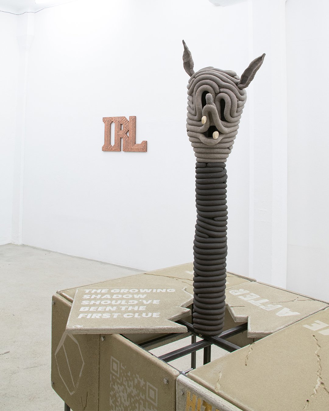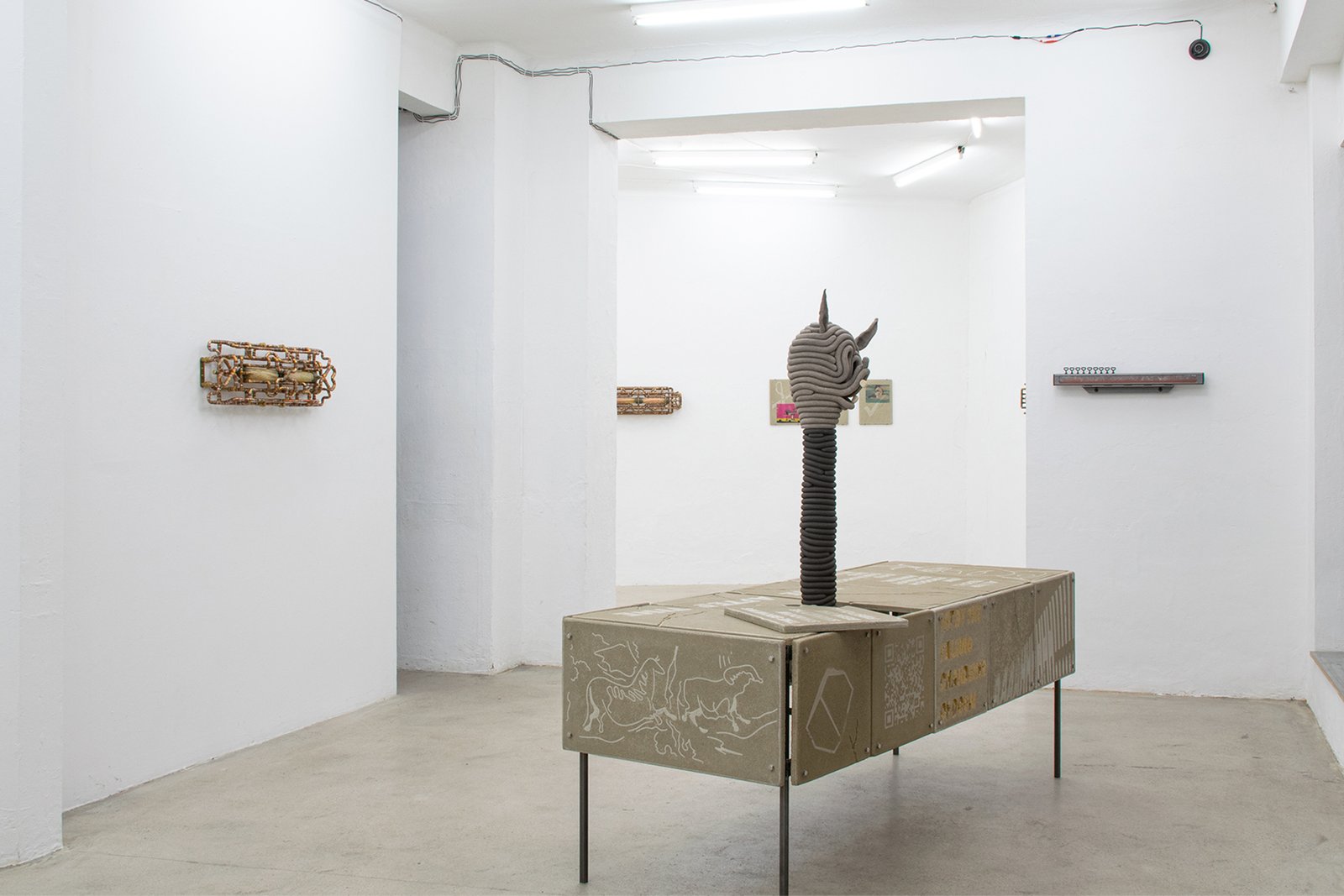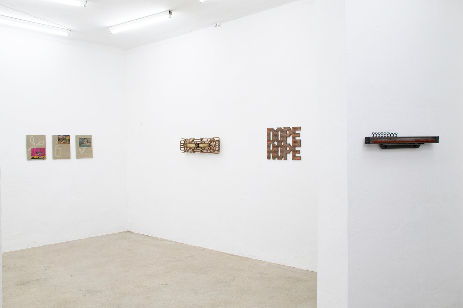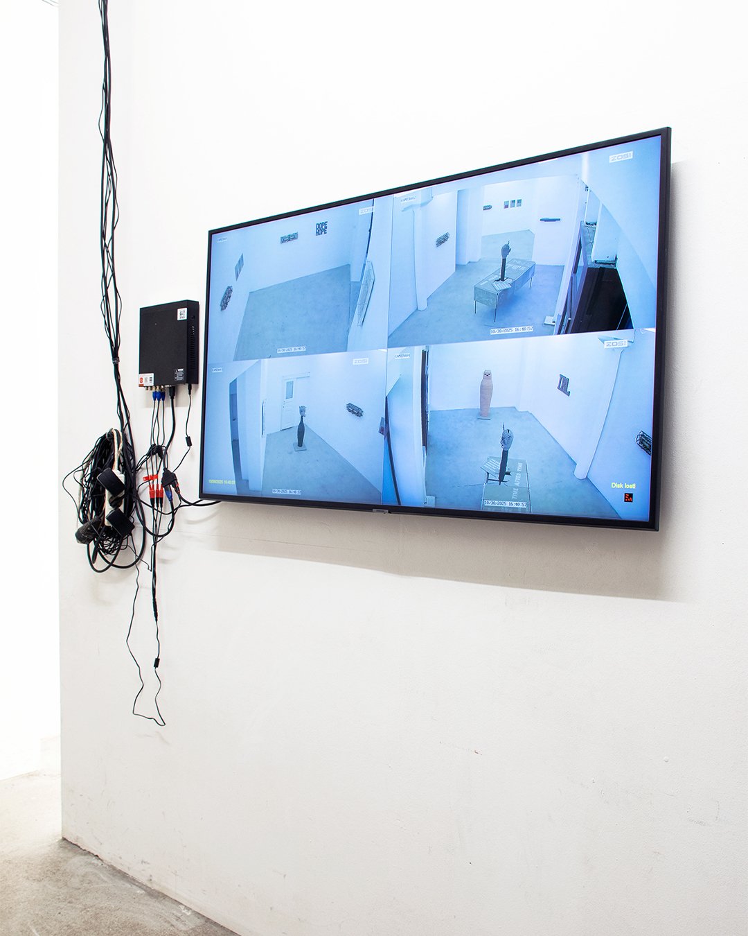Beside the real life exhibition, there was an intentionally installed surveillance system of four cameras to also give a filtered reality version of the show on screen that could be viewed in the backroom of the gallery.