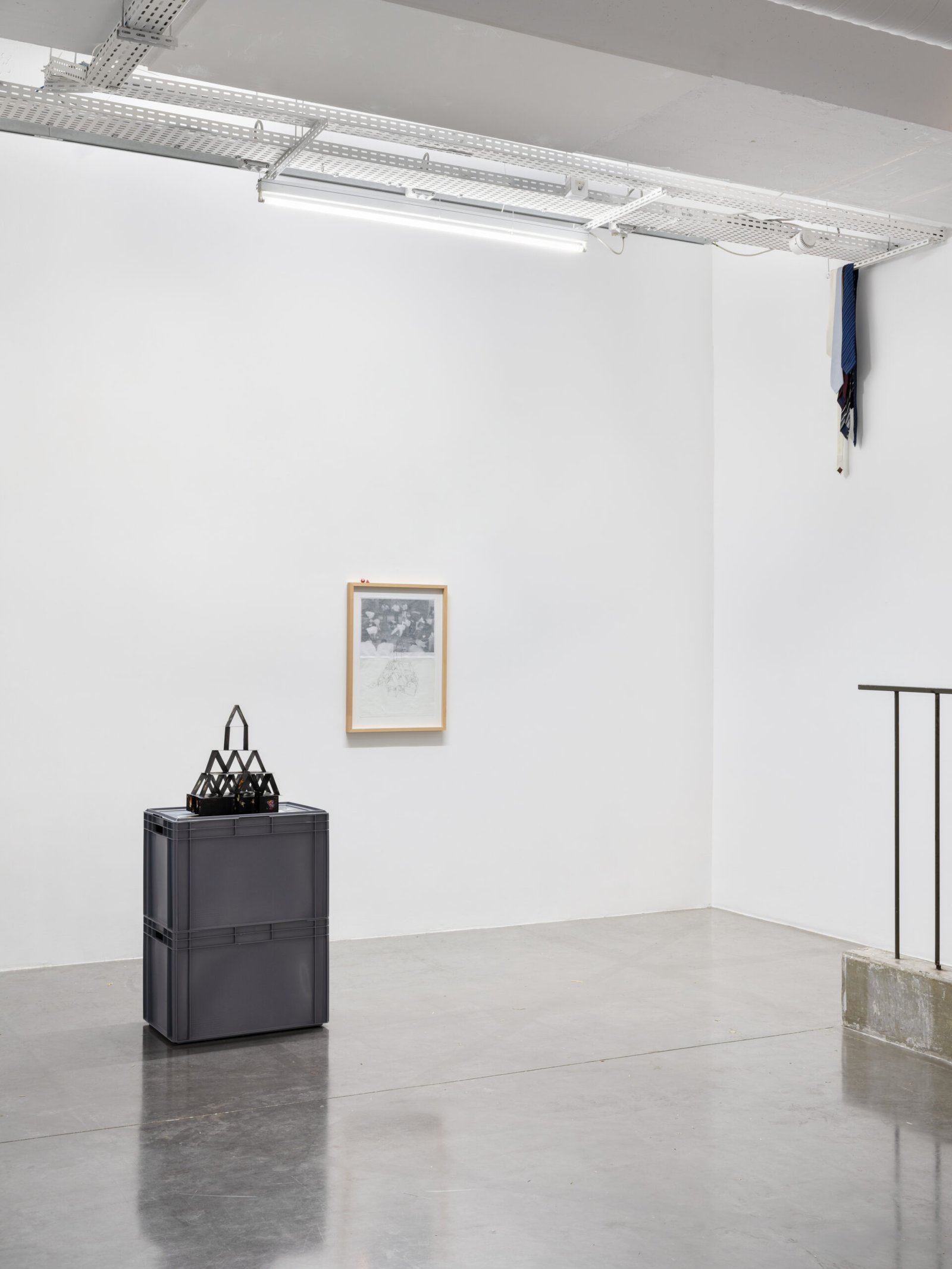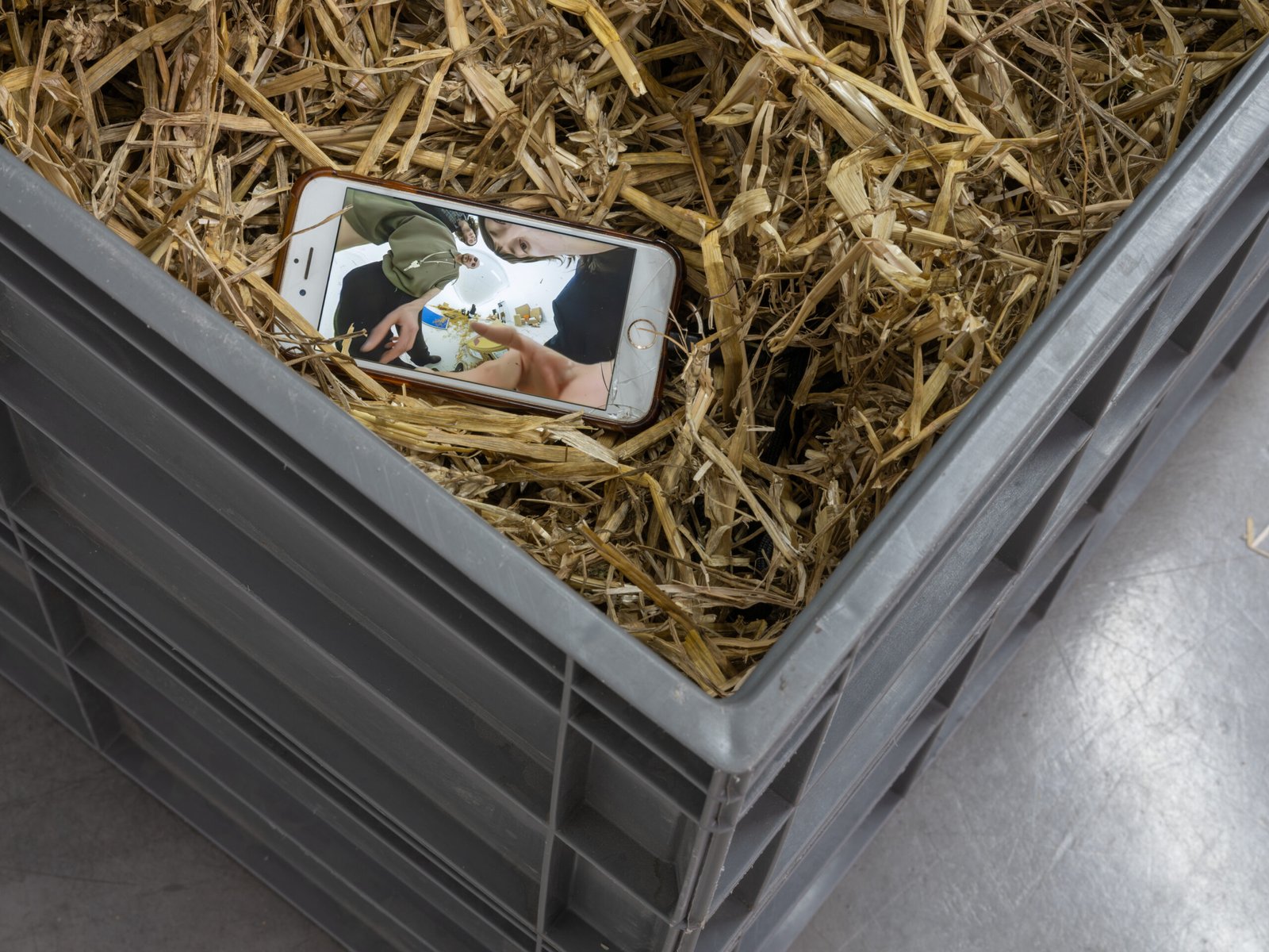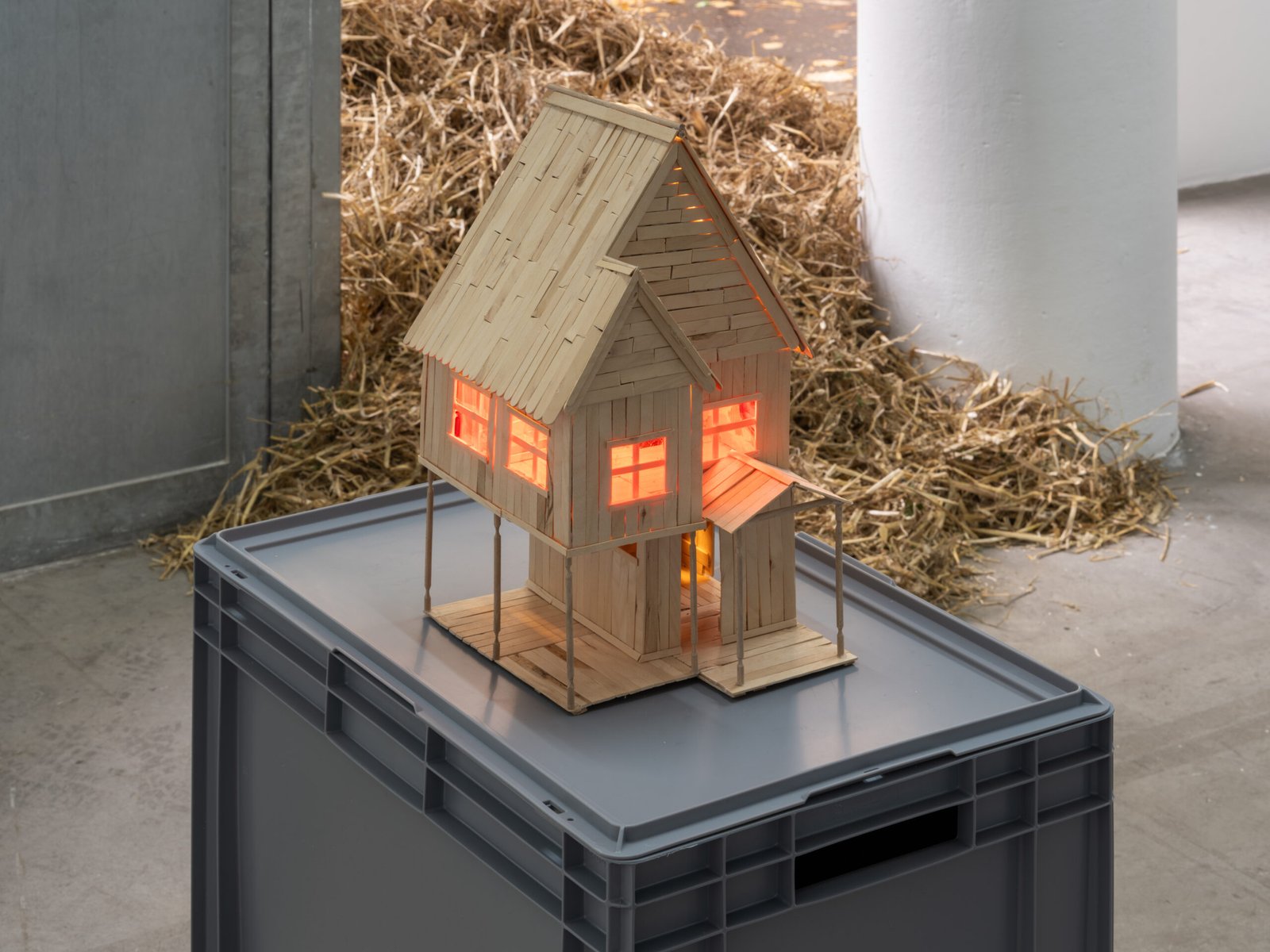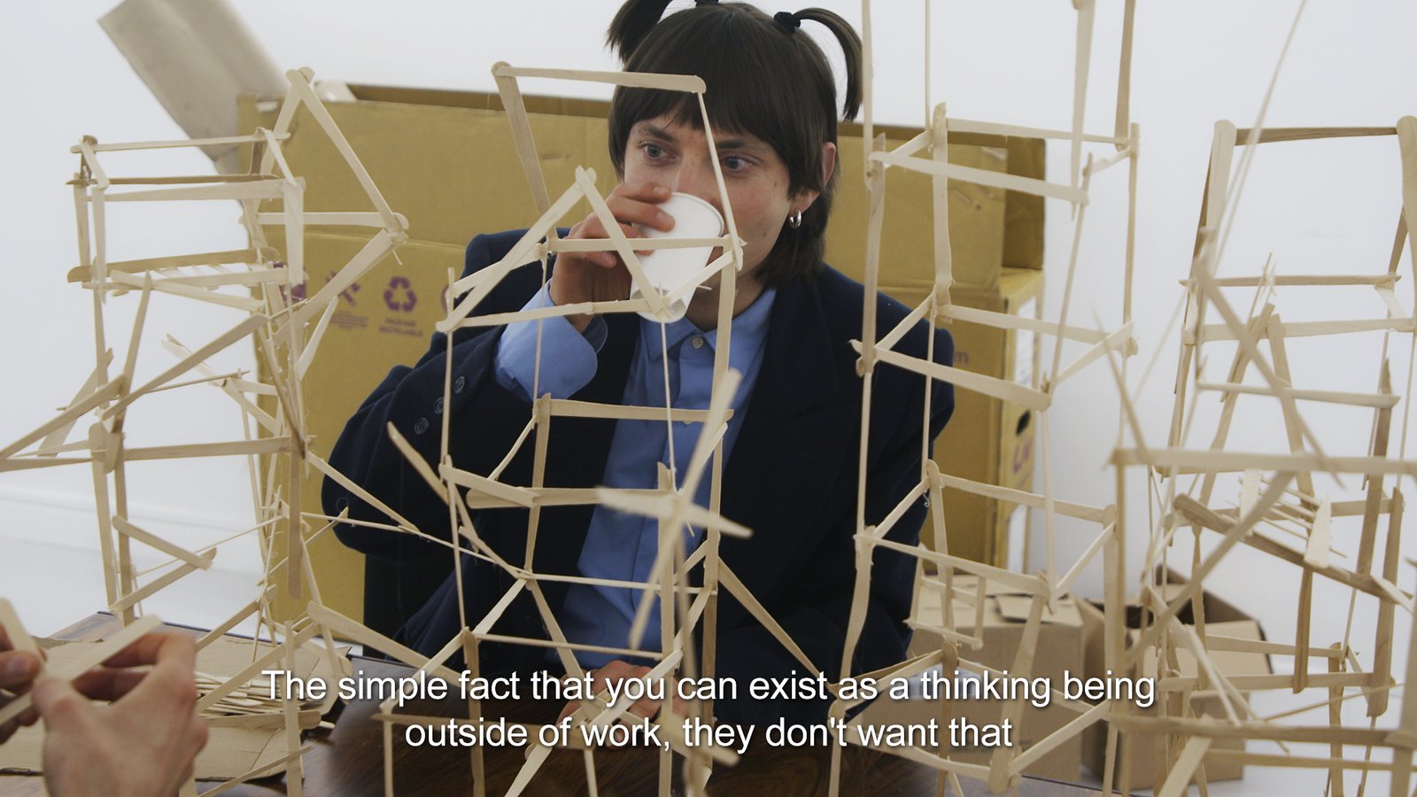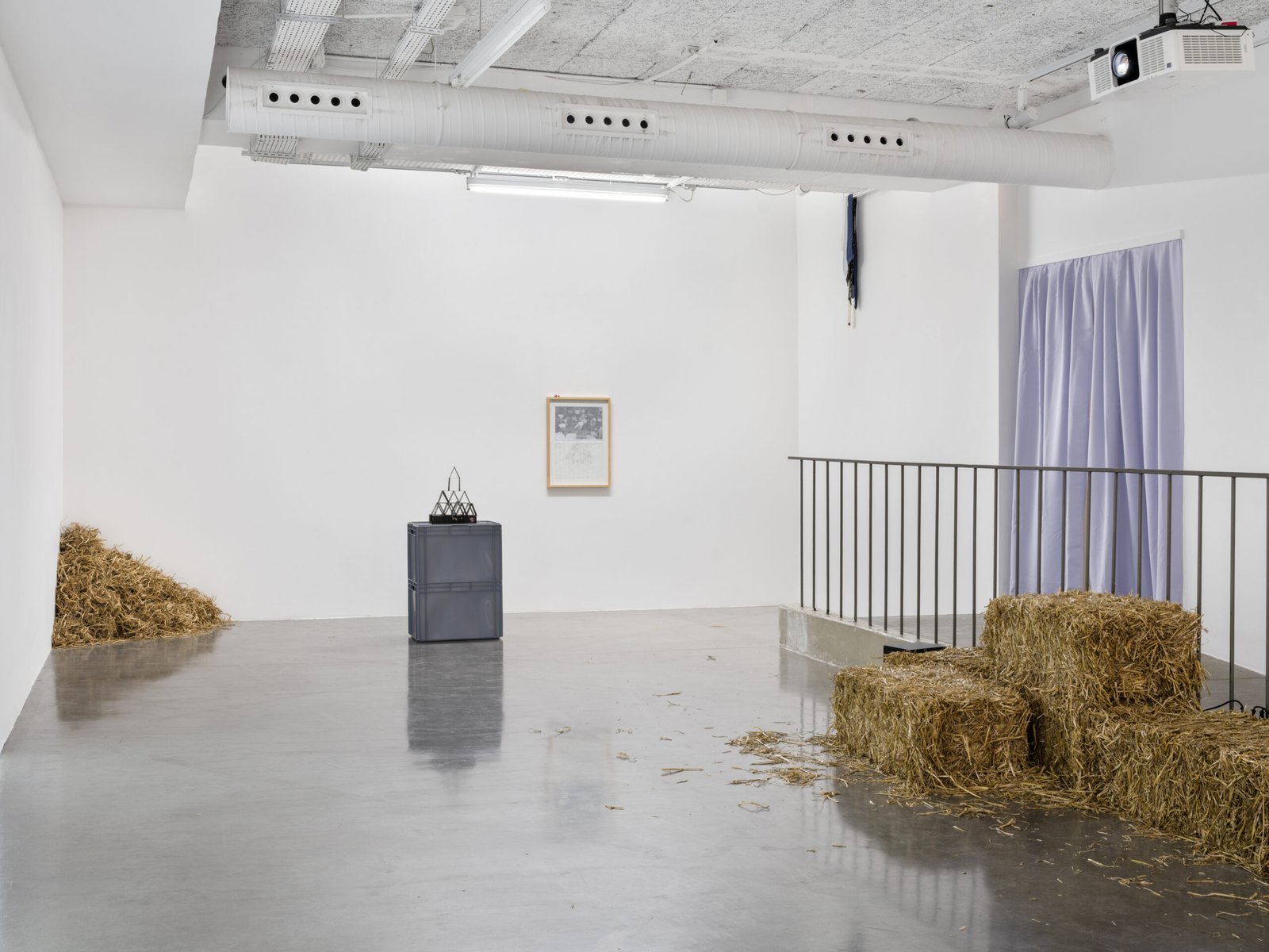 The exhibition Deux vérités, un mensonge turns the viewer into a potential participant who steps into a game mirroring the conditions faced by contemporary workers, expected to perform their engagement and display enthusiasm and adaptability in all circumstances. In this endless loop and from within this behavioural laboratory, the straw scratches and seeps everywhere, nightmares linger, words deform from mouth to mouth, speeches and bodies align themselves. And in the wait for a deserved rest or a forbidden break, personalities thin out, drawn into the fragile skeletal constructions they try to build to the rhythm of the group.
