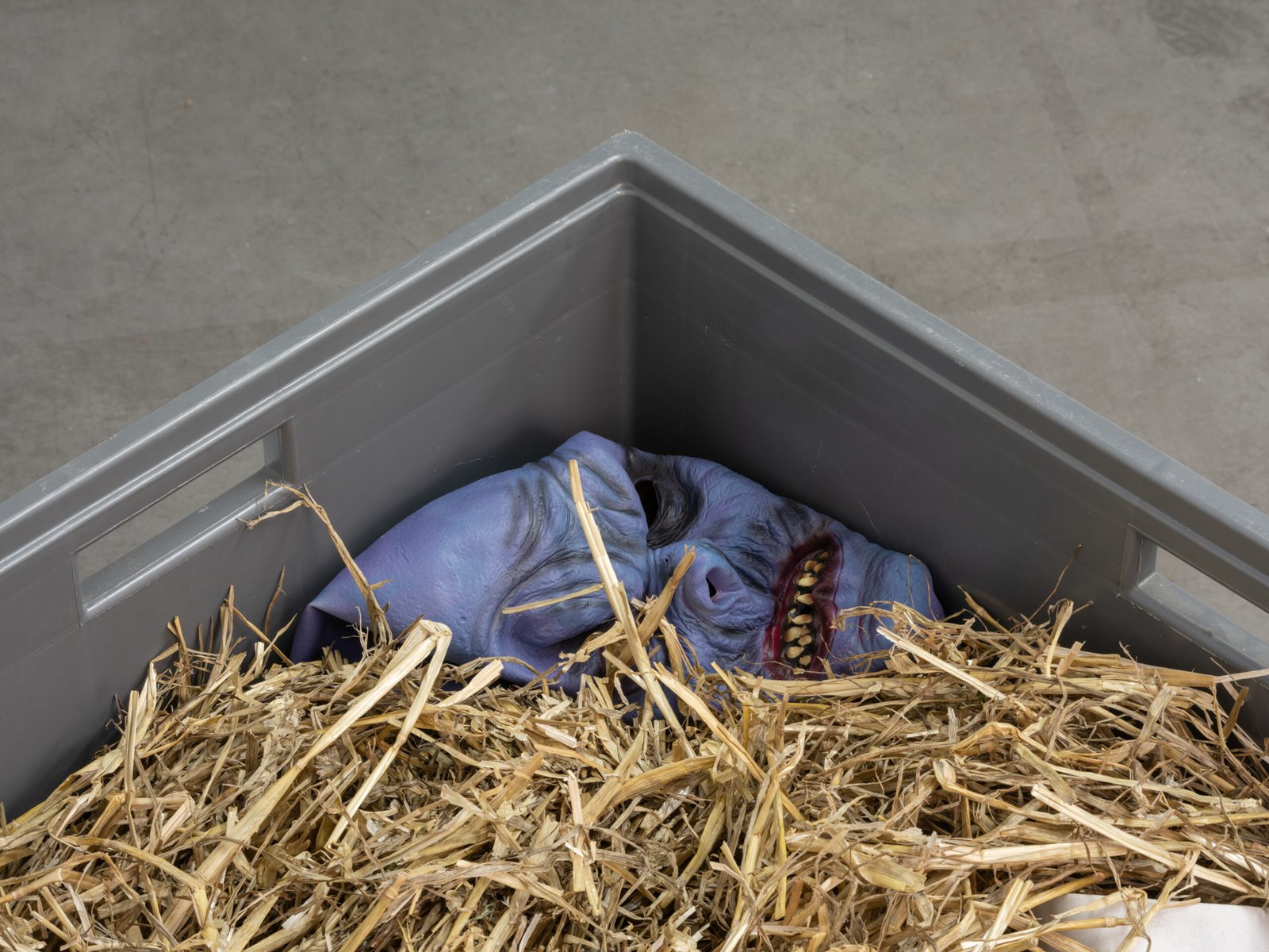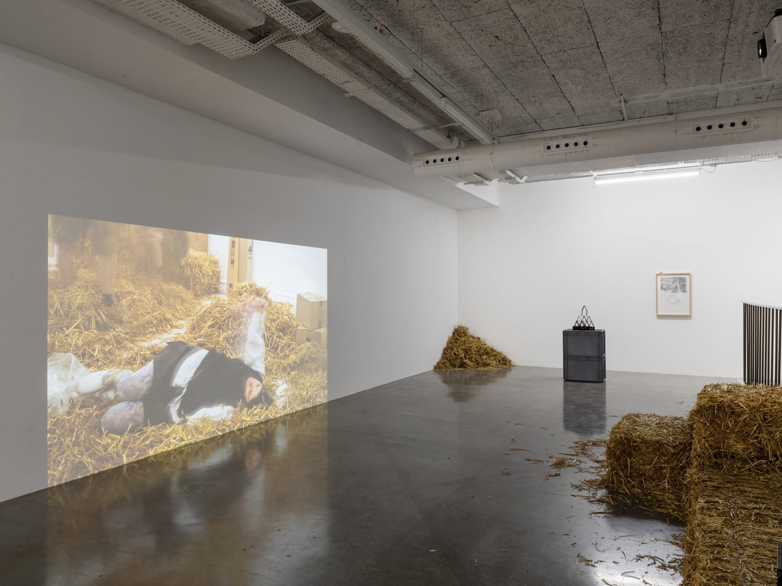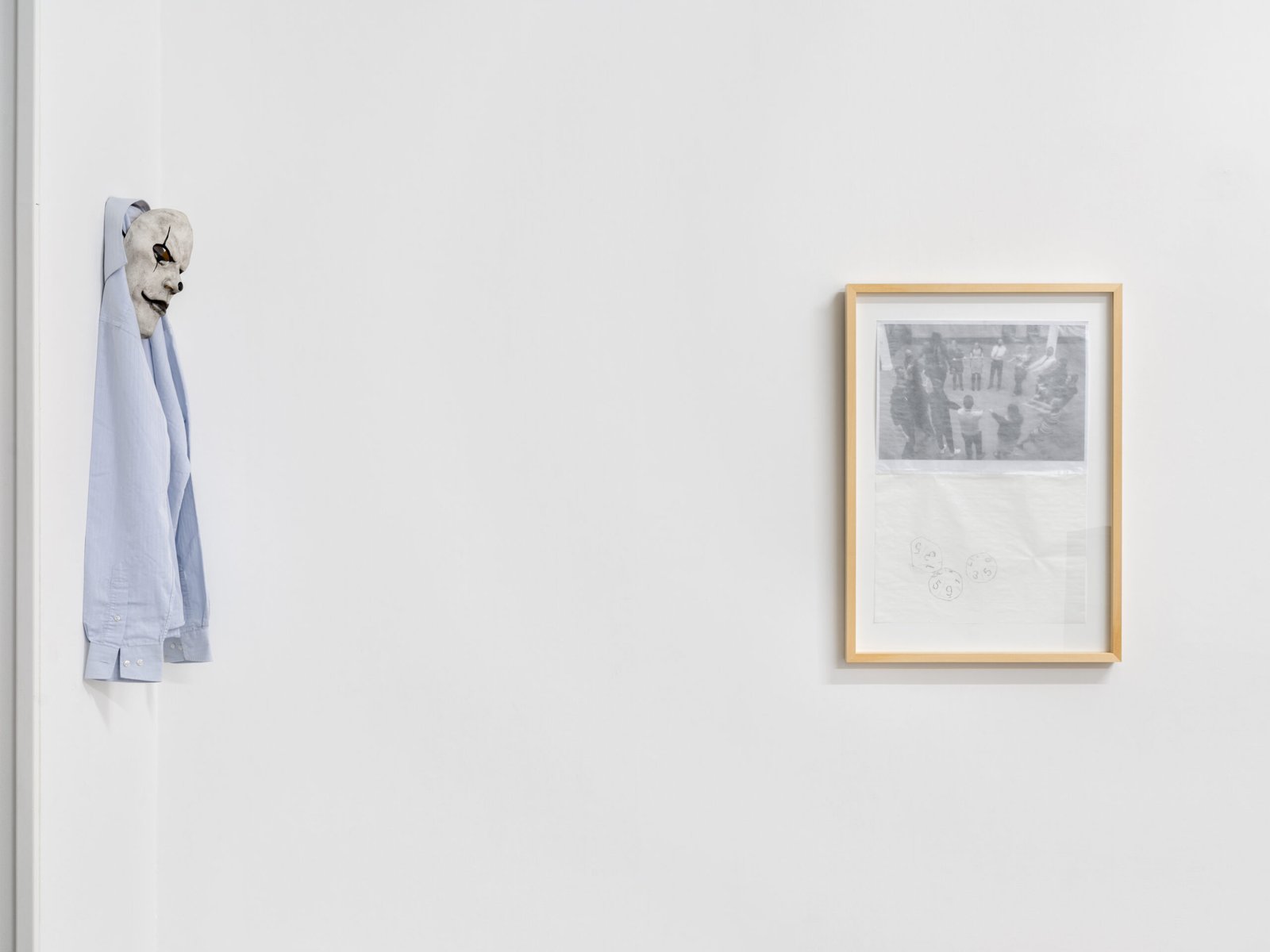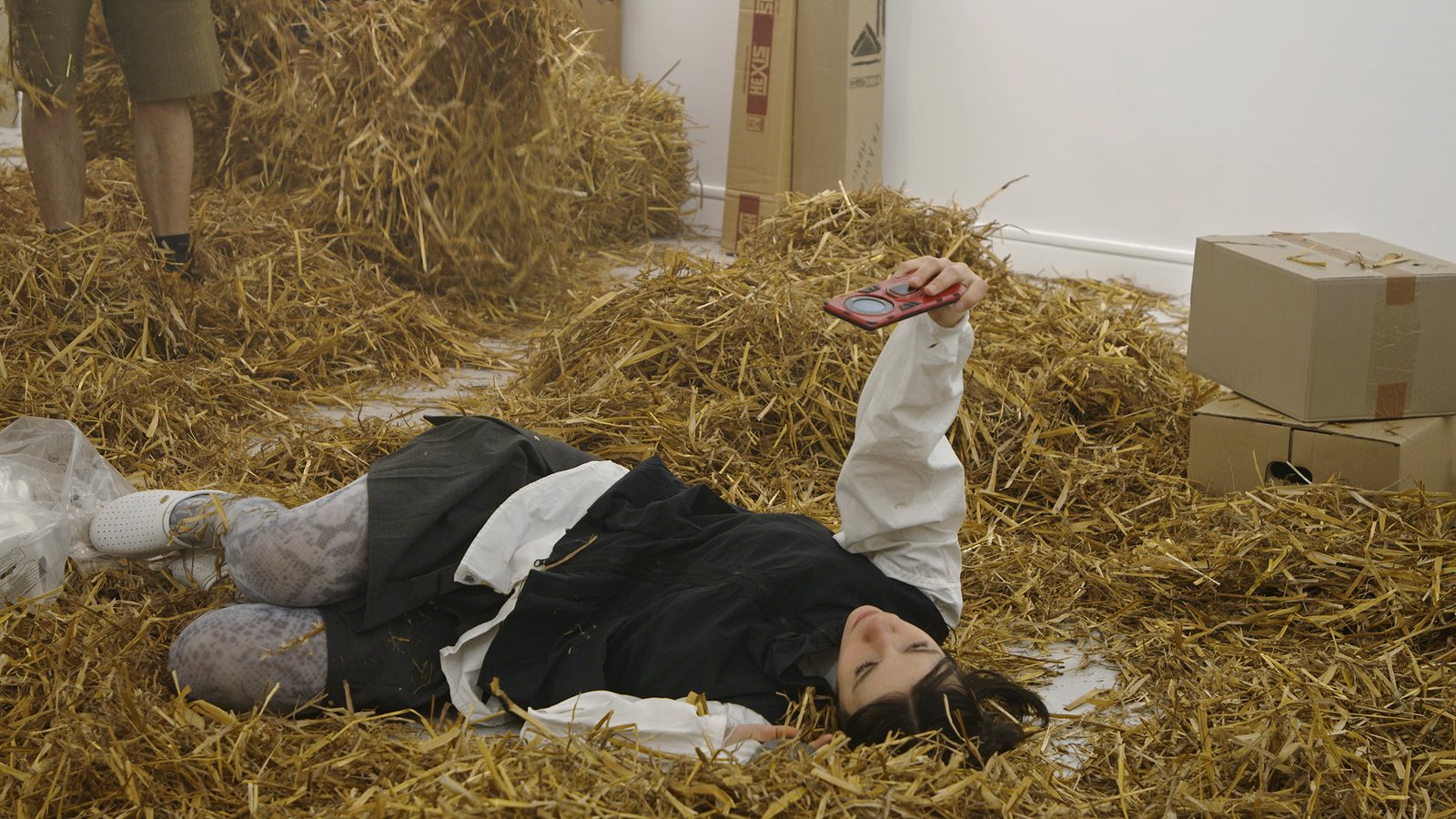 The film forms the core of the exhibition, while part of its research material appears as a set of clues: masks, drawings integrating archival images, a 360-degree video and various set objects and costumes that place us on equal footing with the film’s protagonists, as if we might become them. The straw in which each character seems to search for something small heightens the mismatch with the reality of mostly dematerialized work and the desire to reconnect with nature. The team-building exercises return as improvised, unscripted scenes where sincerity and performance become indistinguishable. Pauses, transitions and peripheral gestures are left intact. These role-playing sequences outline a porous, collective body that slips free of the borders between filmic fiction and the material reality of the space, a porosity heightened by these more or less visible signs.