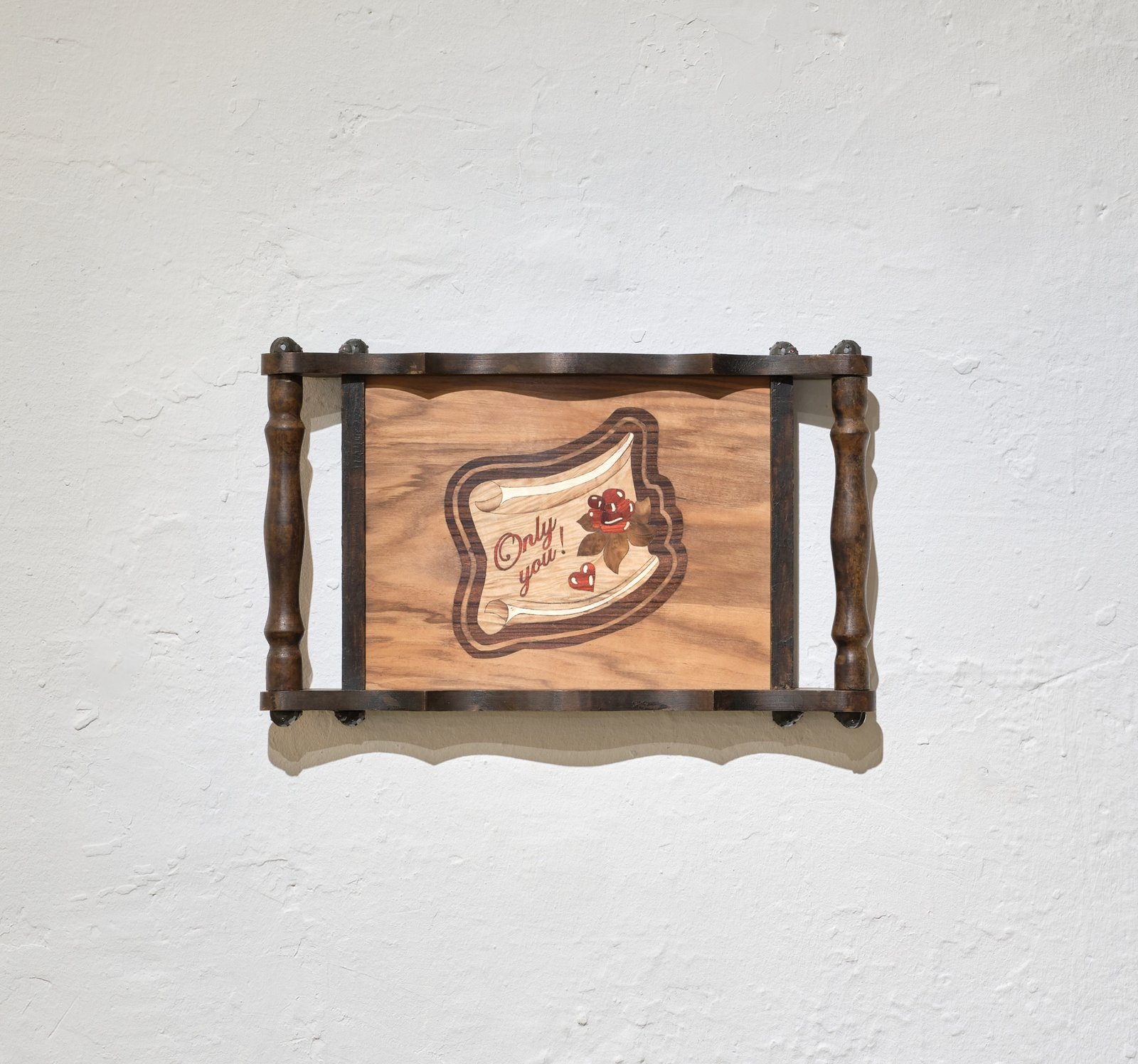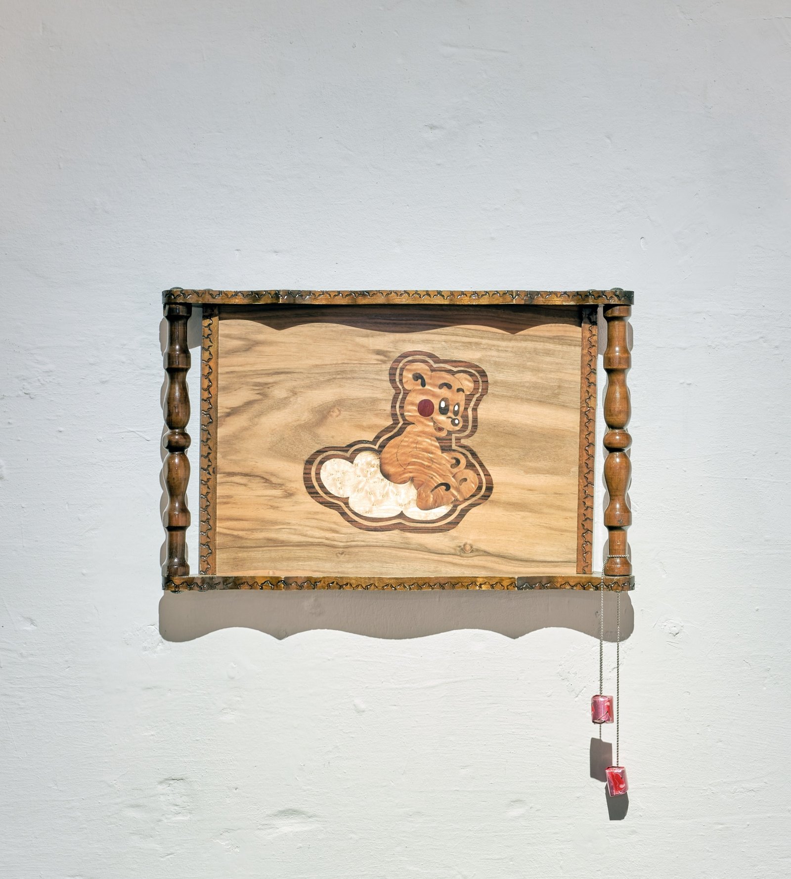 In Noémie Vidonne’s work, too, the layers merge—this time not so much layers of space as layers of time. She blends elements of a childhood in the early 2000s, which occasionally remain as reminiscences in school notebooks, wallpaper, furniture, or in cupboards, with the folkloric inlay technique of her home region. I am thinking of the principle of intergenerational timekeeping—time levels are layered vertically on top of each other instead of horizontally, chronologically, side by side, as is usually the case.
