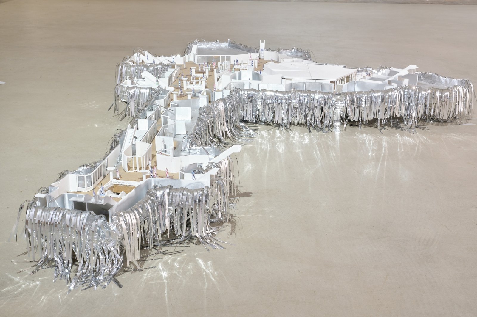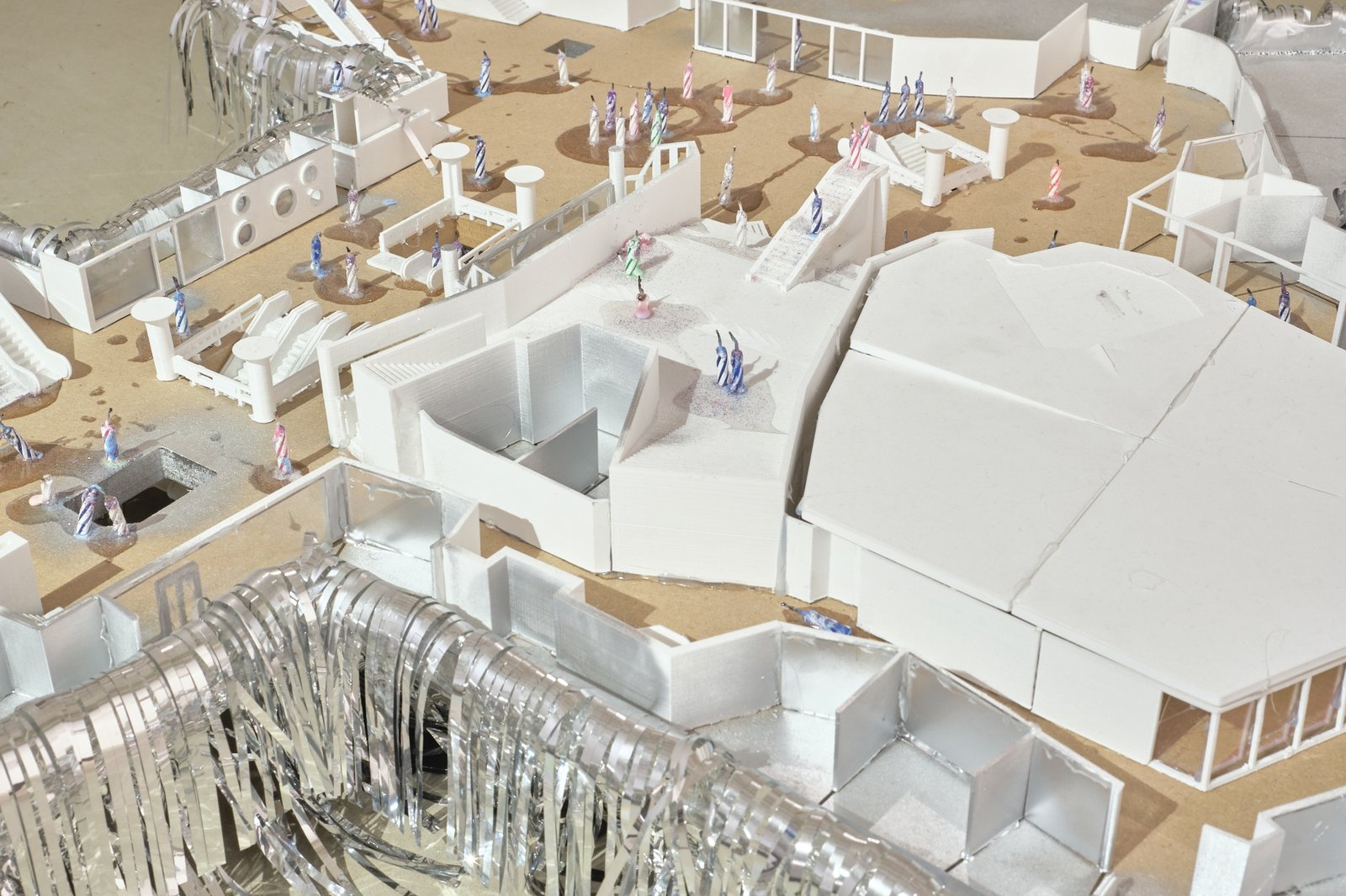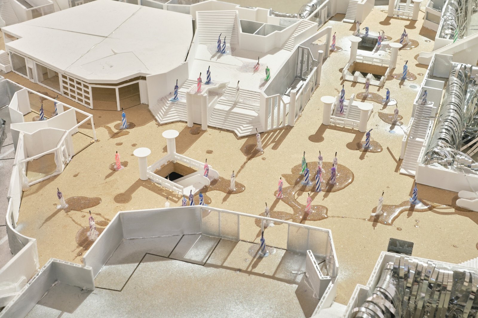 Time and again, it is the everyday places of encounter and objects of everyday life that, in their shifted appearance, suddenly take on something uncanny: in Cyril Tyrone Hübscher’s model of a Frankfurt subway station, the protagonists are represented by candles (as on a cake), which, once lit, have a certain finiteness inherent in them. The bird’s-eye view that one is forced to adopt when “looking down” on the model is reminiscent of how one sometimes perceives oneself in dreams, from above. At the same time, however, it is also reminiscent of those hobby models of train stations that can be found in larger stations—and whose trains can be set in motion by inserting coins. An anachronistic toy.