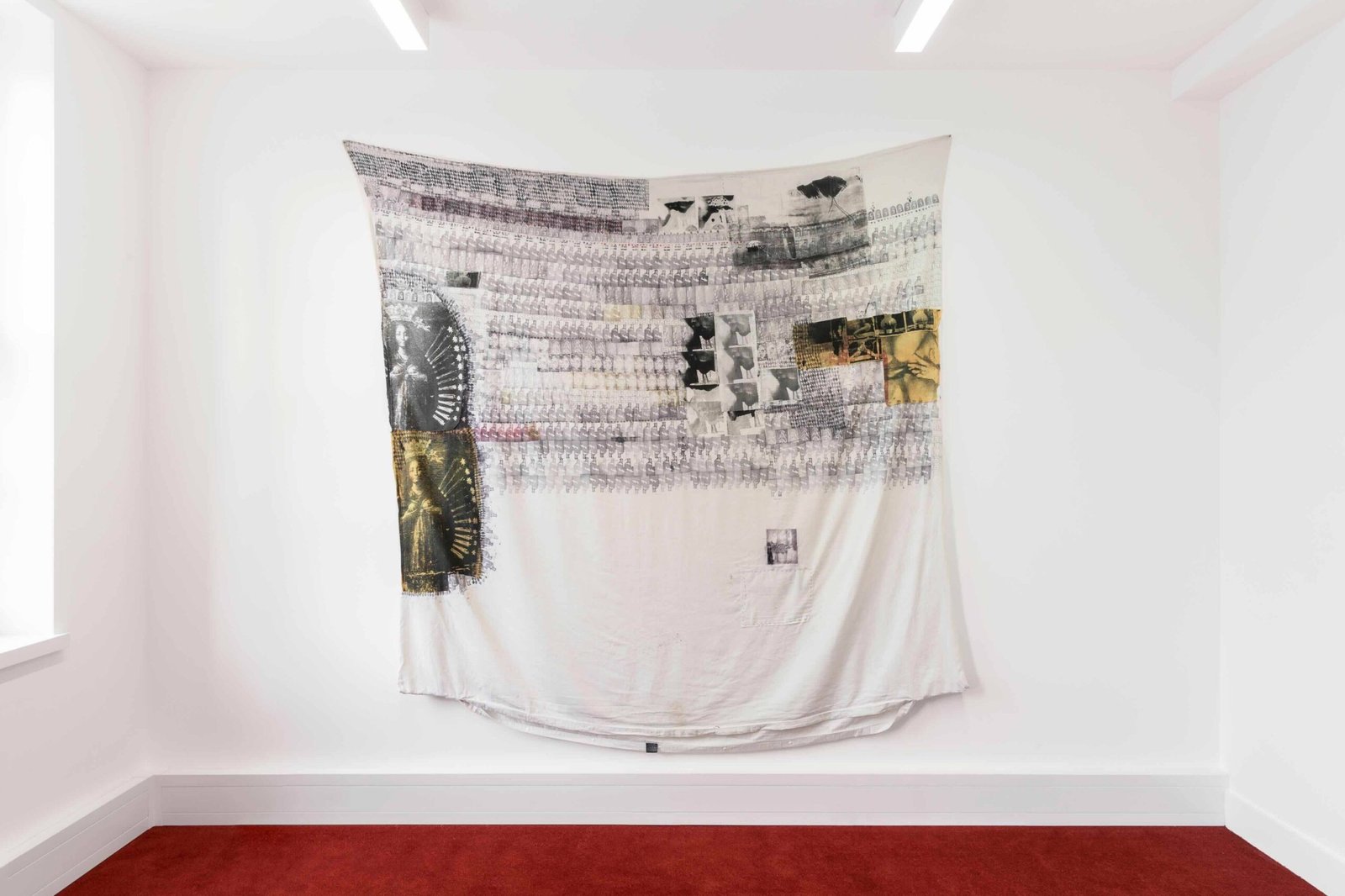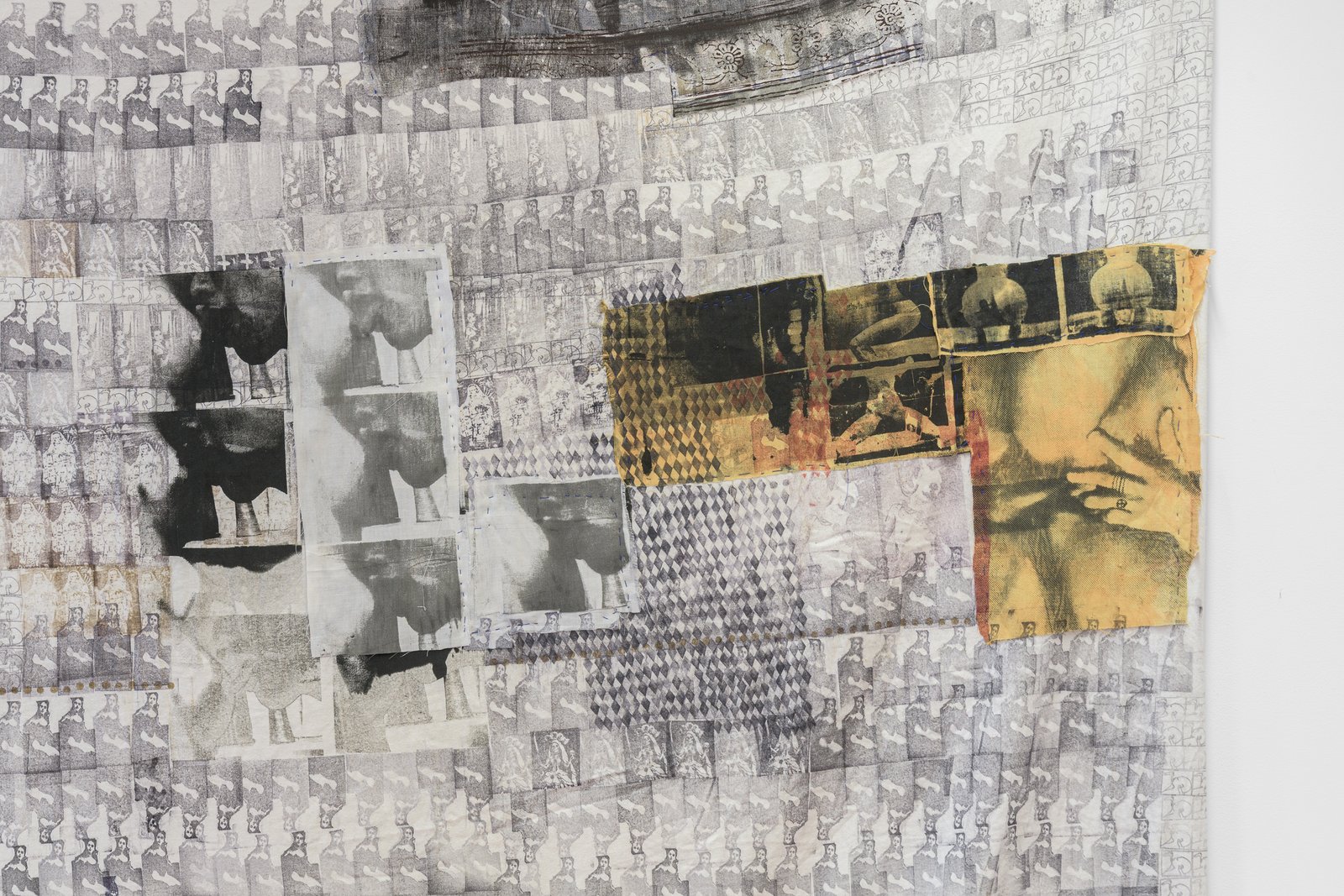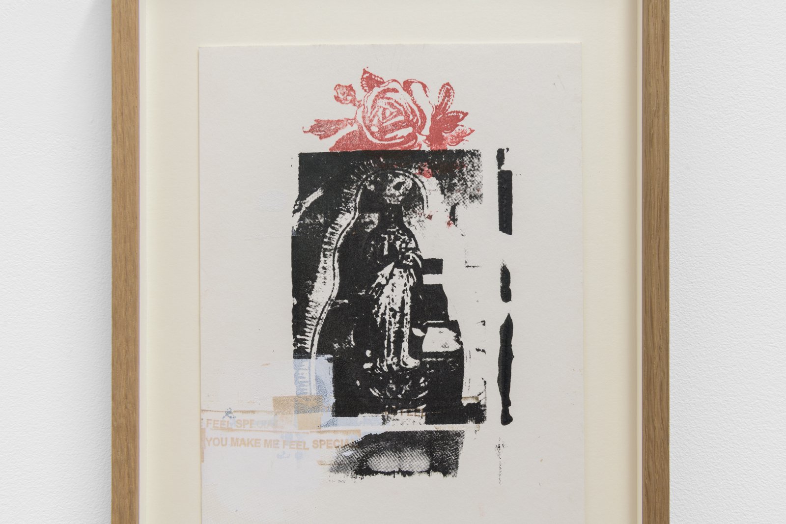 In 5–7 Excelsior Works (2025), a series of block prints and screen prints echoes imagery sourced from the artist featured in pornography, as well as imagery of La Madonna Lactans and La Santa Muerte, printed on a duvet. In these prints, Diamond reinterprets La Madonna’s sacred gesture through a lens of self-representation, pleasure, and labour. The economy of divinity becomes personal and bodily; the artist herself appears in a pornographic scene next to the Madonna, in which a client is sucking her nipples. We see a gesture that echoes St. Bernard’s miraculous renewal, charged with erotic intensity of oral pleasure. True to form, Diamond is blending boundaries between the sacred and the profane.