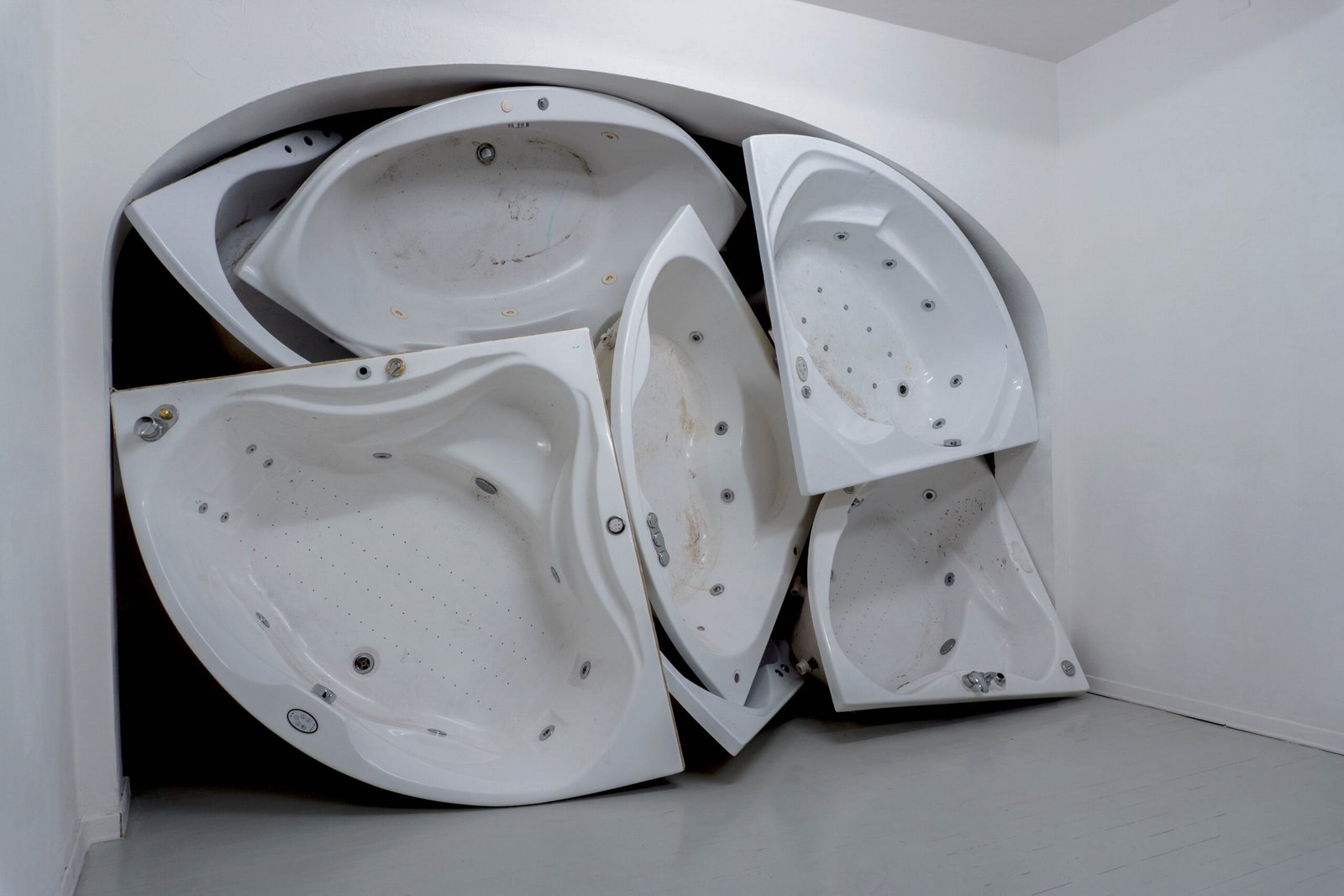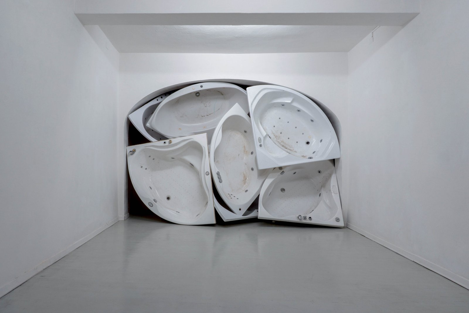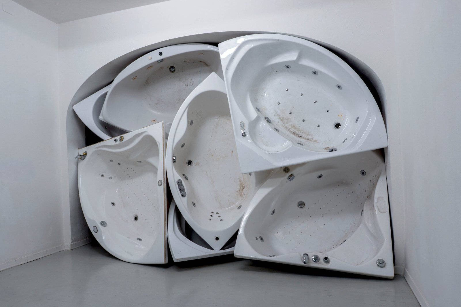 Pleasure, quietness, wellness, rest, surrender, immersion: everything slips away as the tubs are drained. And yet the traces, impressions of bodies and memories of skin remain. Past lives condense in the accumulation of these discarded shells — once called “Dream”, “Tahiti”, “Serenity”, “Eden”, the onomastics of a prefab luxury now returning as a muted echo. Objects once intimate are now exposed and overstated, reduced to pure mass and volumes, overturning and erasing any reference to well-being.