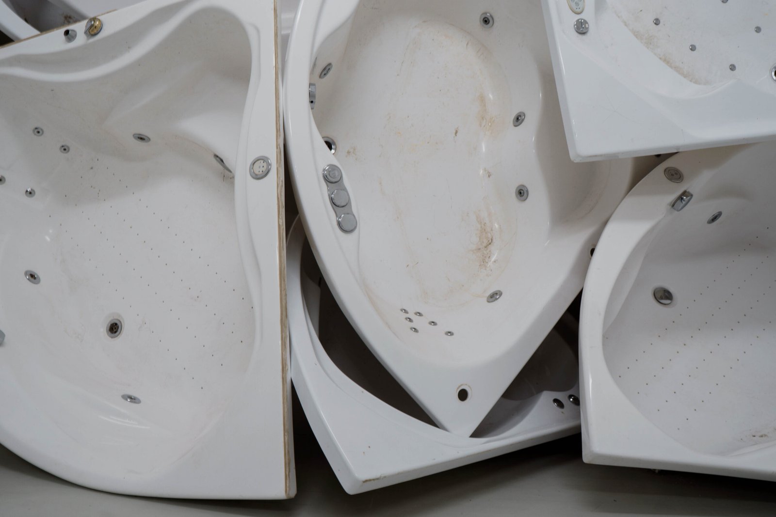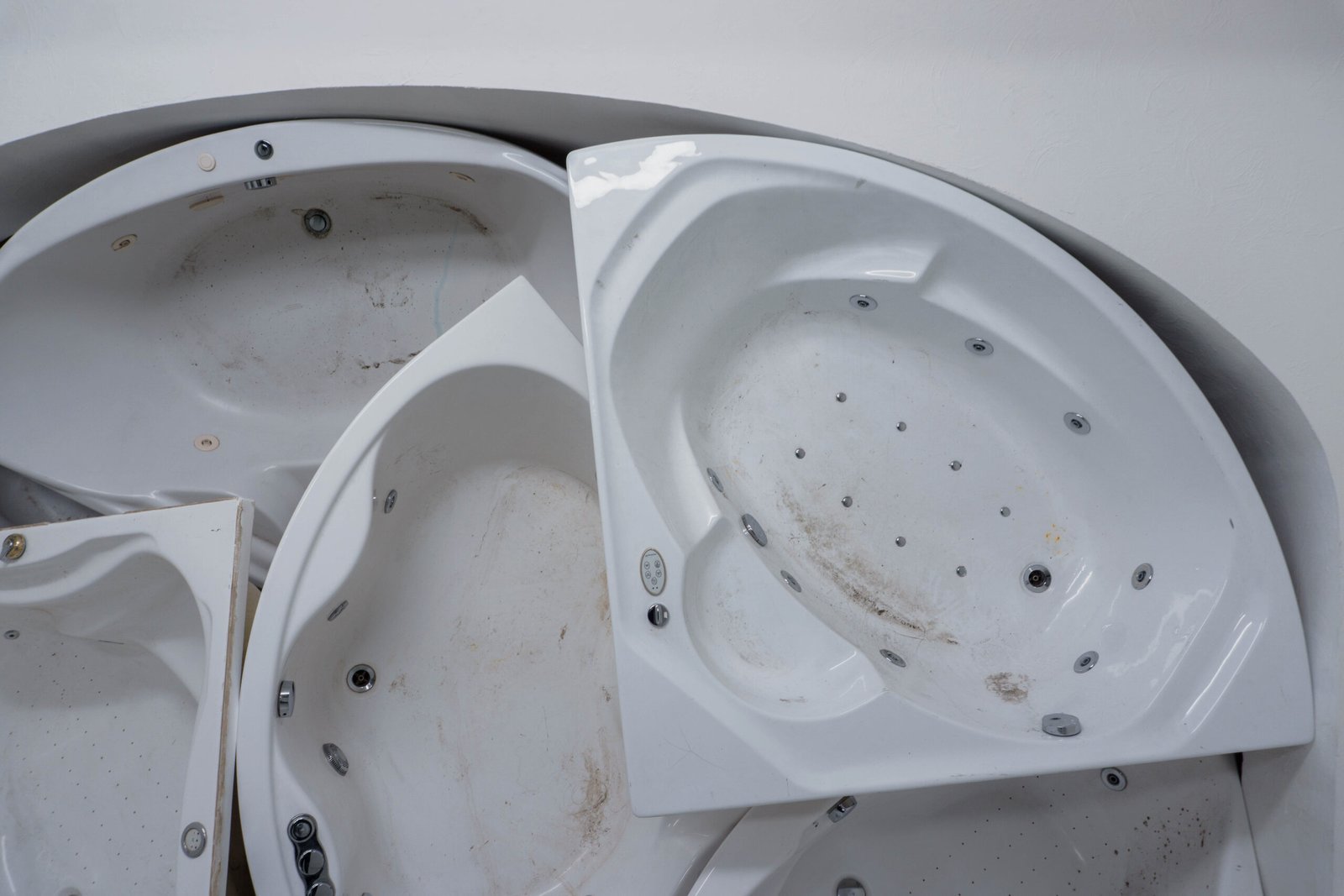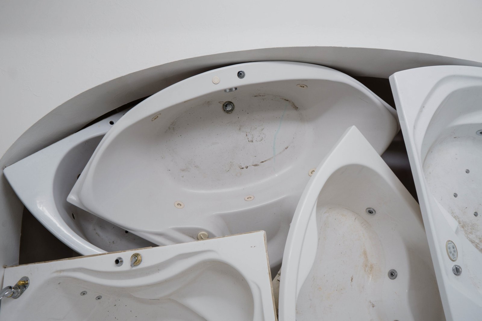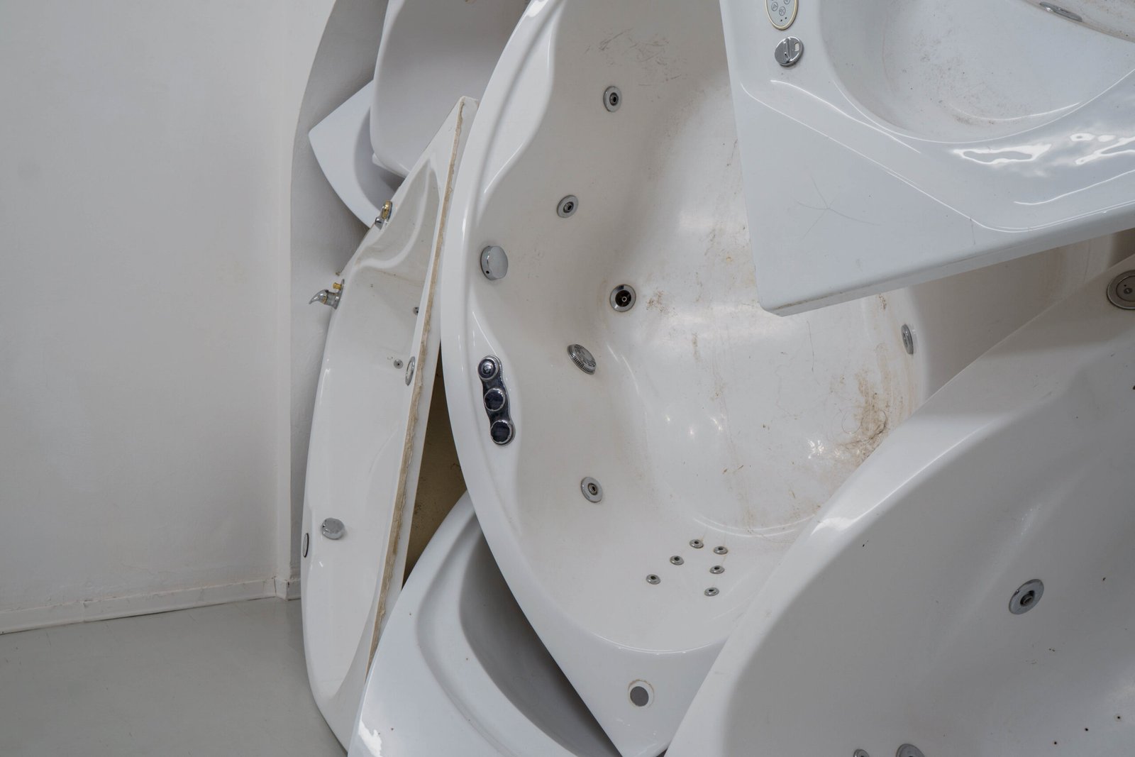 Pleasure, quietness, wellness, rest, surrender, immersion: everything slips away as the tubs are drained. And yet the traces, impressions of bodies and memories of skin remain. Past lives condense in the accumulation of these discarded shells — once called “Dream”, “Tahiti”, “Serenity”, “Eden”, the onomastics of a prefab luxury now returning as a muted echo. Objects once intimate are now exposed and overstated, reduced to pure mass and volumes, overturning and erasing any reference to well-being.