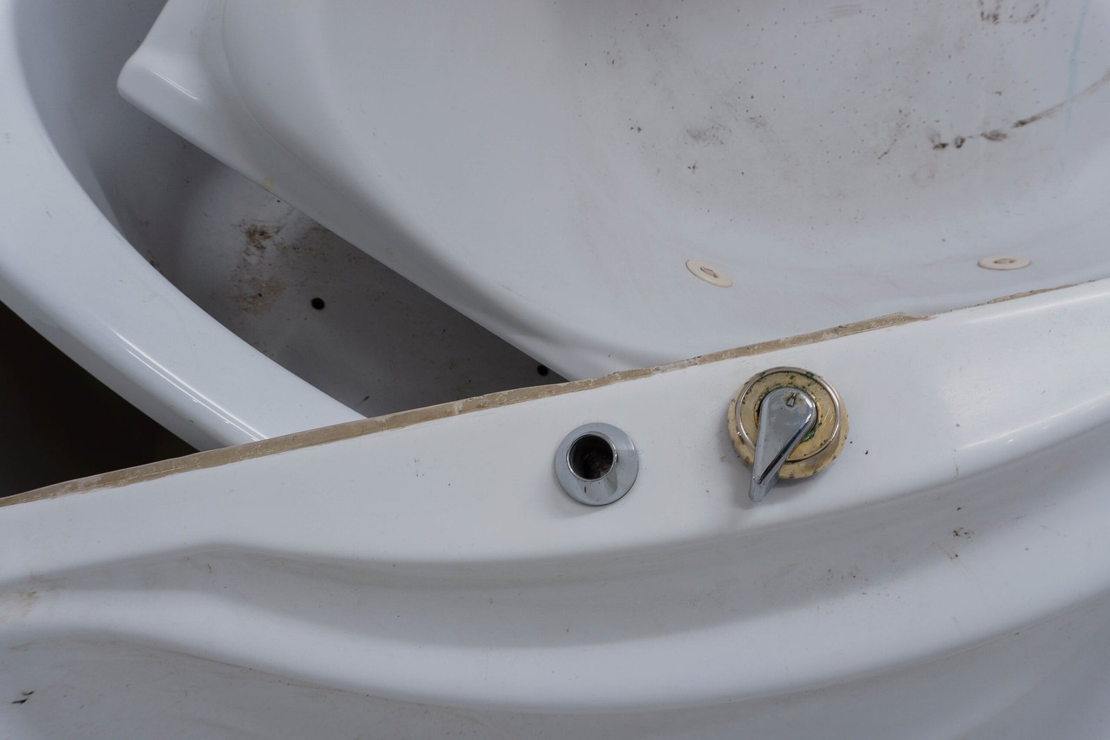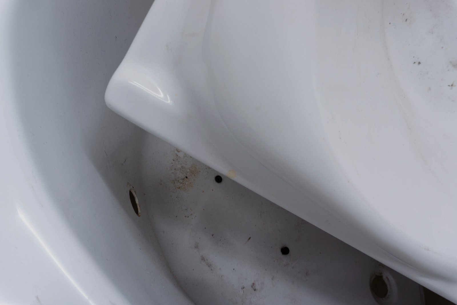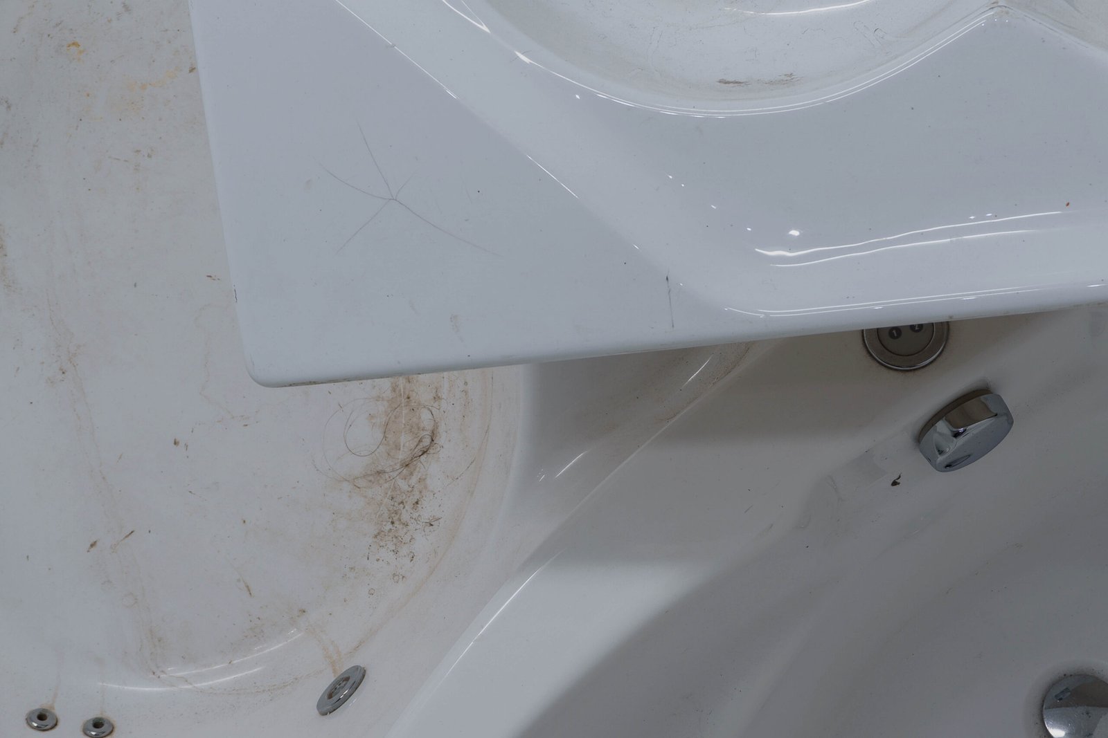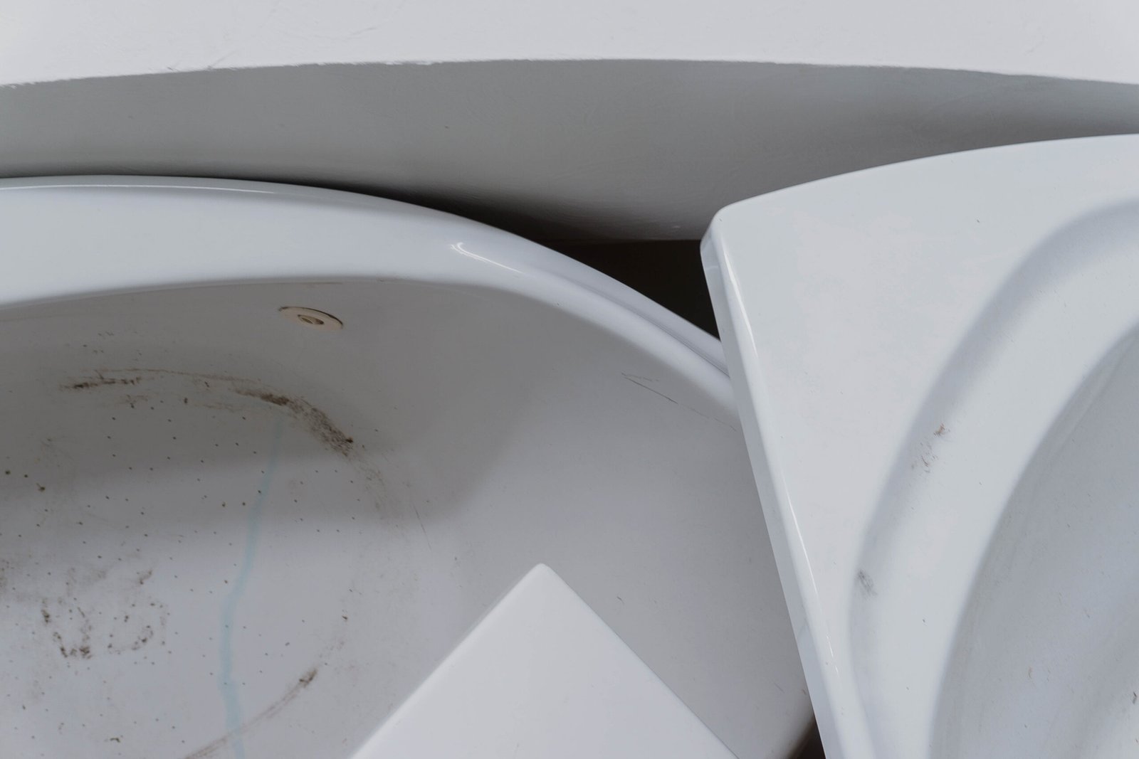 Charlotte Thrane combines multiple tubs into a single body, elevating them to simulacra of technological well-being and soundness — landmarks for innovative design industries, promises of comfort, machines of pleasure. By reducing the tubs to essential geometries, she generates an abstraction of both sculptural and painterly elements: voids and reliefs, soft lines and bulging edges, their glossy candor lost beneath the dust and grime of suspended time, the residue of their prolonged disuse, and thin strands of hair belonging to members of the artist’s family — further remnants of latent narratives and memories. Her aesthetic-based approach to this composition of lines and forms recalls the stucco lustro technique, which constructs depth through surface, layering light, pigment, and gesture. Thrane appropriates that lineage of surface-making to divert it: she suggests a personal theory of ornament grounded in the industrial object, turning the fiberglass tub into a luminous surrogate for stucco and marble, redefining the relation between surface and volume, decoration and interiors.