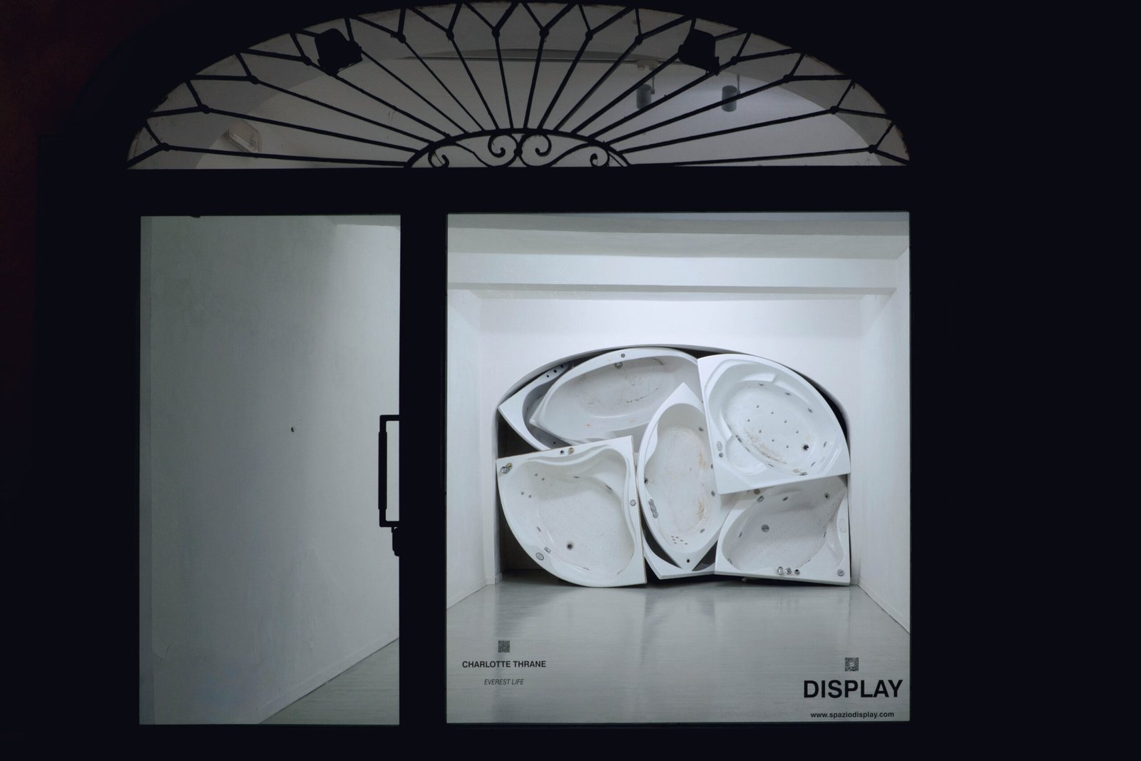 This monumental work has been made to fit the architectural features of the exhibition space. The hot tubs function as ambiguous markers of an uncanny domestic landscape, marked by curves and circular paths: the arched glass façade and, inside, the built-in arch whose form the work subtly mirrors, with its smooth profiles and the circular arrangement of each element. These forms respond to one another, generating a continuous loop that guides the gaze from outside to inside and further inward, contracting into the vortex of the drain. Through this centrifugal and centripetal interplay, the work activates the architecture with a measured kinetic tension, drawing its lines into a single, circulating field of form. We may be witnessing a “synthetic Baroque,” as the work generates a tension between spectacle and everyday life, luxury and decay, intimacy and hyper-exposure, imagination and innovation: a brief post-industrial history of our needs.