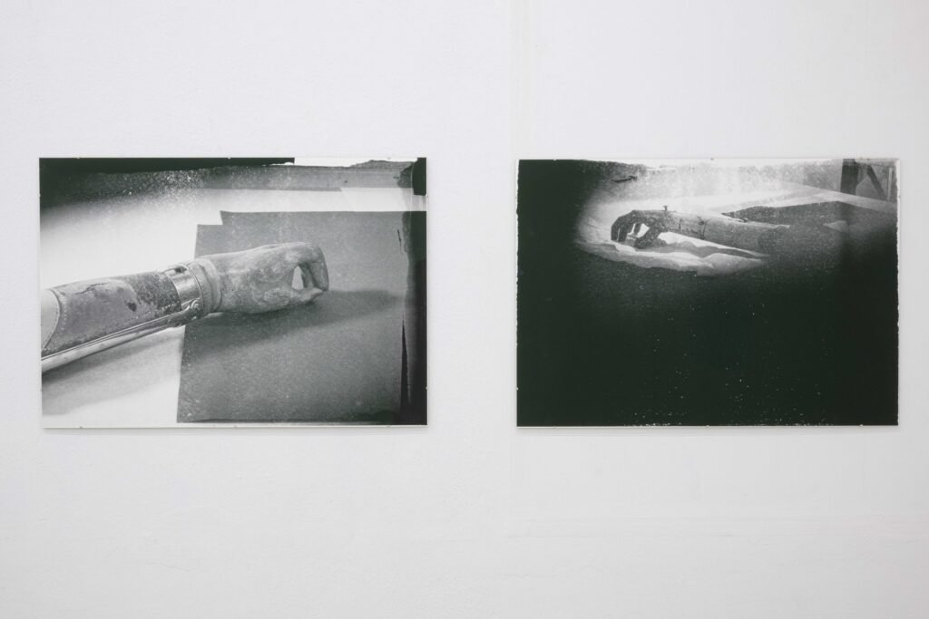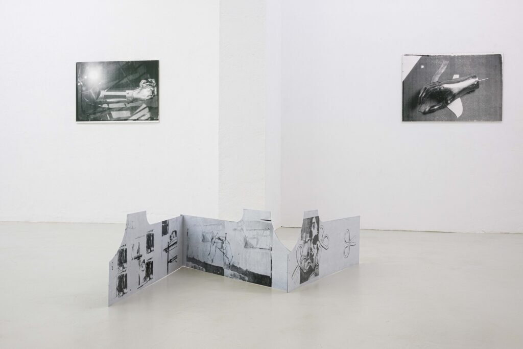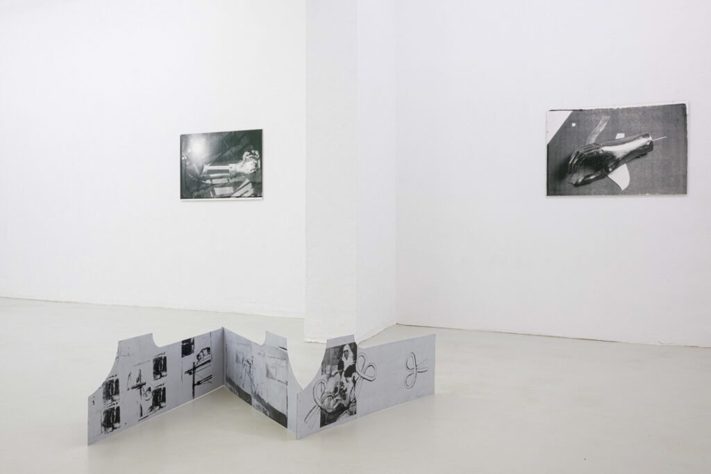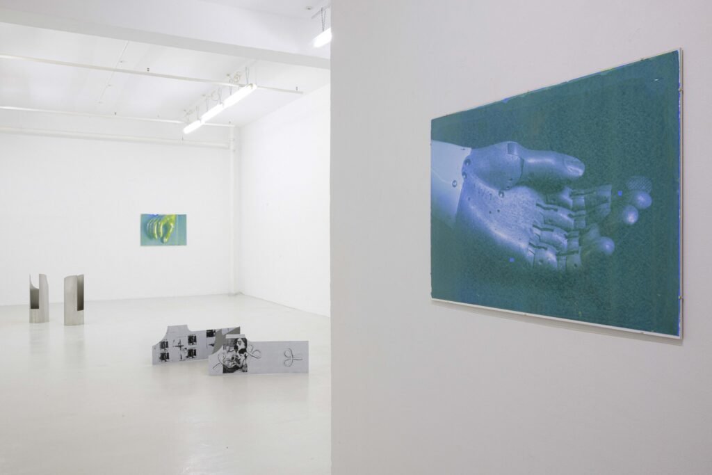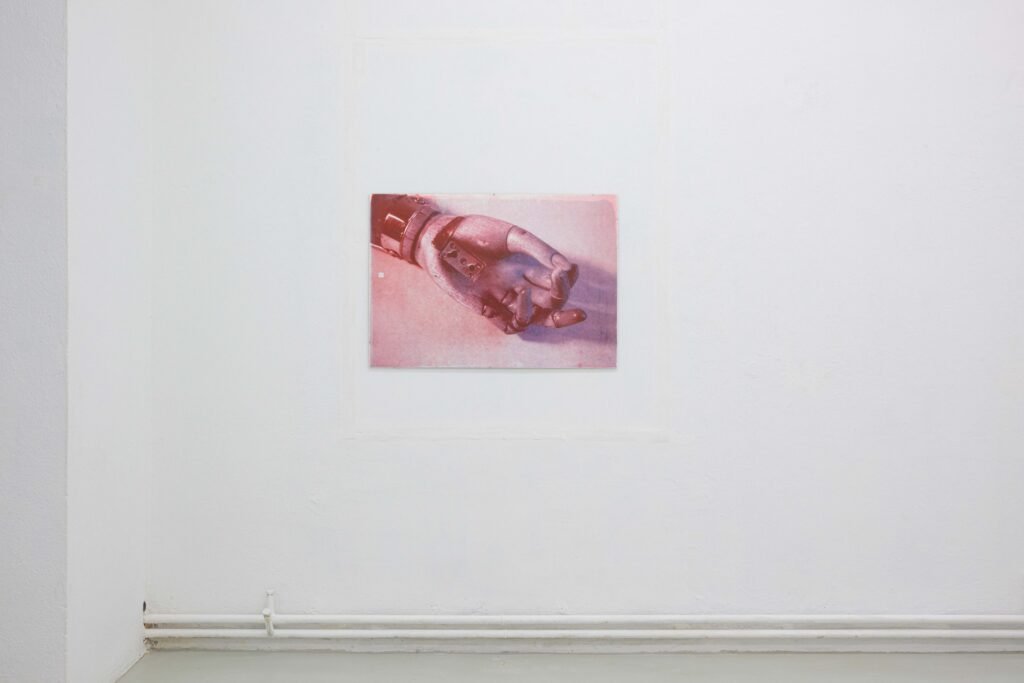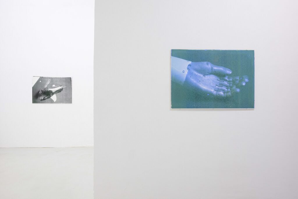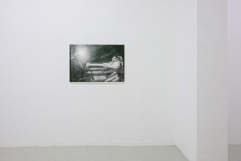 In the Freiburg exhibition, her first to address this topic, Hanna Stiegeler turns her attention to prostheses and technical bodily extensions. Under the title Ext. I, short for extension, she presents eight large­format prints alongside three aluminium objects. The works take prostheses as their point of departure: tangible, functional aids to the body. Through her artistic practice, Stiegeler expands these objects beyond their practical purpose, translating them into a metaphorical and structural register. In doing so, she reads prostheses as systems of support through which broader questions of dependency, stability, and care can be explored.