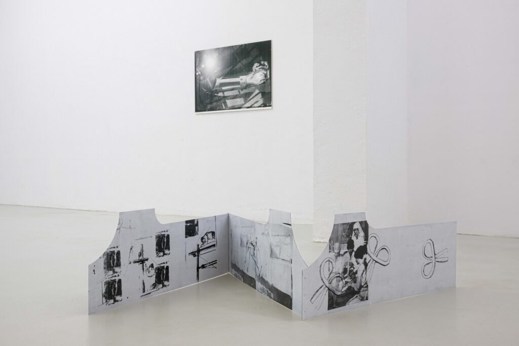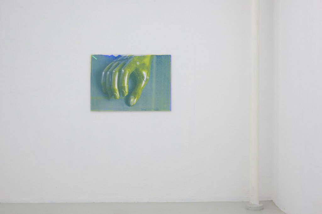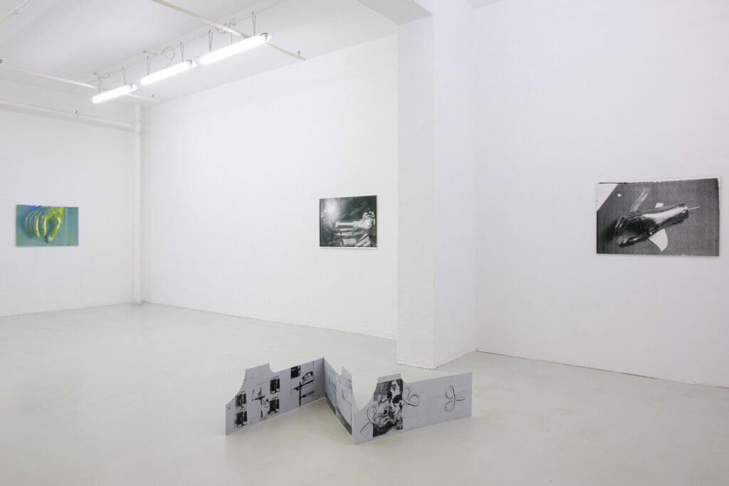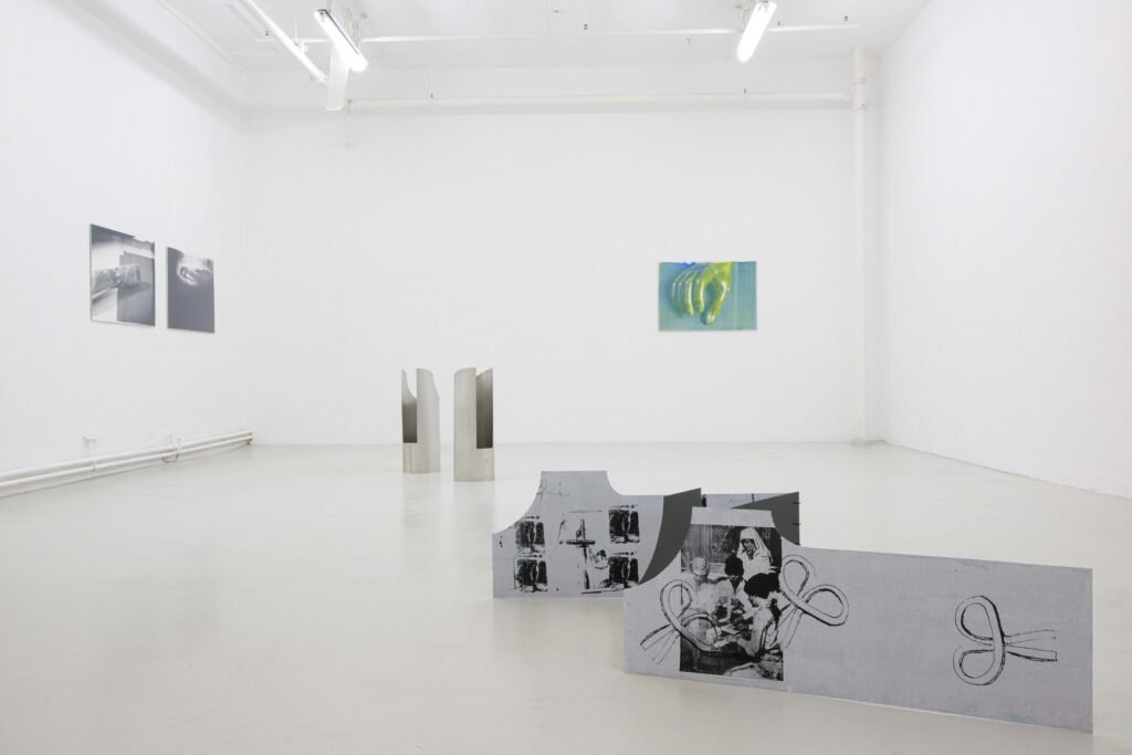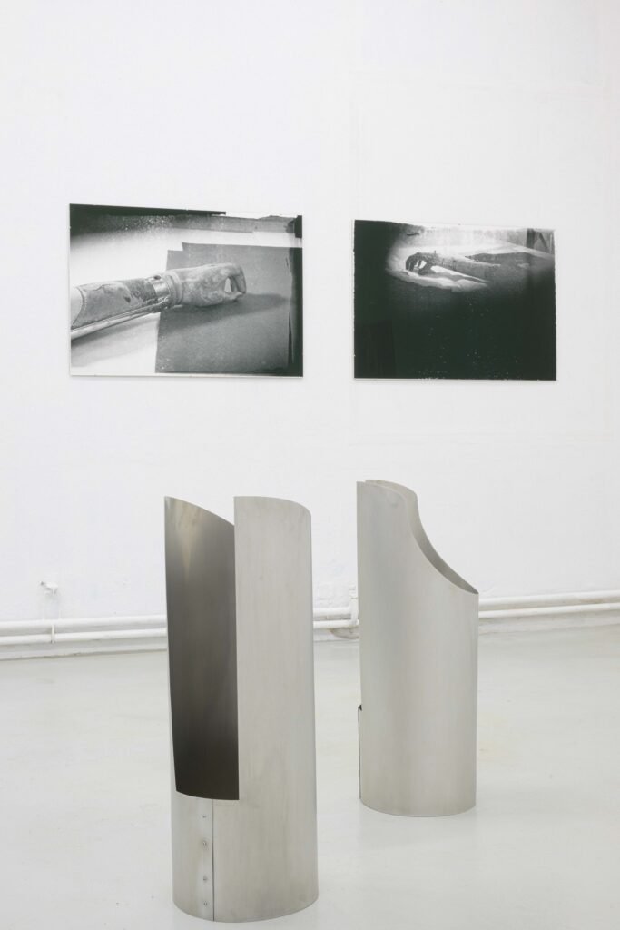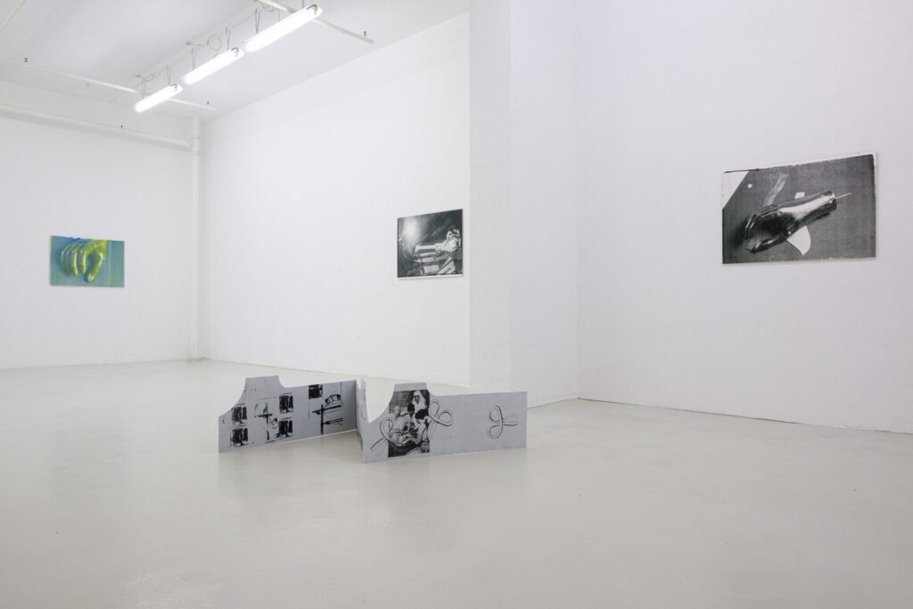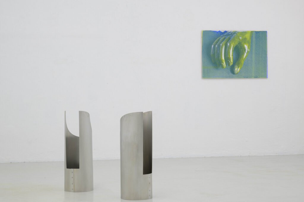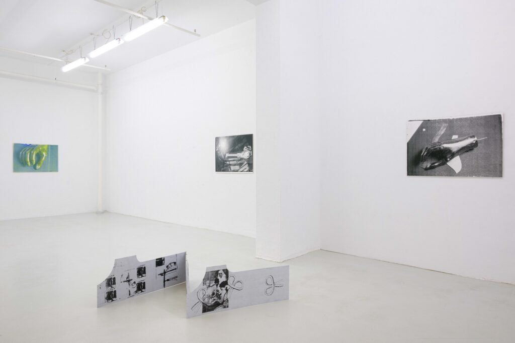 In the Freiburg exhibition, her first to address this topic, Hanna Stiegeler turns her attention to prostheses and technical bodily extensions. Under the title Ext. I, short for extension, she presents eight large­format prints alongside three aluminium objects. The works take prostheses as their point of departure: tangible, functional aids to the body. Through her artistic practice, Stiegeler expands these objects beyond their practical purpose, translating them into a metaphorical and structural register. In doing so, she reads prostheses as systems of support through which broader questions of dependency, stability, and care can be explored.