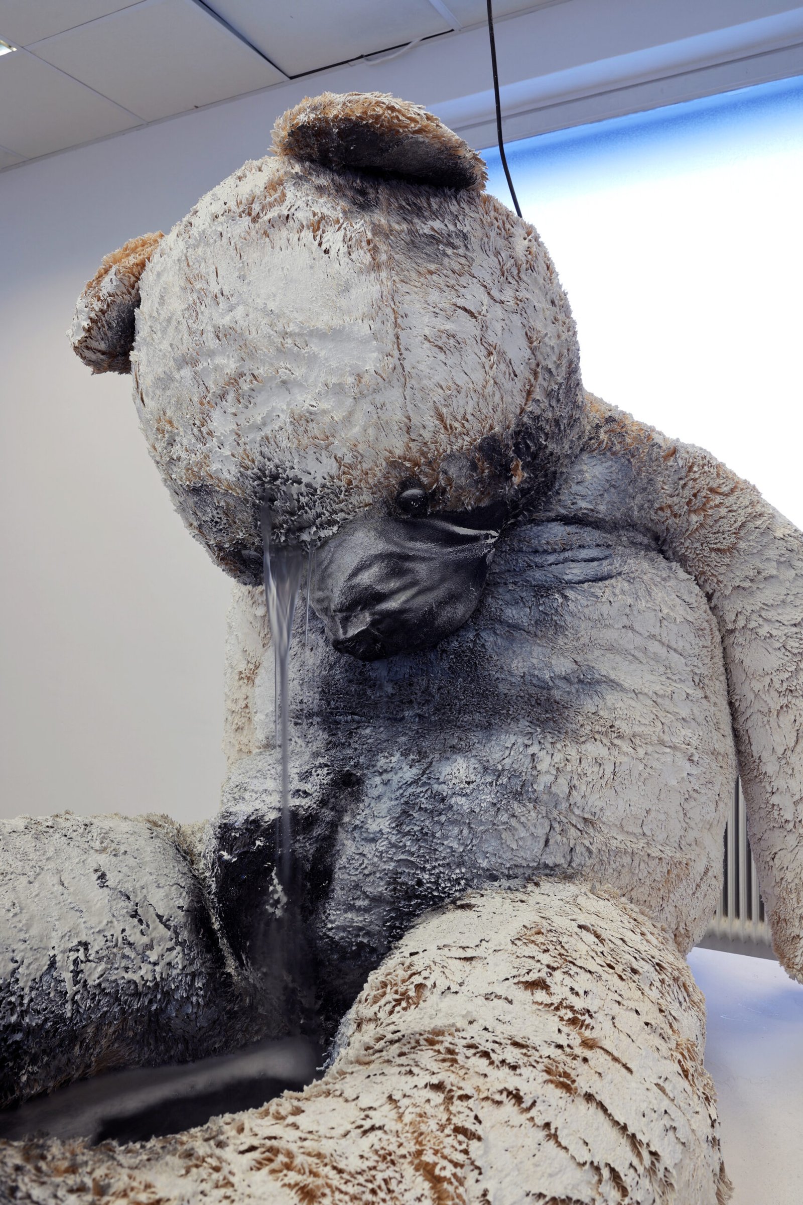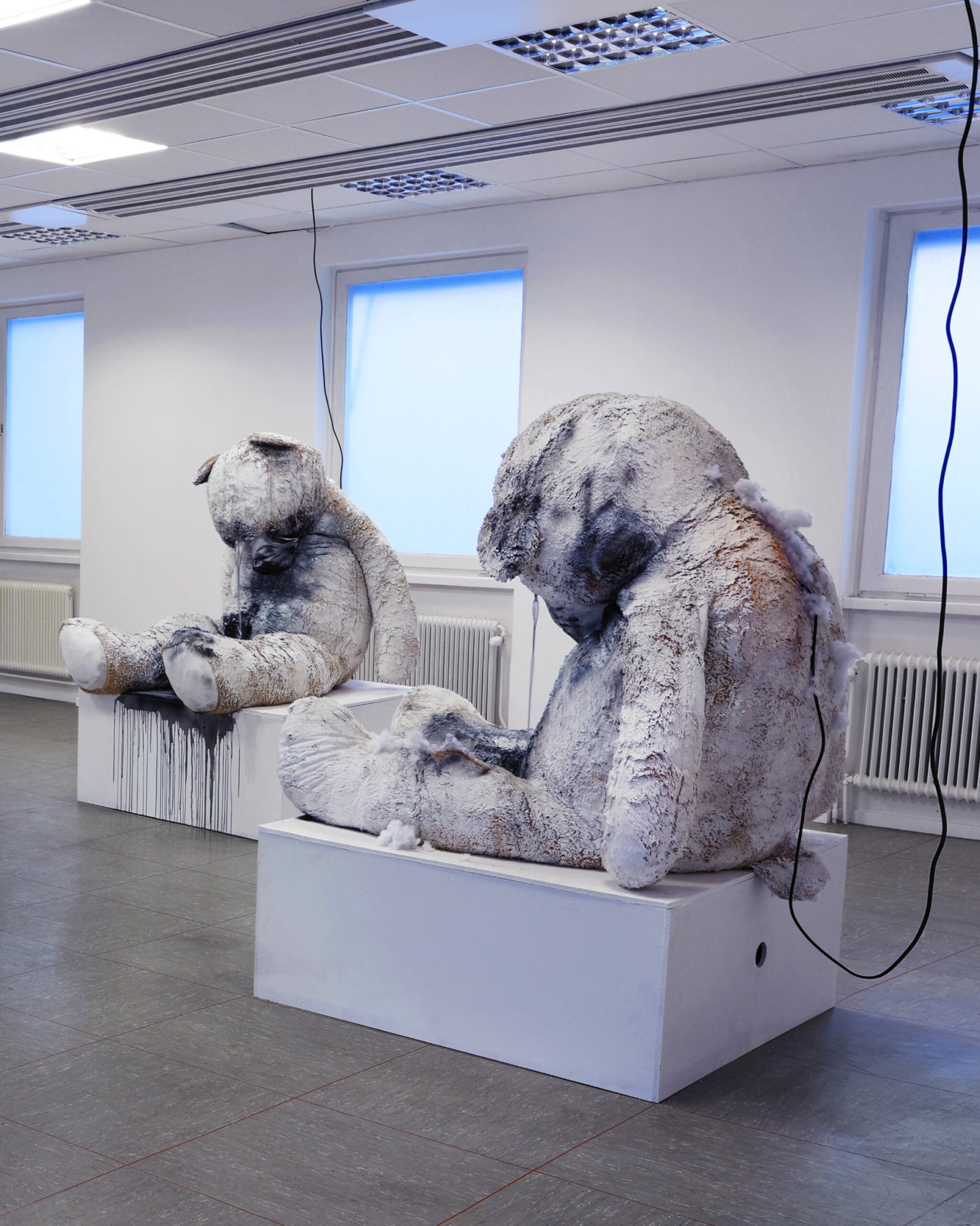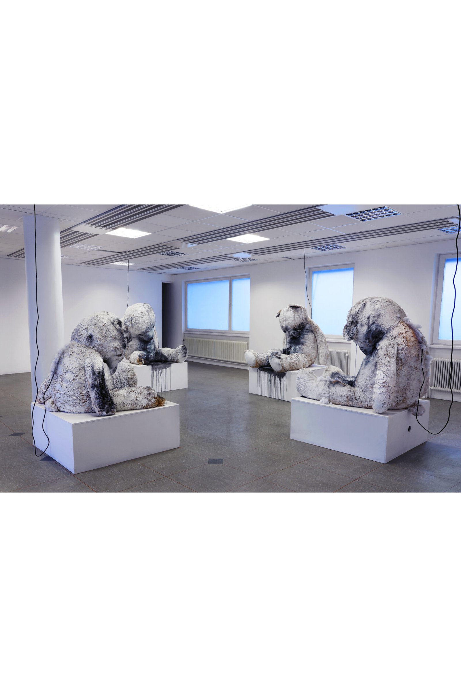 Four teddy bears sit on pedestals. Made of polyester and cotton, they once belonged to a world of comfort, protection, childhood and intimacy. Now they appear torn, contaminated, and heavy with a dark liquid that slowly leaks from their bodies. Silent and slumped inward, they seem caught in a state of mourning, turned not toward the viewer, but toward themselves.
