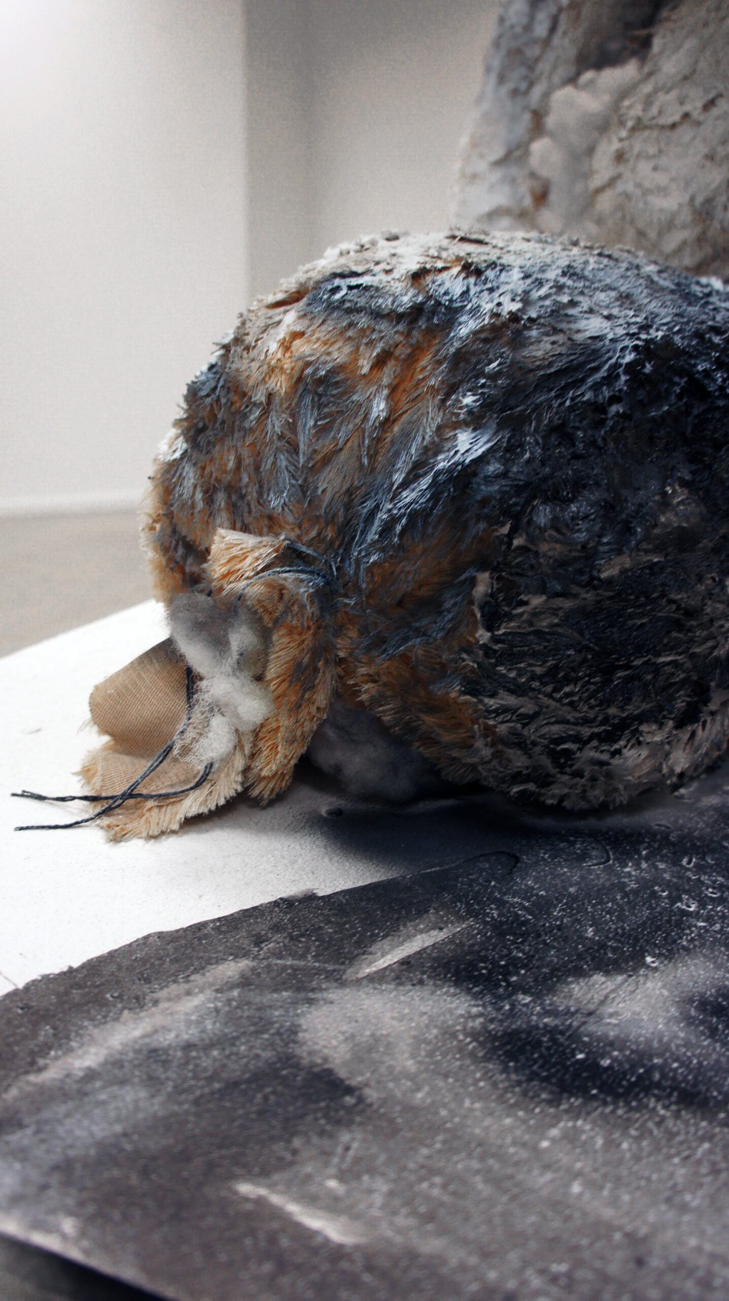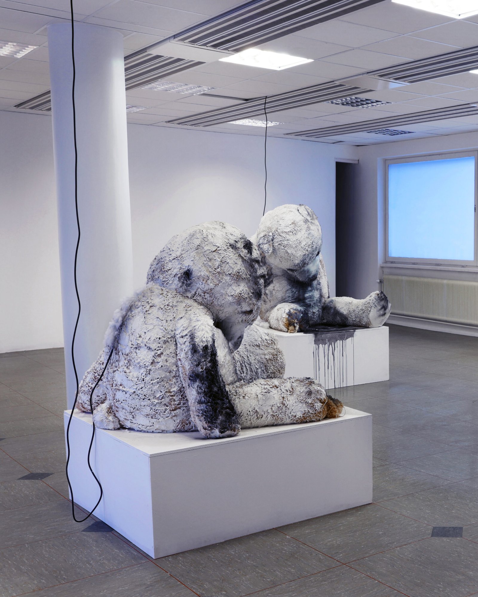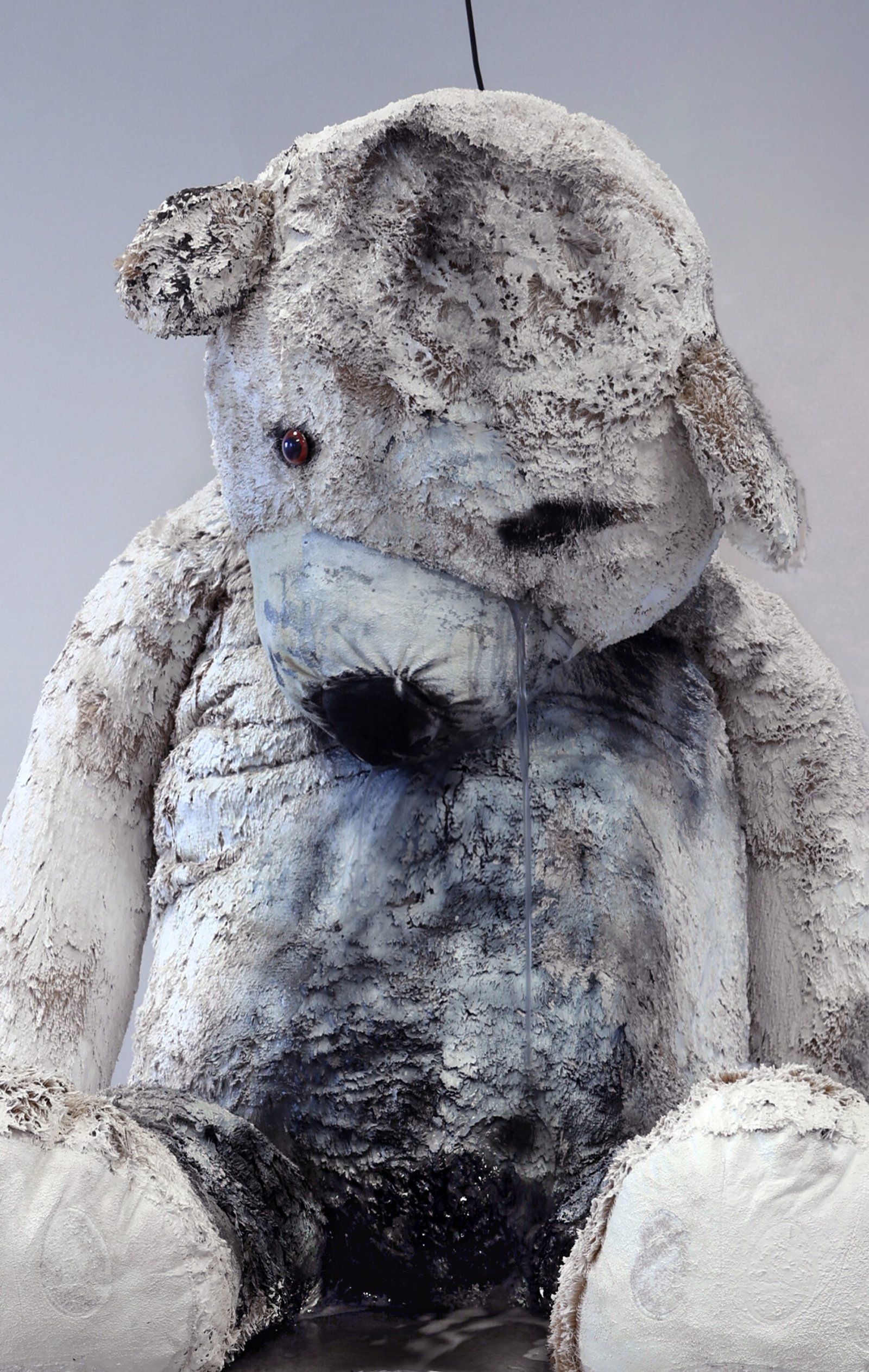 Four teddy bears sit on pedestals. Made of polyester and cotton, they once belonged to a world of comfort, protection, childhood and intimacy. Now they appear torn, contaminated, and heavy with a dark liquid that slowly leaks from their bodies. Silent and slumped inward, they seem caught in a state of mourning, turned not toward the viewer, but toward themselves.