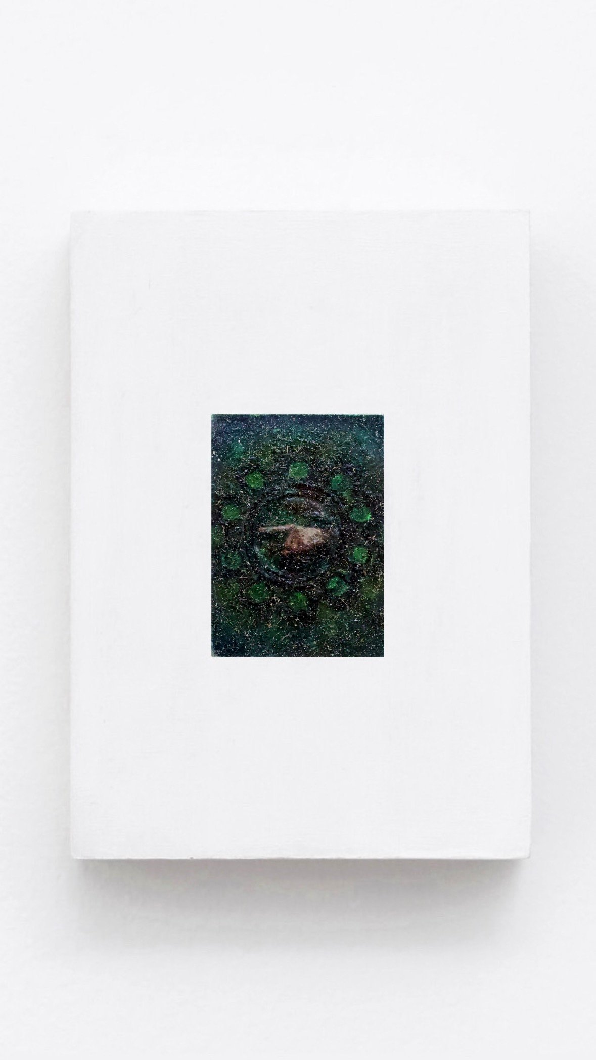 Space is never neutral. What surrounds a work conditions how it is received, how long it holds attention, how meaning accumulates or dissolves. The void is not what remains once the painting has been placed, but what the painting unfolds: the distance that makes looking possible, and allows meaning to gather rather than dissipate. Where does the painting end and the wall begin? It is a question Hannah-Sophia Guerriero refuses to resolve, with her miniature paintings on pine wood inscribed within a field of deliberate white.