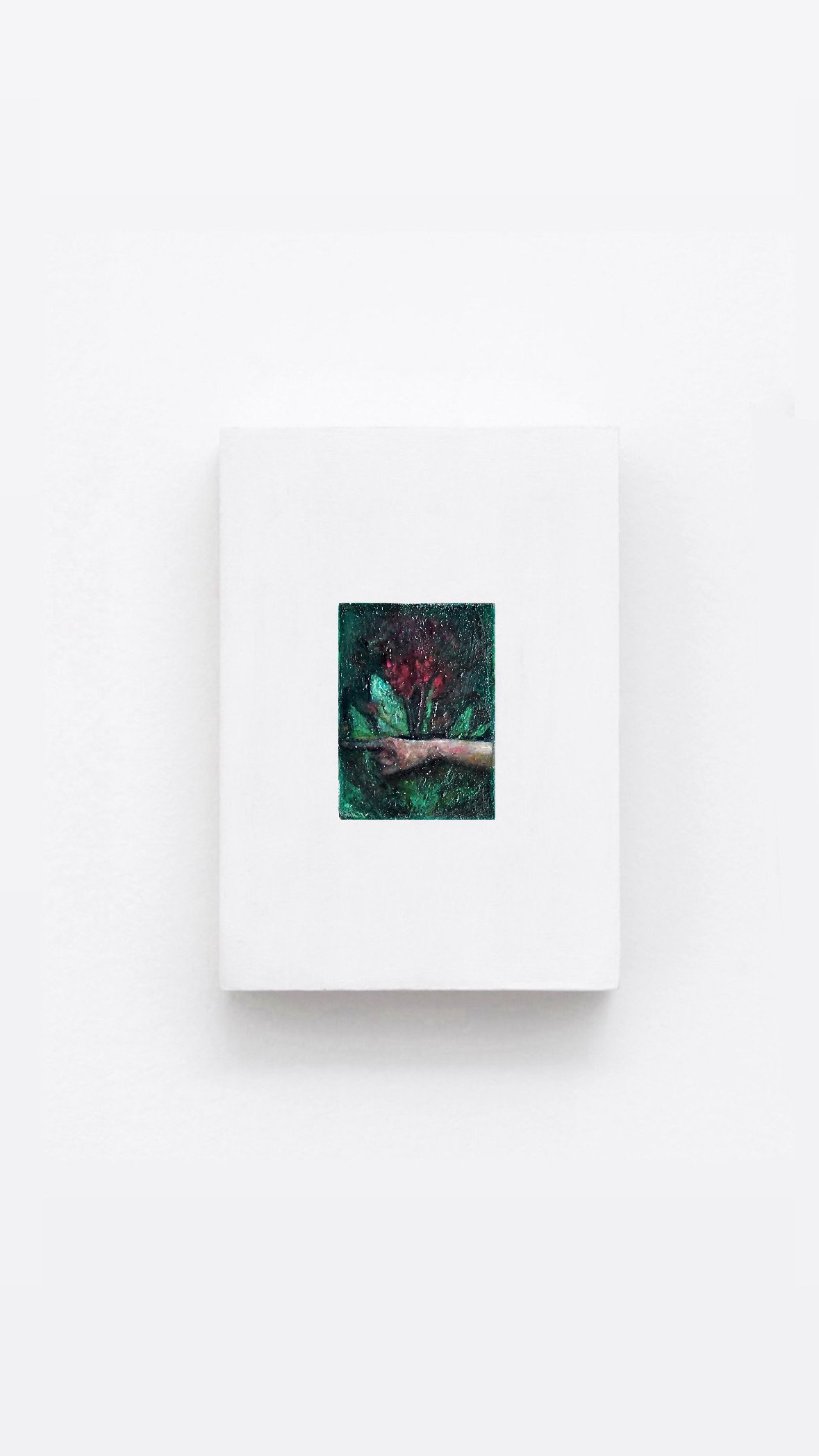In 1434, Jan van Eyck signed the Arnolfini Portrait not along the edge of the panel nor discreetly in a corner, but at the exact centre of the painted wall, above a convex mirror. Johannes de Eyck fuit hic, “Jan van Eyck was here”. The mirror, small as an eye at the heart of the painting, reflects the entire room from the opposite side. It does not show what the painting already shows. It reveals what the painting cannot see of itself. Guerriero appropriates this optical device and reframes it. In Underfold (2026), the convex mirror of the Arnolfini Portrait is emptied of its Flemish bourgeois figures and refilled with presences that belong to the exhibition itself: the pointing hand of Observer (2026), the flowers. What van Eyck used to fold the outside world into the painting, Guerriero uses to fold the works into each other. The mirror no longer opens onto a room beyond the picture plane, but onto the other paintings on the wall. The three works thereby establish a circular conversation: the hand in Observer gestures outward, the mirror in Underfold catches and returns that gesture, and In Situ (2025), suspended between them, holds the landscape from which their shared imagery emerges — flowers glimpsed through a window in southern Italy, colours intensified until they exceed their source, edges softened and dissolved into the surrounding surface until image and memory become indistinguishable. Each painting is at once origin and destination of the others’ gaze. The system is self-contained, sealed, complete.