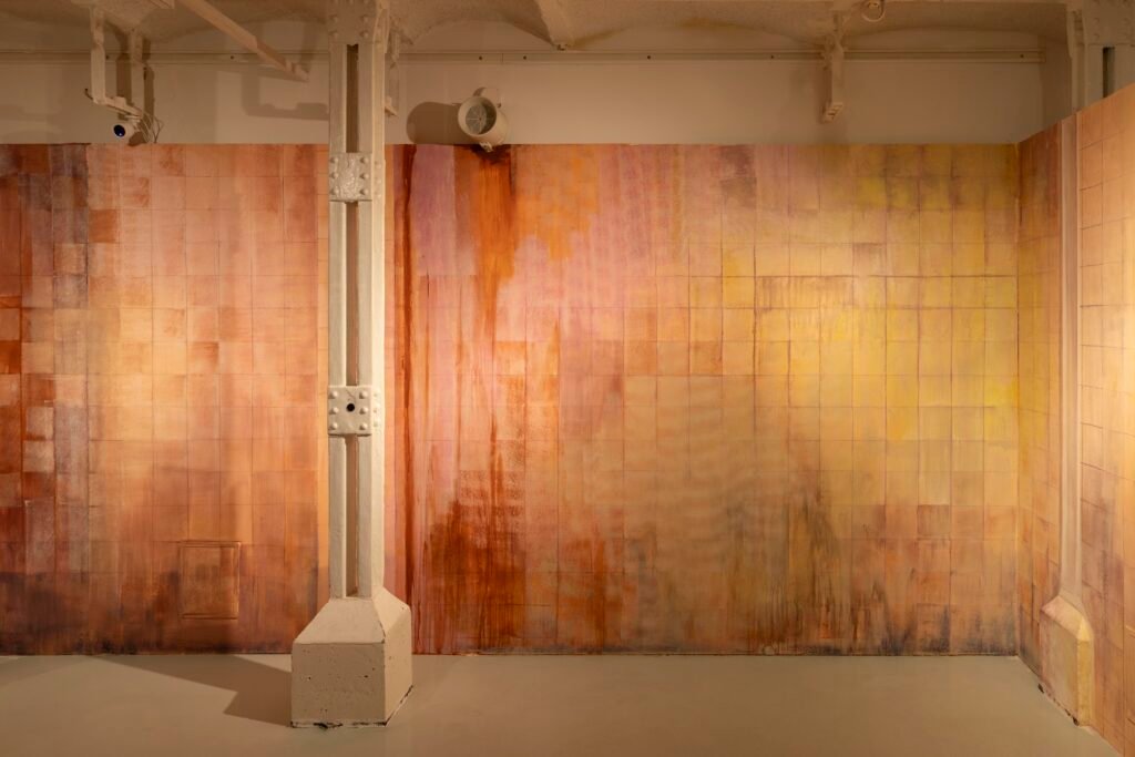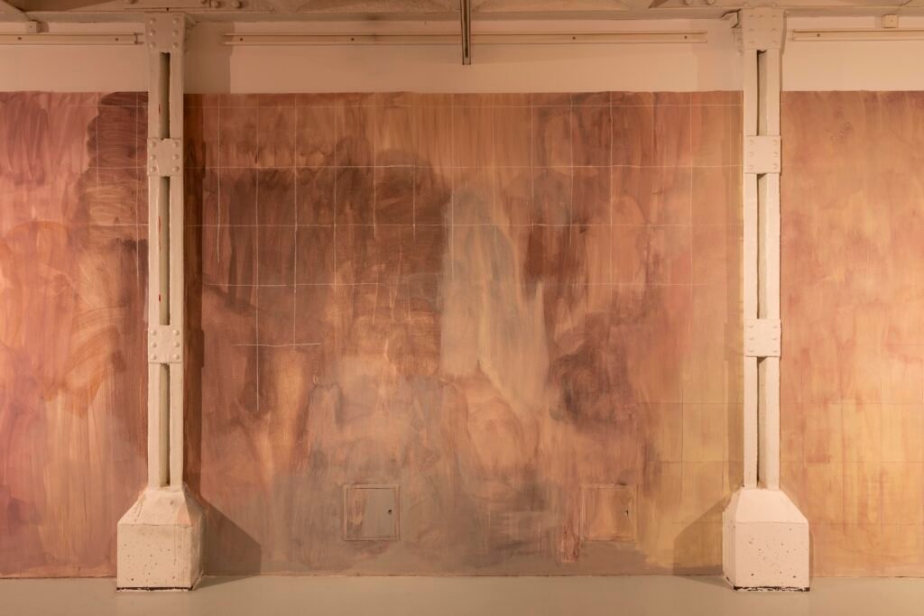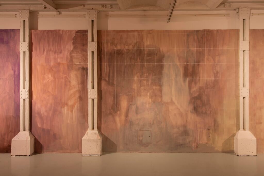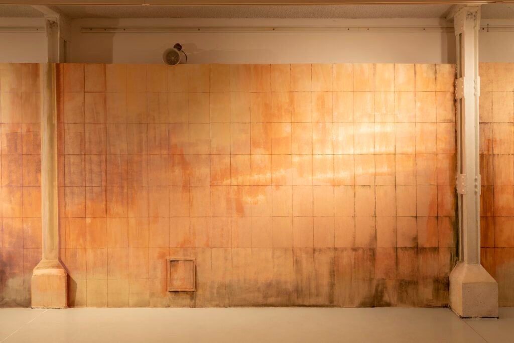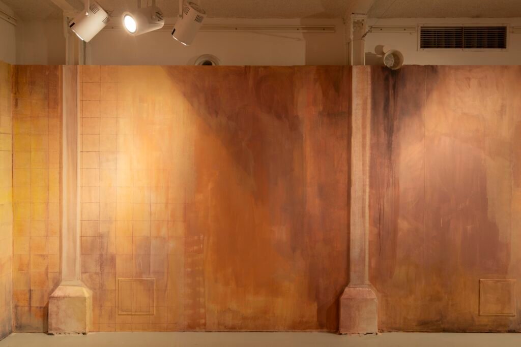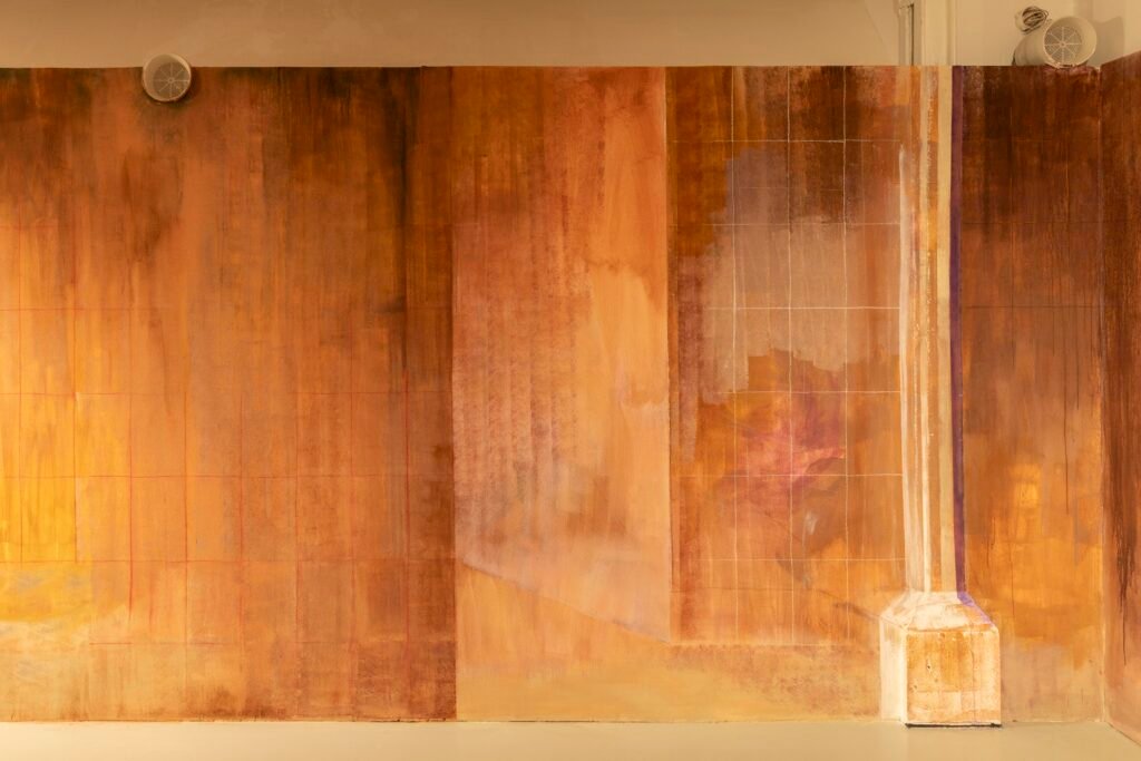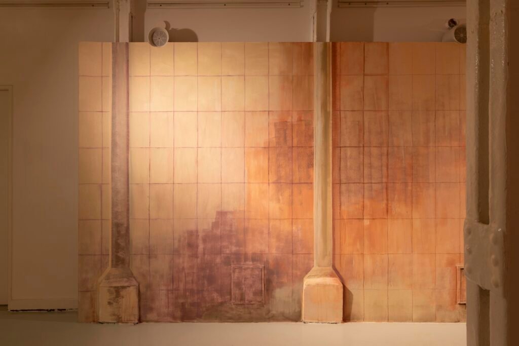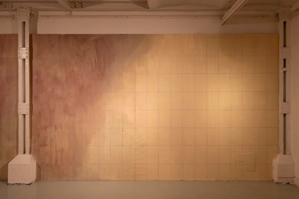 Paulina Semkowicz uses the medium of monumental painting to create transitional, narrative – though abstract – spaces in which absence or presence becomes crucial to the viewer’s experience. Inspired by her many years of experience in theatrical painting, she transforms backgrounds into active stages for contingency, playing with themes that remain elusive yet deeply resonant. The titular Glaze, a site-specific fresco created for TRAFO’s underground exhibition space, evokes the liminal interiors of swimming pool changing rooms and bathhouses. It is, however, far removed from figurative literalness. The artist plays with painterly matter and light, conjuring the atmosphere of a place associated with transformation, uncertainty, disorientation, or dystopia.