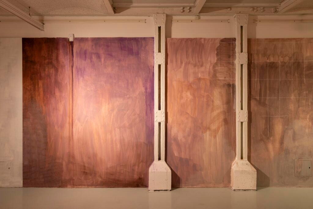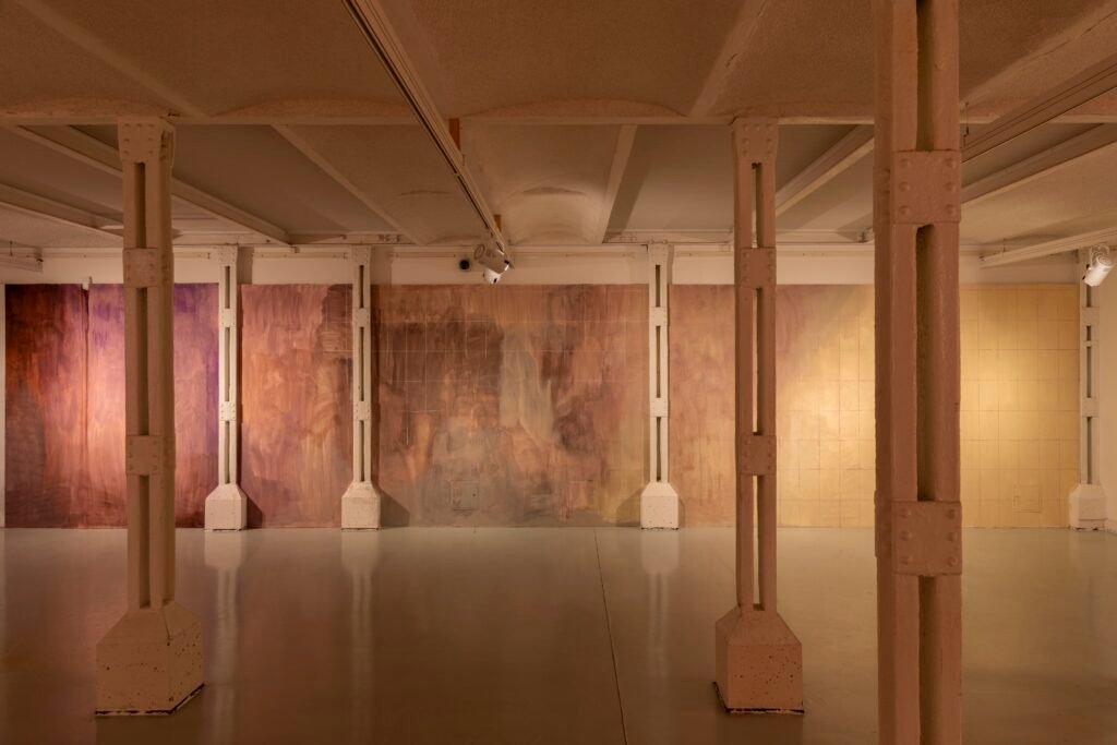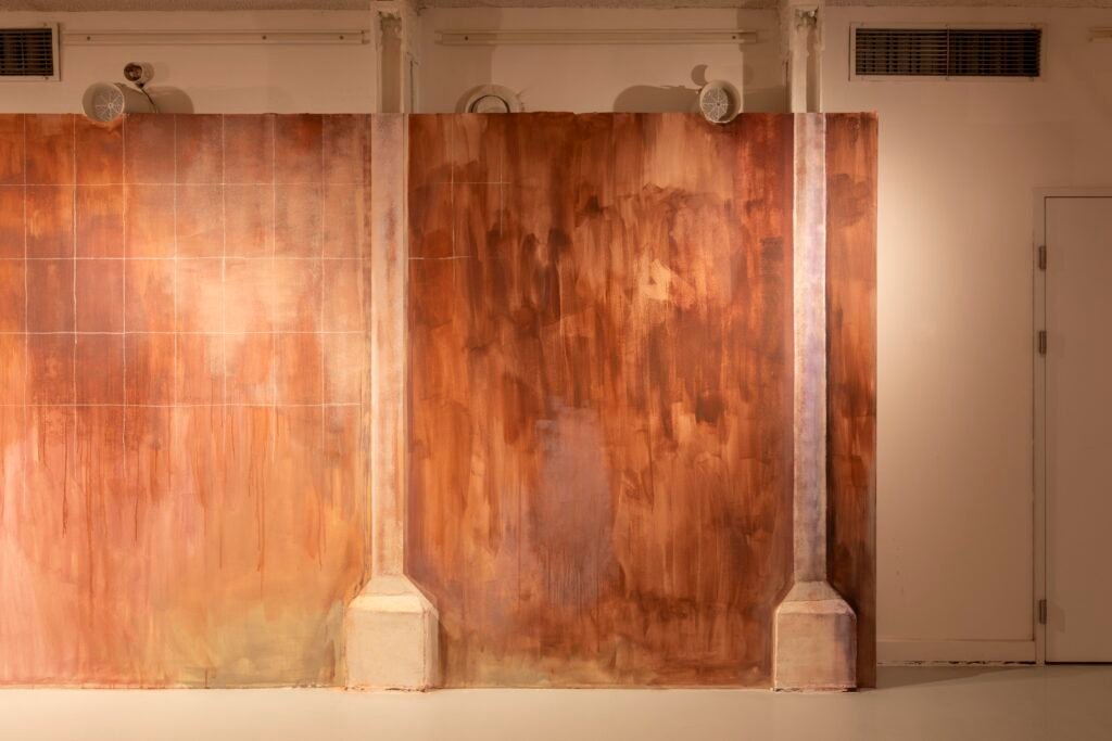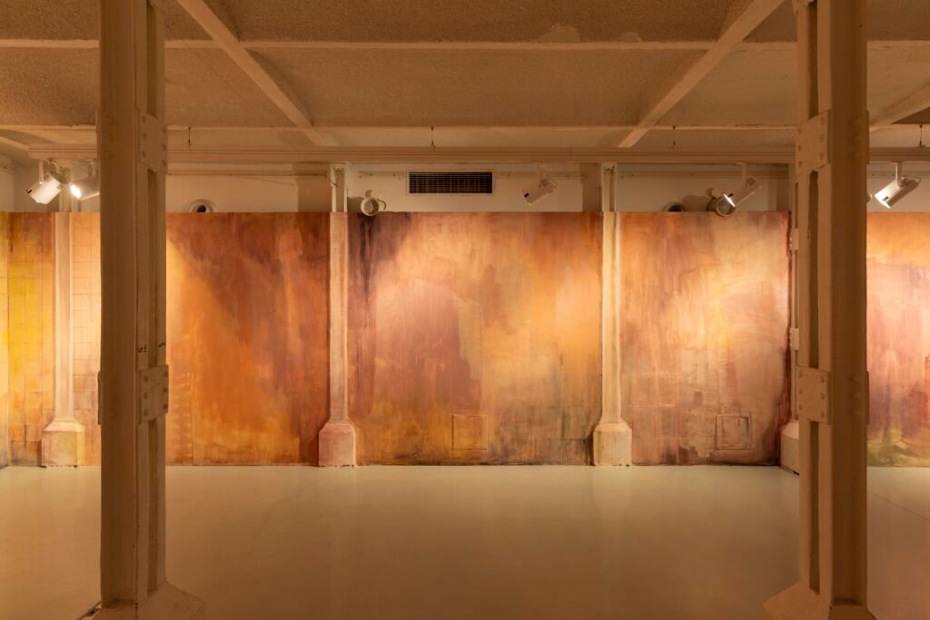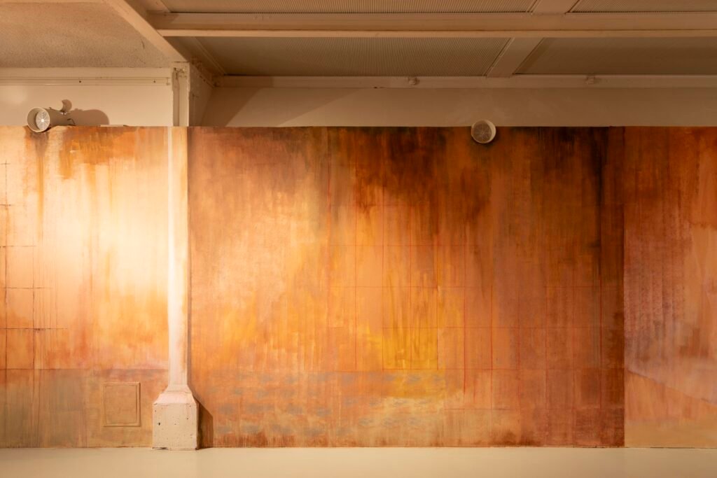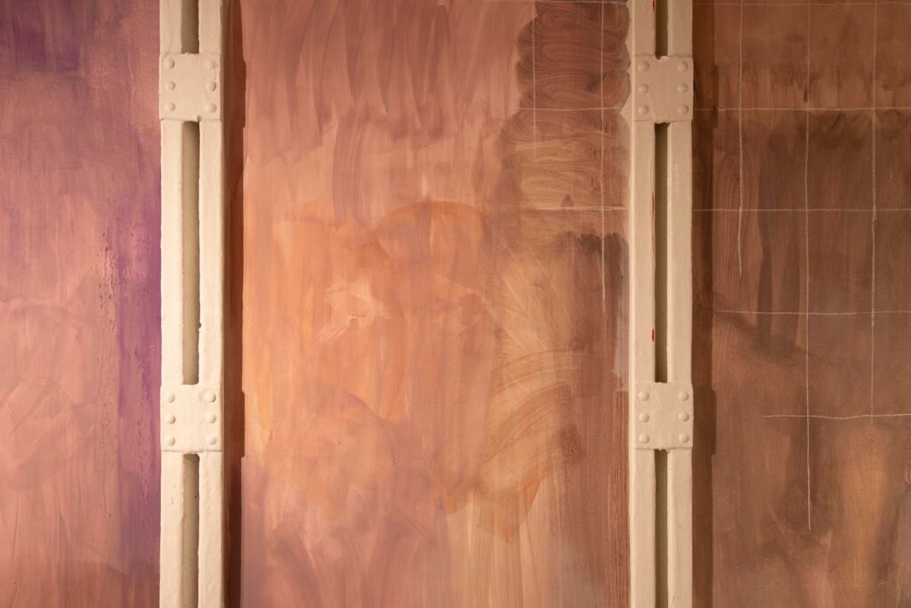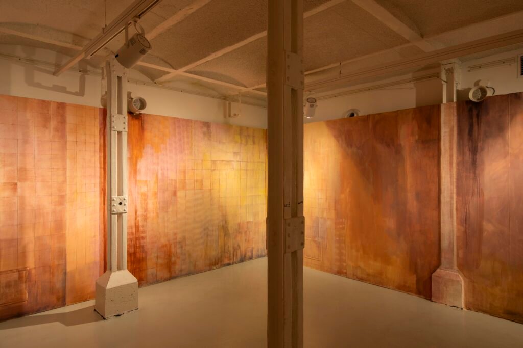 Paulina Semkowicz uses the medium of monumental painting to create transitional, narrative – though abstract – spaces in which absence or presence becomes crucial to the viewer’s experience. Inspired by her many years of experience in theatrical painting, she transforms backgrounds into active stages for contingency, playing with themes that remain elusive yet deeply resonant. The titular Glaze, a site-specific fresco created for TRAFO’s underground exhibition space, evokes the liminal interiors of swimming pool changing rooms and bathhouses. It is, however, far removed from figurative literalness. The artist plays with painterly matter and light, conjuring the atmosphere of a place associated with transformation, uncertainty, disorientation, or dystopia.
