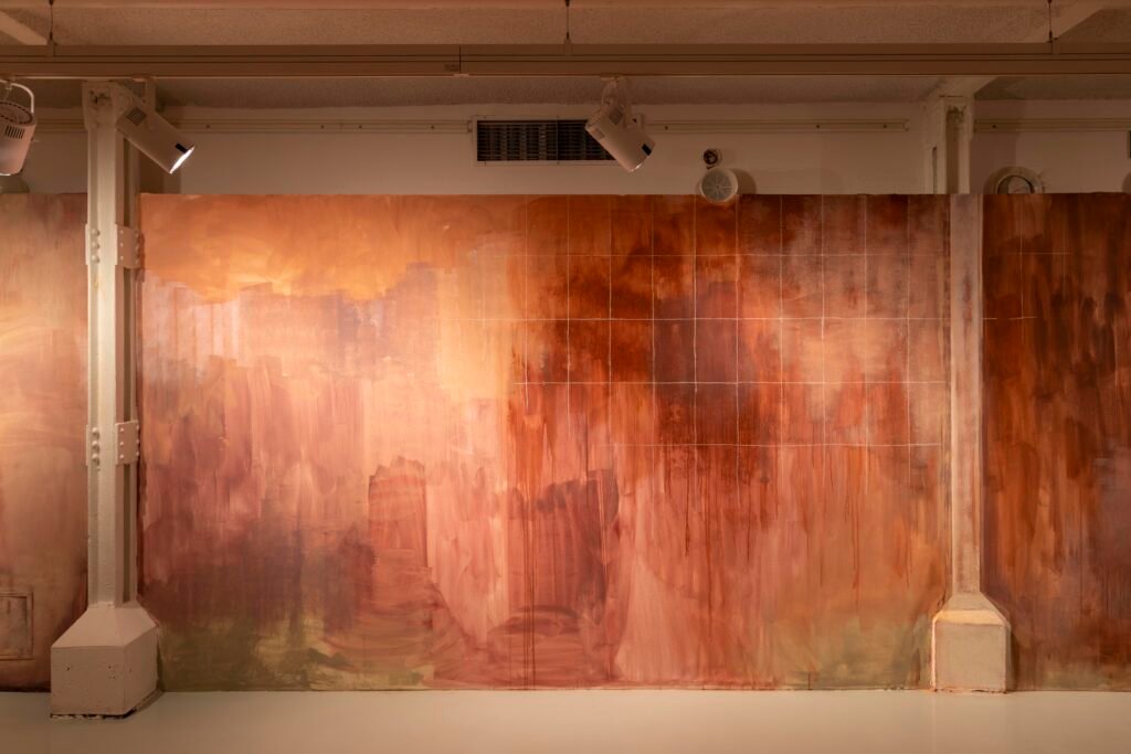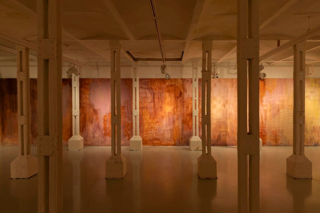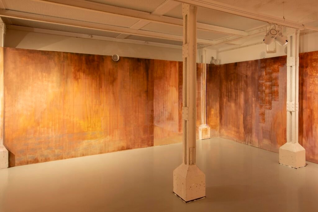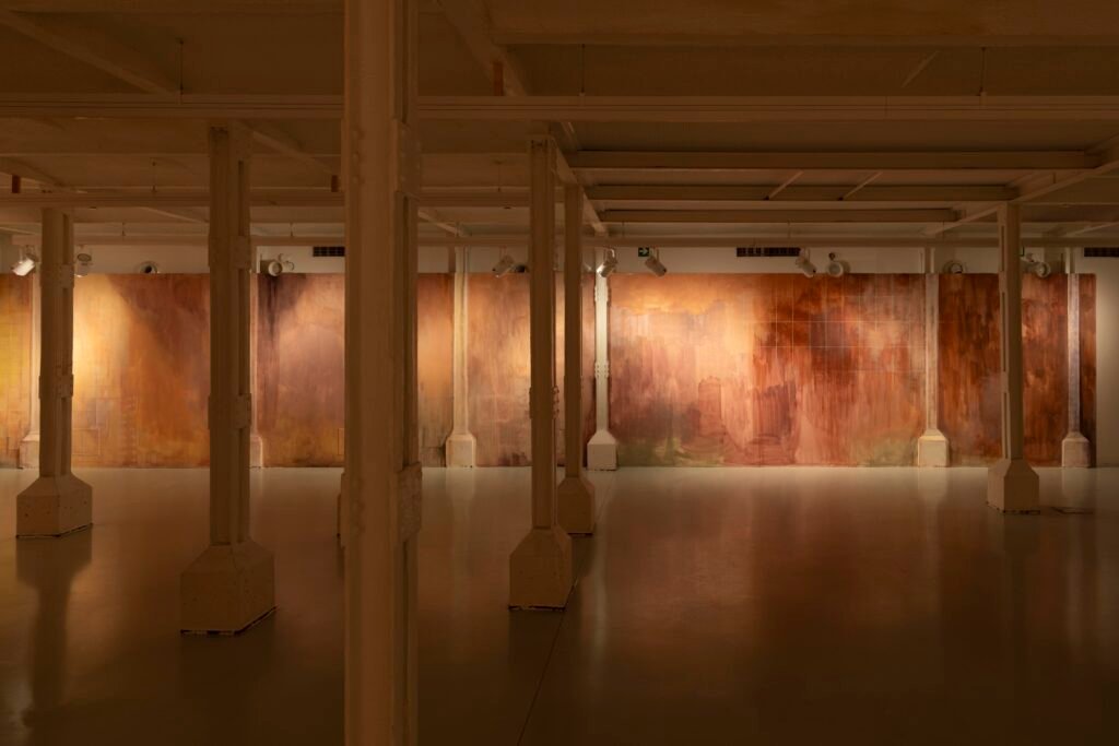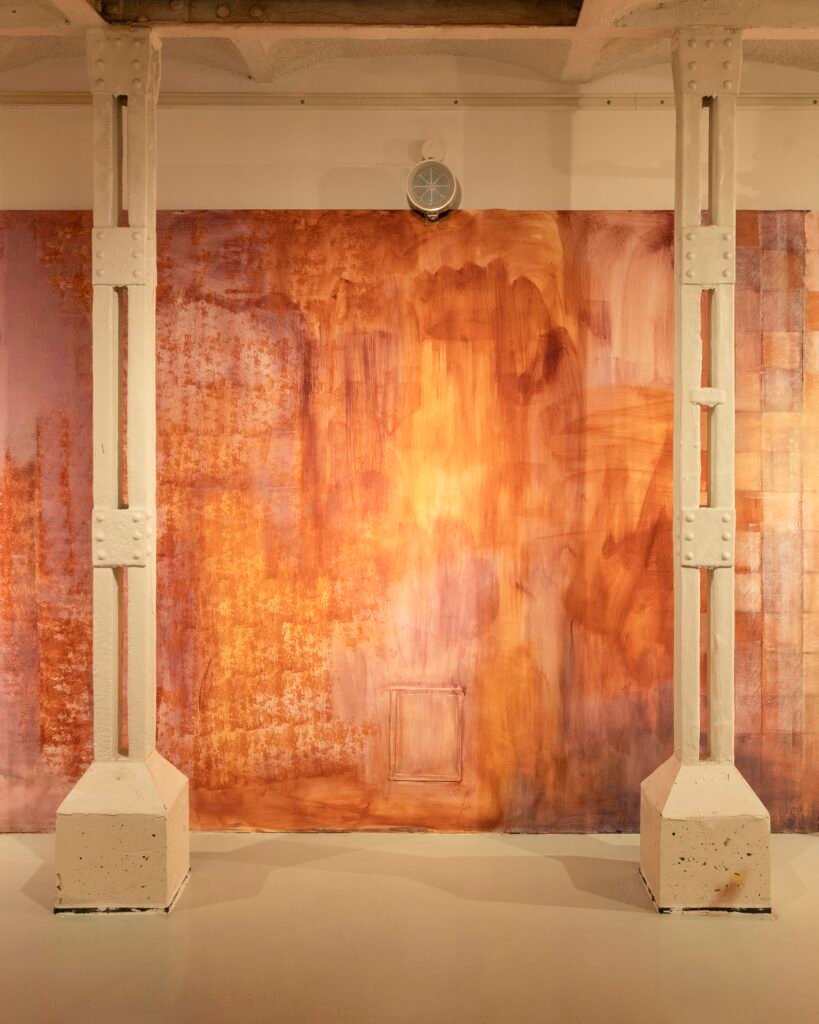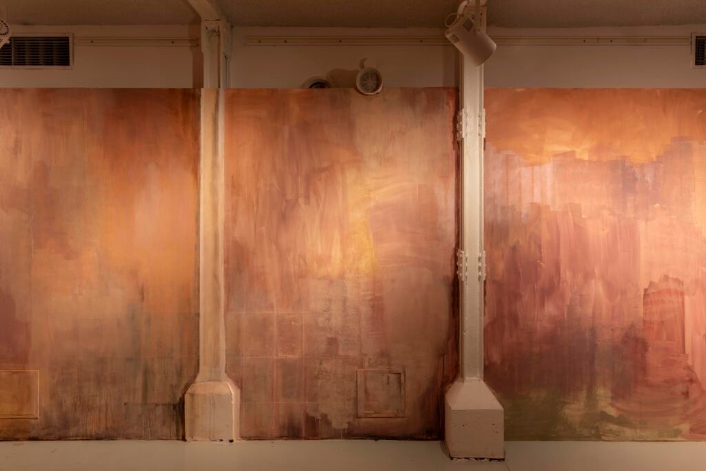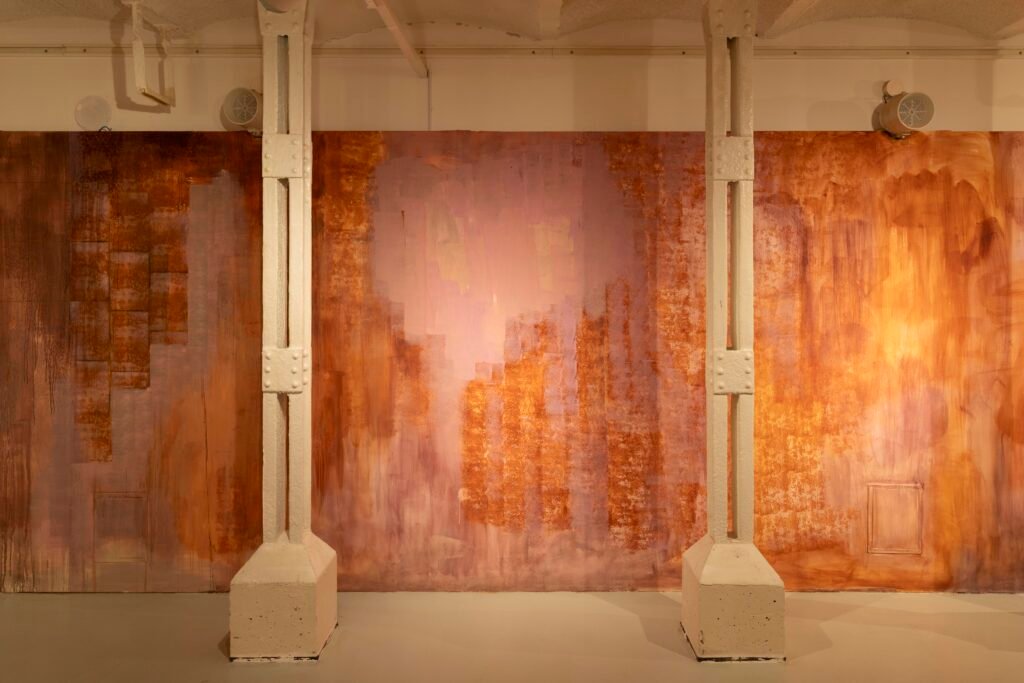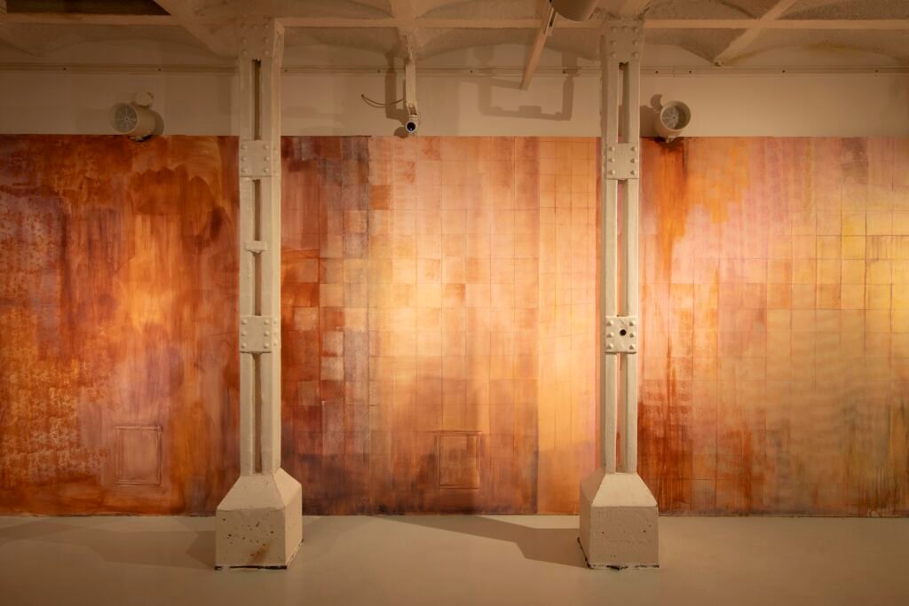 Paulina Semkowicz uses the medium of monumental painting to create transitional, narrative – though abstract – spaces in which absence or presence becomes crucial to the viewer’s experience. Inspired by her many years of experience in theatrical painting, she transforms backgrounds into active stages for contingency, playing with themes that remain elusive yet deeply resonant. The titular Glaze, a site-specific fresco created for TRAFO’s underground exhibition space, evokes the liminal interiors of swimming pool changing rooms and bathhouses. It is, however, far removed from figurative literalness. The artist plays with painterly matter and light, conjuring the atmosphere of a place associated with transformation, uncertainty, disorientation, or dystopia.