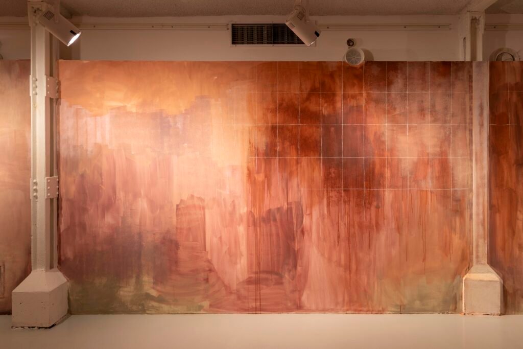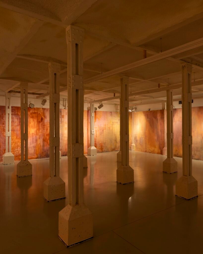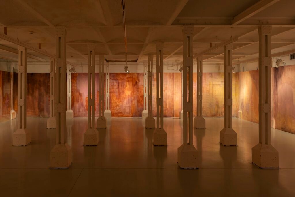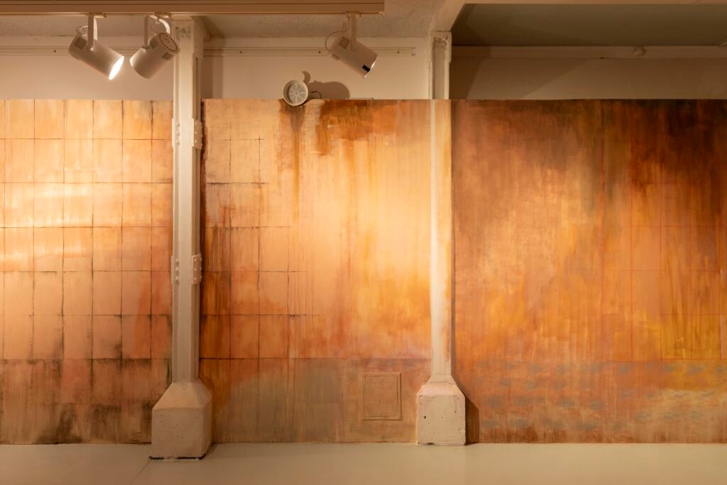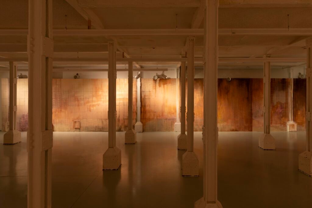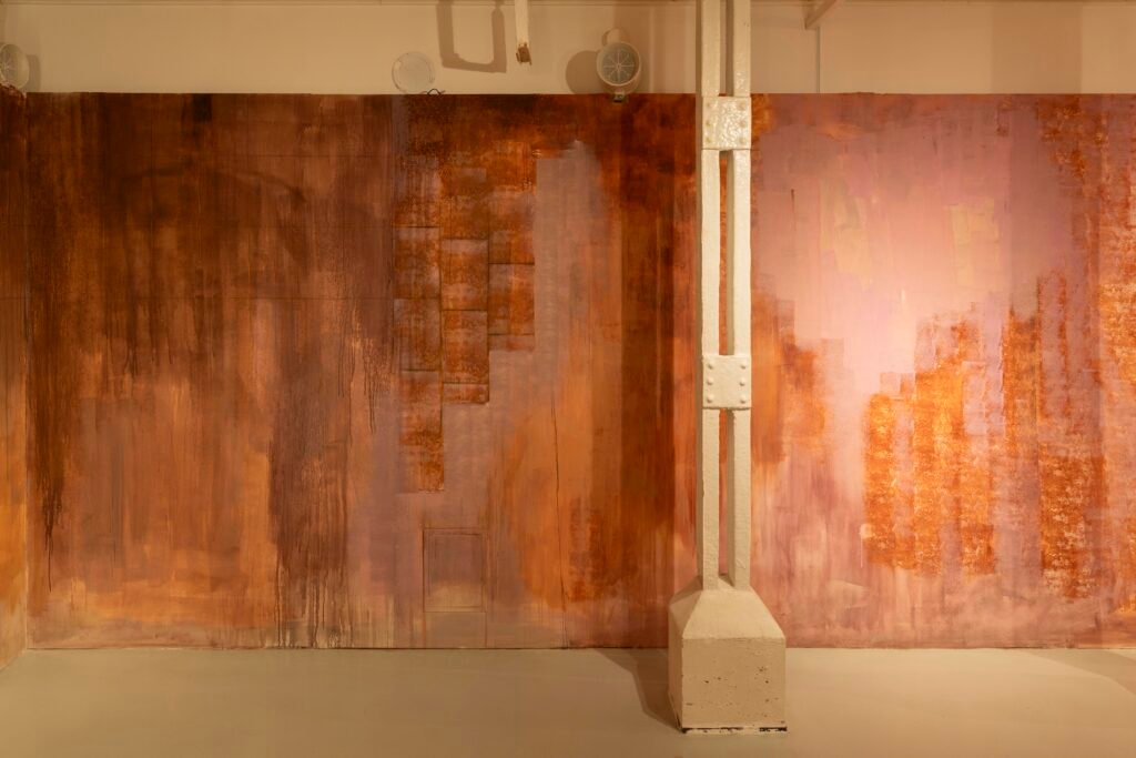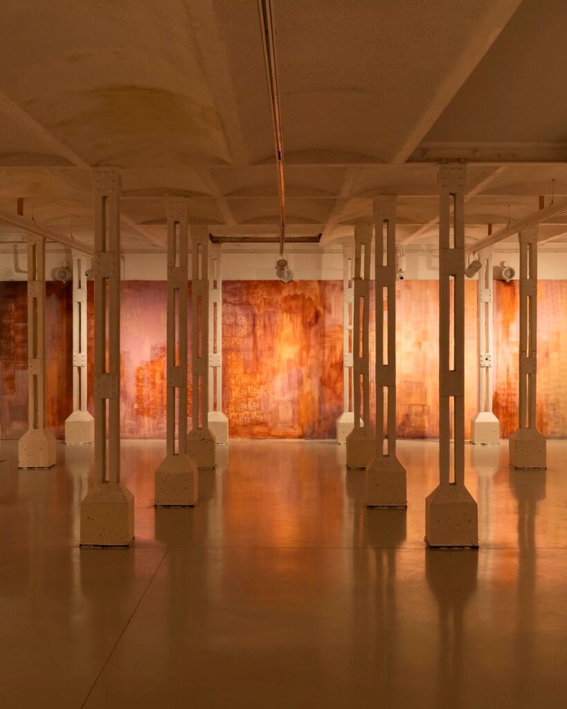 Paulina Semkowicz uses the medium of monumental painting to create transitional, narrative – though abstract – spaces in which absence or presence becomes crucial to the viewer’s experience. Inspired by her many years of experience in theatrical painting, she transforms backgrounds into active stages for contingency, playing with themes that remain elusive yet deeply resonant. The titular Glaze, a site-specific fresco created for TRAFO’s underground exhibition space, evokes the liminal interiors of swimming pool changing rooms and bathhouses. It is, however, far removed from figurative literalness. The artist plays with painterly matter and light, conjuring the atmosphere of a place associated with transformation, uncertainty, disorientation, or dystopia.
