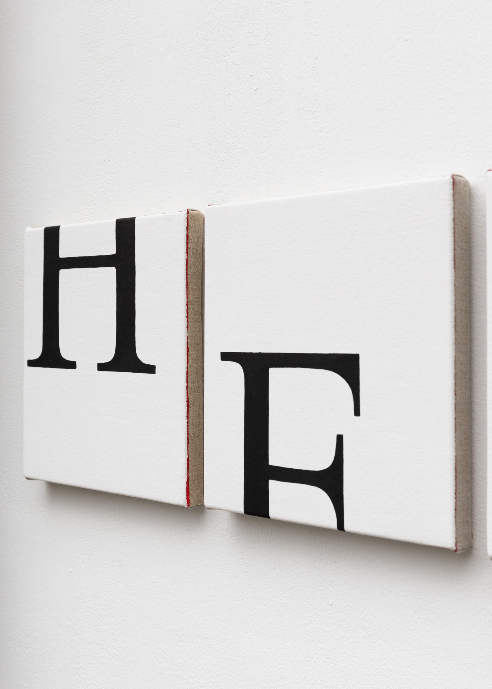 Joshua: Okay, I just looked it up. It was designed for newspapers, specifically The Times of London, which debuted the font in 1932. It became widely used in publishing and is still popular. I think it’s interesting that you were drawn to this particular font, because you’re using it in an unusual manner – breaking up each letter into individual units, as well as cropping, etc. One other thought is that you said you were drawn to the font because it’s essentially banal, but it’s also a loaded choice because it’s been so widely disseminated as a means to convey information in newspapers and publications. I wonder if you have any thoughts about this?