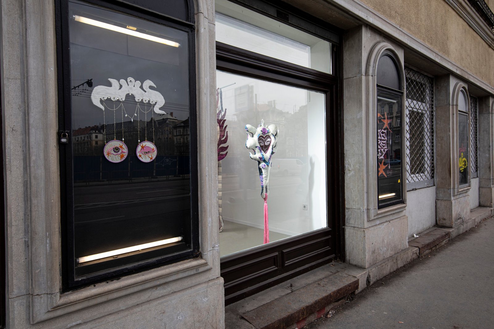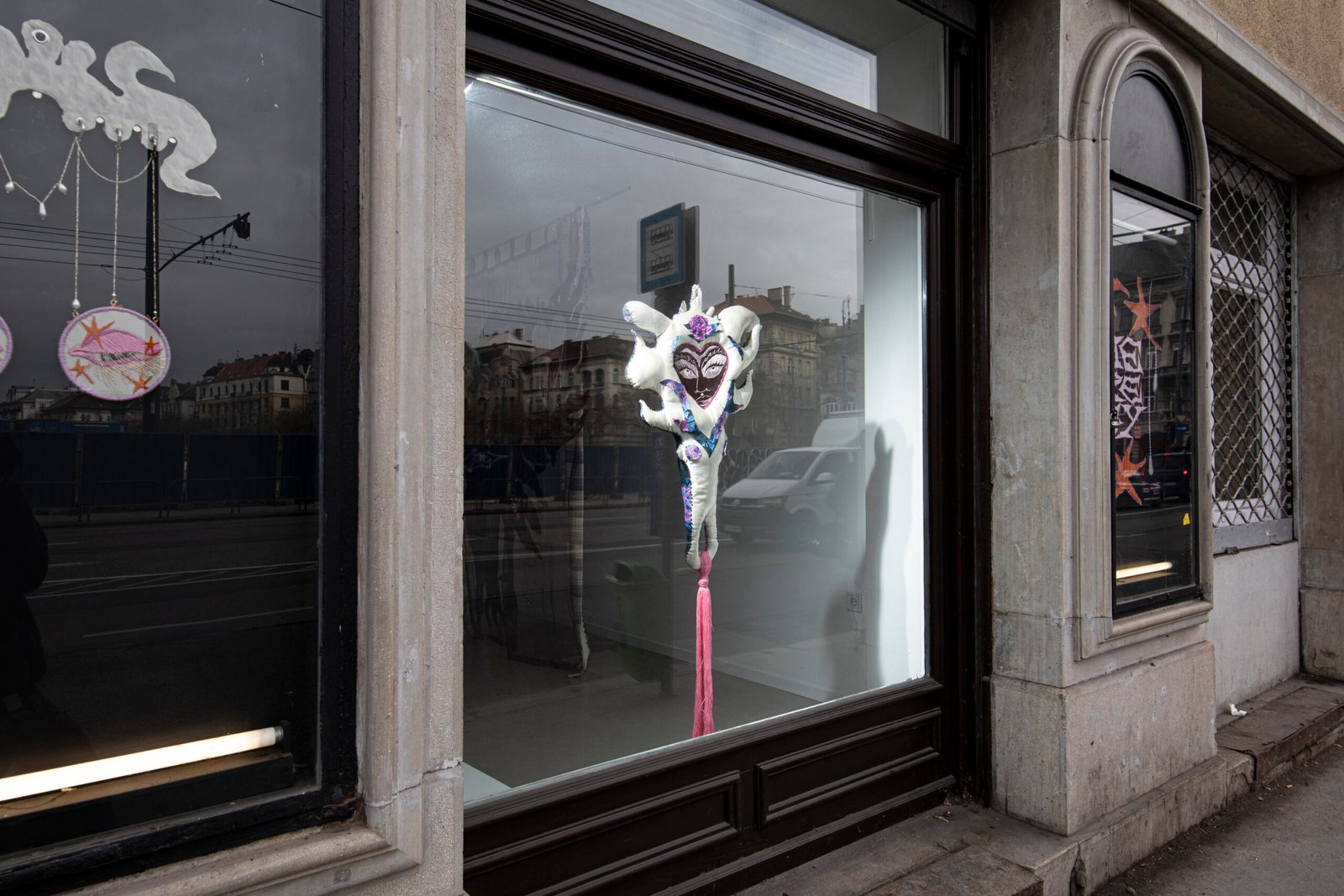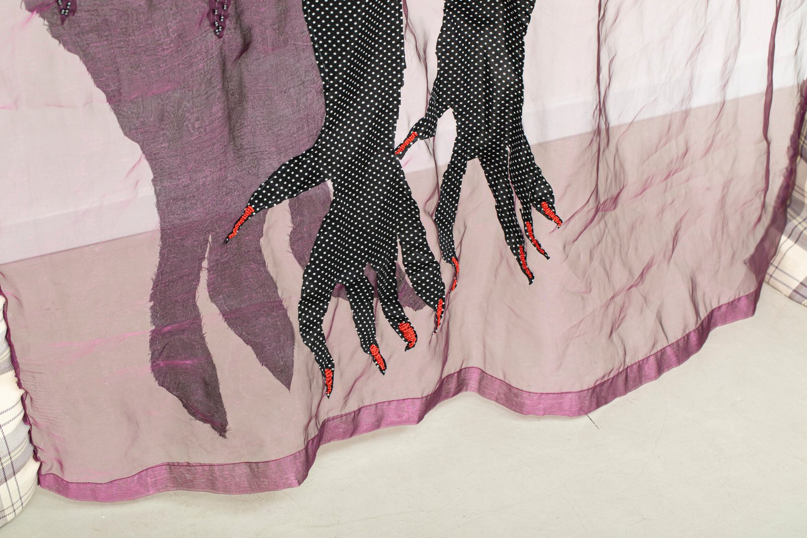 Boglárka Dankó’s figures emerge from under the watchful eye of the Mother of the Night, a large textile installation depicting a witch becoming a crow. They all arrive from a nocturnal realm, a time in which bodies loosen their borders, identities drift and transformation becomes possible. A temporal and symbolic space associated with women, secrecy, care and forms of life that resist discipline.