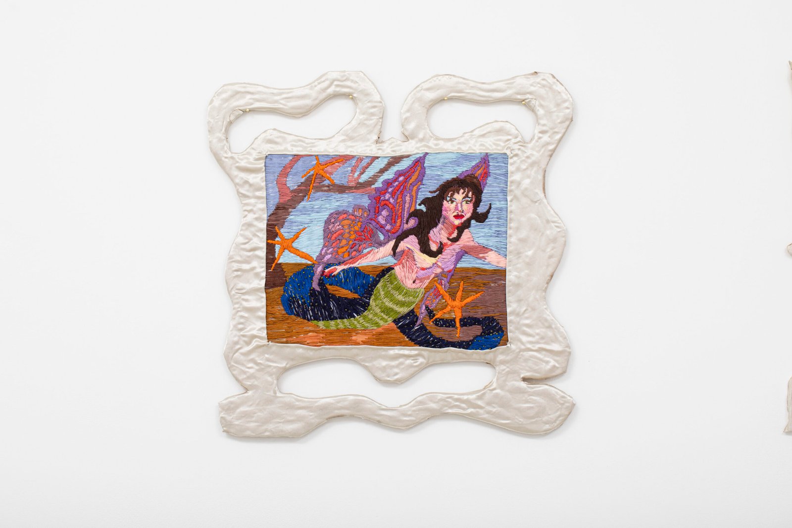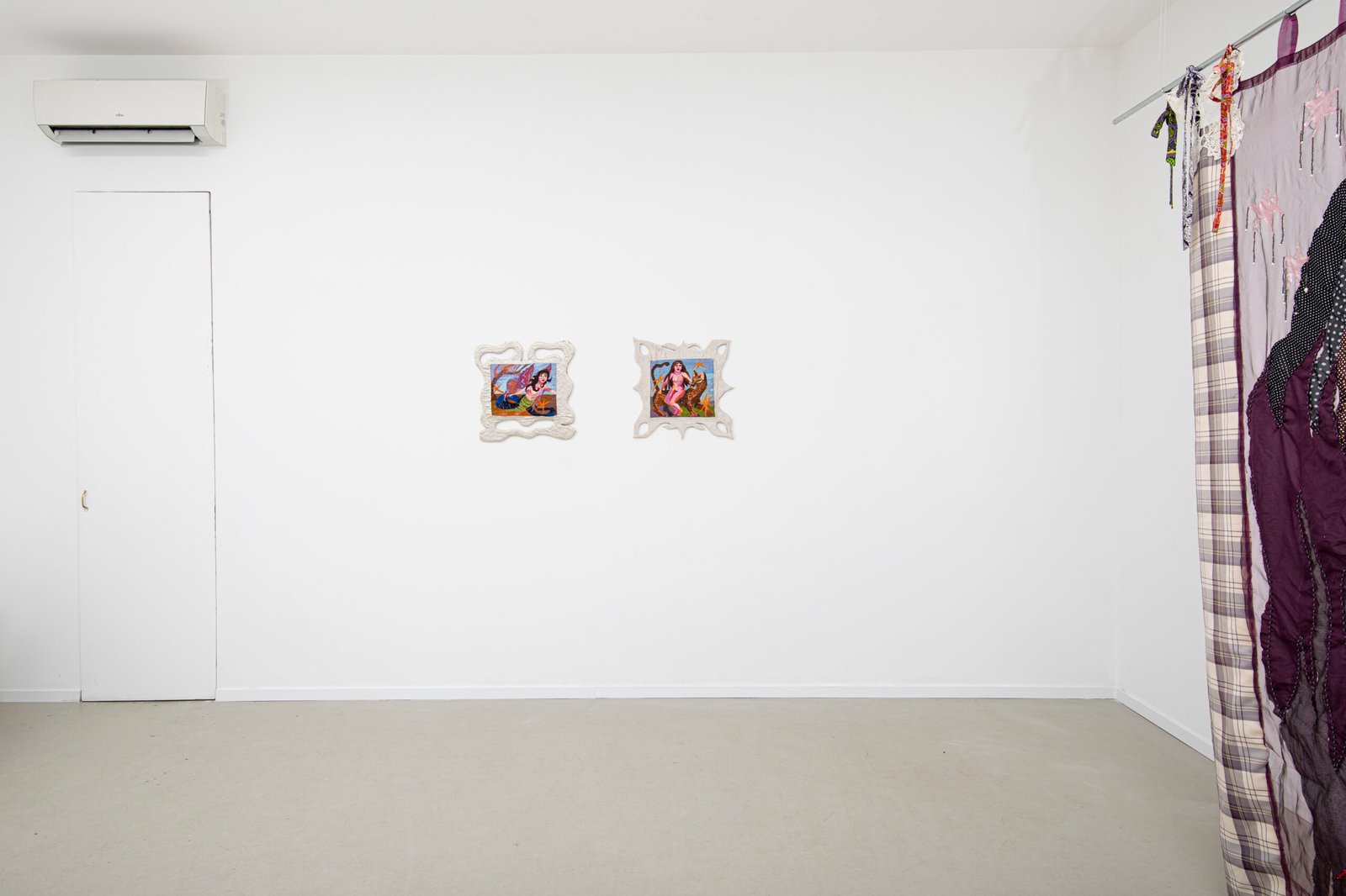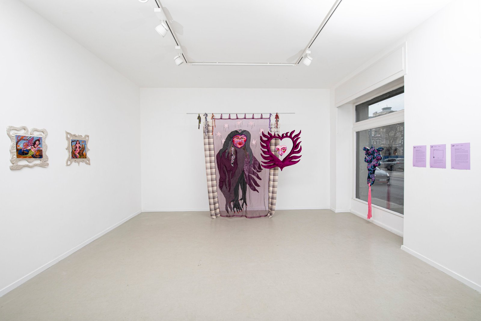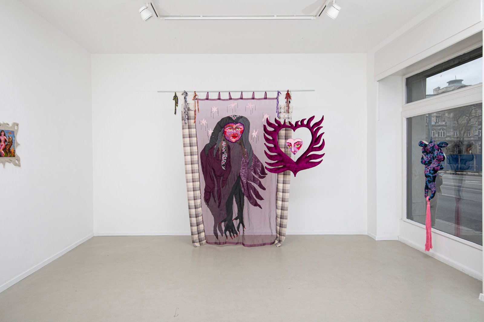 Embroidery, beads, pearls, sequins and ornamental elements saturate and overflow the surfaces in collage-like compositions, building dense and tactile fields. Reclaimed textiles and seamwork construct the interplay between the artworks. Still slow, still haptic, still nocturnal.