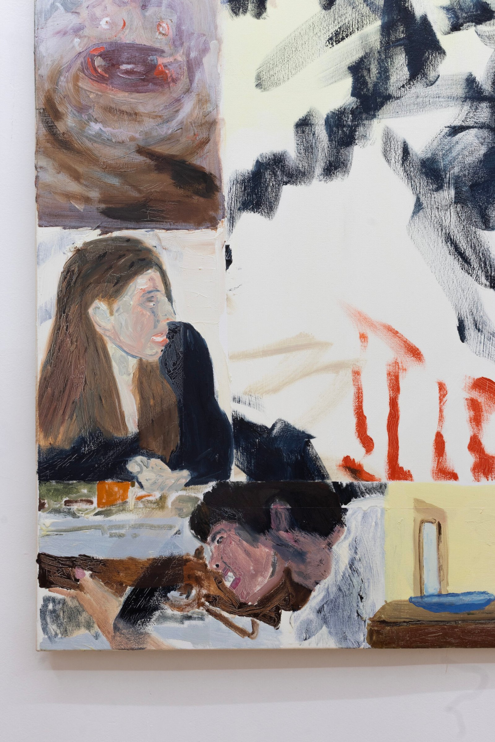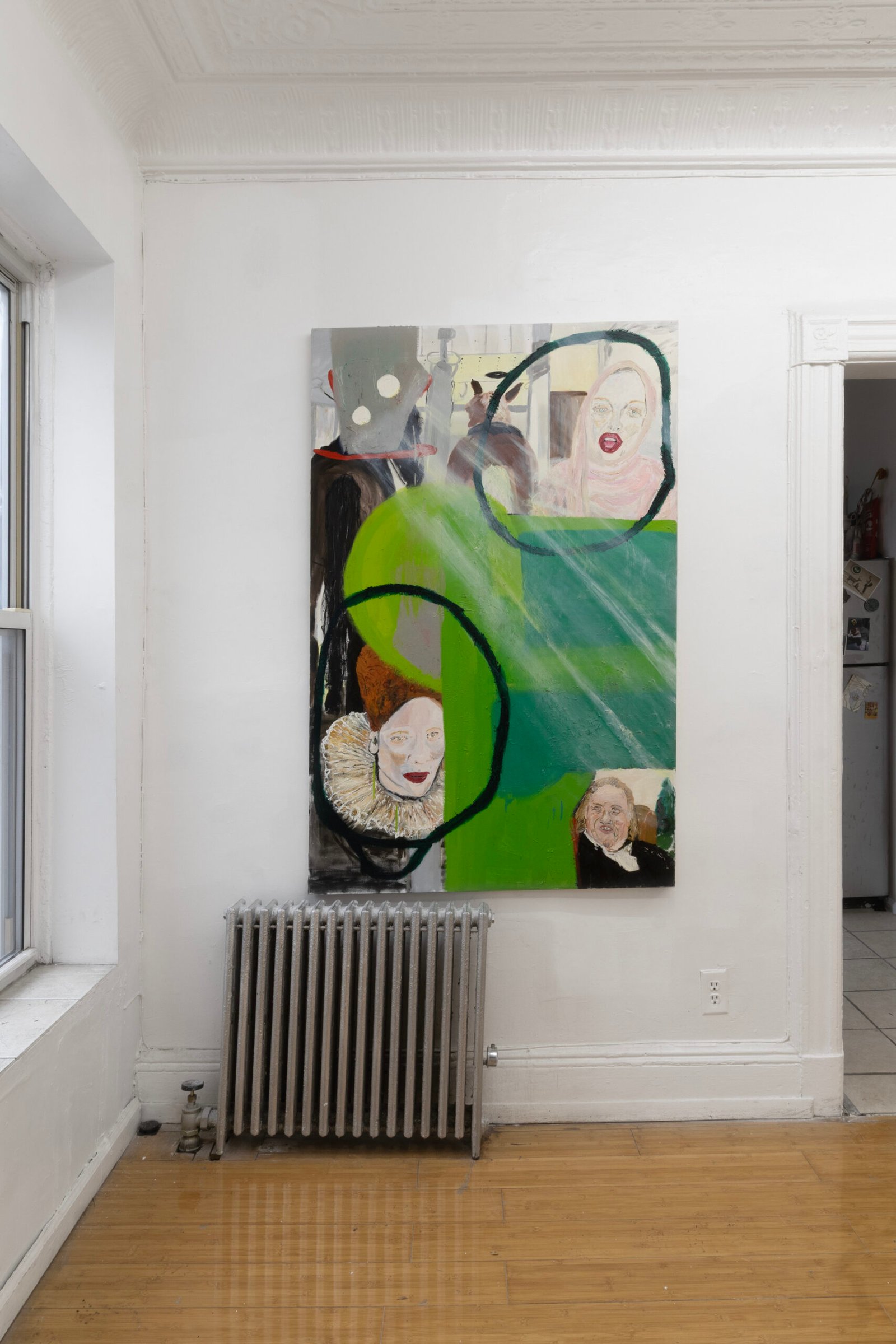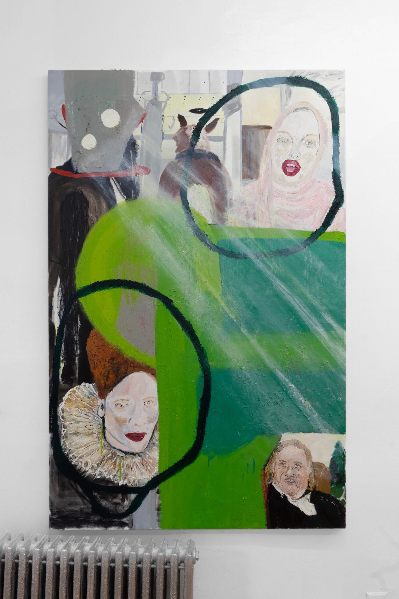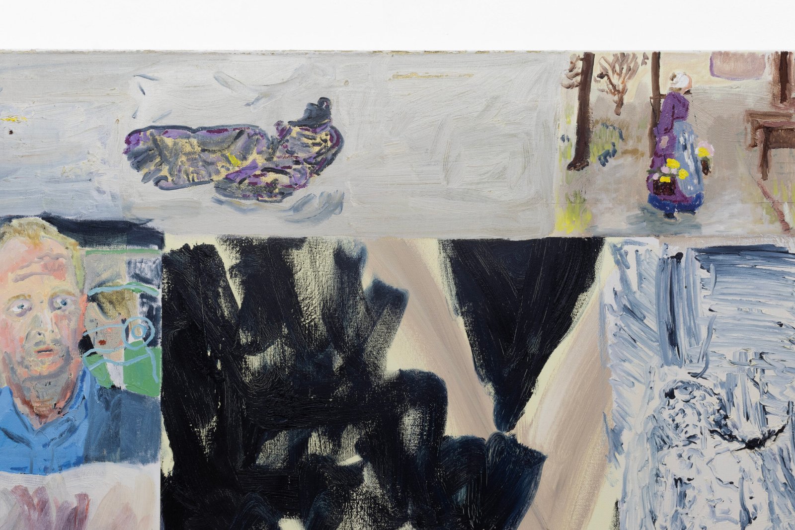 The show emulates moving through a haunted house of sensorial stimulations, where images and faces (Queen Elizabeth (Cate Blanchet)’s cakey porcelain skin, Jutta Koether’s fugly toe shoes, groovy dancers from Hype Williams’ 1998 ‘Belly’) shift in and out of focus, constantly unsettled. Each element holding equal importance, is masterfully and lovingly composed, but painted with disarming urgency. They’re stacked with oppressively bright opaque aquas and yellows that bring out something I can only describe as a mall-like faux brightness: the fakeness, the fluorescence, the dread.