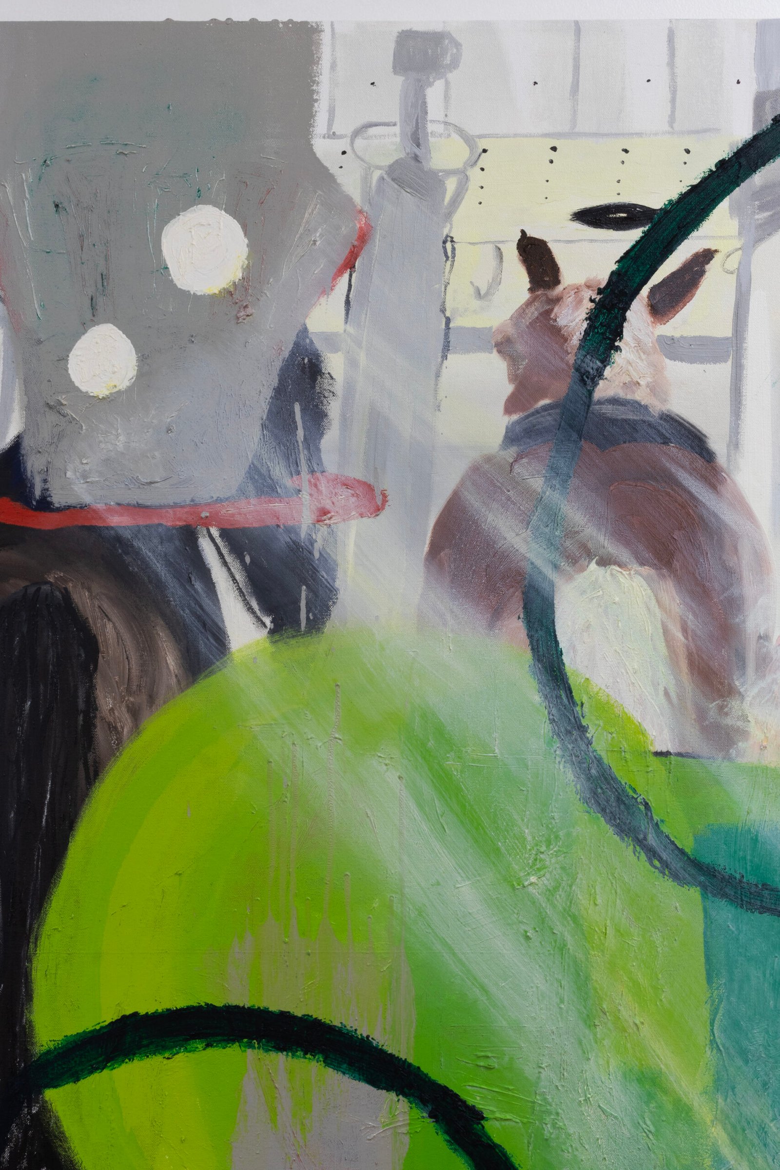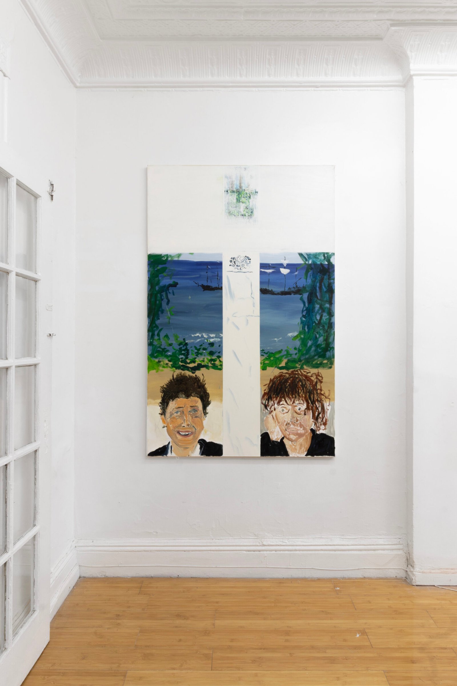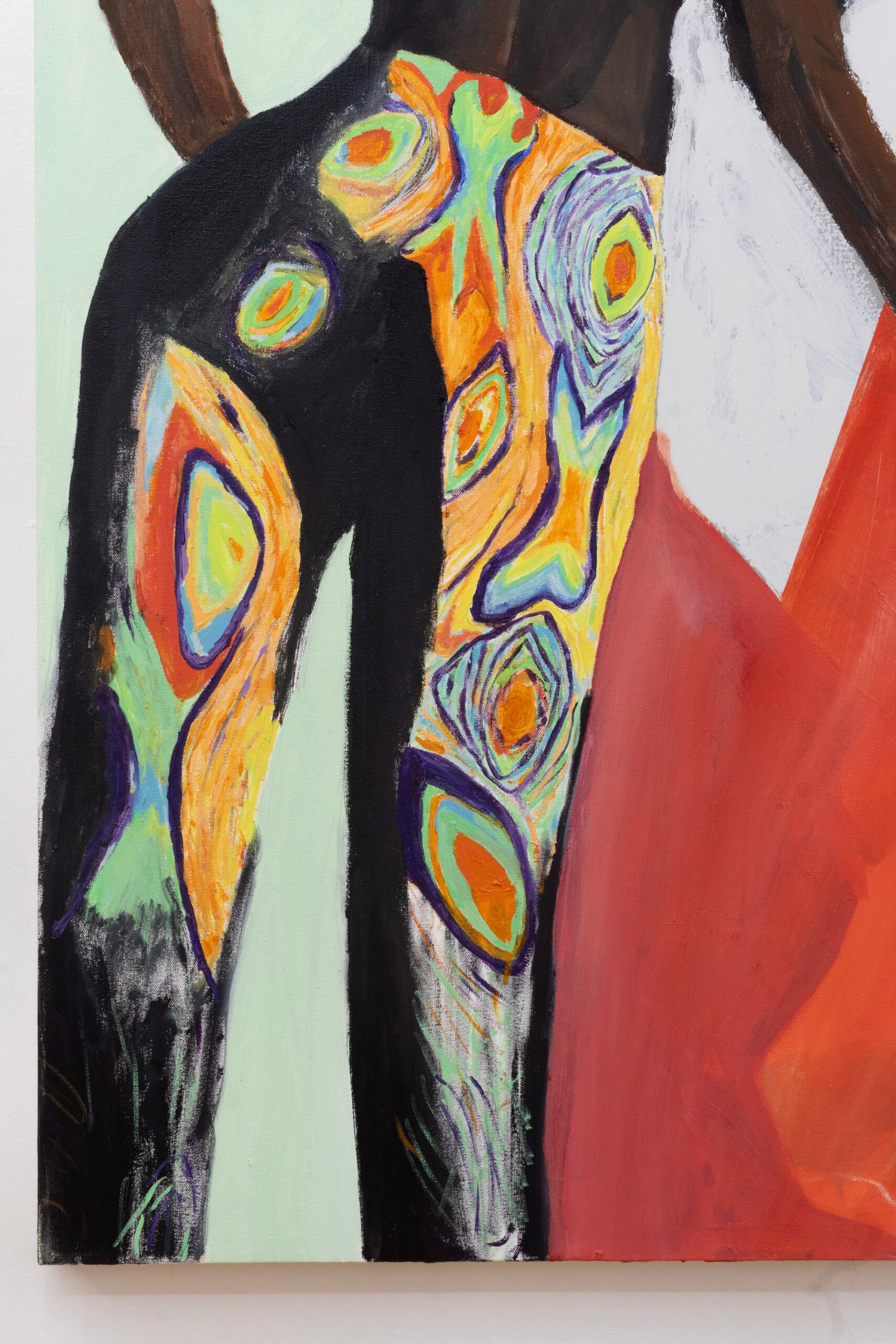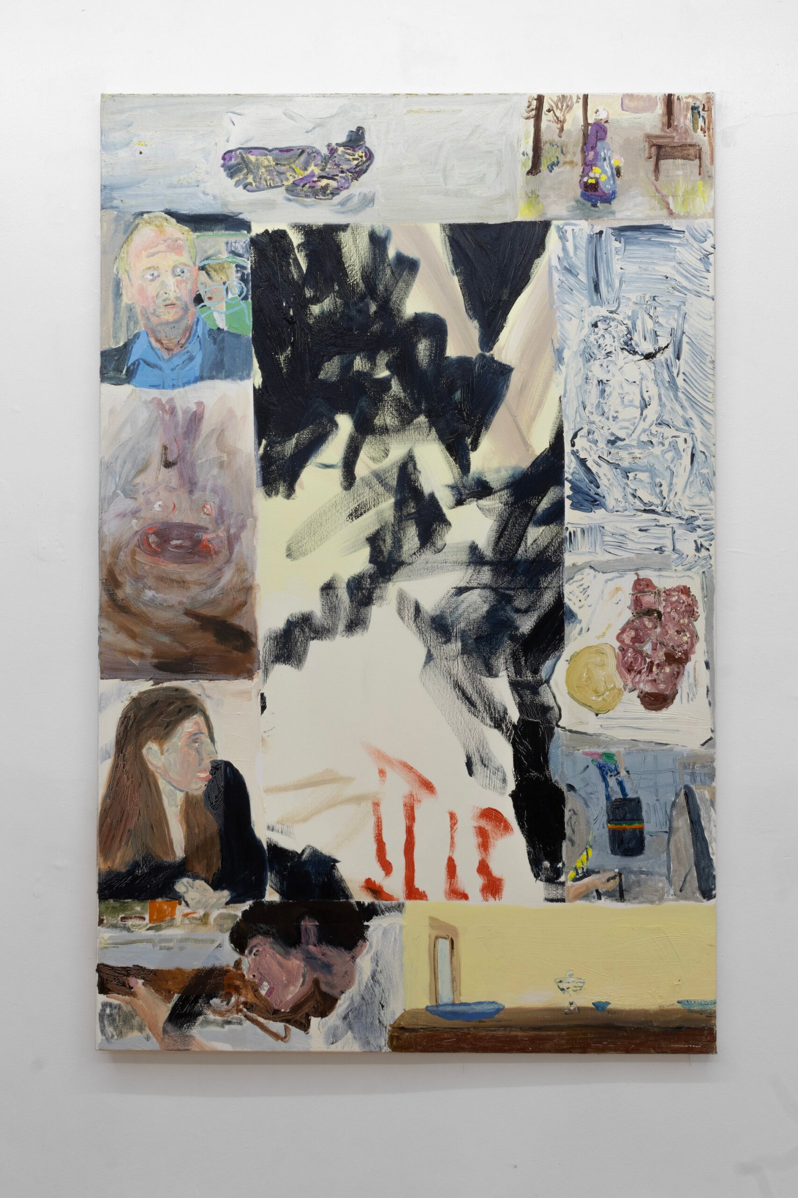 The show emulates moving through a haunted house of sensorial stimulations, where images and faces (Queen Elizabeth (Cate Blanchet)’s cakey porcelain skin, Jutta Koether’s fugly toe shoes, groovy dancers from Hype Williams’ 1998 ‘Belly’) shift in and out of focus, constantly unsettled. Each element holding equal importance, is masterfully and lovingly composed, but painted with disarming urgency. They’re stacked with oppressively bright opaque aquas and yellows that bring out something I can only describe as a mall-like faux brightness: the fakeness, the fluorescence, the dread.