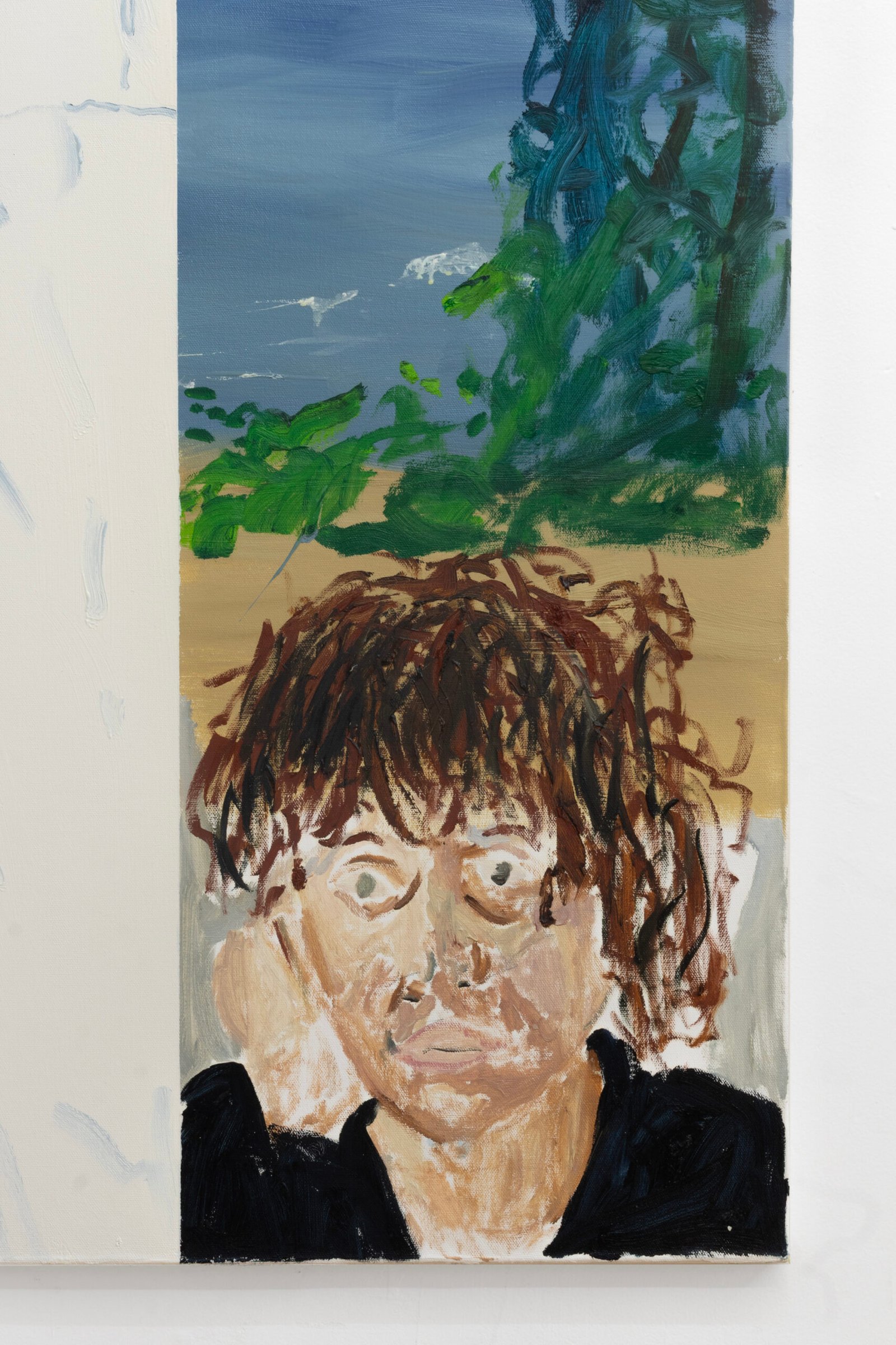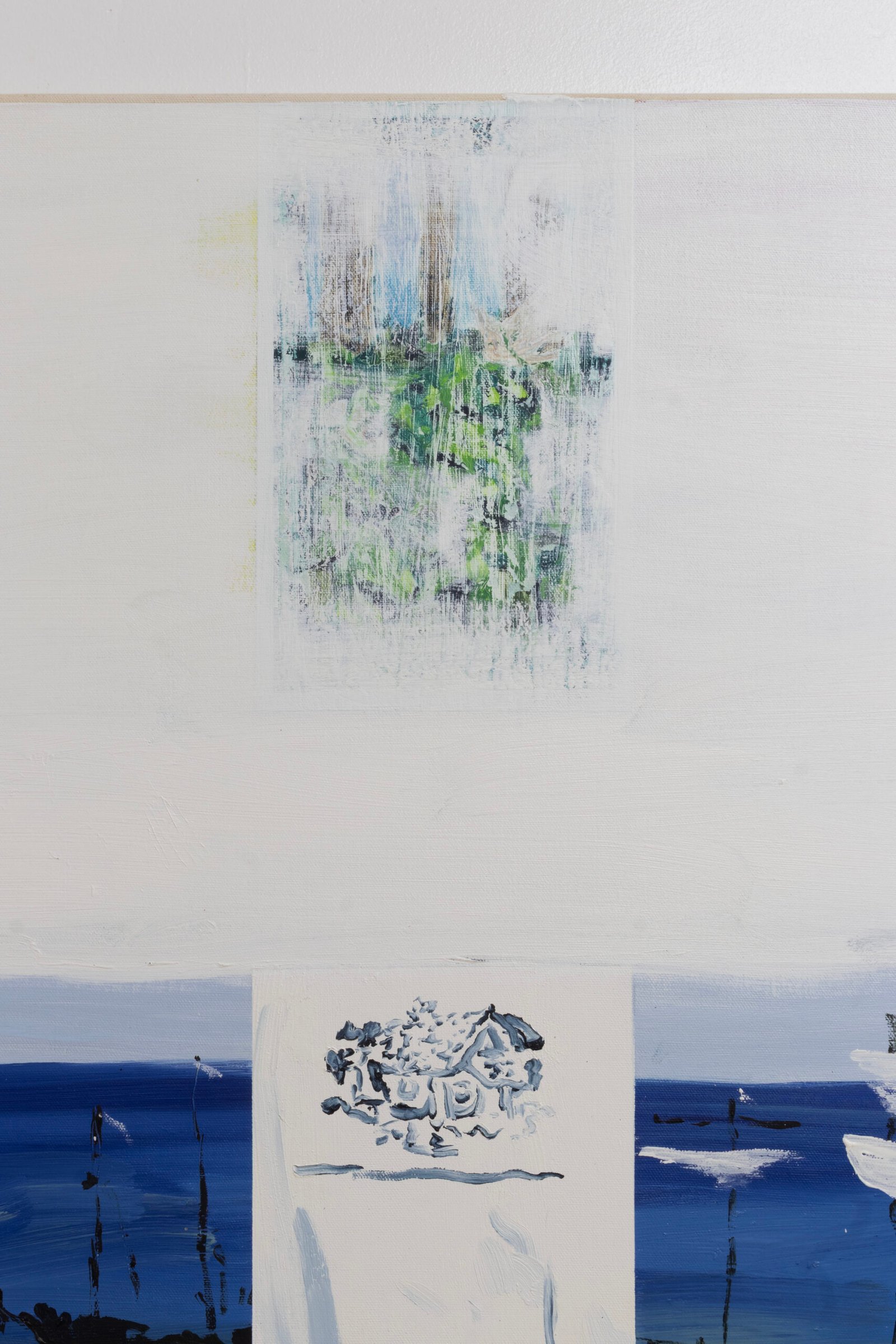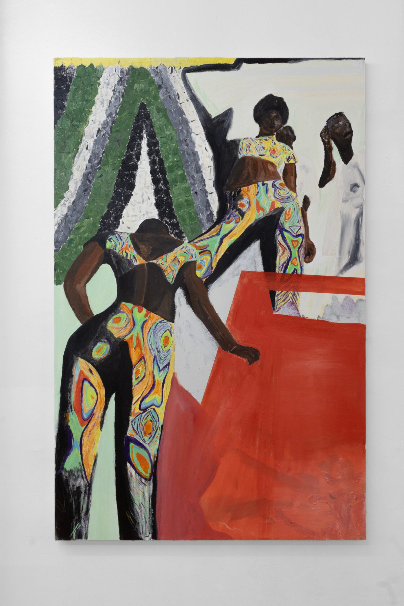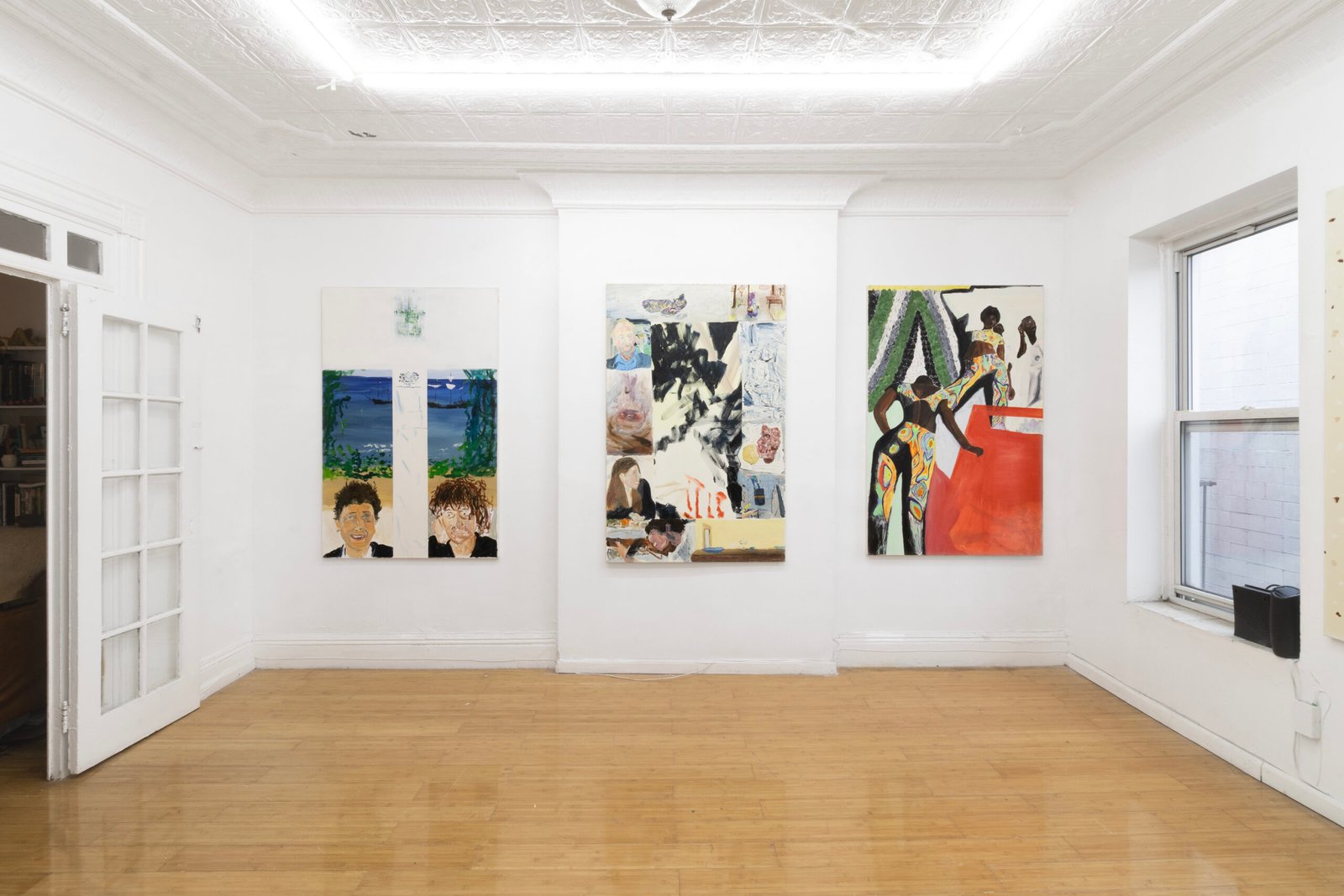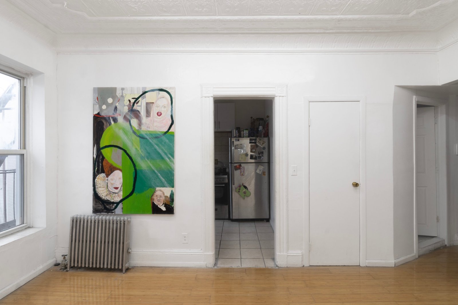 The show emulates moving through a haunted house of sensorial stimulations, where images and faces (Queen Elizabeth (Cate Blanchet)’s cakey porcelain skin, Jutta Koether’s fugly toe shoes, groovy dancers from Hype Williams’ 1998 ‘Belly’) shift in and out of focus, constantly unsettled. Each element holding equal importance, is masterfully and lovingly composed, but painted with disarming urgency. They’re stacked with oppressively bright opaque aquas and yellows that bring out something I can only describe as a mall-like faux brightness: the fakeness, the fluorescence, the dread.