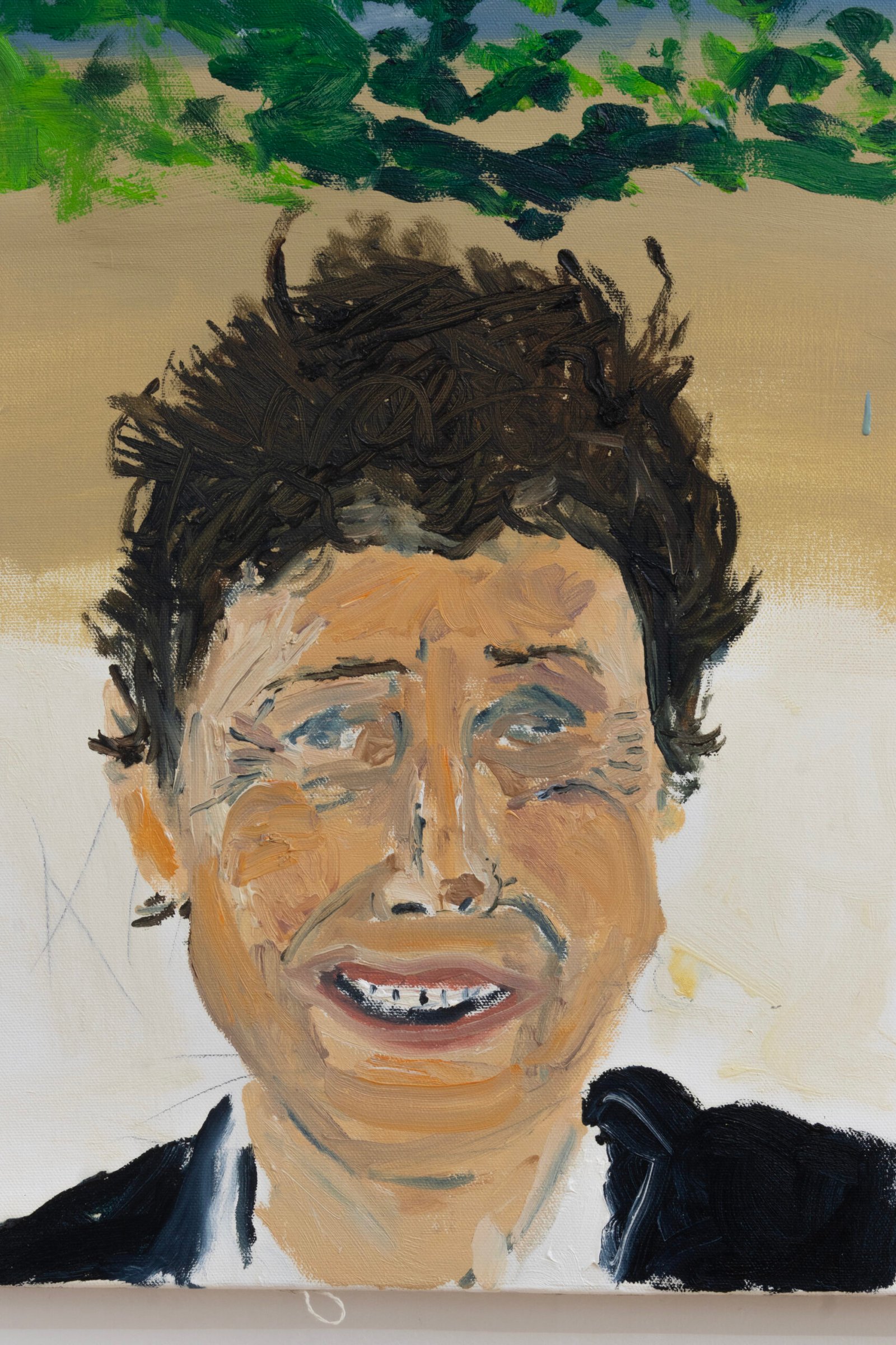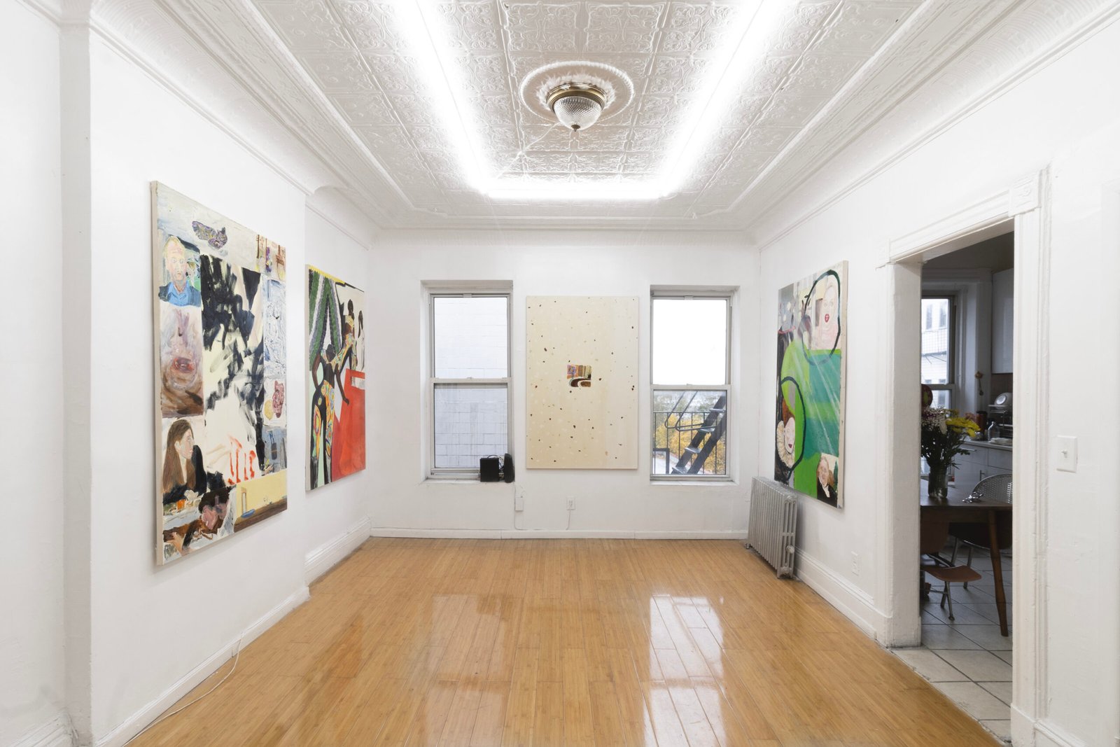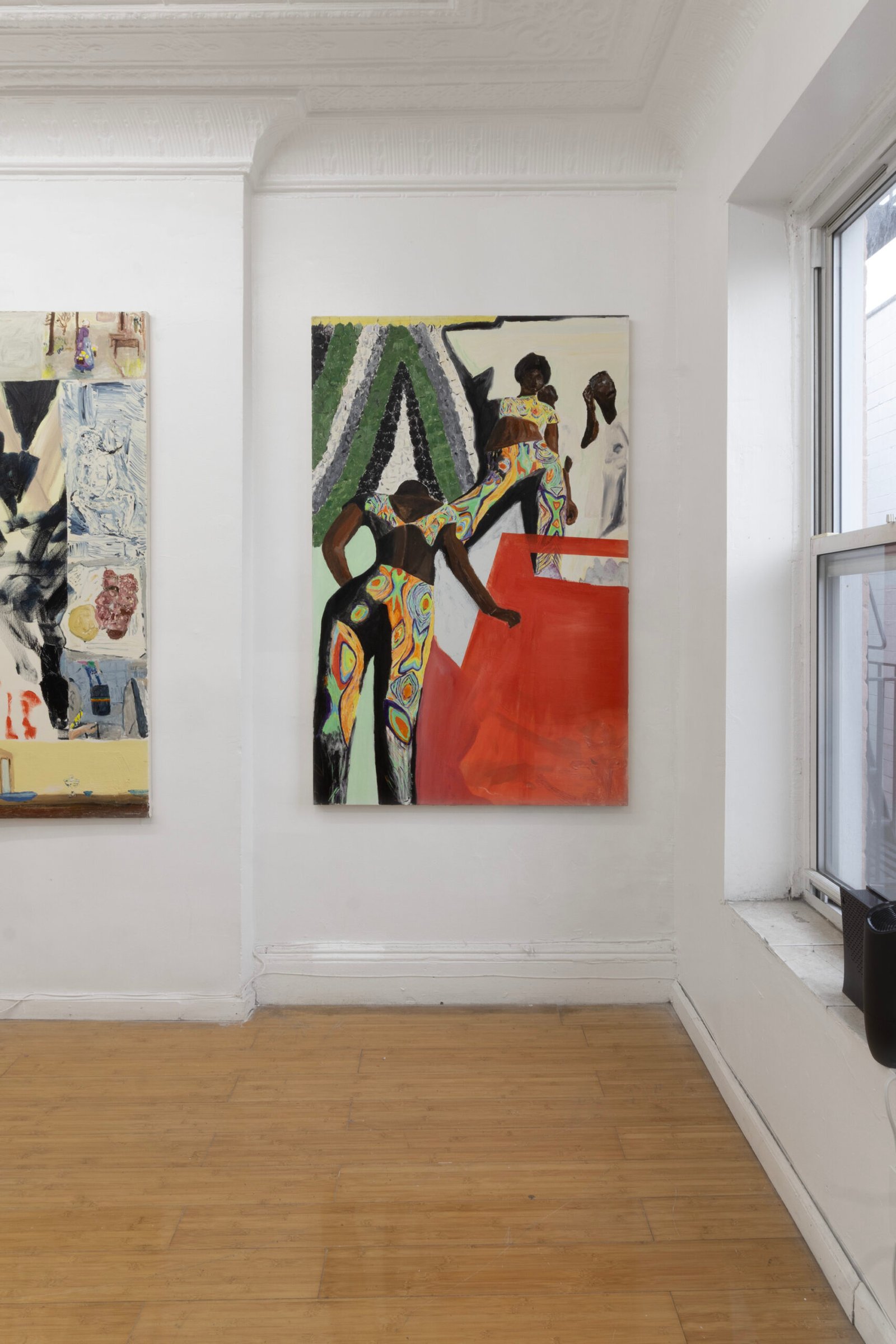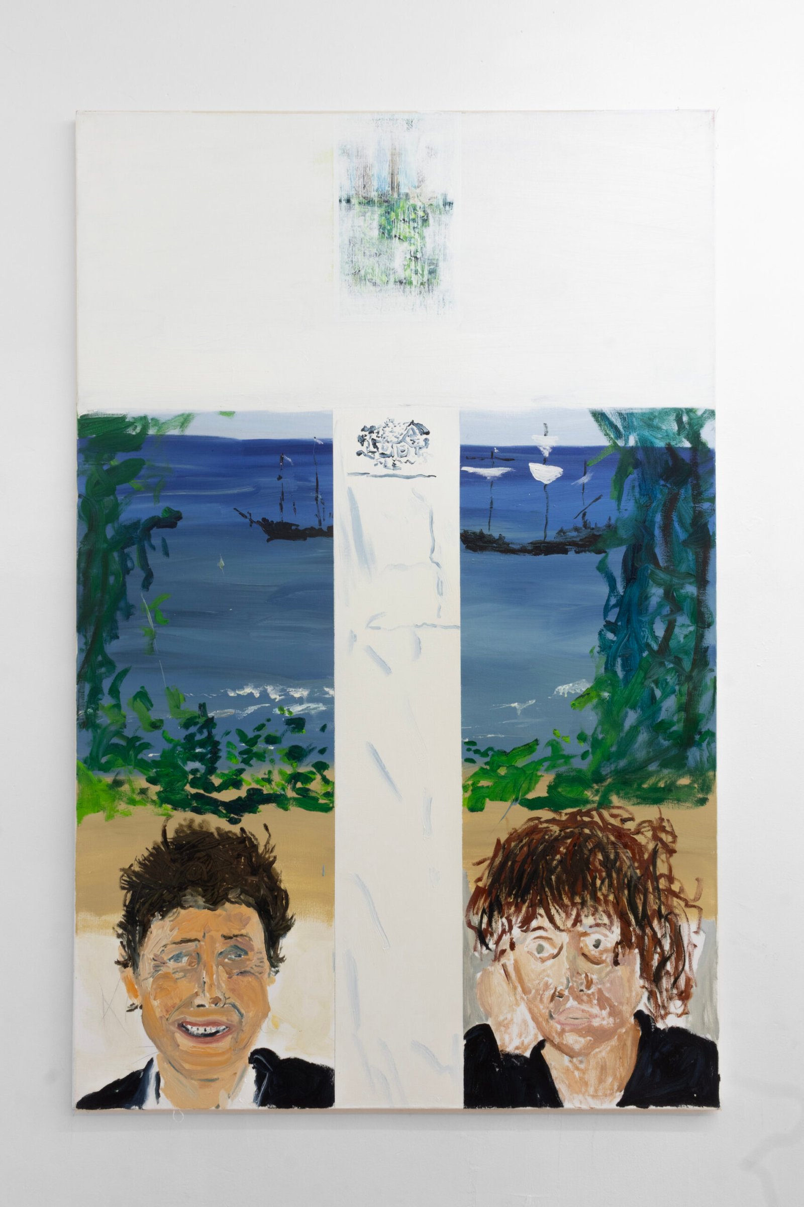 The show emulates moving through a haunted house of sensorial stimulations, where images and faces (Queen Elizabeth (Cate Blanchet)’s cakey porcelain skin, Jutta Koether’s fugly toe shoes, groovy dancers from Hype Williams’ 1998 ‘Belly’) shift in and out of focus, constantly unsettled. Each element holding equal importance, is masterfully and lovingly composed, but painted with disarming urgency. They’re stacked with oppressively bright opaque aquas and yellows that bring out something I can only describe as a mall-like faux brightness: the fakeness, the fluorescence, the dread.