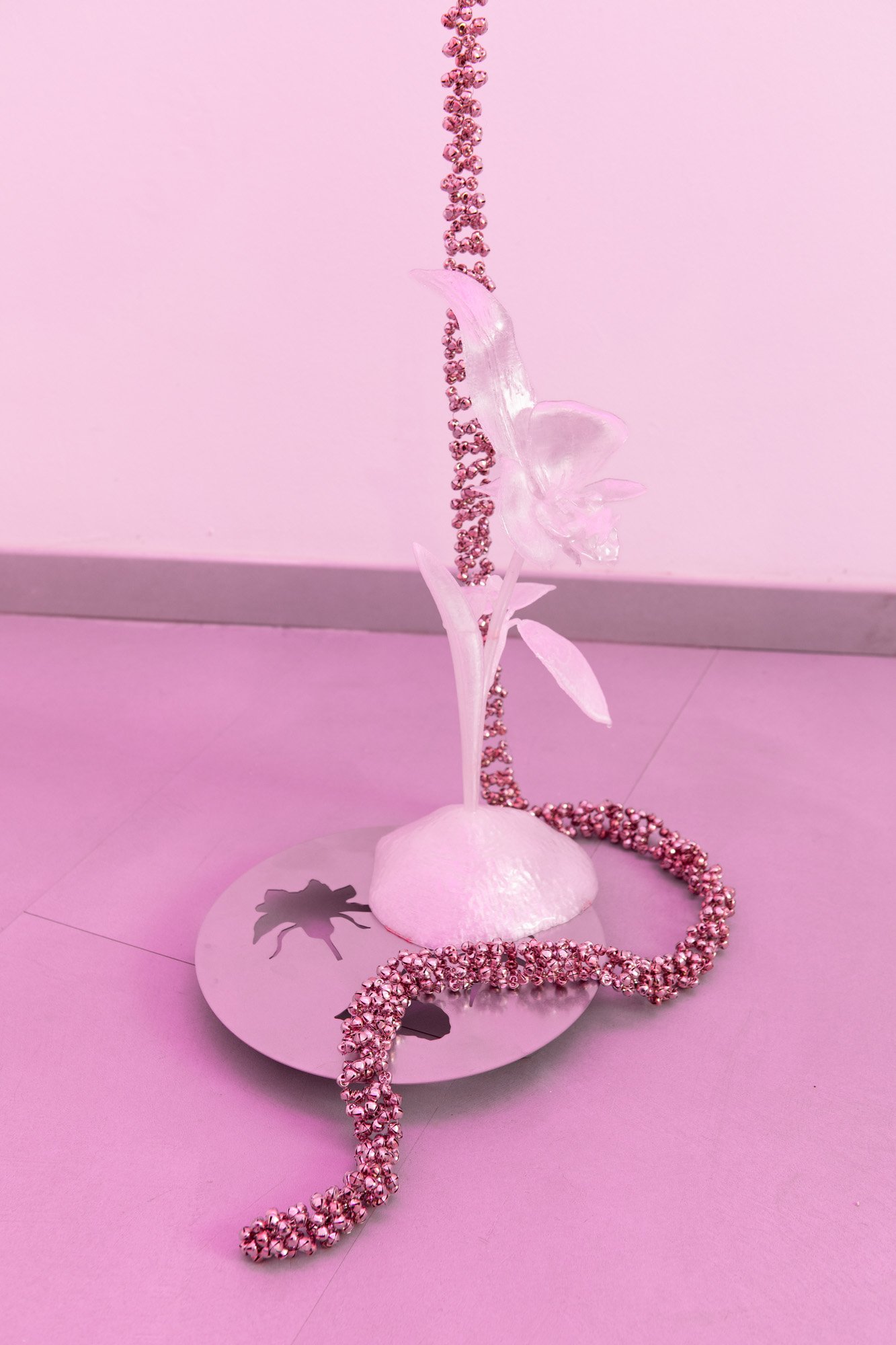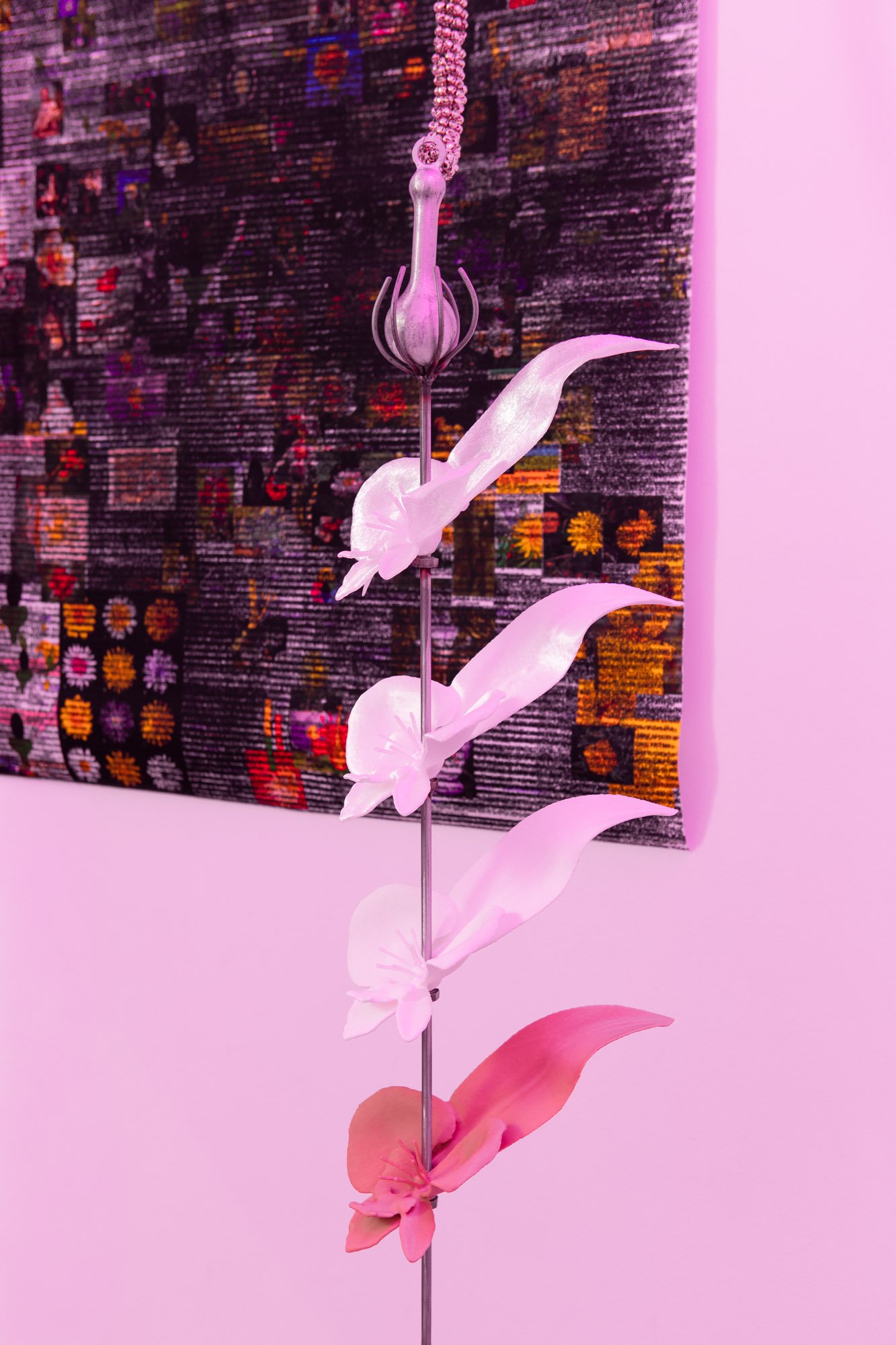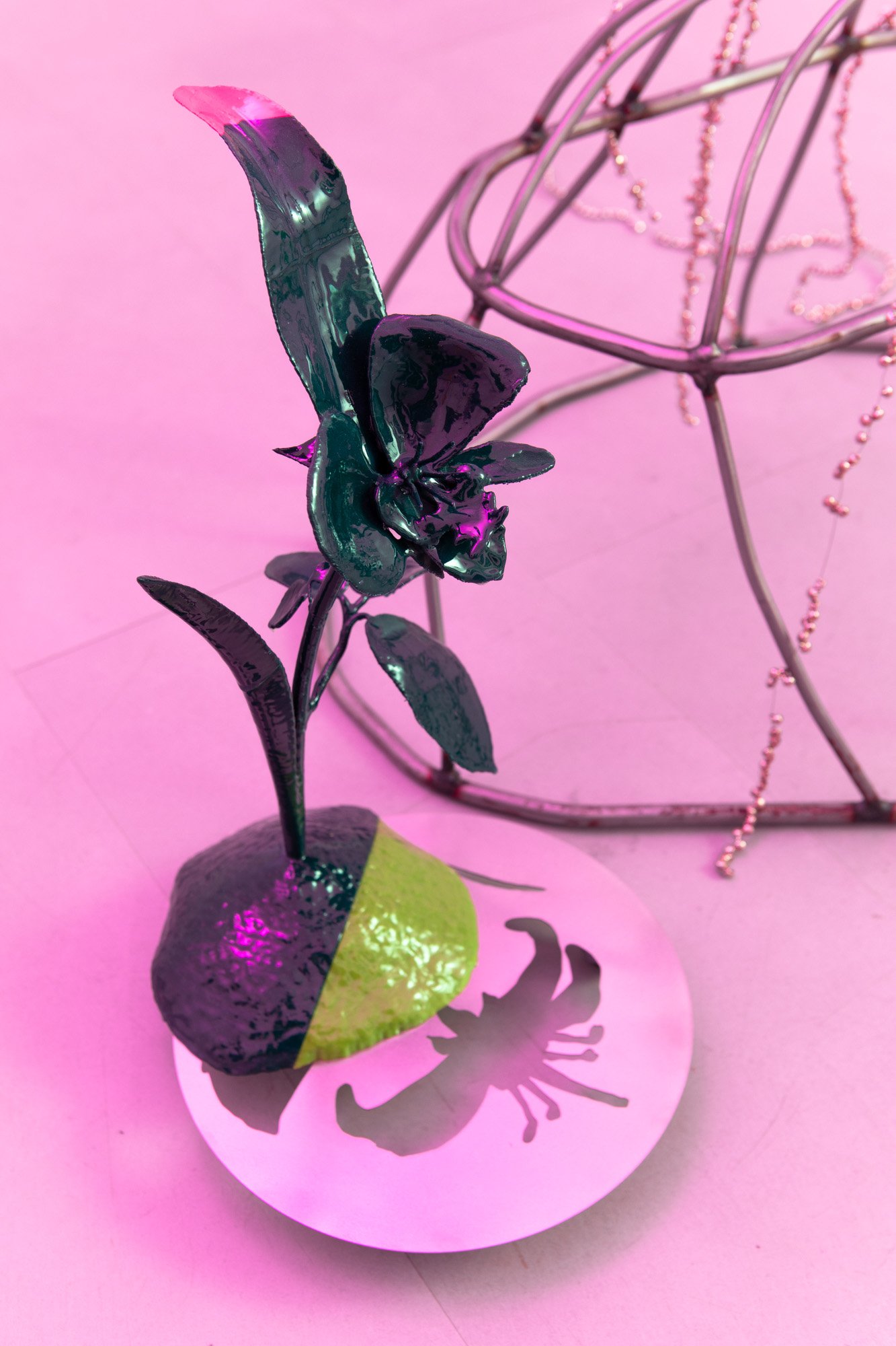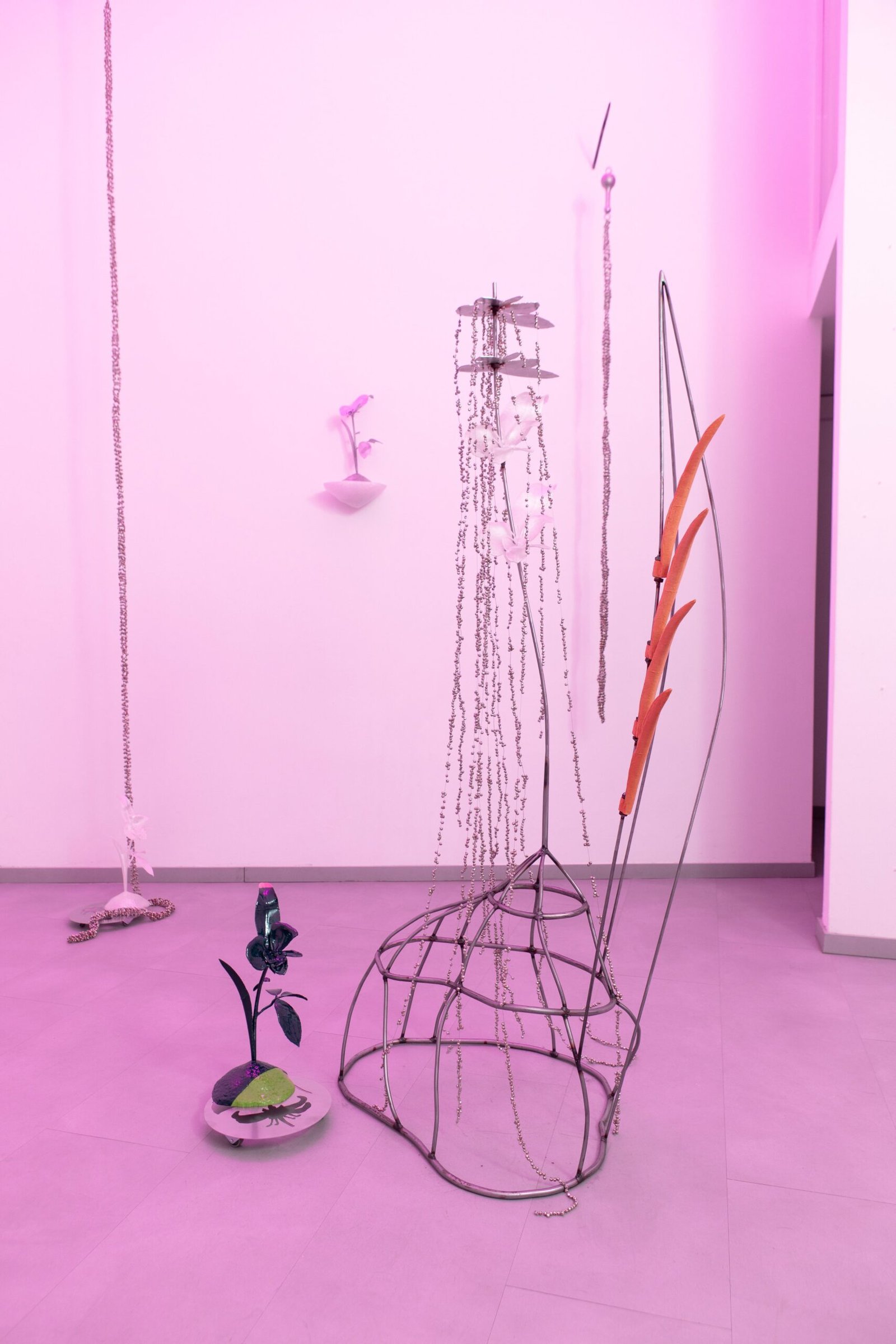 The exhibition unfolds as an immersive installation. Alongside the artist’s 3D printed colourful flowers, the exhibition also presents metal flowers, metal structures and ceramic leaves, opening new directions in her material practice. The combination of light fragile surfaces and heavy supporting metal frameworks evokes gestures of care, fixing and holding. Small bells attached to metal elements add a gentle acoustic layer to the space, where visual and sonic experience shape perception together.
