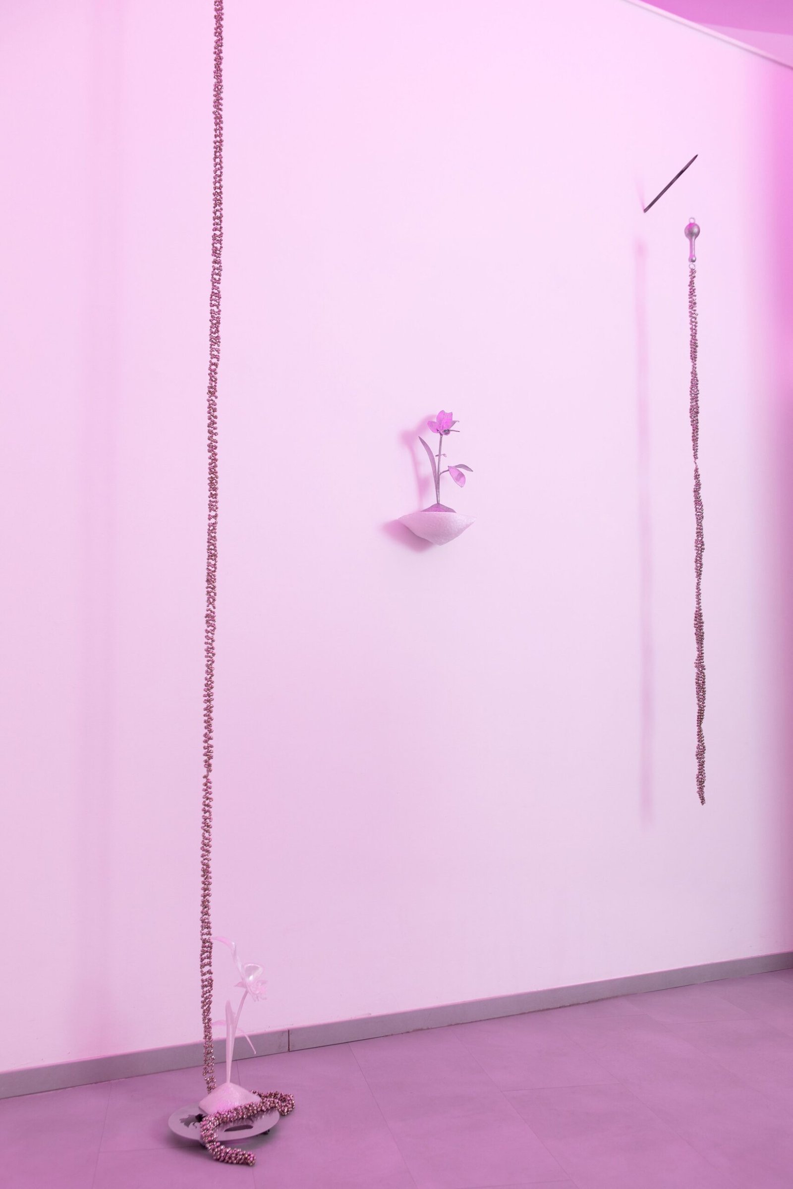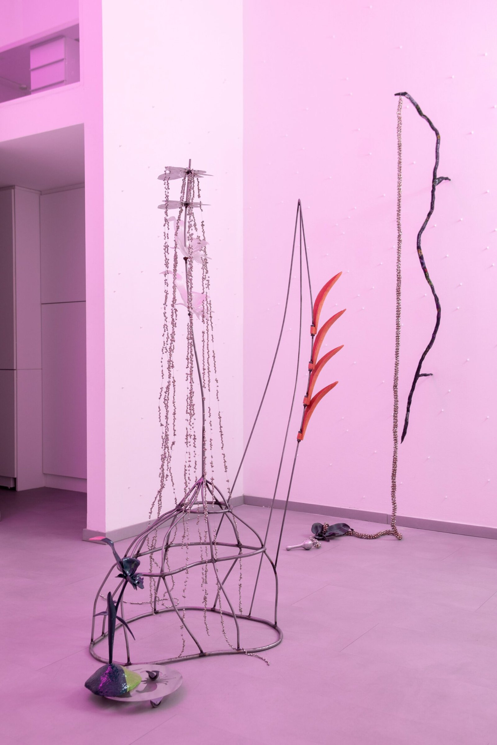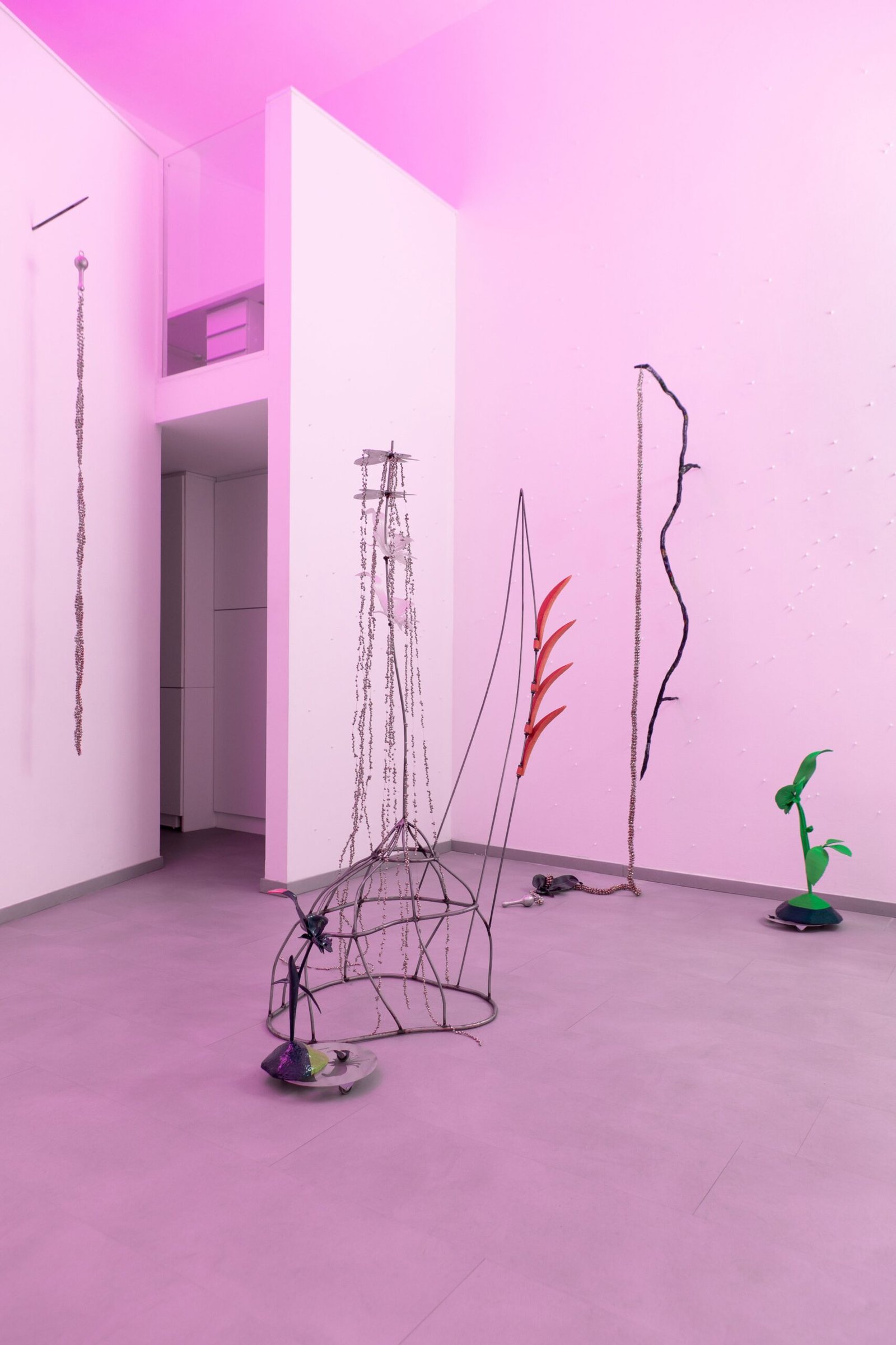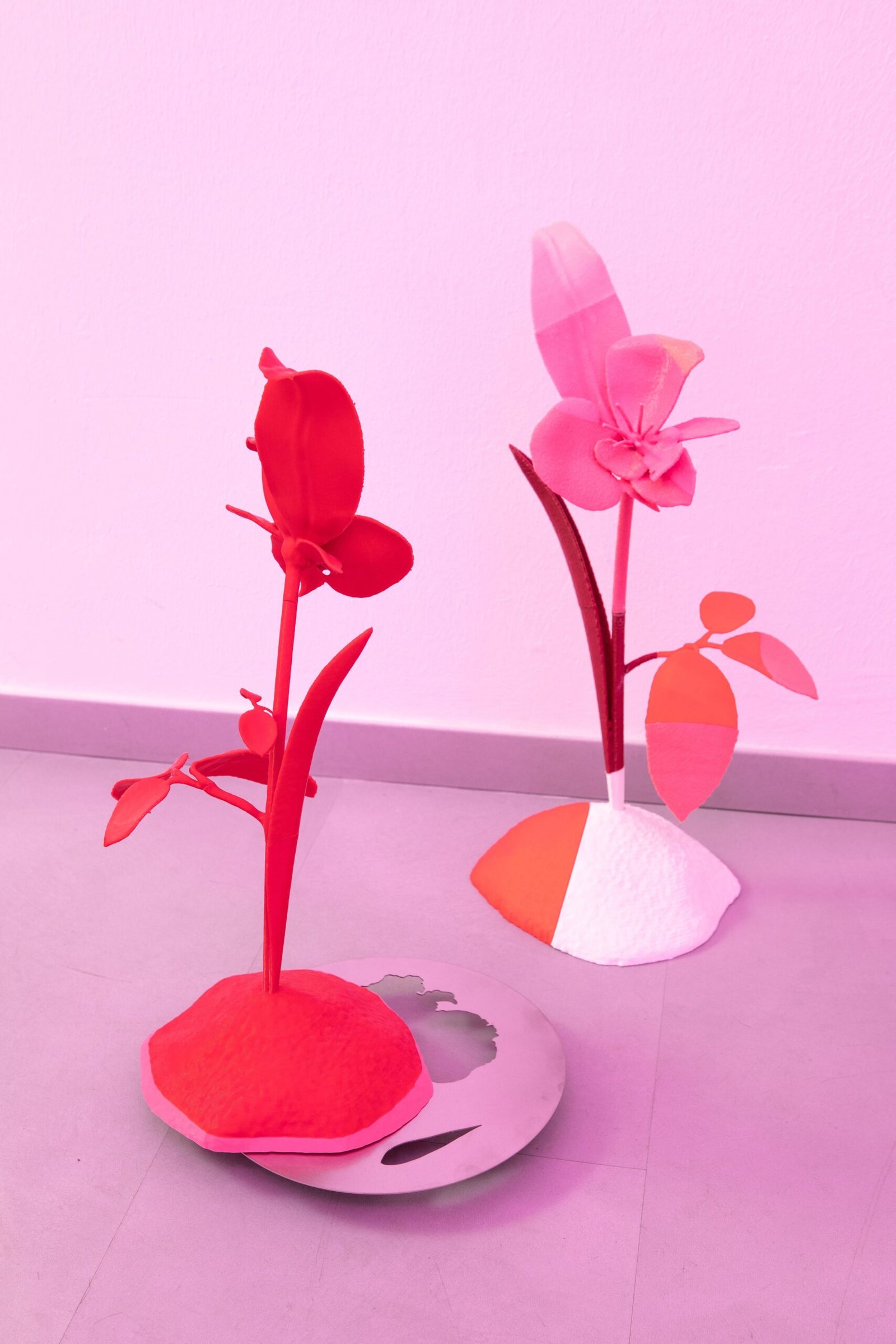 The exhibition unfolds as an immersive installation. Alongside the artist’s 3D printed colourful flowers, the exhibition also presents metal flowers, metal structures and ceramic leaves, opening new directions in her material practice. The combination of light fragile surfaces and heavy supporting metal frameworks evokes gestures of care, fixing and holding. Small bells attached to metal elements add a gentle acoustic layer to the space, where visual and sonic experience shape perception together.