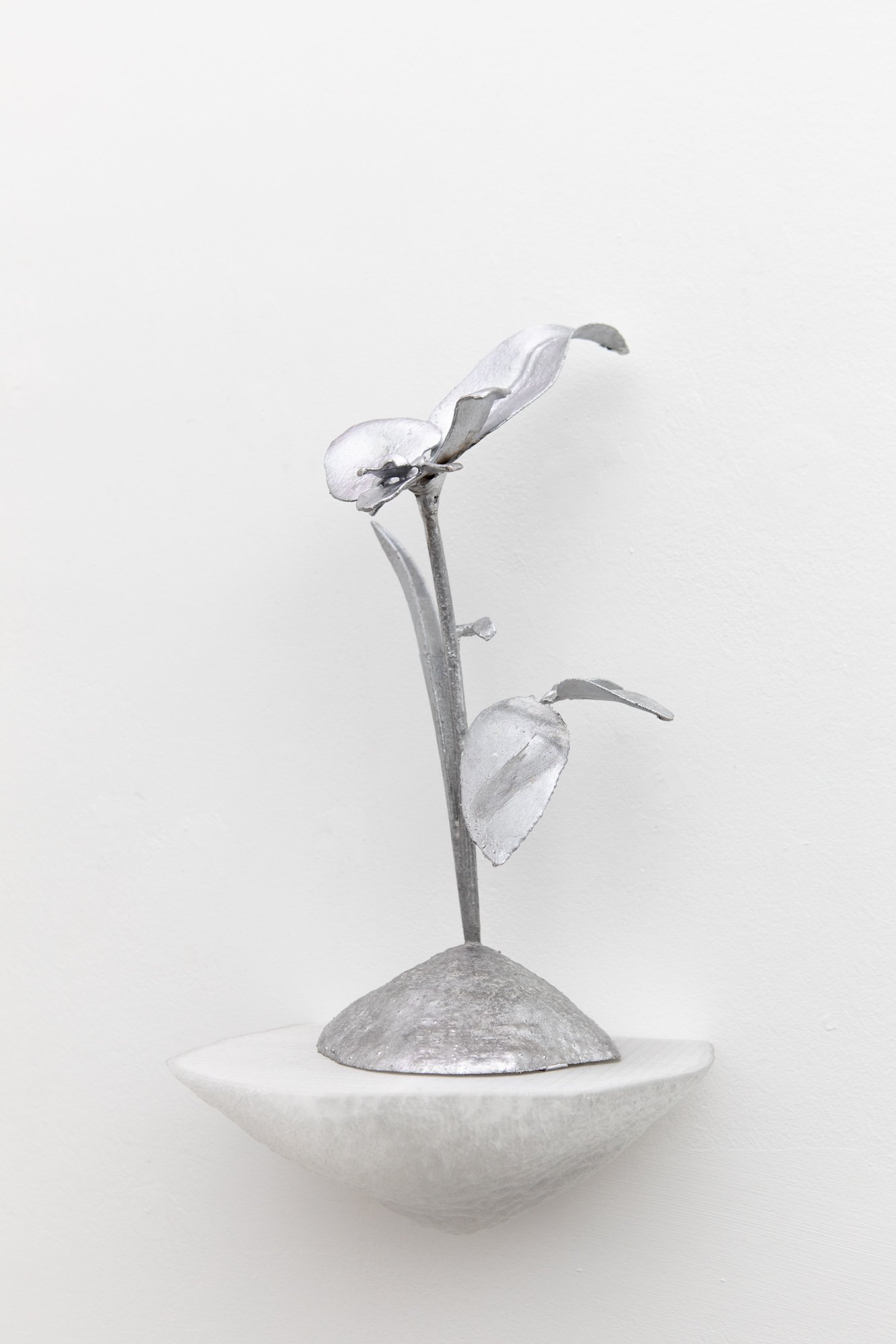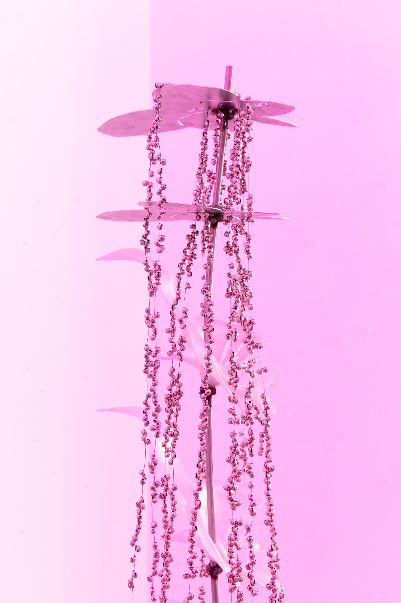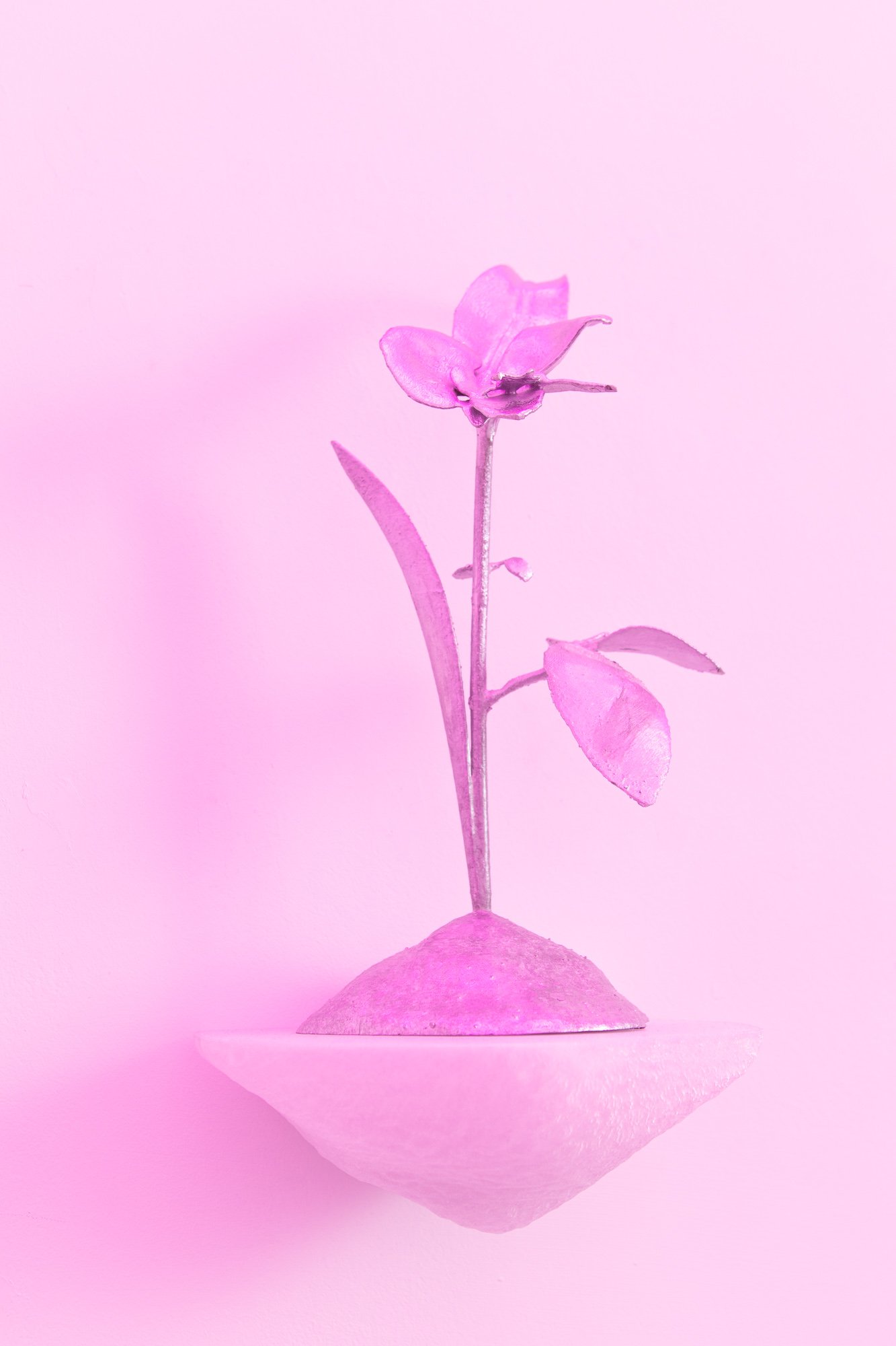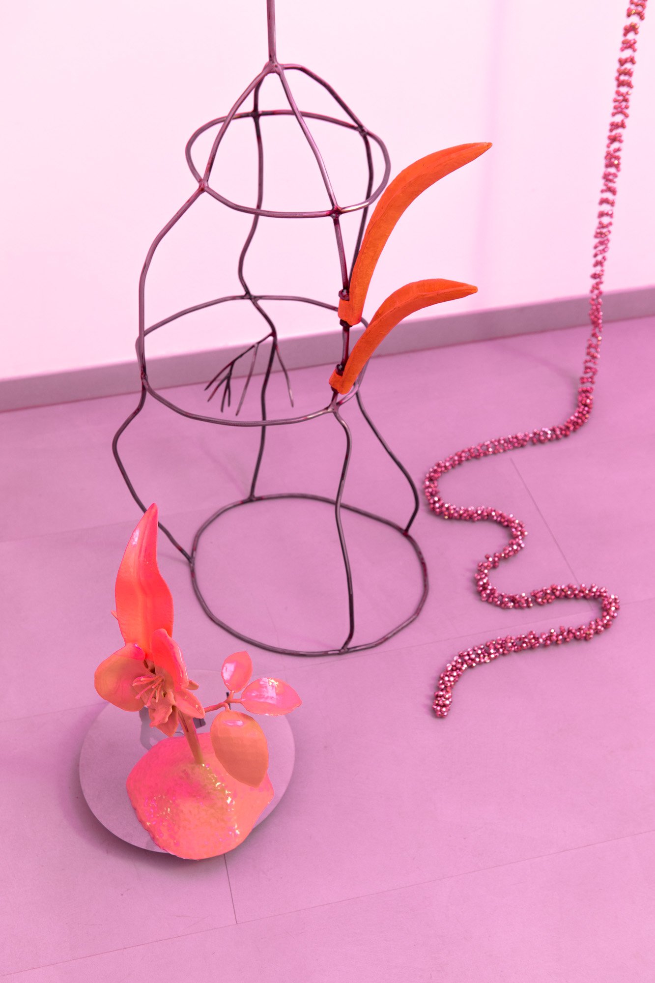 The exhibition unfolds as an immersive installation. Alongside the artist’s 3D printed colourful flowers, the exhibition also presents metal flowers, metal structures and ceramic leaves, opening new directions in her material practice. The combination of light fragile surfaces and heavy supporting metal frameworks evokes gestures of care, fixing and holding. Small bells attached to metal elements add a gentle acoustic layer to the space, where visual and sonic experience shape perception together.