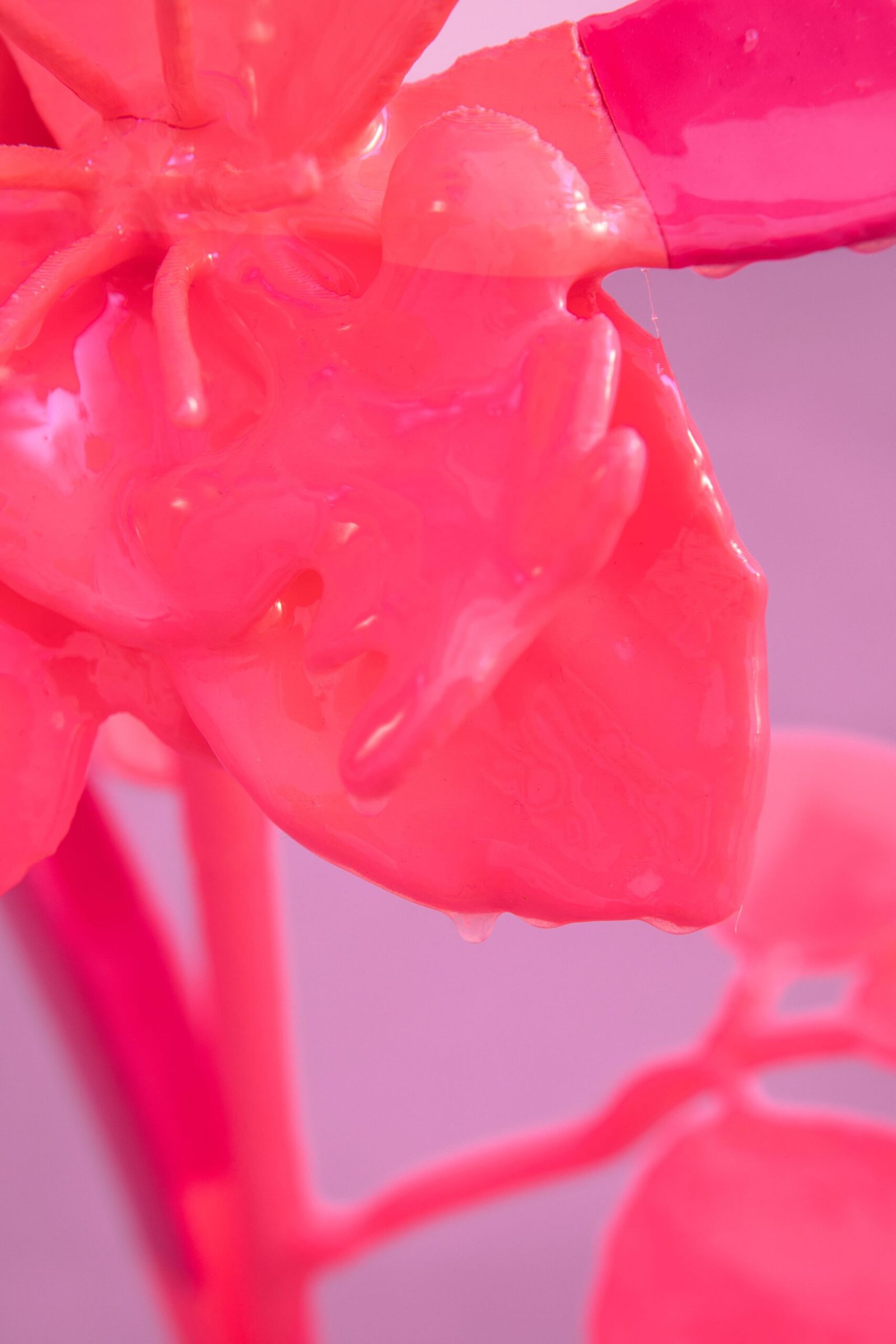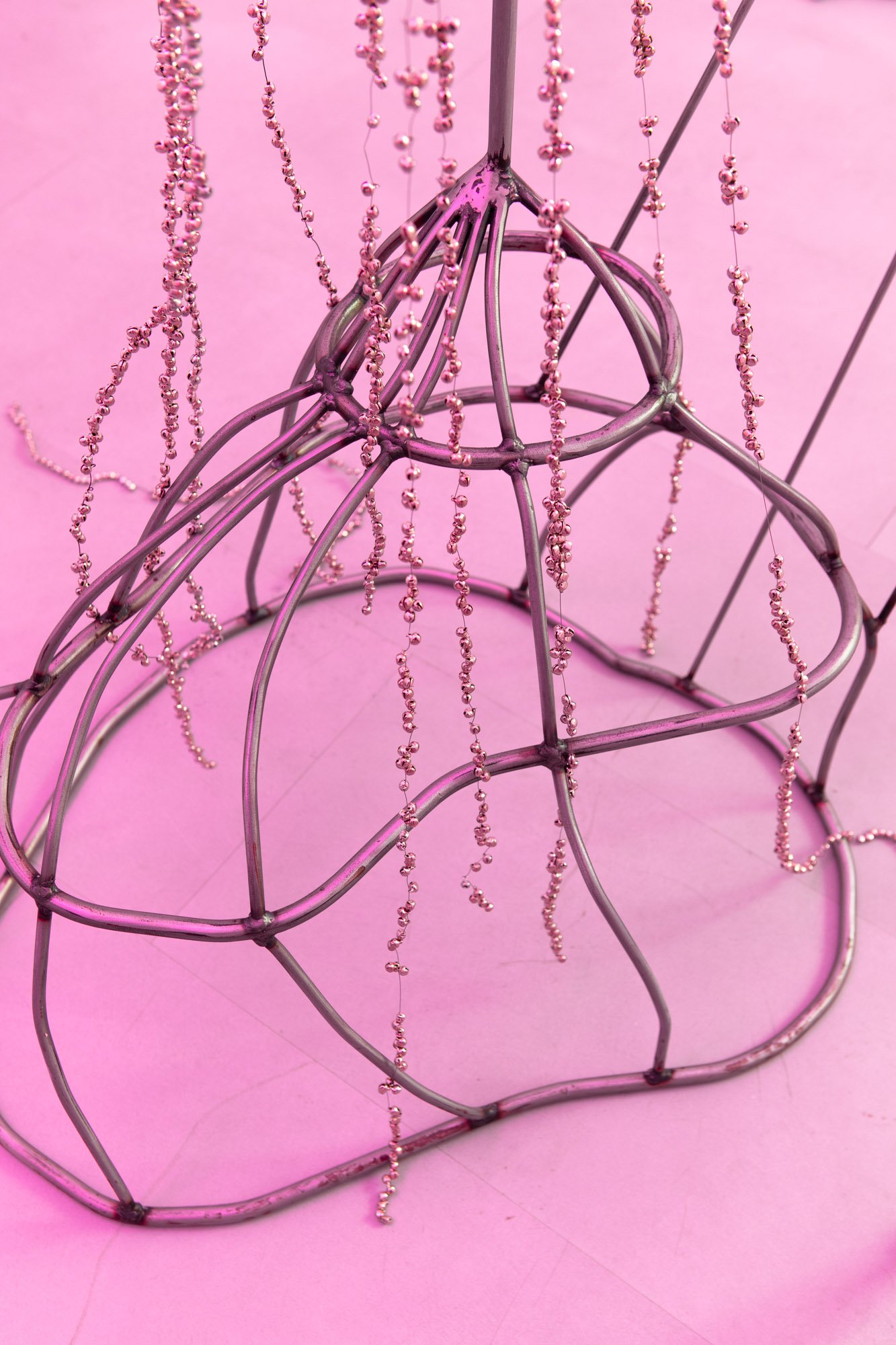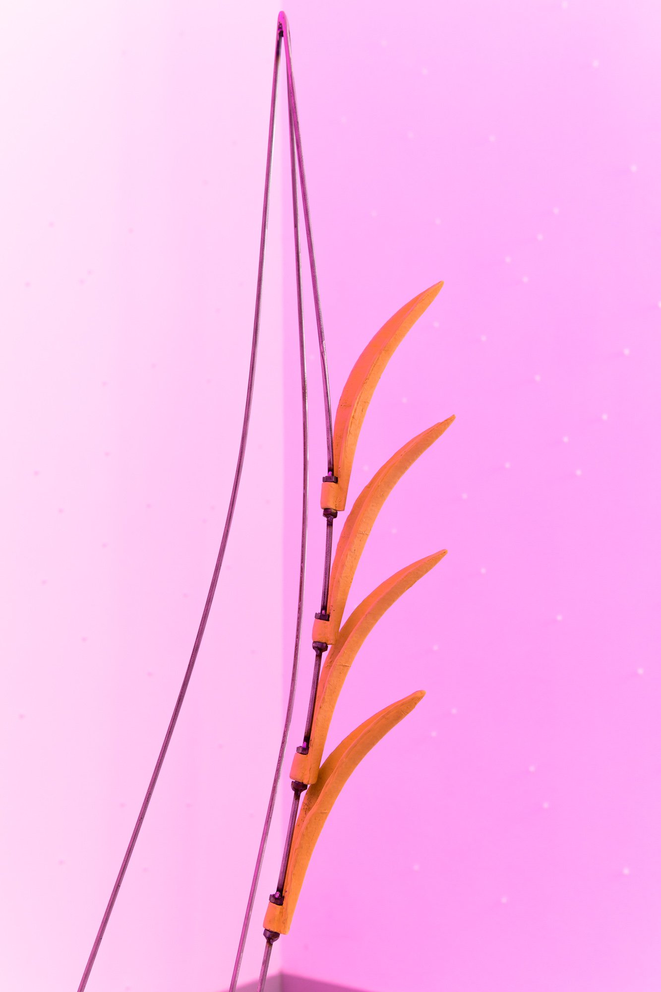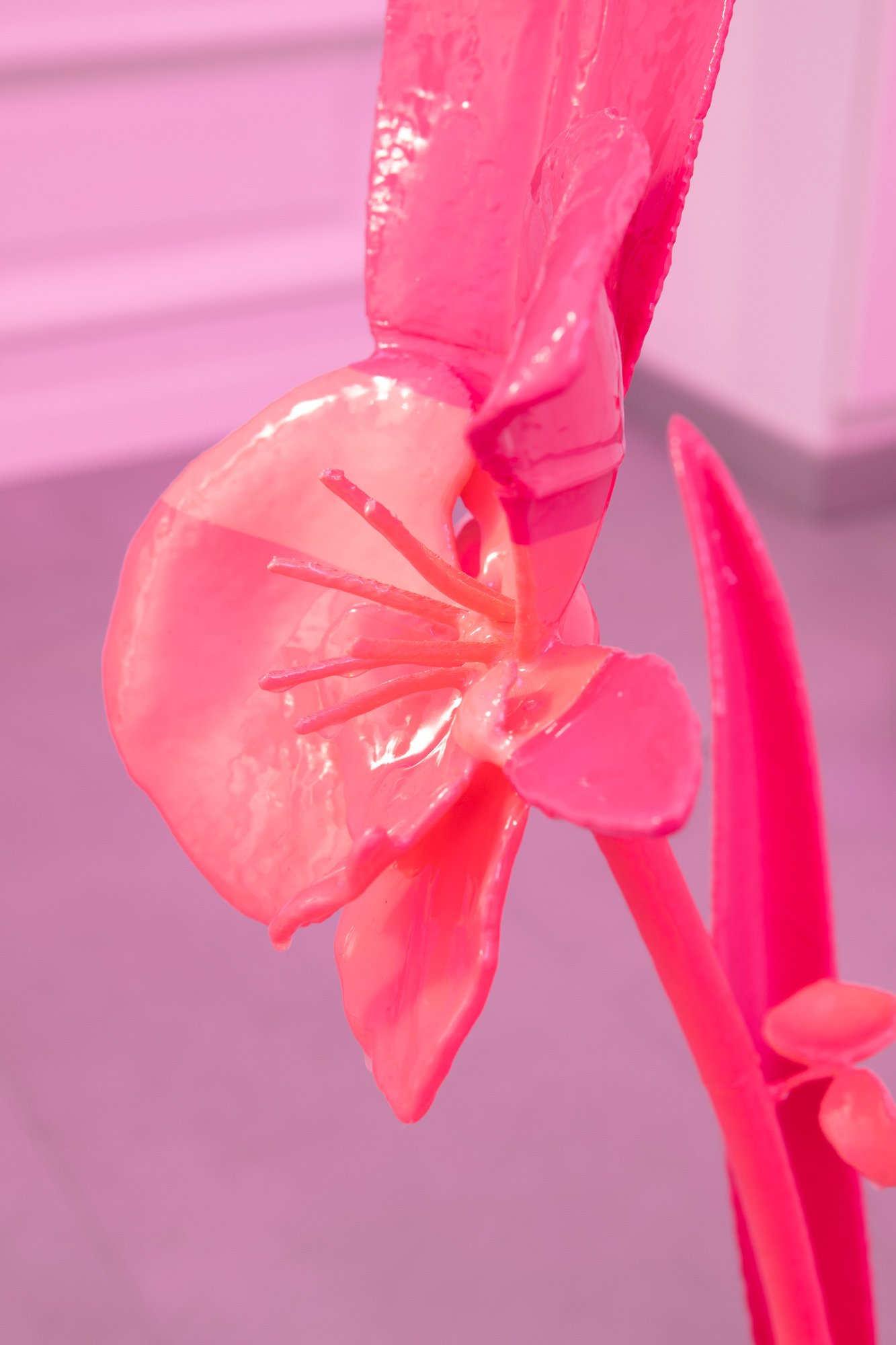 The exhibition unfolds as an immersive installation. Alongside the artist’s 3D printed colourful flowers, the exhibition also presents metal flowers, metal structures and ceramic leaves, opening new directions in her material practice. The combination of light fragile surfaces and heavy supporting metal frameworks evokes gestures of care, fixing and holding. Small bells attached to metal elements add a gentle acoustic layer to the space, where visual and sonic experience shape perception together.