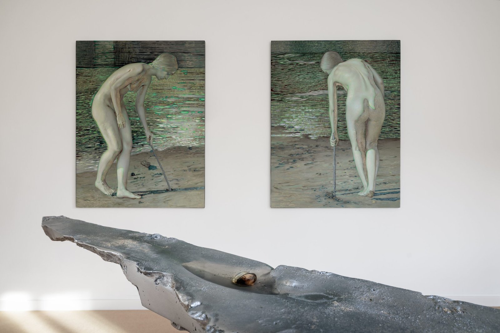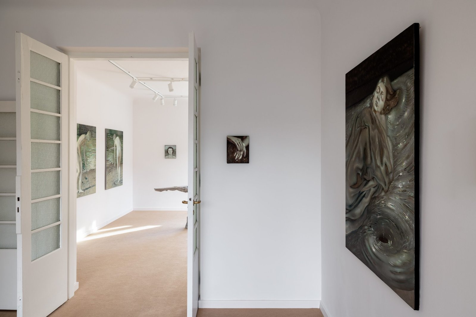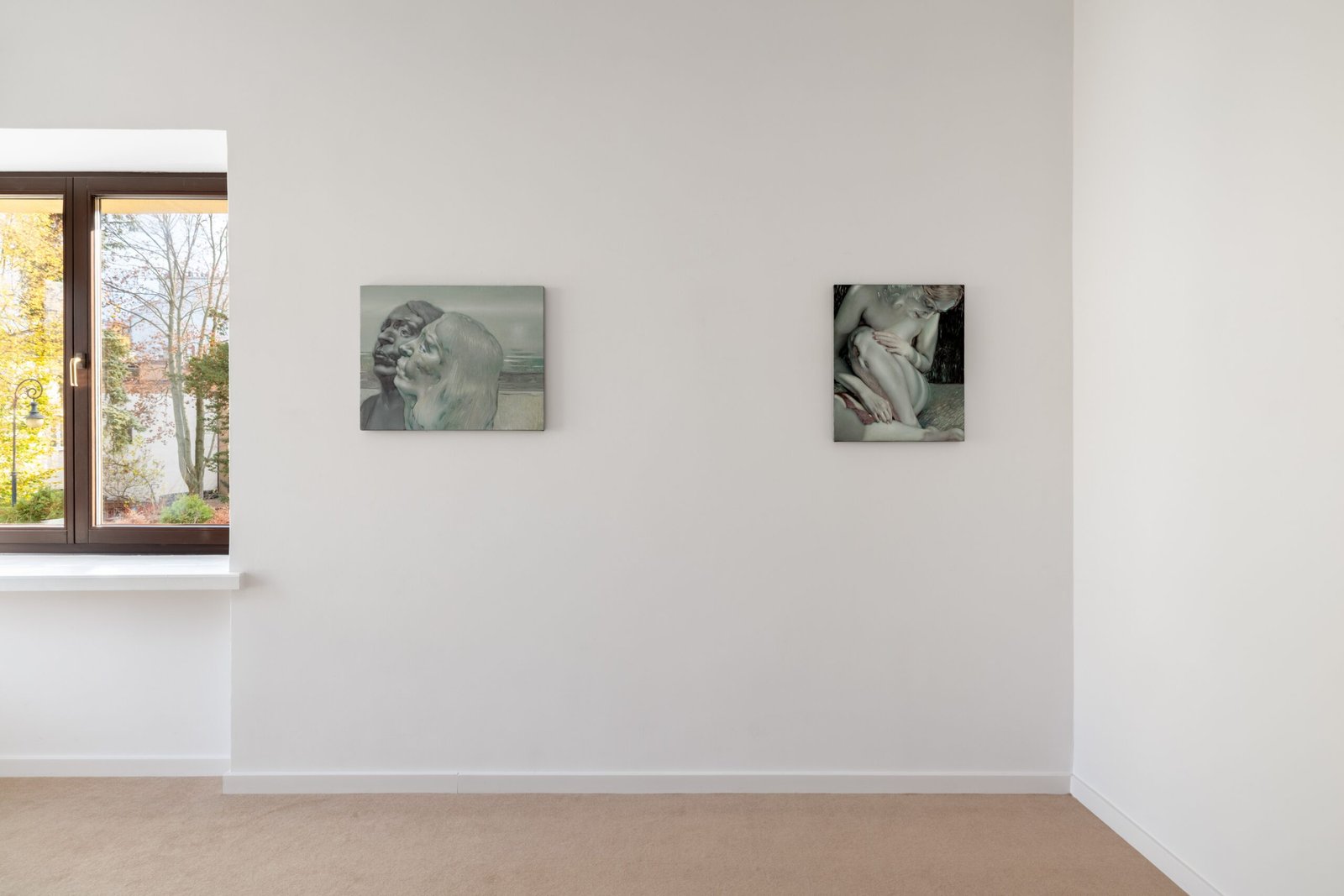 Tymińska’s canvases capture the moment when vision softens, when the senses are quietly reprogrammed and contours dissolve. Movement and rhythm begin to outweigh form. It is a state of suspension, where thought loses its edge, the gaze drifts, and consciousness drifts through quiet currents. Her paintings reconstruct this altered mode of perception, freed from everyday order. Hence their dreamlike atmosphere: cool silvery greens, moonlit tones, an air of stillness. From this luminous haze emerge female figures with metallic, phosphorescent skin, their gestures and identities resisting clear definition. They are not separate from their surroundings but absorbed within them, blending with the landscape until all boundaries fade. Body and space exist on equal terms. In her vision, corporeality does not stand apart from nature but confirms belonging to it.