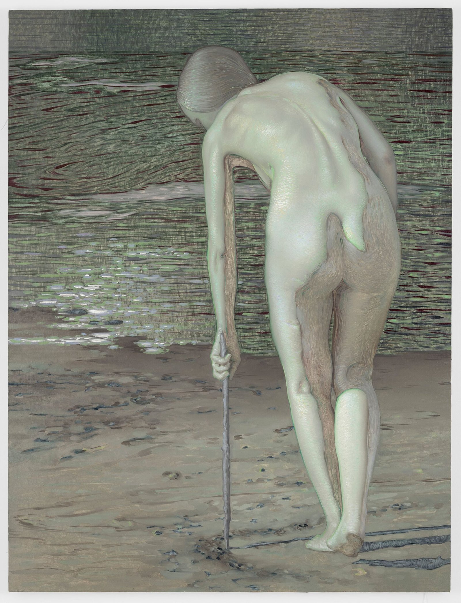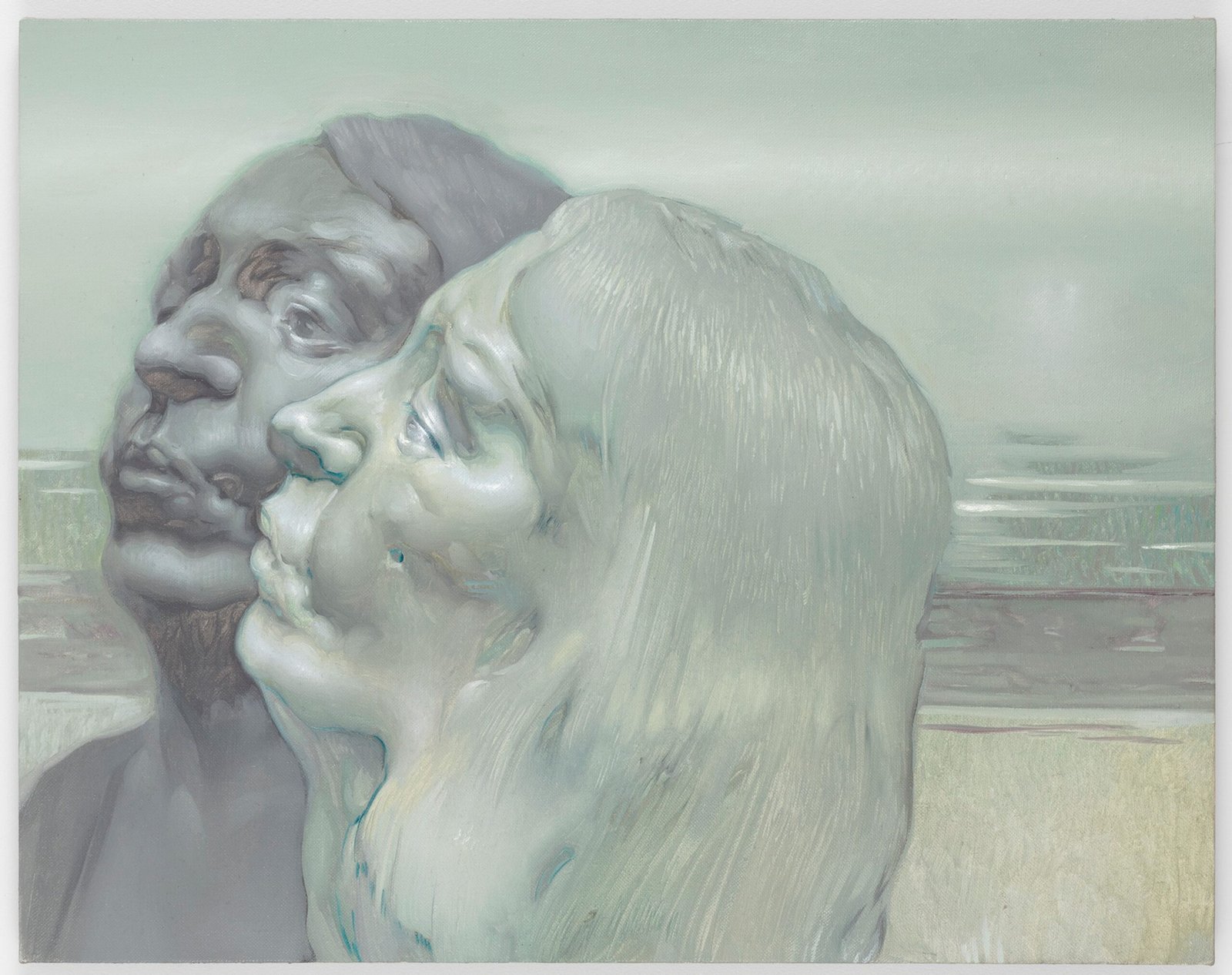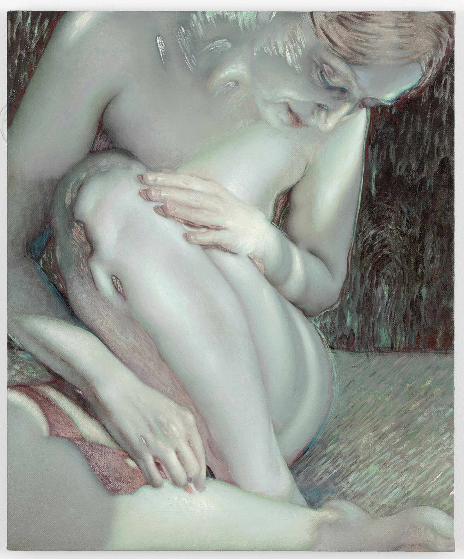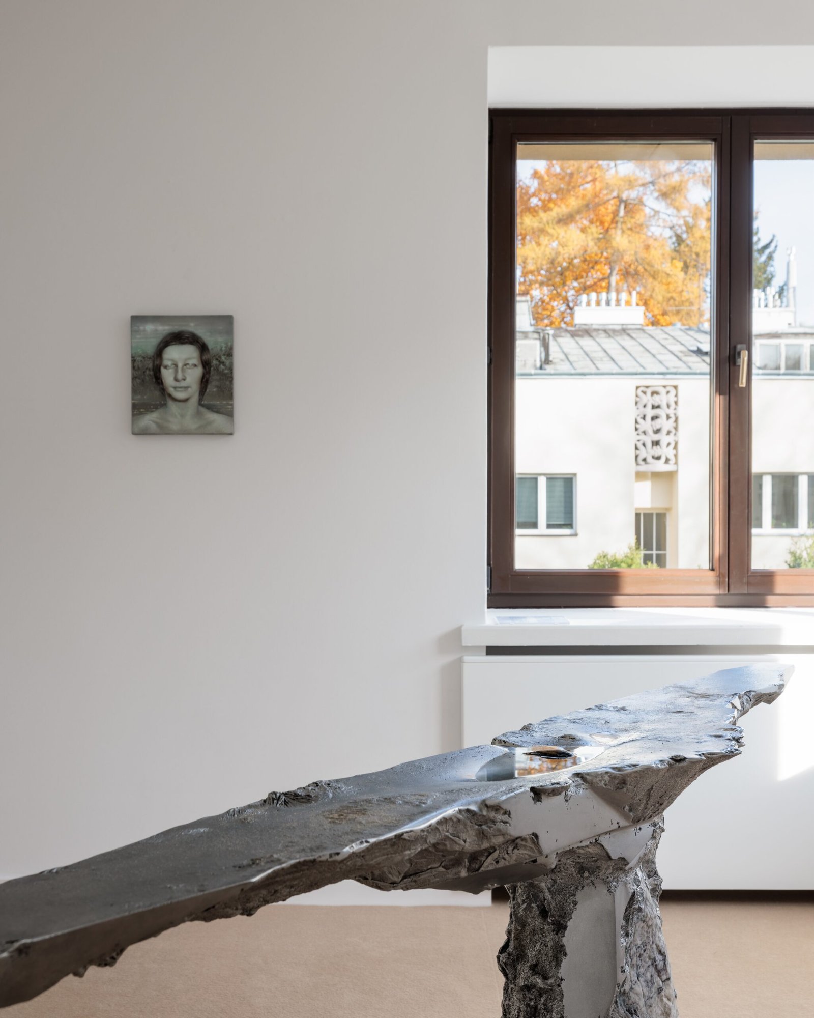 Tymińska’s canvases capture the moment when vision softens, when the senses are quietly reprogrammed and contours dissolve. Movement and rhythm begin to outweigh form. It is a state of suspension, where thought loses its edge, the gaze drifts, and consciousness drifts through quiet currents. Her paintings reconstruct this altered mode of perception, freed from everyday order. Hence their dreamlike atmosphere: cool silvery greens, moonlit tones, an air of stillness. From this luminous haze emerge female figures with metallic, phosphorescent skin, their gestures and identities resisting clear definition. They are not separate from their surroundings but absorbed within them, blending with the landscape until all boundaries fade. Body and space exist on equal terms. In her vision, corporeality does not stand apart from nature but confirms belonging to it.