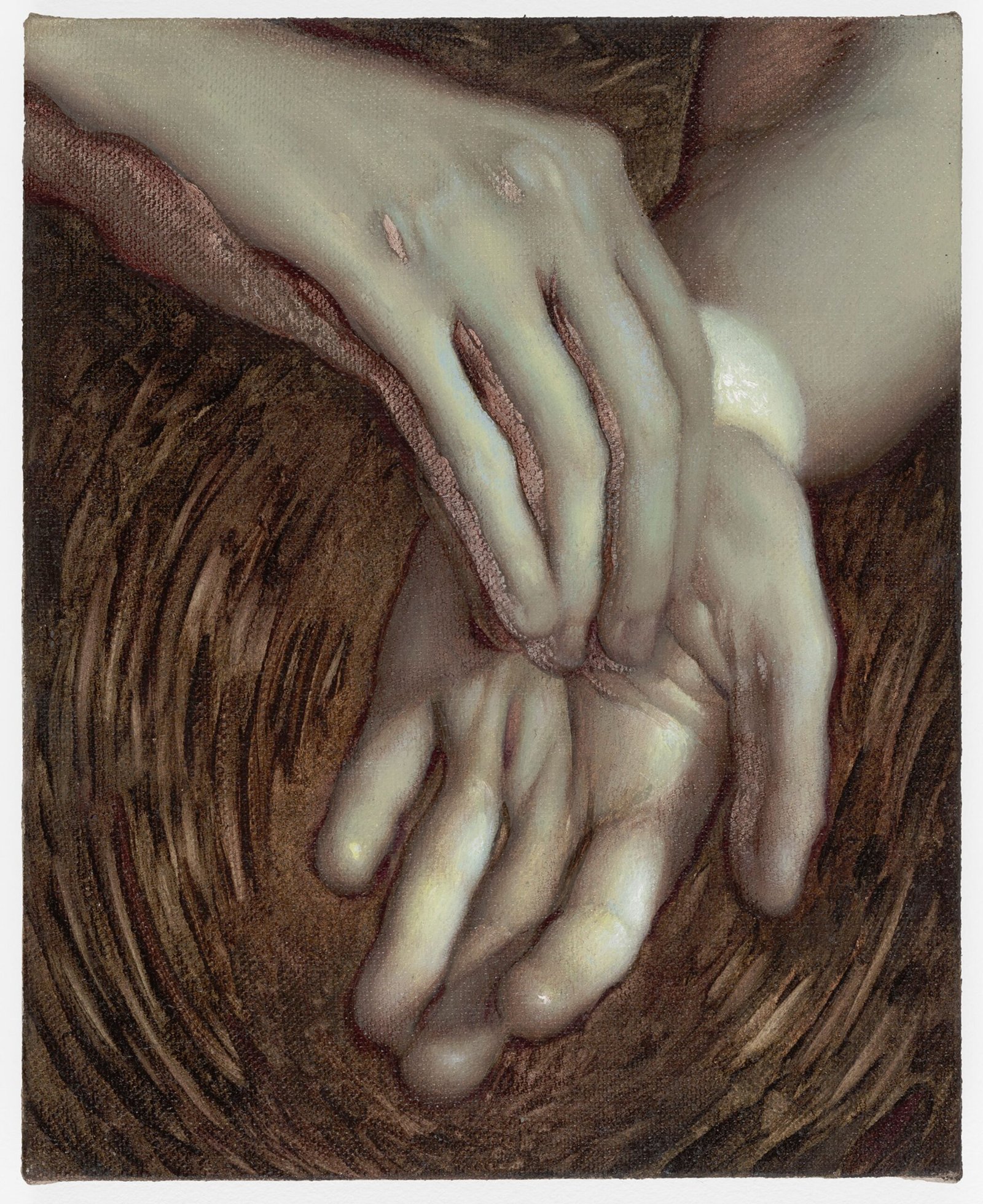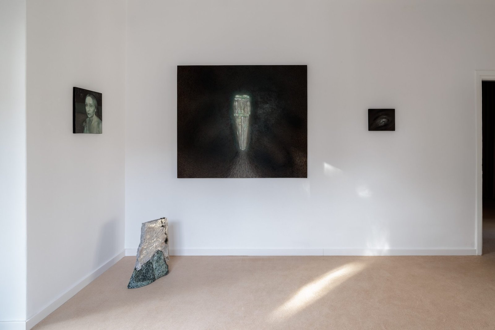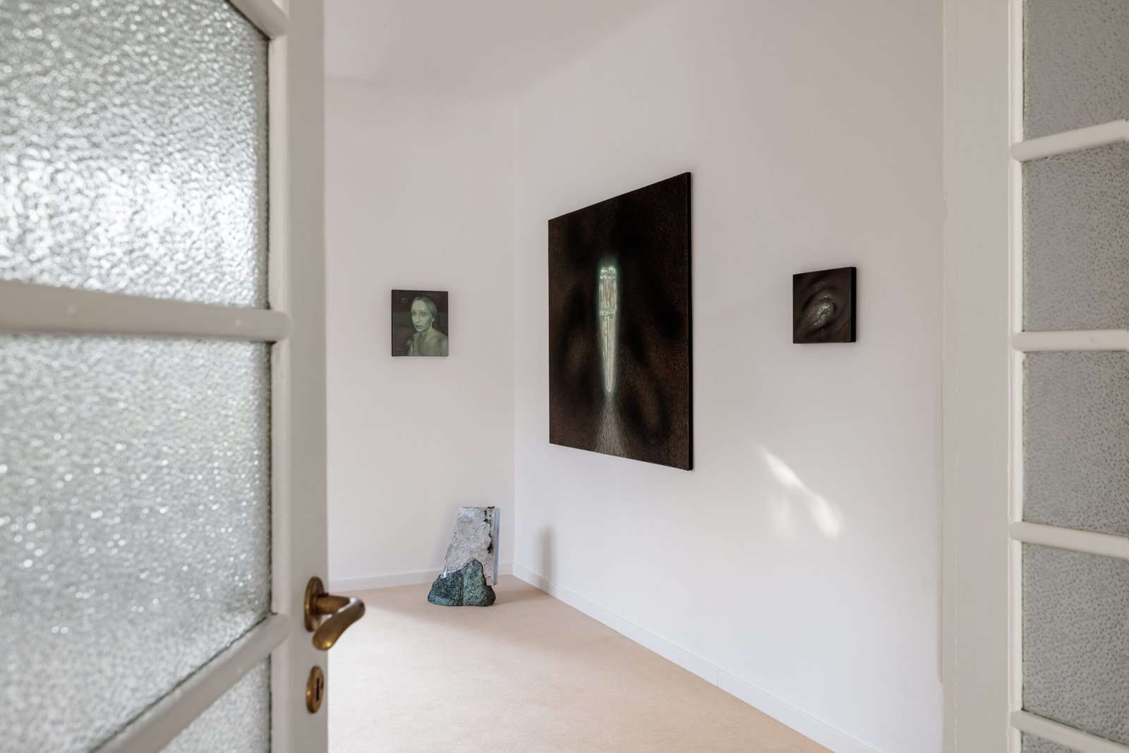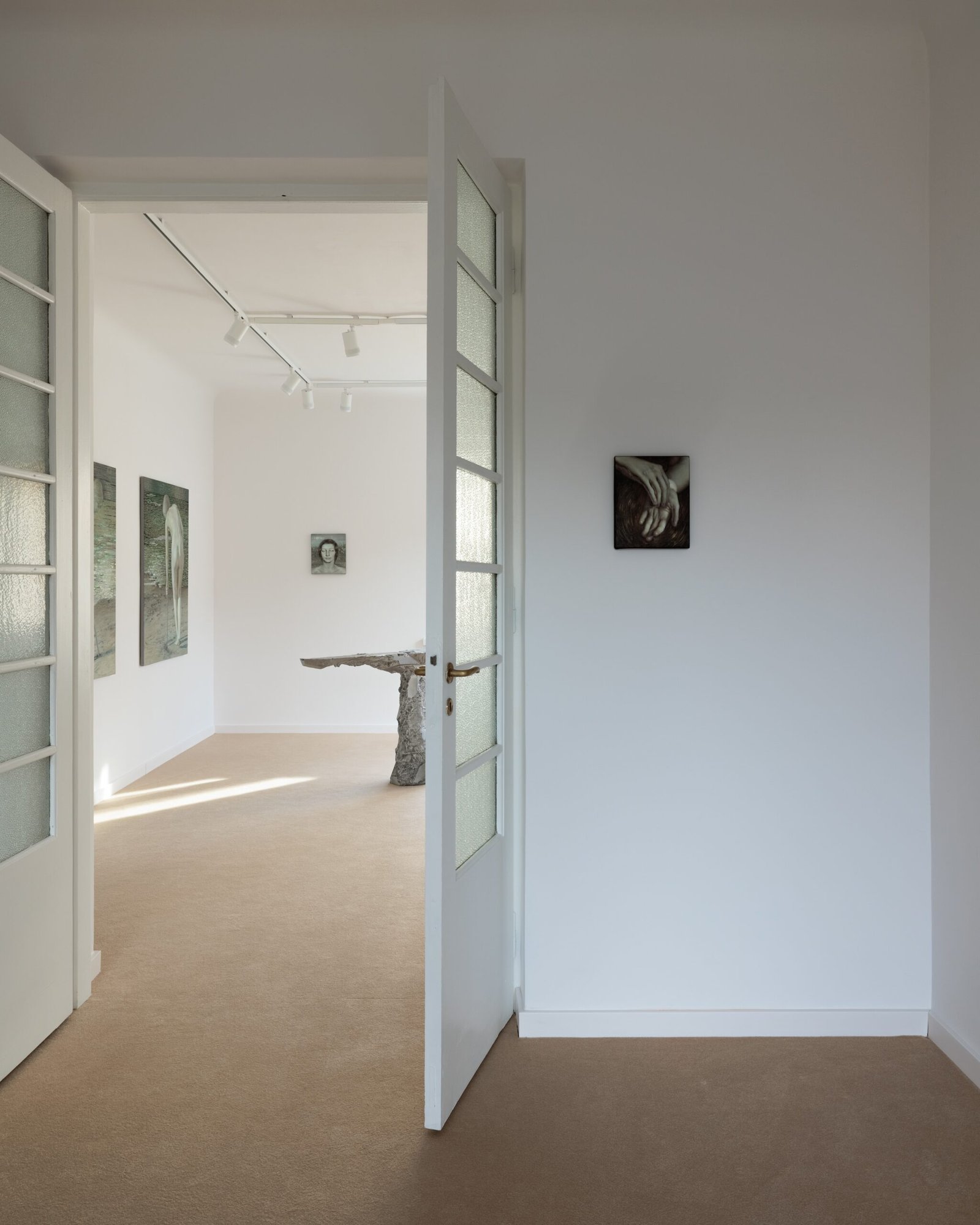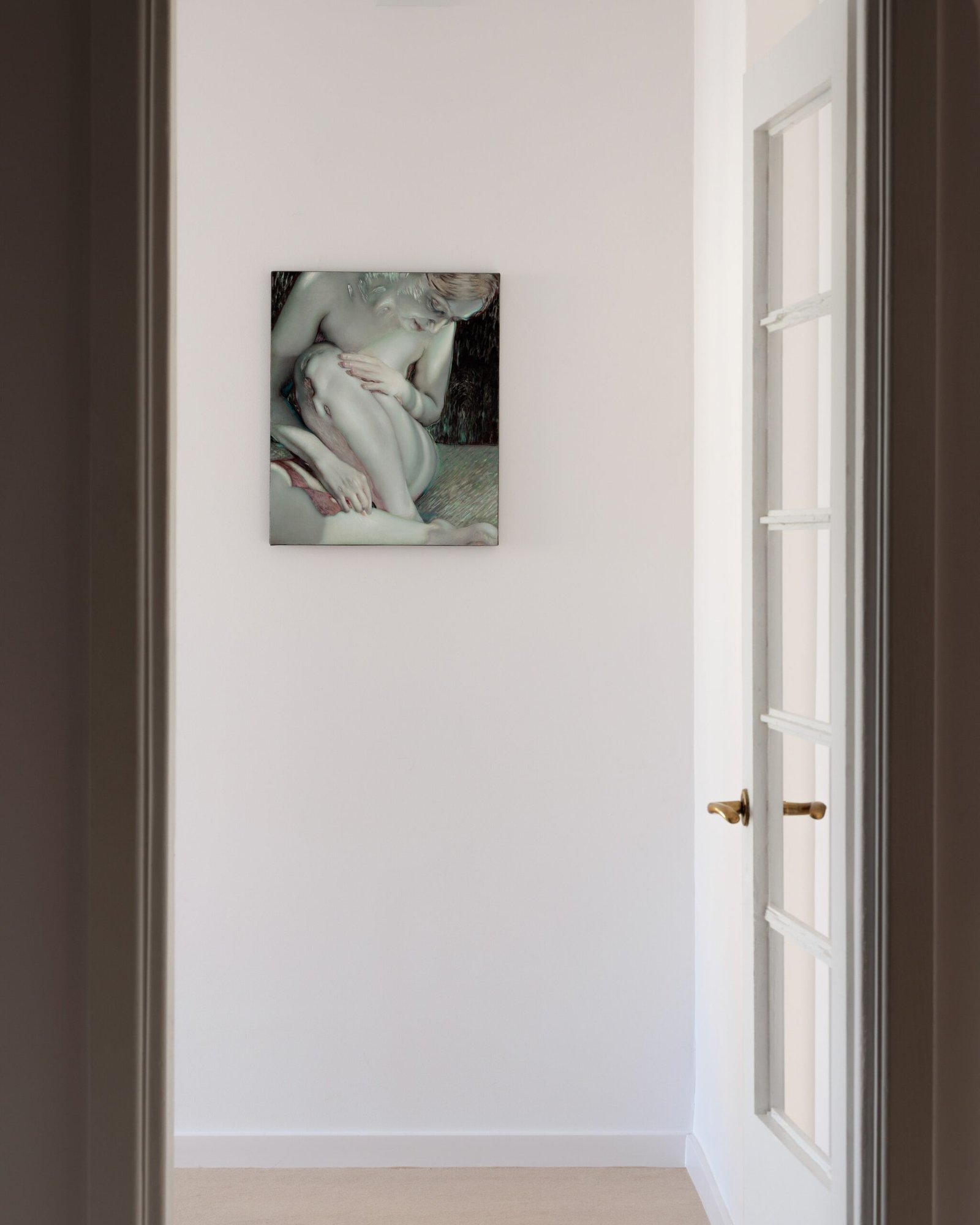 Through these works echoes of old myths return – an intuitive turn toward primordial relations with the world. The artist draws upon archaic figures of femininity, invoking ancient bonds with natural forces; her protagonists partake in rituals of passage. They are priestesses, witches, guardians of thresholds, tracing protective circles in the sand. The line drawn across the ground, appearing in one of her paintings, may mark what is close or seek to sense the boundary. This ritual repeats itself in her process – the slow, focused movement that gradually builds an inner order. Through it she summons her own world, where painting becomes a way of feeling and cherishing what is near, fragile and easily missed.
