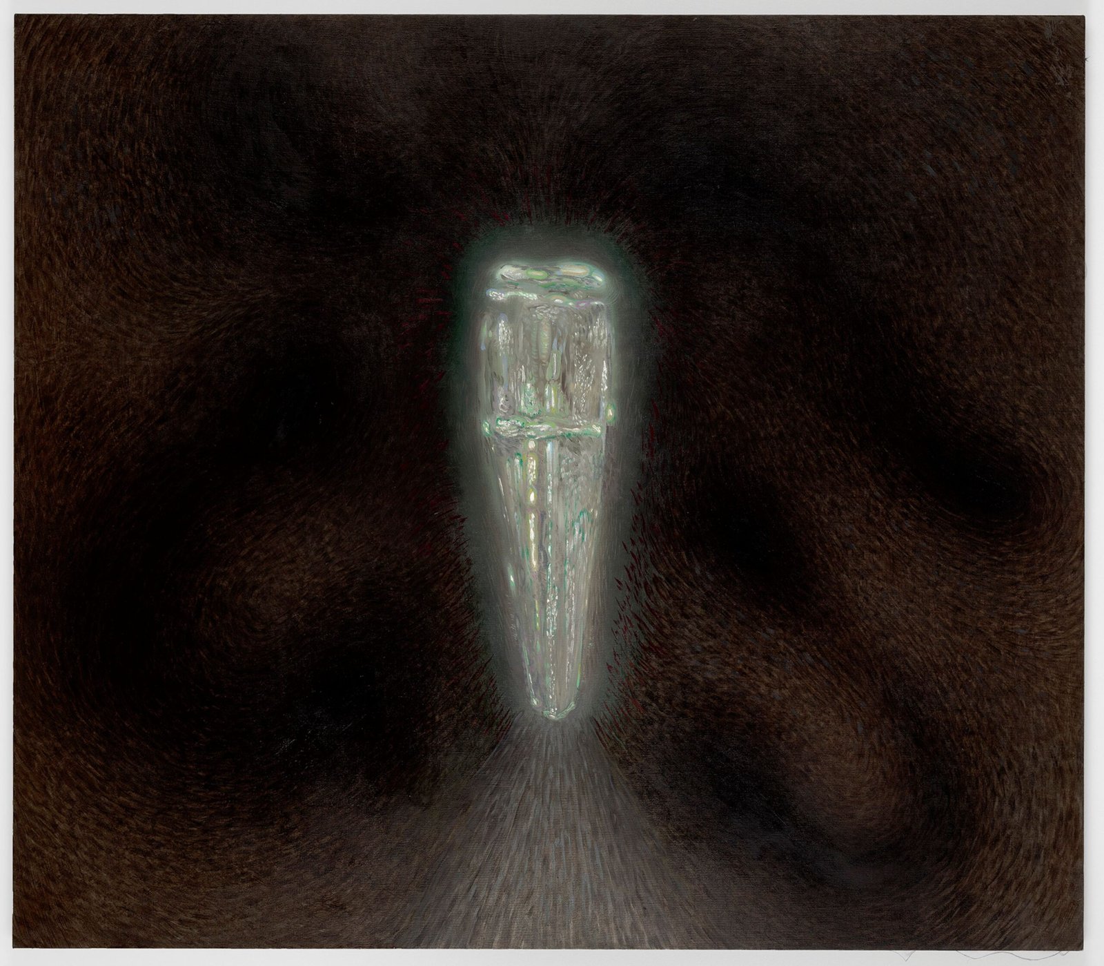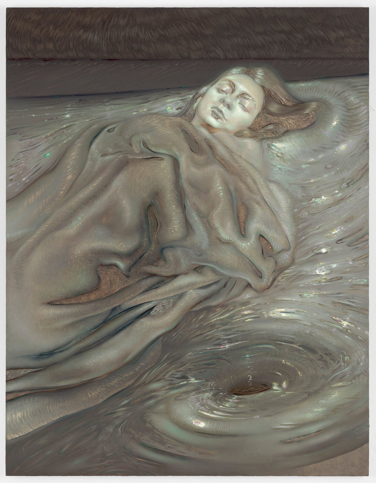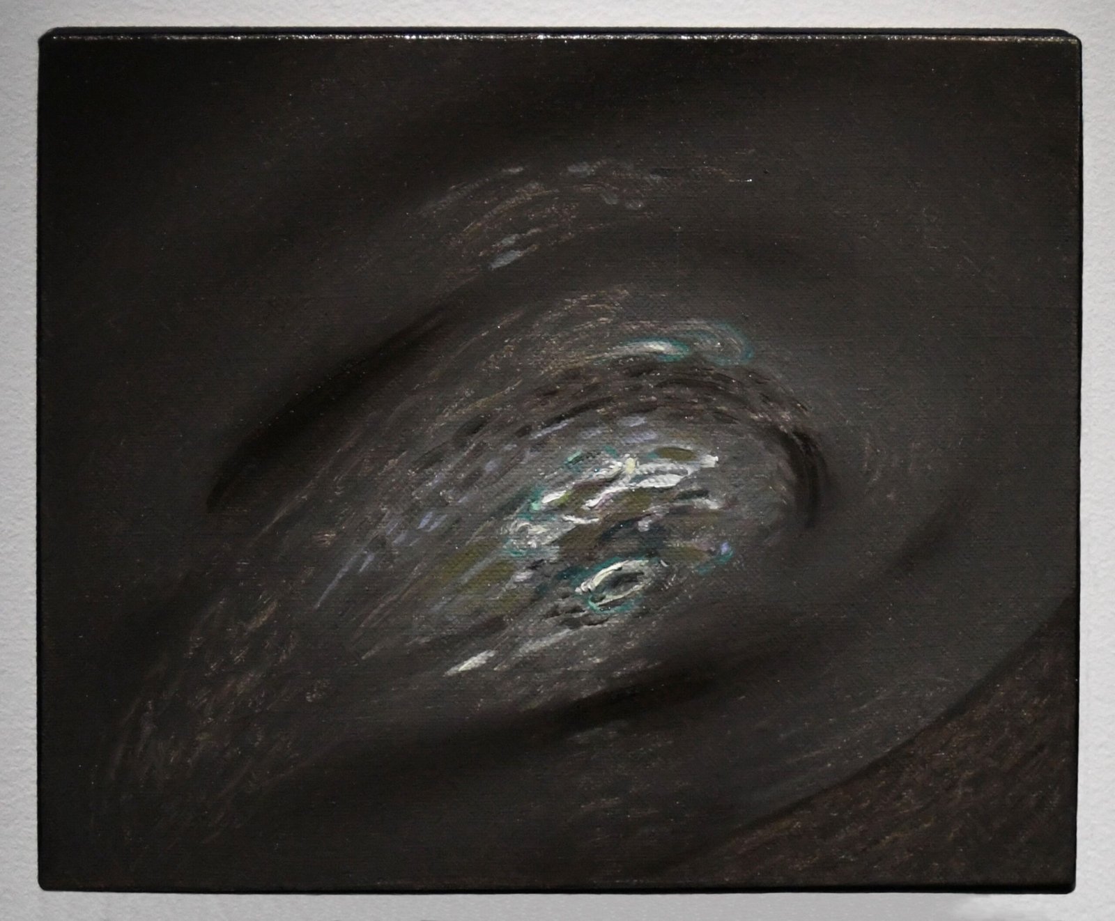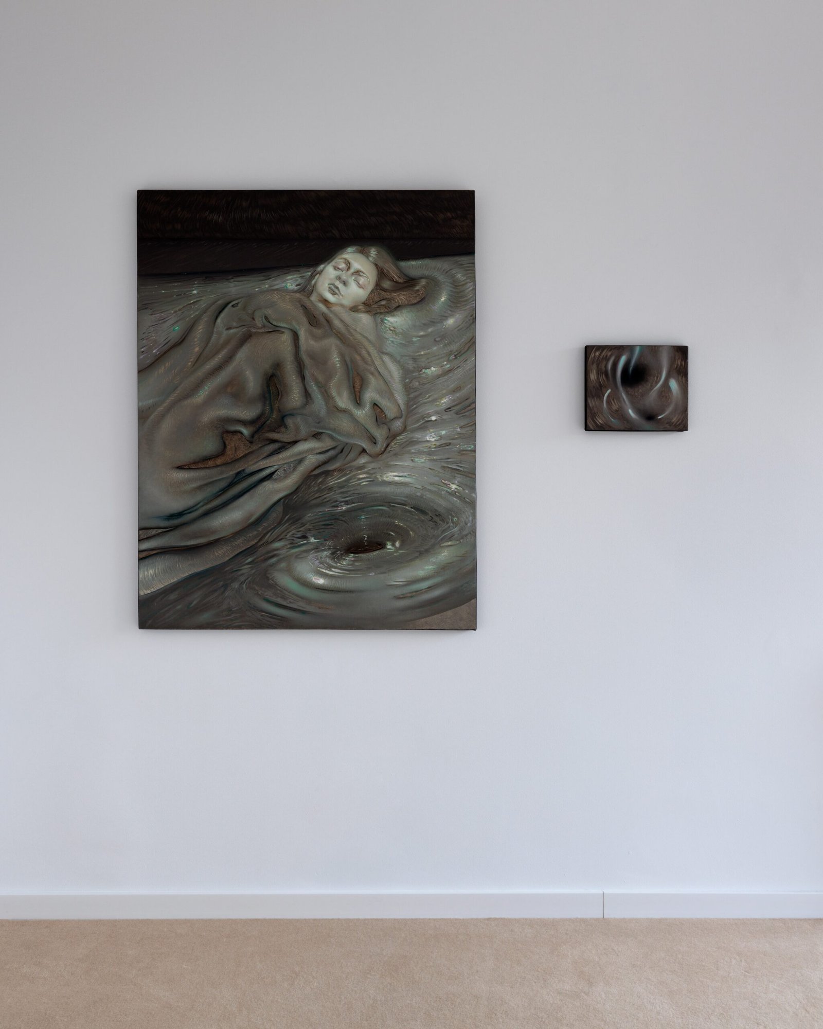 Her practice follows the logic of thresholds. The women in her paintings seem caught in suspension, their awareness drifting away from the everyday, as if embodying the legends of water themselves. In their calm faces one senses the echo of a siren’s charm edged with danger, and in the swirling currents around them, an ancient promise of transformation. It is also visible in her technique: the rhythm of the brush shifts – from circular motions to broad, diffused strokes. Here, motion is not an aftereffect but the very spine of composition. The surface thickens, light breaks through successive layers of paint. The shifting patches of colour build the painting’s rhythm – from calm, soft transitions to sudden contrasts. Painting becomes a record of transformation, not an illustration of form. Each layer of paint carries memory of what came before – a memory of body and time. The works are formed through overlaying, erasing and returning, closer to the structure of memory than to traditional composition. The mark of a gesture is not a narrative but evidence of presence.The trace of a gesture becomes a proof of presence rather than a story about it. Her painting exists at the threshold of the visible and the sensed, without seeking to divide them. The gaze is never stable; it drifts, disperses, changes scale. Perception itself becomes part of the work. Tymińska’s method restores the pace of the hand and the eye, honouring a quiet focus on what is here and now. It is a form of resistance to haste and excess, a way of paying attention to simple phenomena. Painting becomes a way of staying within experience – a slow and deliberate process that sustains continuity and concentration, a state that is its own purpose.