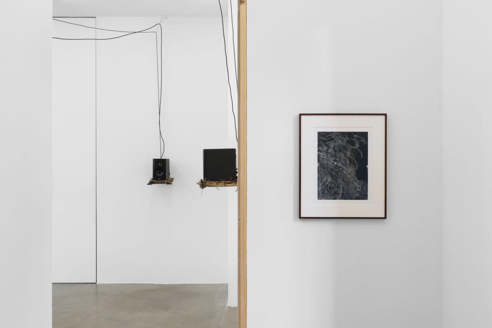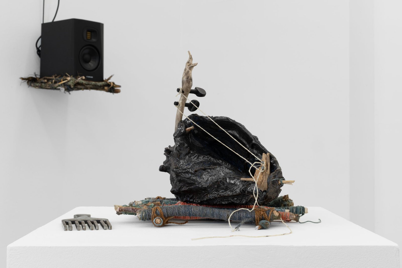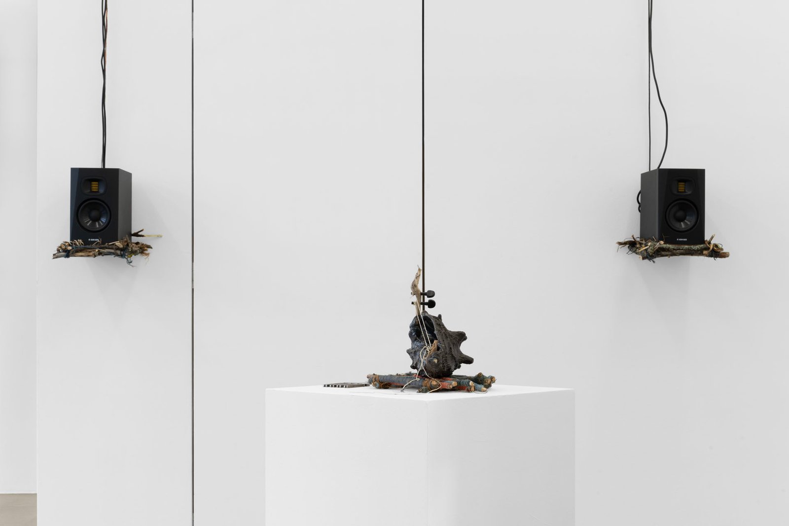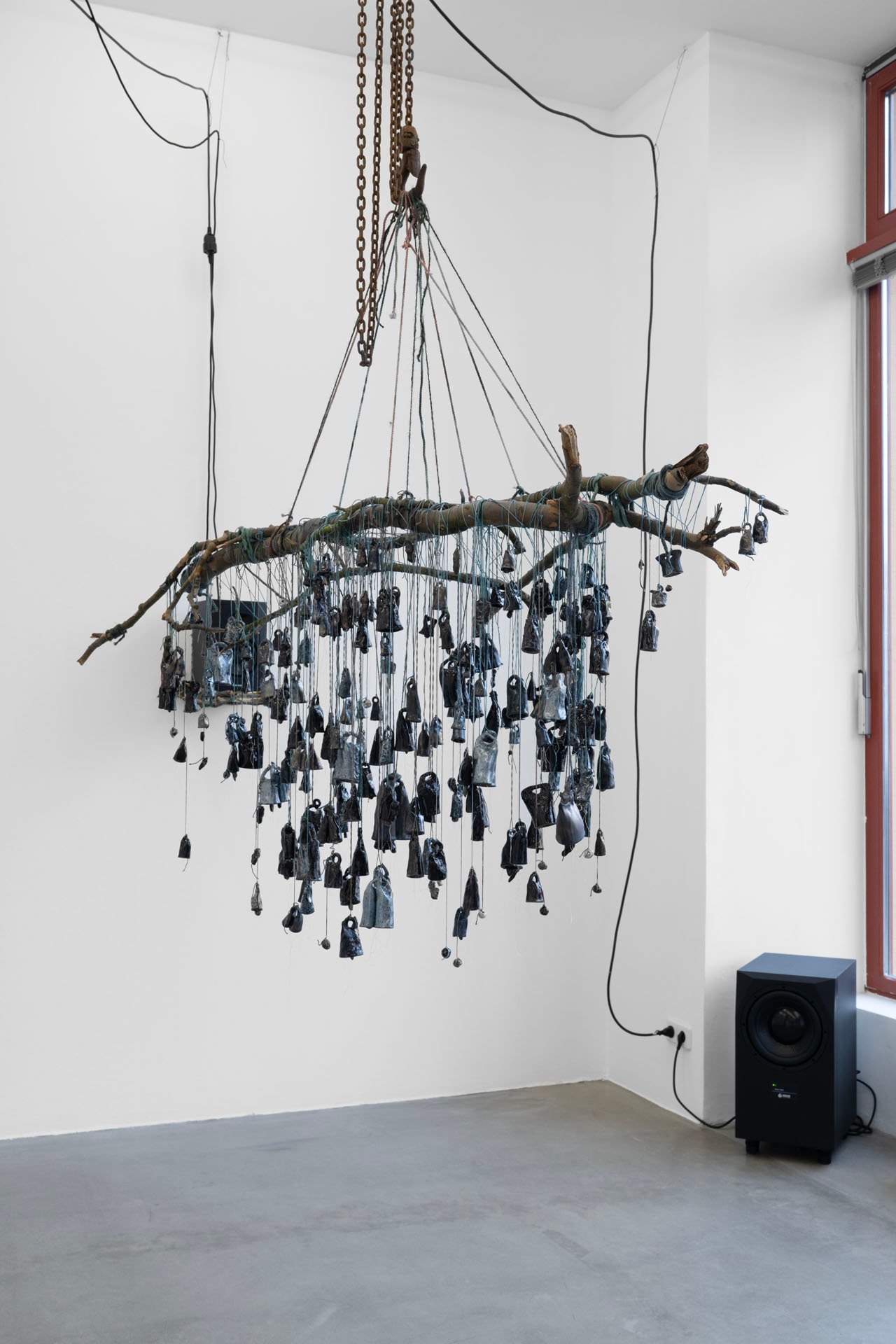 Umbratiles (the bells that did not ring) suspends ceramic bells from storm-fallen branches, referencing a dense and often violent history. In colonial contexts, bronze bells accrued the weight of what R. Murray Schafer calls “Western offensiveness”: the missionary bell, the plantation bell, the slave bell—devices that regulated labour, enforced surveillance, and marked out hierarchies of life and death. Their material histories carry further violences: bells melted into cannons, cannons recast back into bells, their forms repeatedly folded into the machinery of war, punishment, and discipline. By shaping more than two hundred unsung bells, Jones turns toward the silence surrounding these instruments and their residues. Working from personal losses and from the structural violences that gather within Germany, Jones listens to what Kevin Quashie names the quiet—the interior, tender, and sovereign aspects of Black life.
